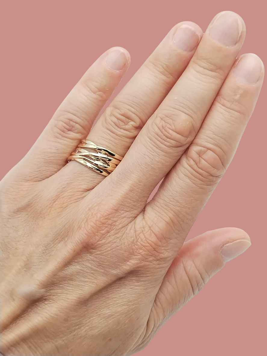 Dieser elegante, vergoldete, verschlungene Ring ist das perfekte Statement-Stück für jedes Outfit. Sein breites Band und sein klobiges Design machen ihn einzigartig und verleihen jedem Look einen Hauch von Klasse und Raffinesse. Dieses einzigartige Schmuckstück ist ein Muss für jede Frau oder jedes Mädchen und ein perfektes Geschenk für jeden Anlass. Werten Sie Ihren Stil mit diesem Boho-Chic und punktgenauen Accessoire auf, das Eleganz ausstrahlt.