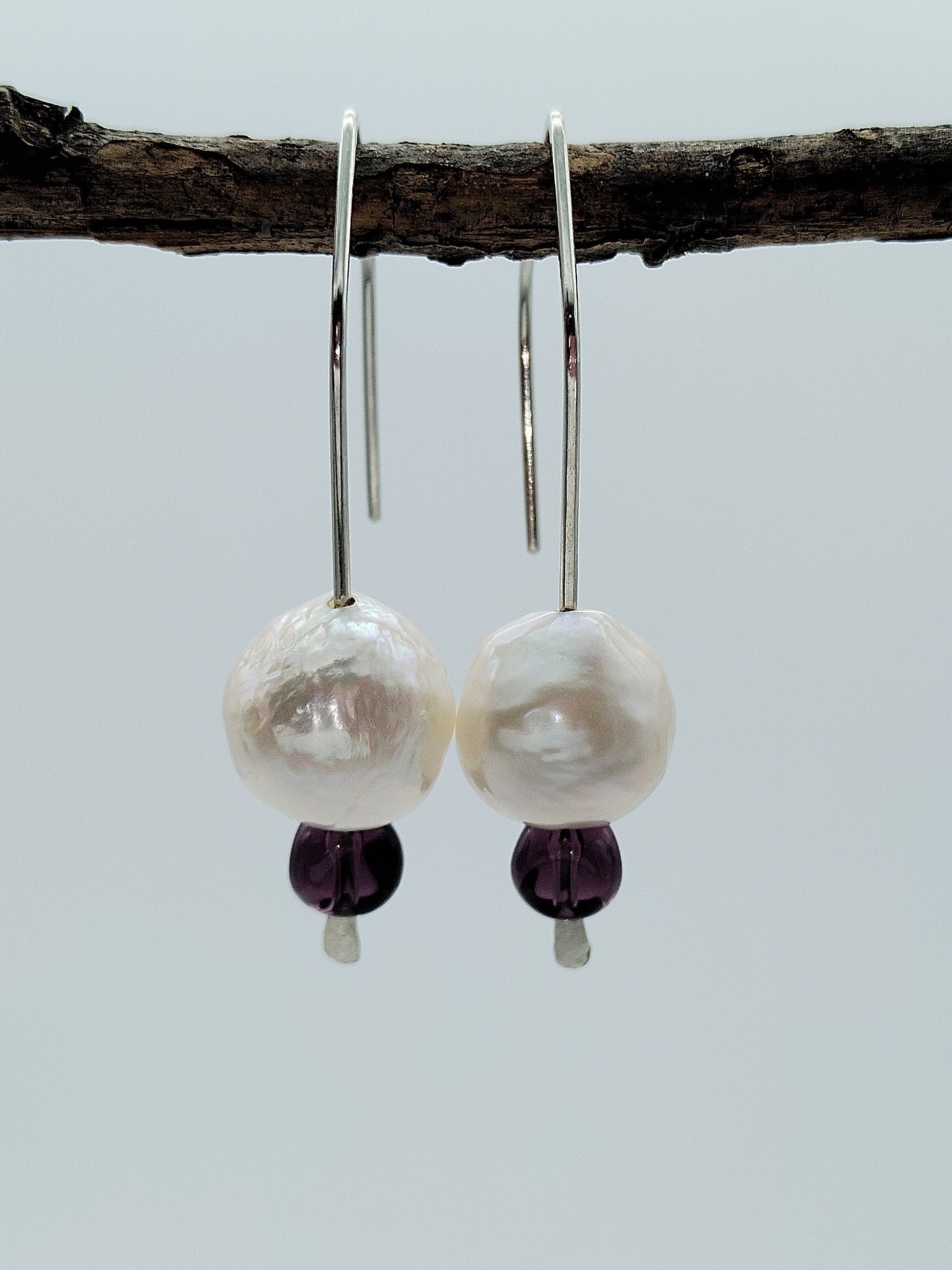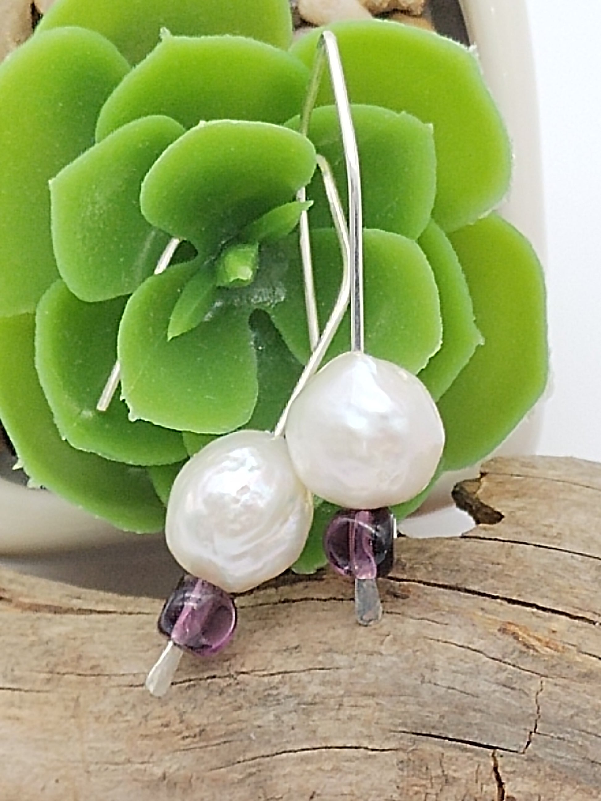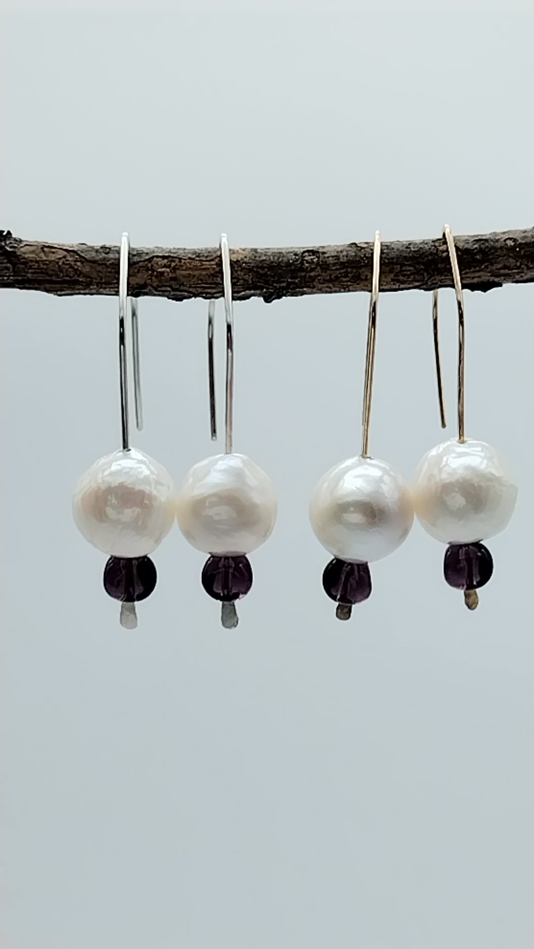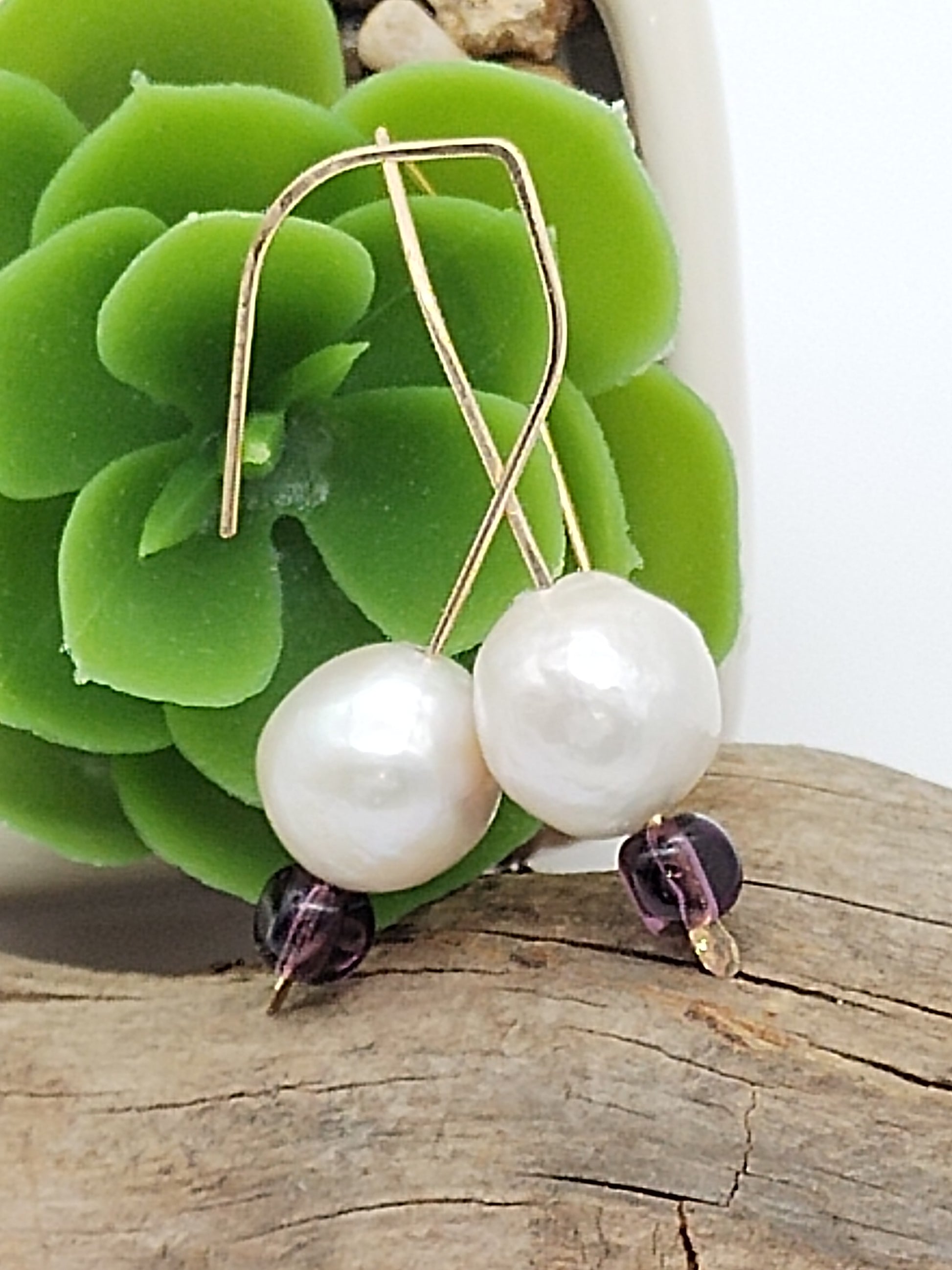 Wunderschöne große Edison-Perlen (13 mm) mit herrlichem Glanz. Sie wurden mit einem wunderschönen Amethyst-Nugget am unteren Ende kombiniert. Sie sind sehr leicht und perfekt für den Alltag.