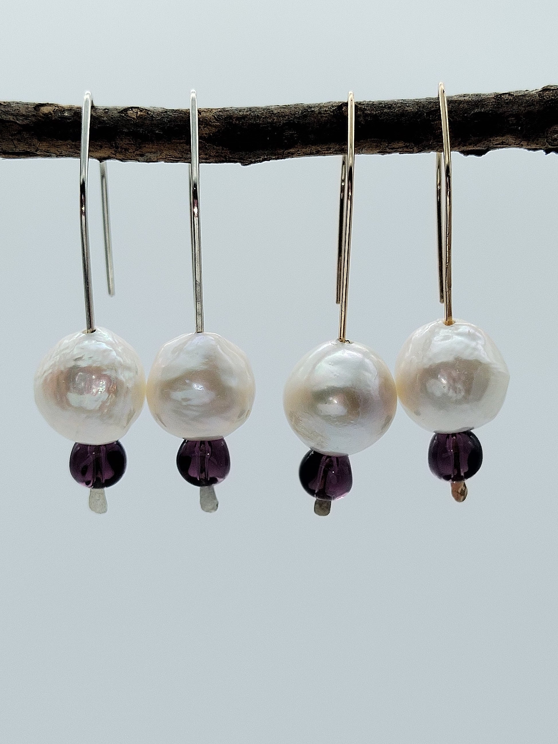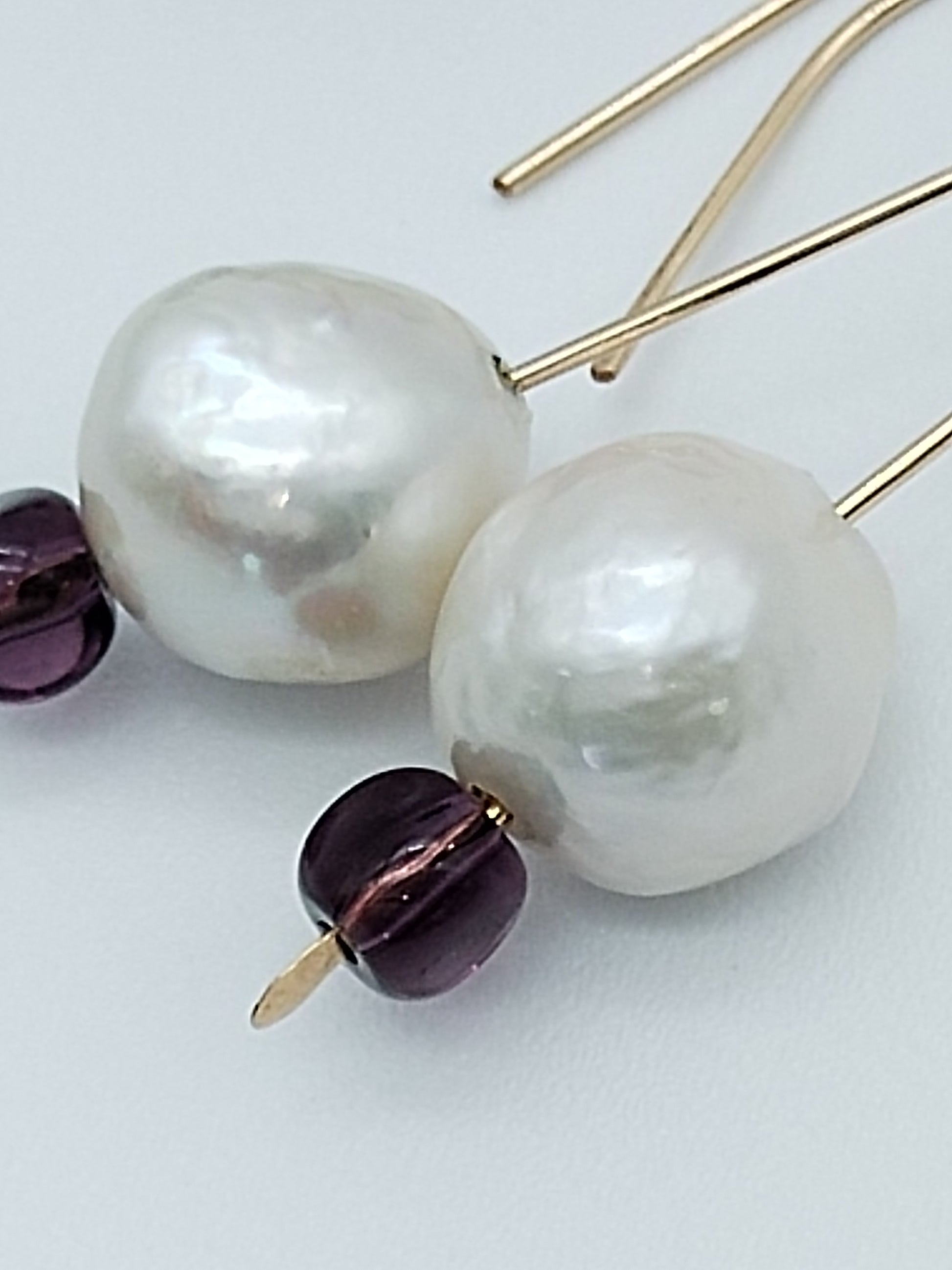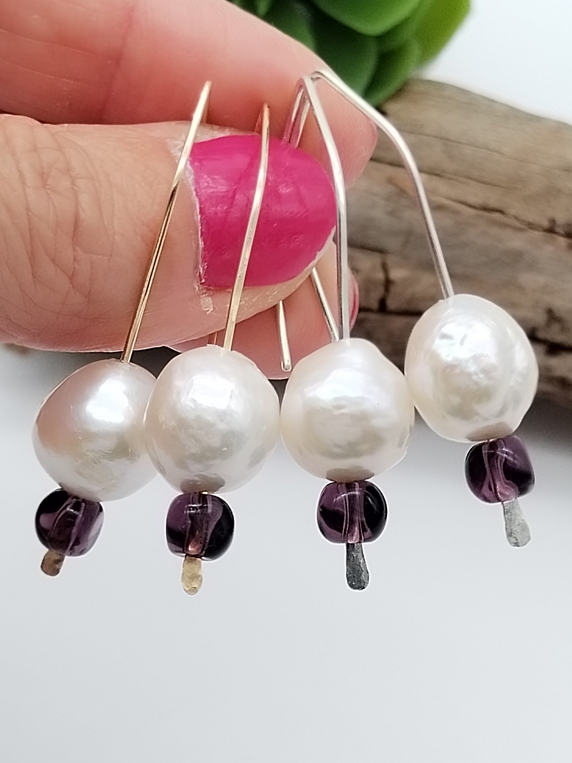 Wunderschöne große Edison-Perlen (13 mm) mit herrlichem Glanz. Sie wurden mit einem wunderschönen Amethyst-Nugget am unteren Ende kombiniert. Sie sind sehr leicht und perfekt für den Alltag.