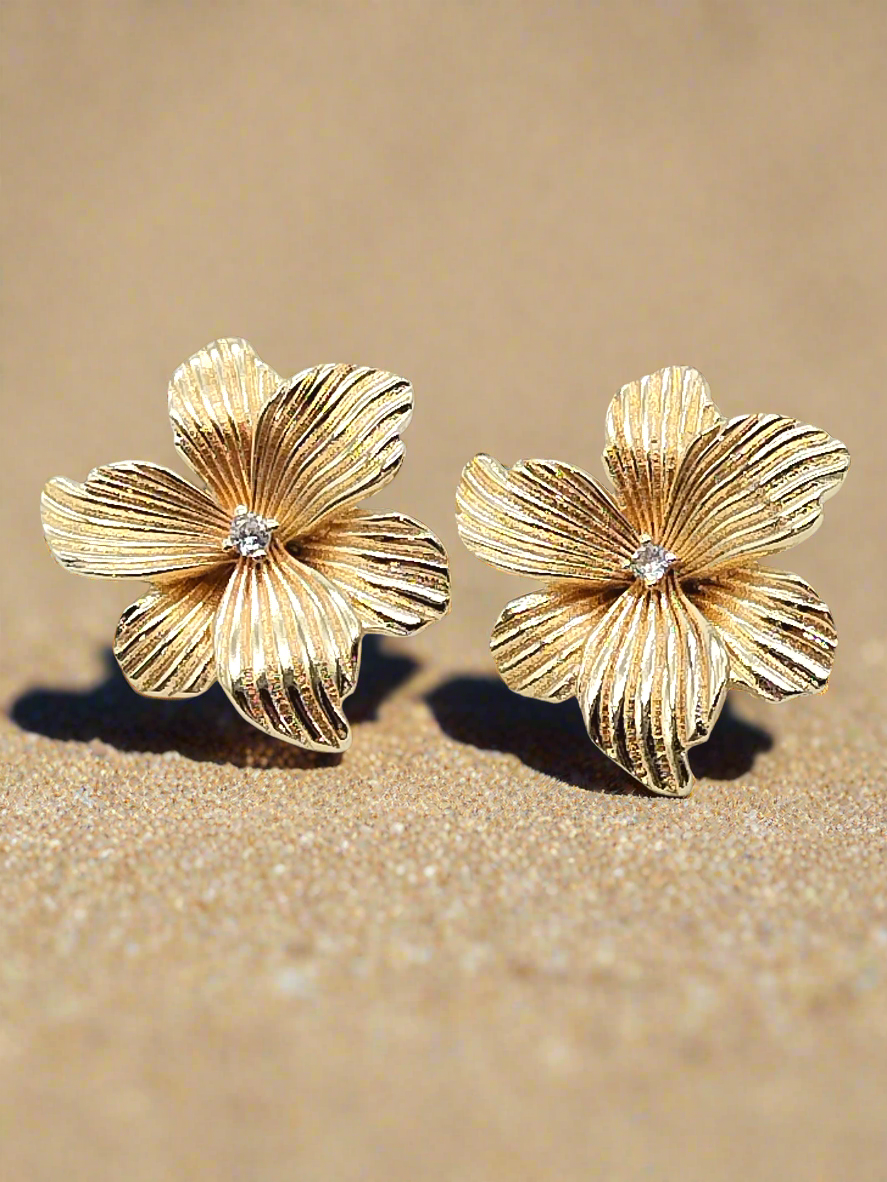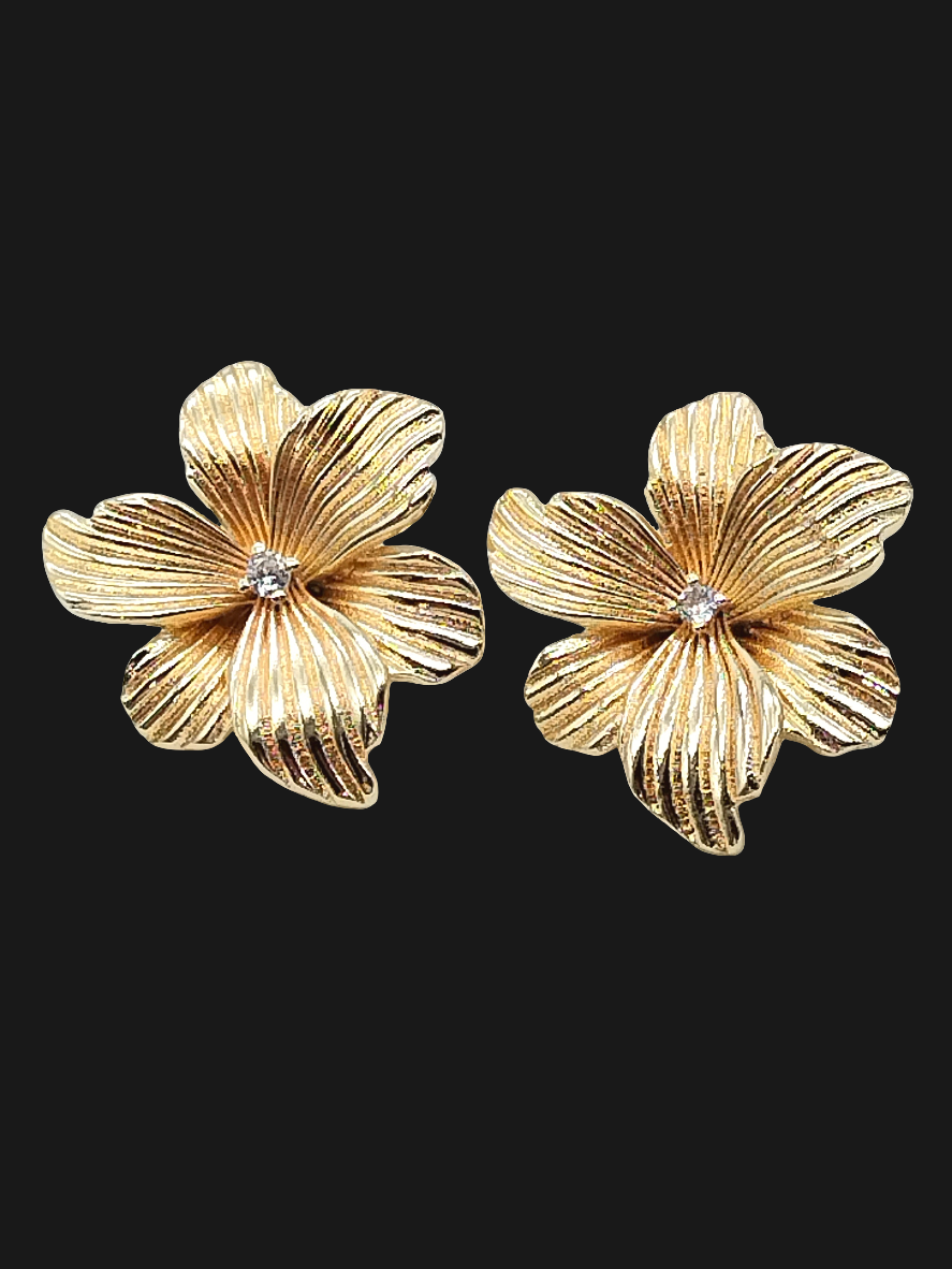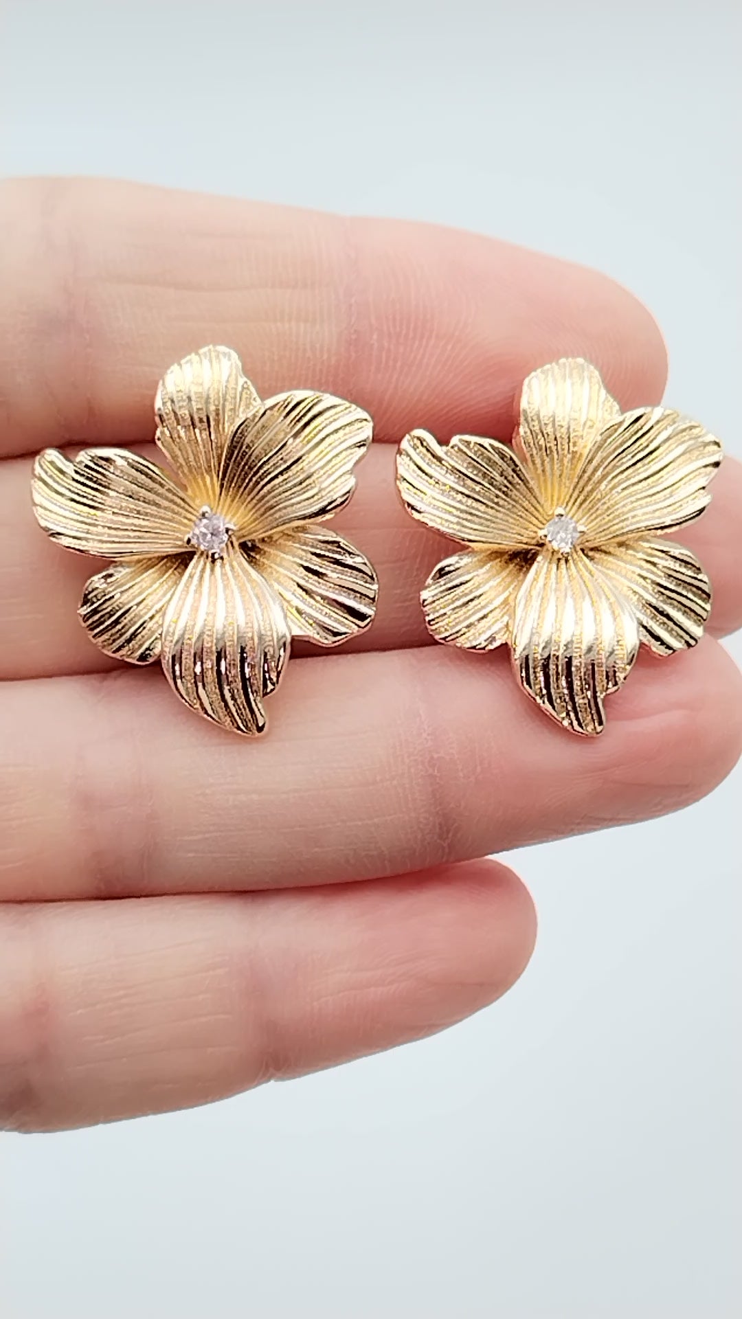 Verleihen Sie Ihrem Outfit mit unseren 18 Karat vergoldeten Blumenohrsteckern einen Hauch von Eleganz. Diese auffälligen und klobigen Ohrringe verfügen über eine funkelnde CZ-Mitte und ein strukturiertes Design, was sie zu einem trendigen und einzigartigen Stück aus unserer Herbstkollektion macht. Diese Ohrringe sind perfekt als Geschenk für die stilbewussten Frauen und Mädchen in Ihrem Leben, sie sind einzigartig und zeitlos. Feiern Sie Geburtstage und besondere Anlässe mit diesem punktgenauen Accessoire.