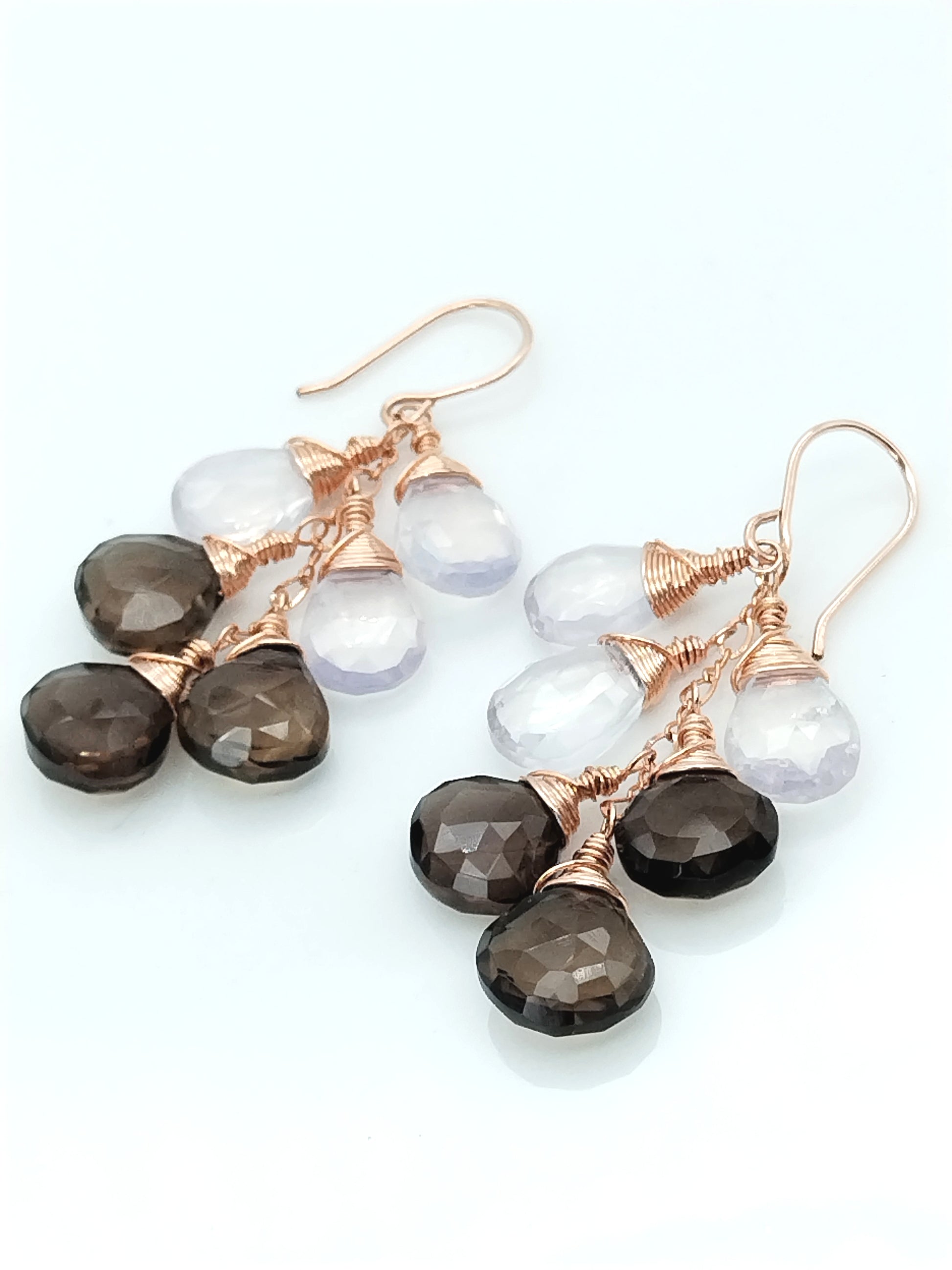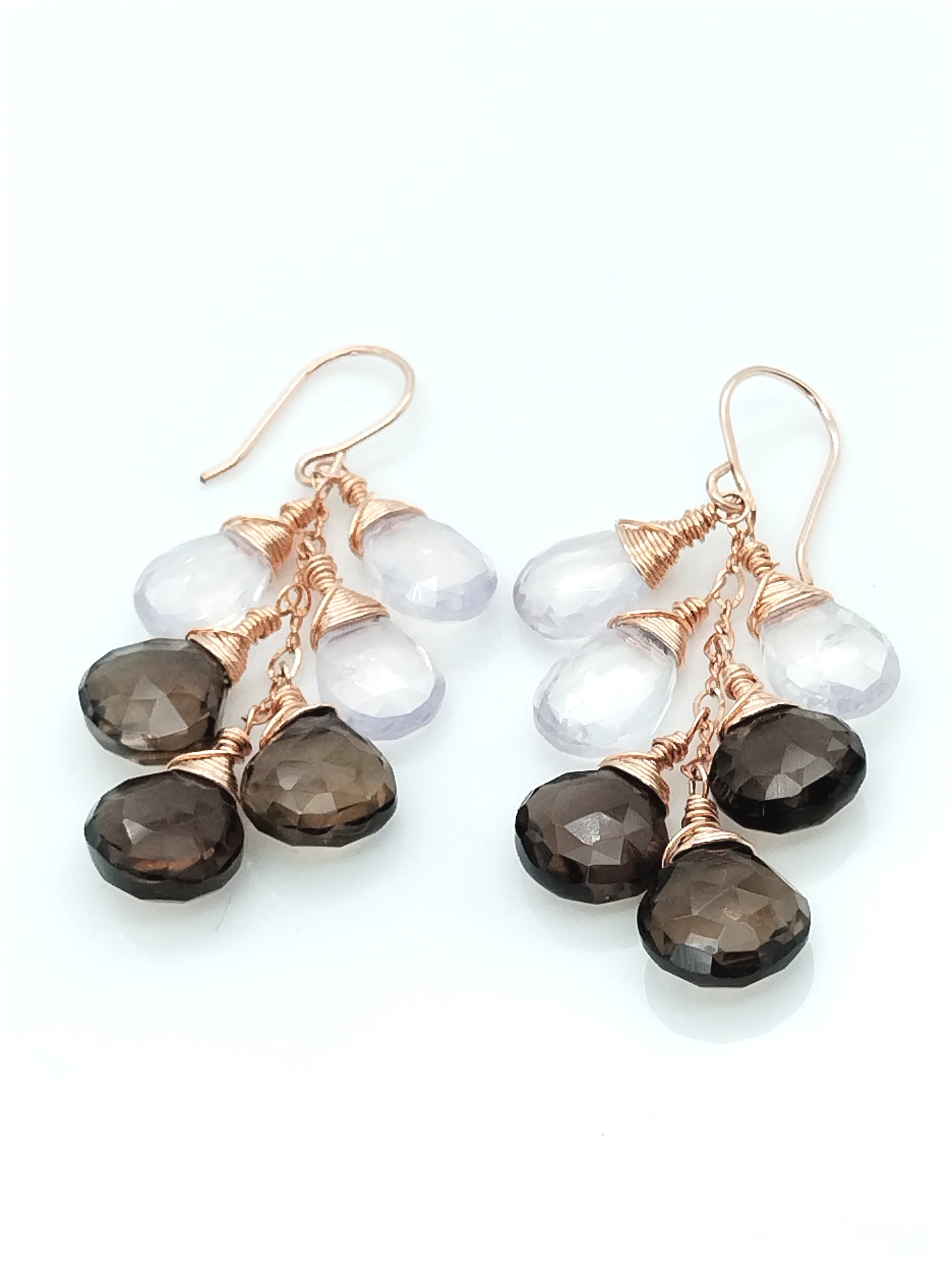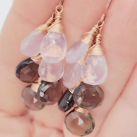 Diese einzigartigen Ohrringe sind mit Lavendelquarz-Tropfen (13 mm) und Rauchquarz-Tropfen (12 mm) Edelsteinen besetzt, die in einem Cluster aus 14-karätigem Roségold eingefasst sind und so für einen eleganten und zeitlosen Look sorgen. Die Edelsteine haben ein baumelndes Tropfendesign für ein zartes und dennoch auffälliges Erscheinungsbild. Diese Ohrringe sind perfekt für jeden Anlass und ein großartiges Geschenk für jeden Schmuckliebhaber.