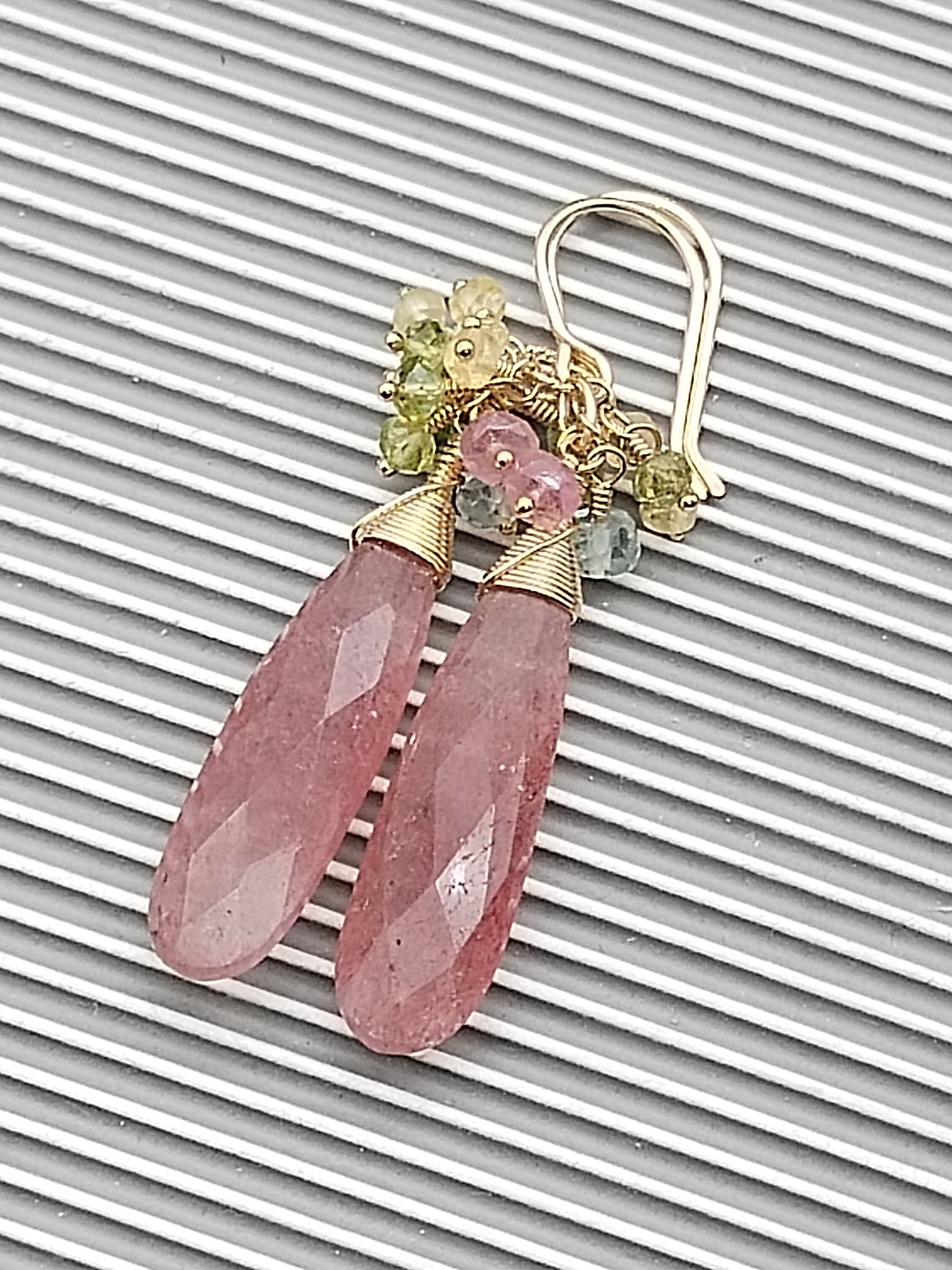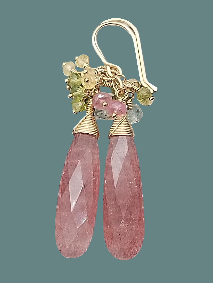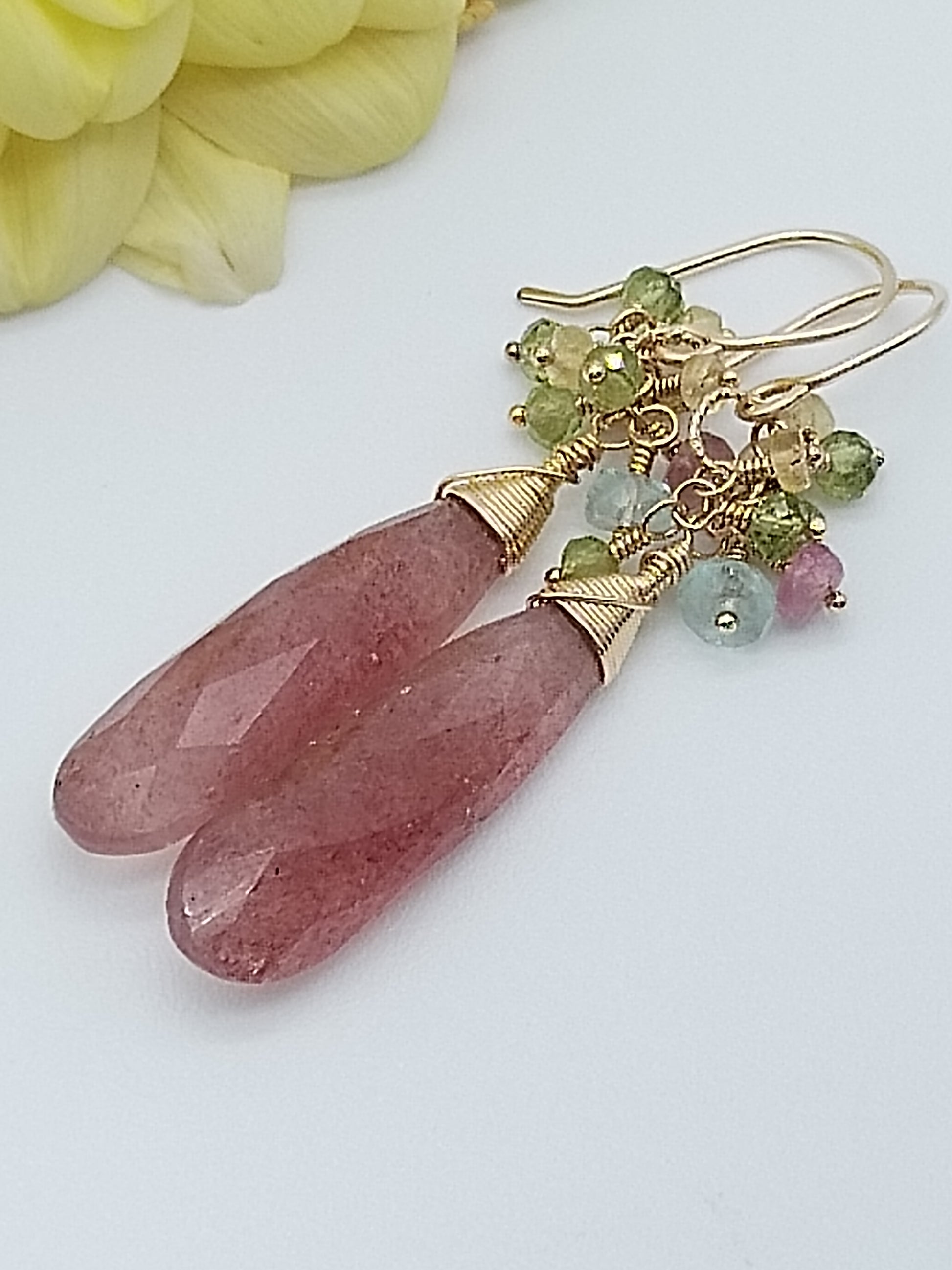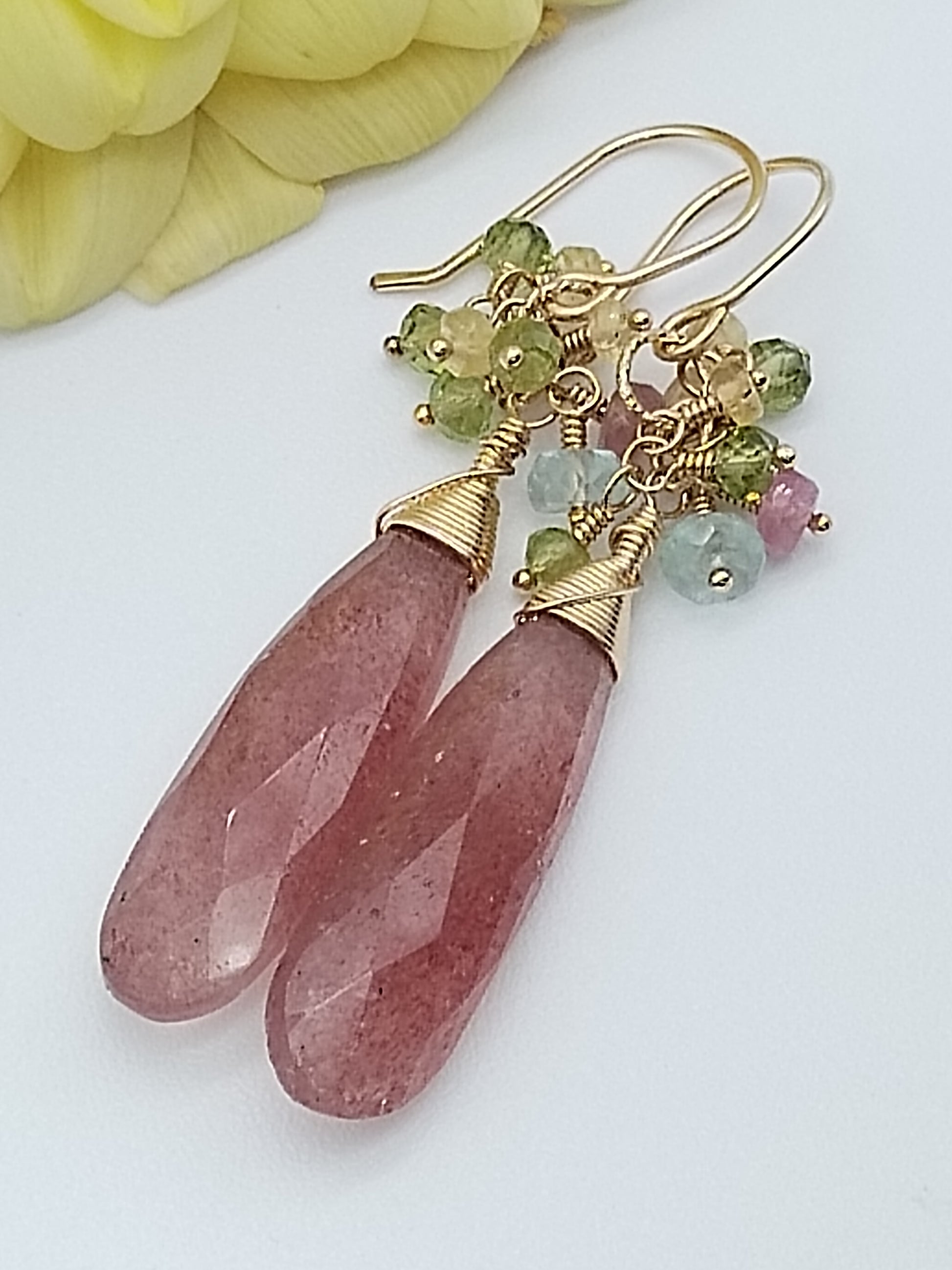 Erdbeerquarz-Tropfen-Ohrringe, 14 Karat Gold gefüllt