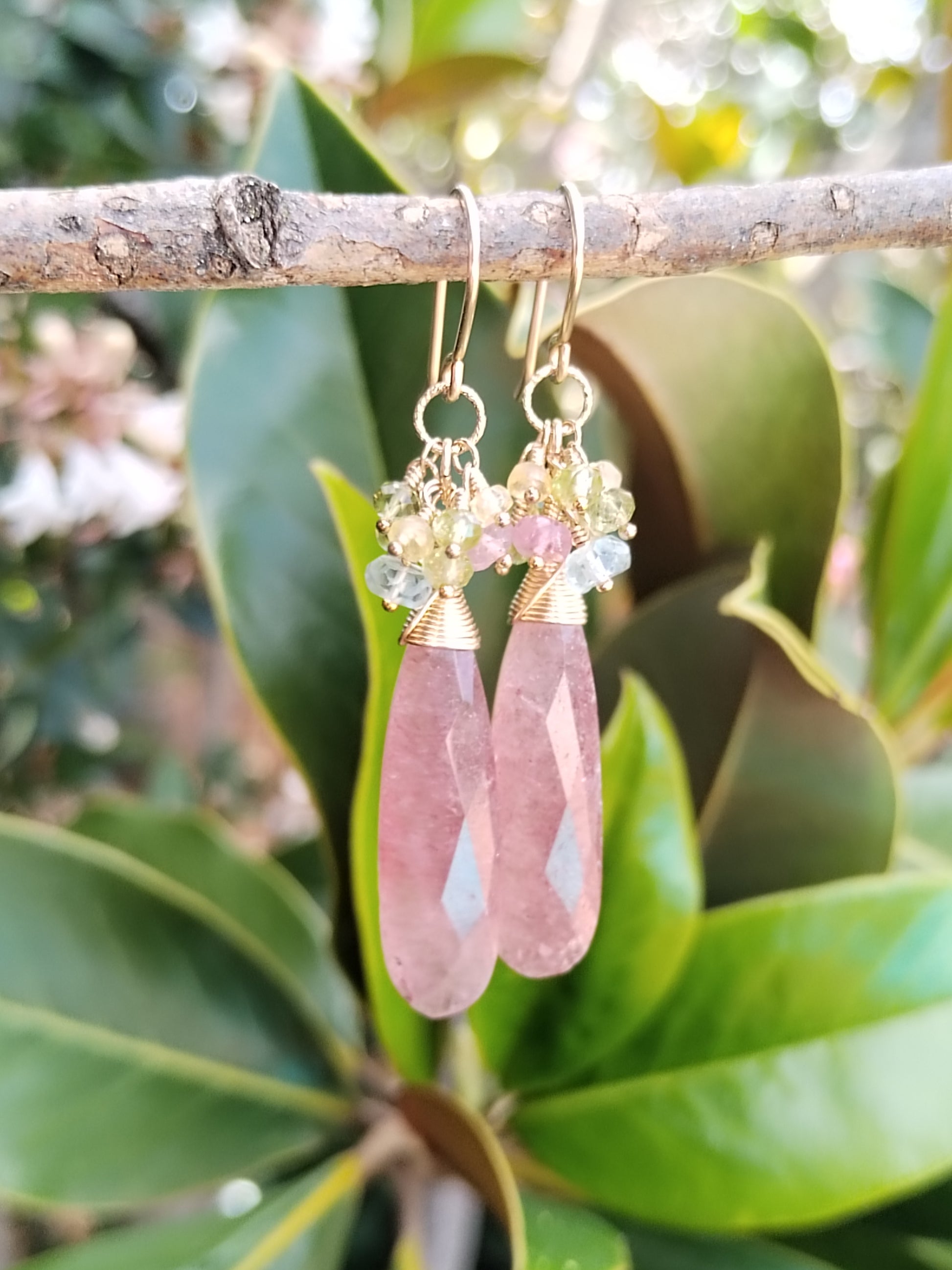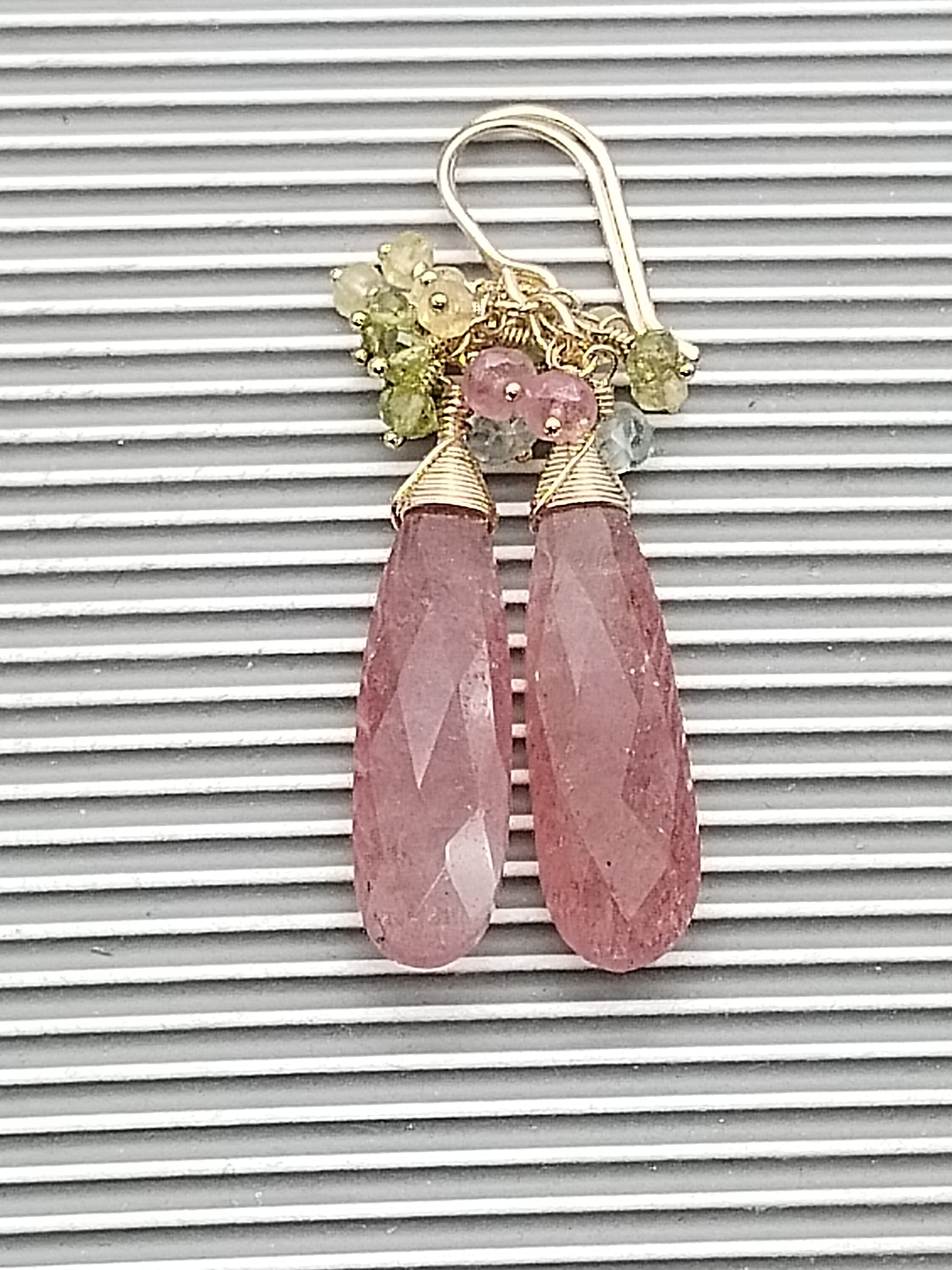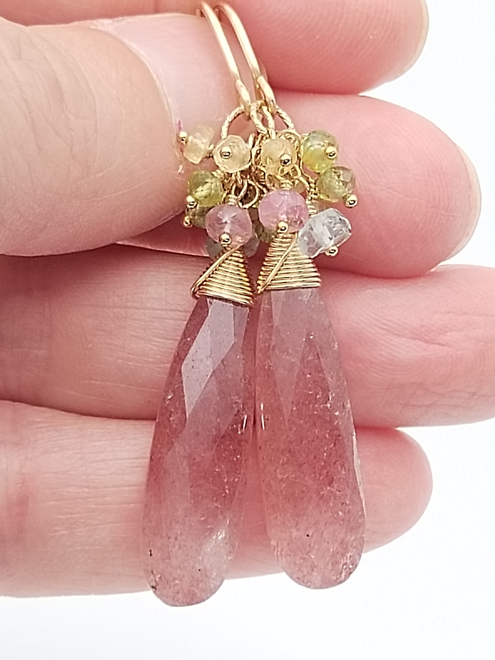 Erdbeerquarz-Tropfen-Ohrringe, 14 Karat Gold gefüllt