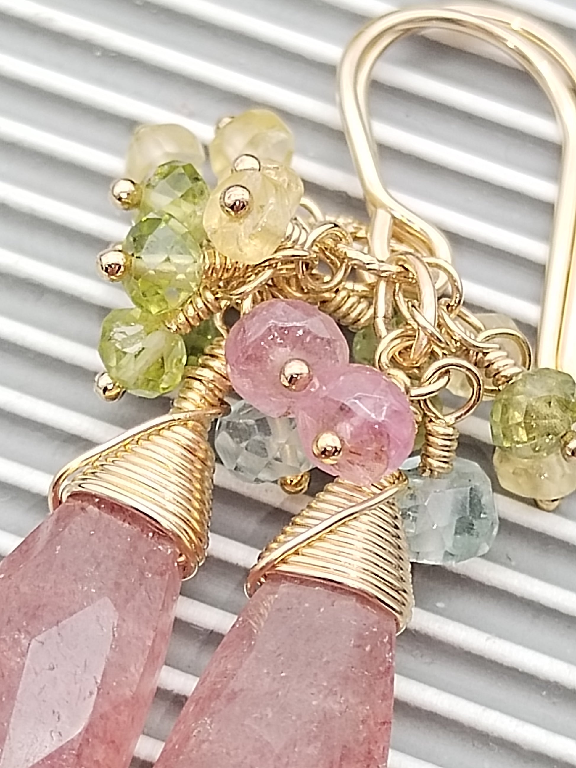 Wunderschöner großer AAA+Erdbeerquarz-Tropfen (30 x 8 mm) mit einer wunderschönen Edelsteingruppe in Farbe an der Spitze: AAA-Gelbaquamarin, AAA+-Peridot, AAA+-Blauaquamarin und AAA+-Rosaturmalin. Alles sorgfältig von Hand in 14 Karat Gelbgold gewickelt.