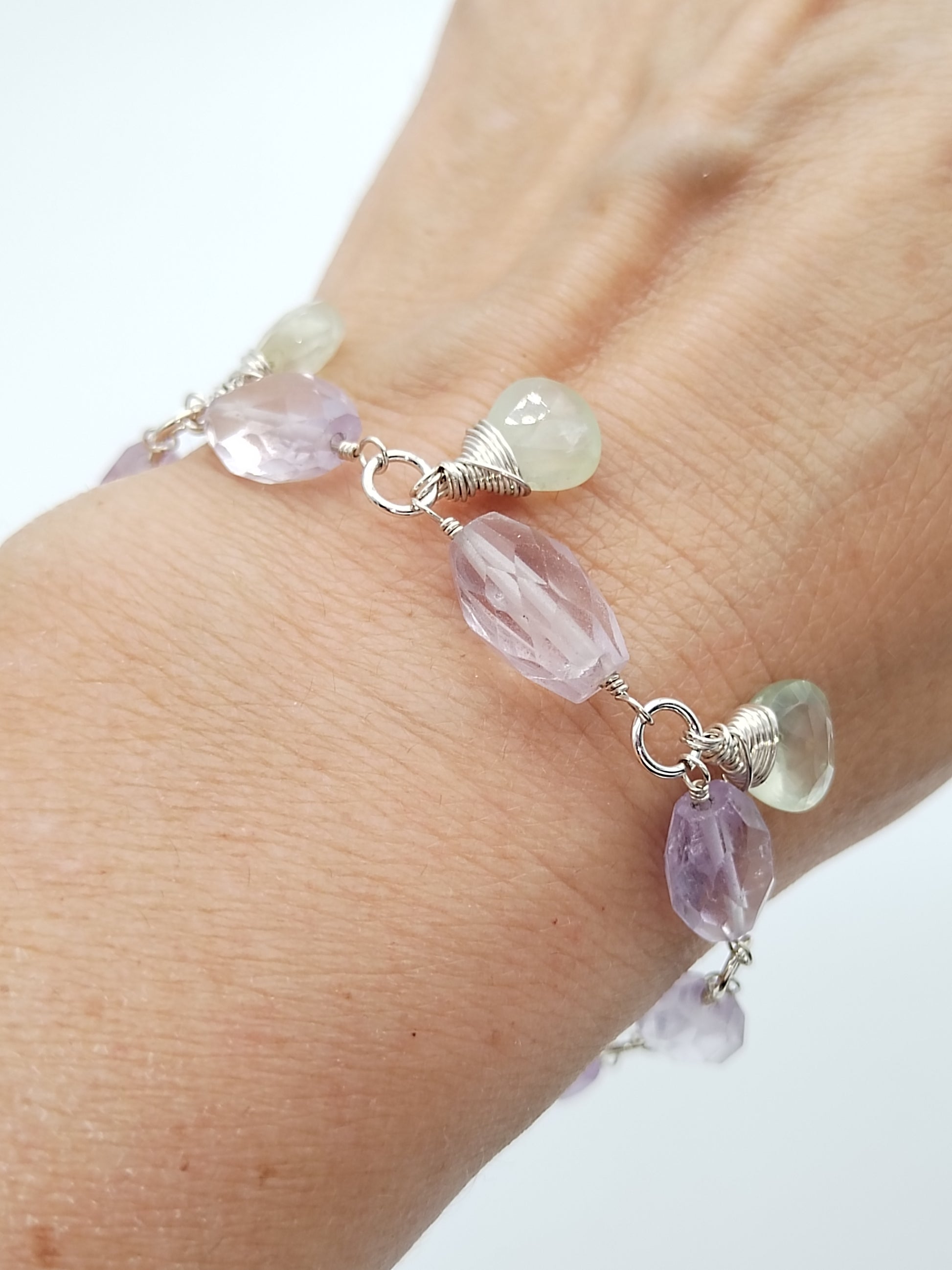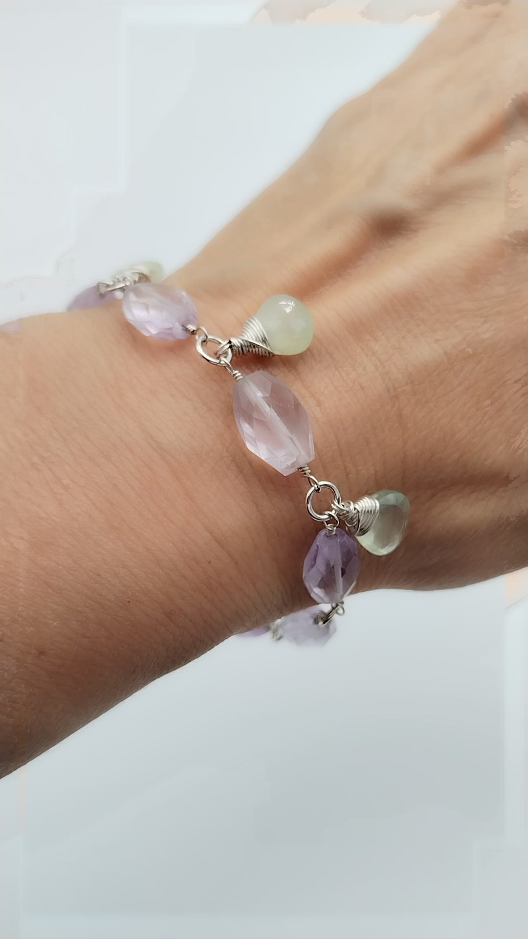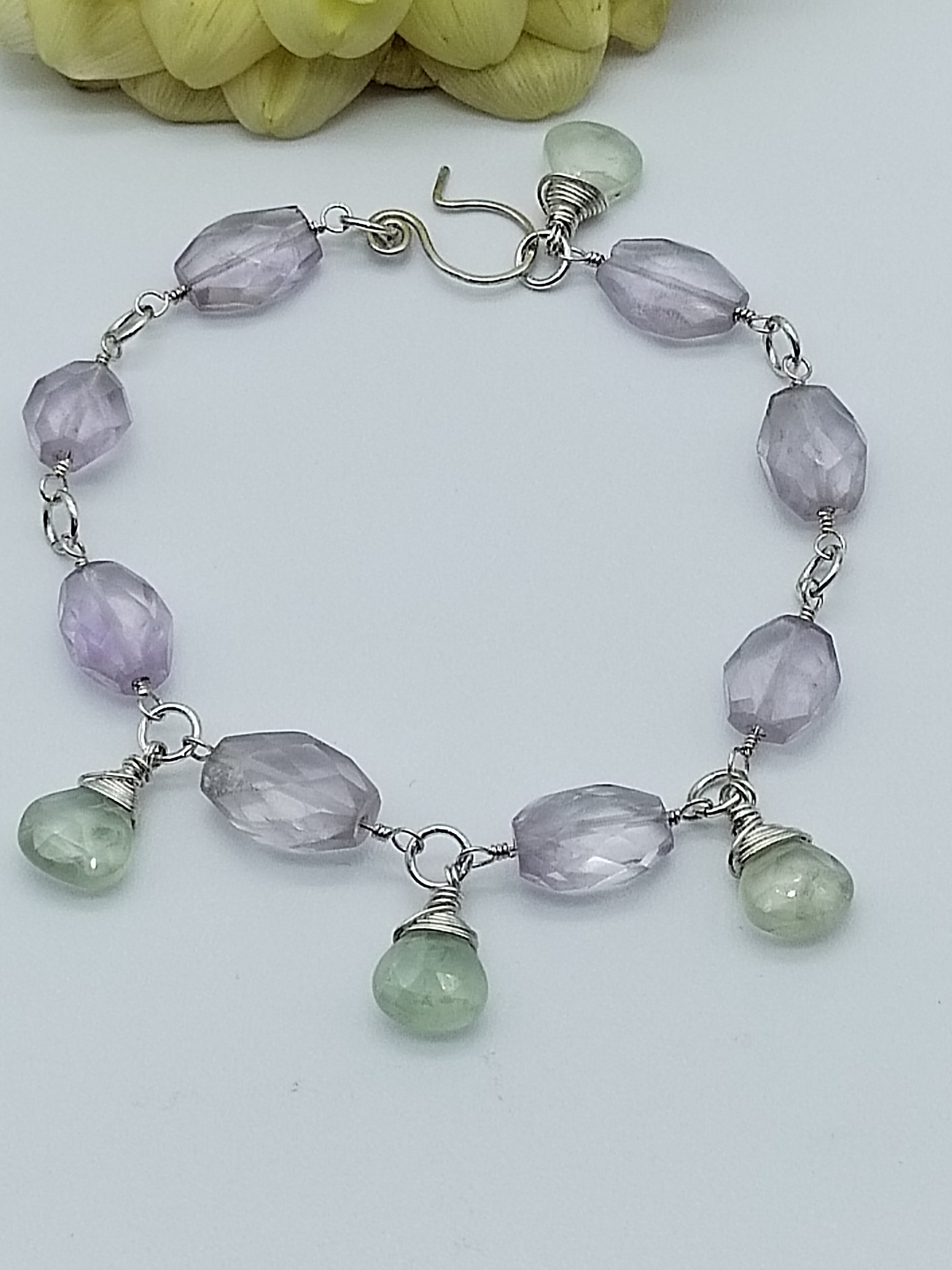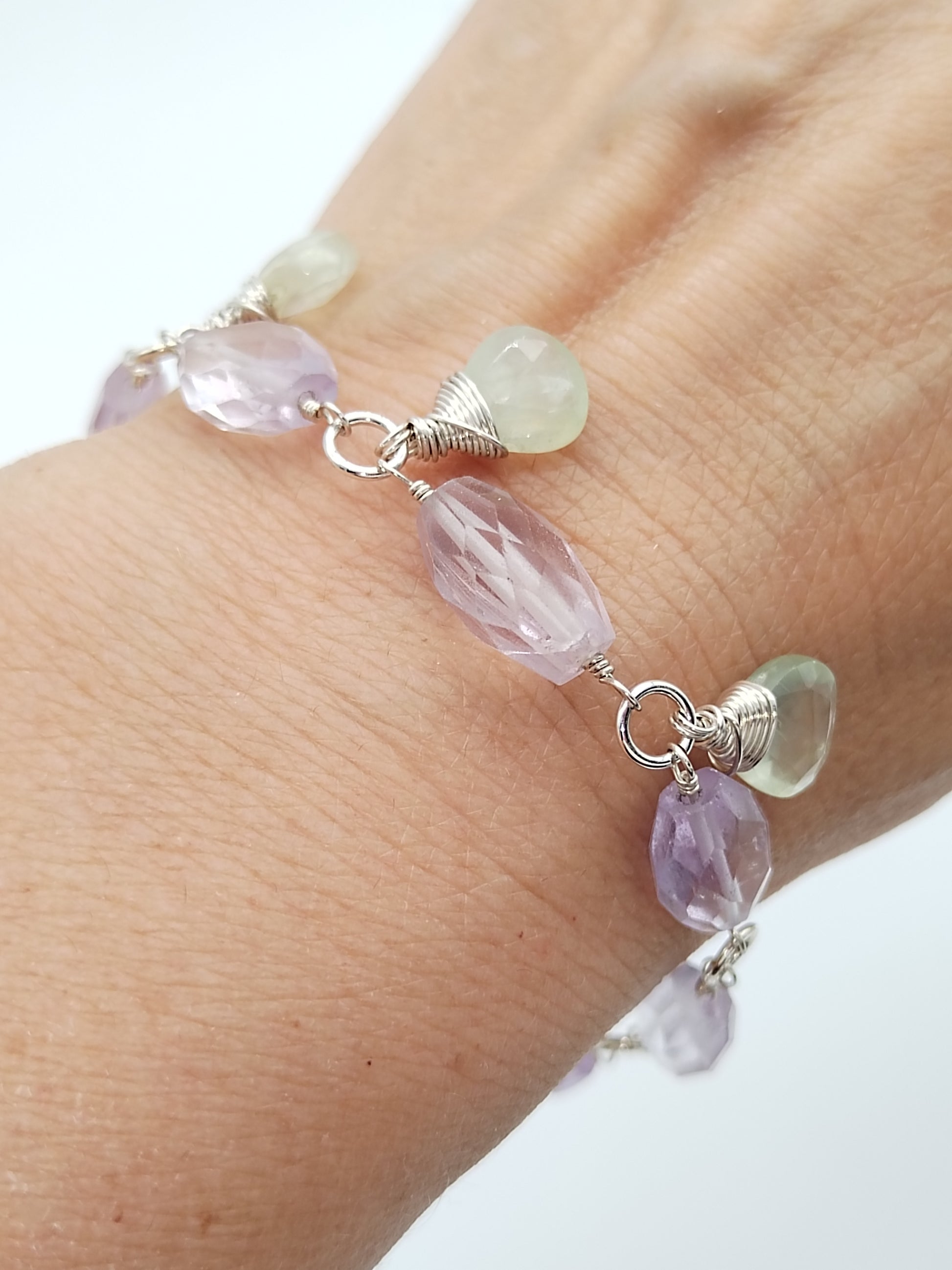 Hermosa y delicada pulsera de amatista lavanda y prehnita envuelta a mano en plata esterlina 925. Hermosas cuentas de diamantes lavanda (12 x 8 mm) con tres hermosas briolettes de prehnita de 8,8 mm) colgando como dijes. Hermosa combinación de colores de piedras preciosas y muy femenina. El cierre es un hermoso gancho forjado a mano con una briolette de prehnita colgando de él.