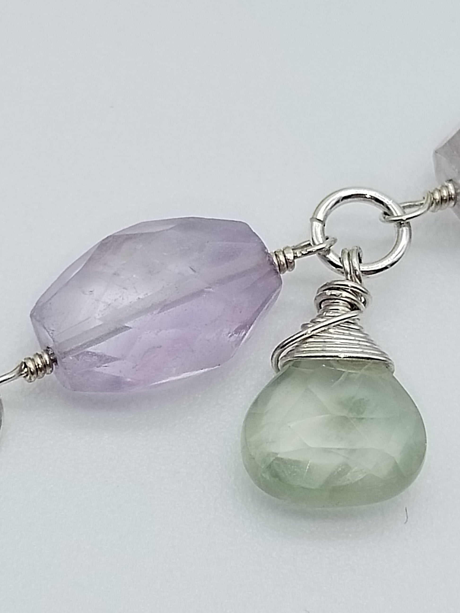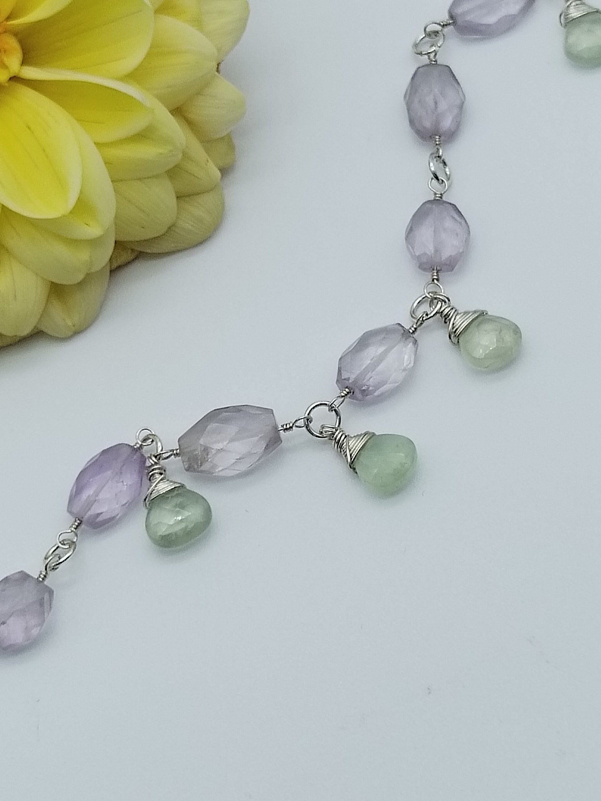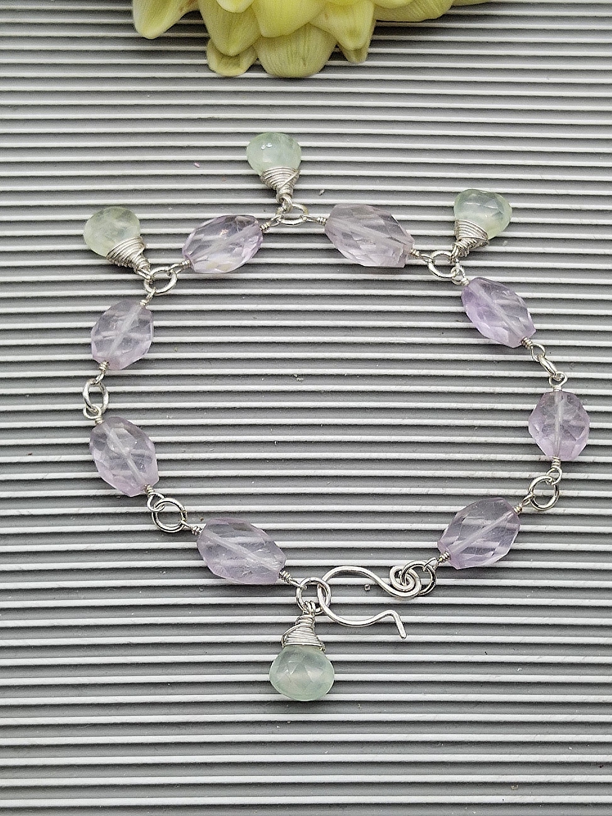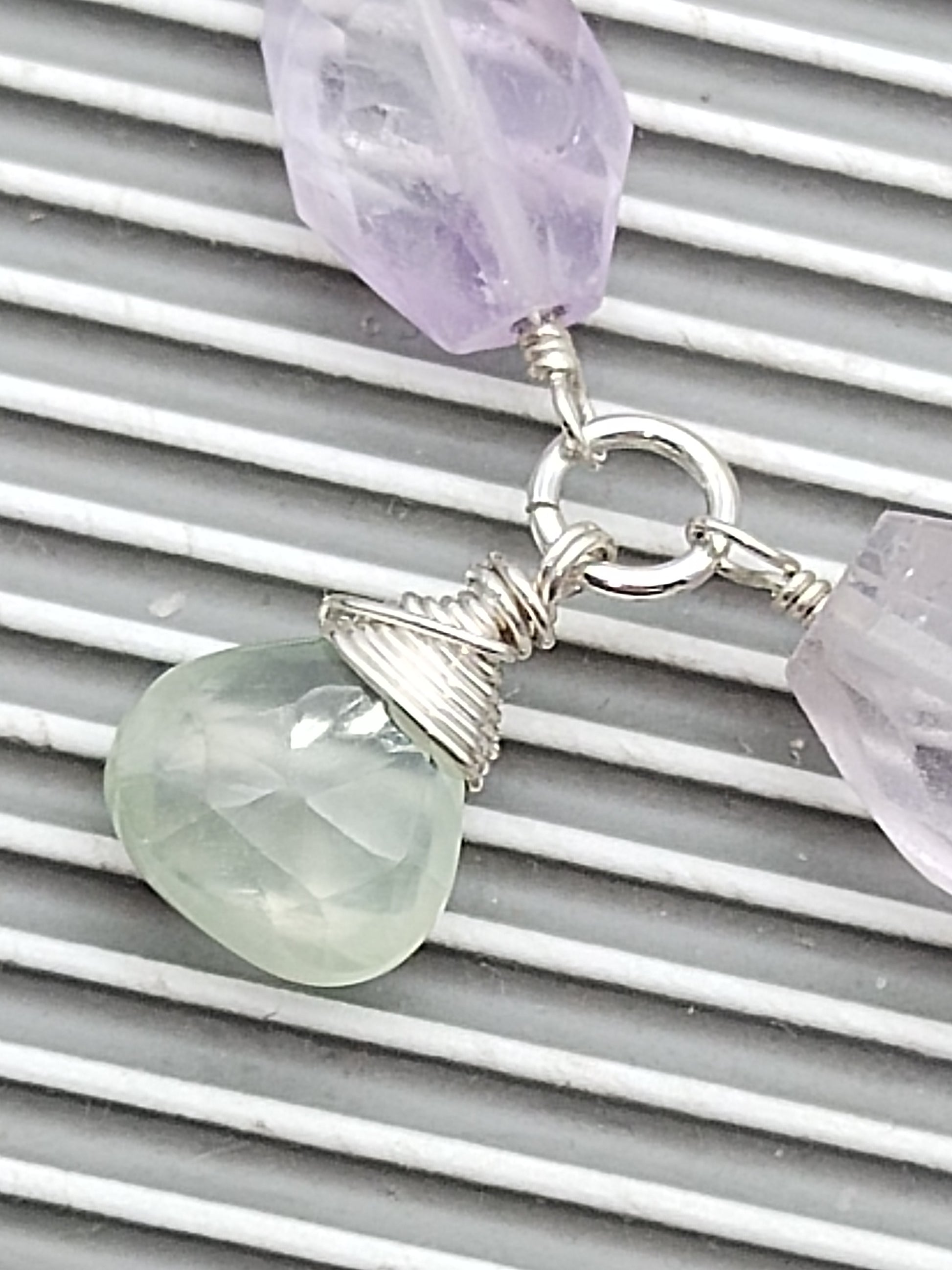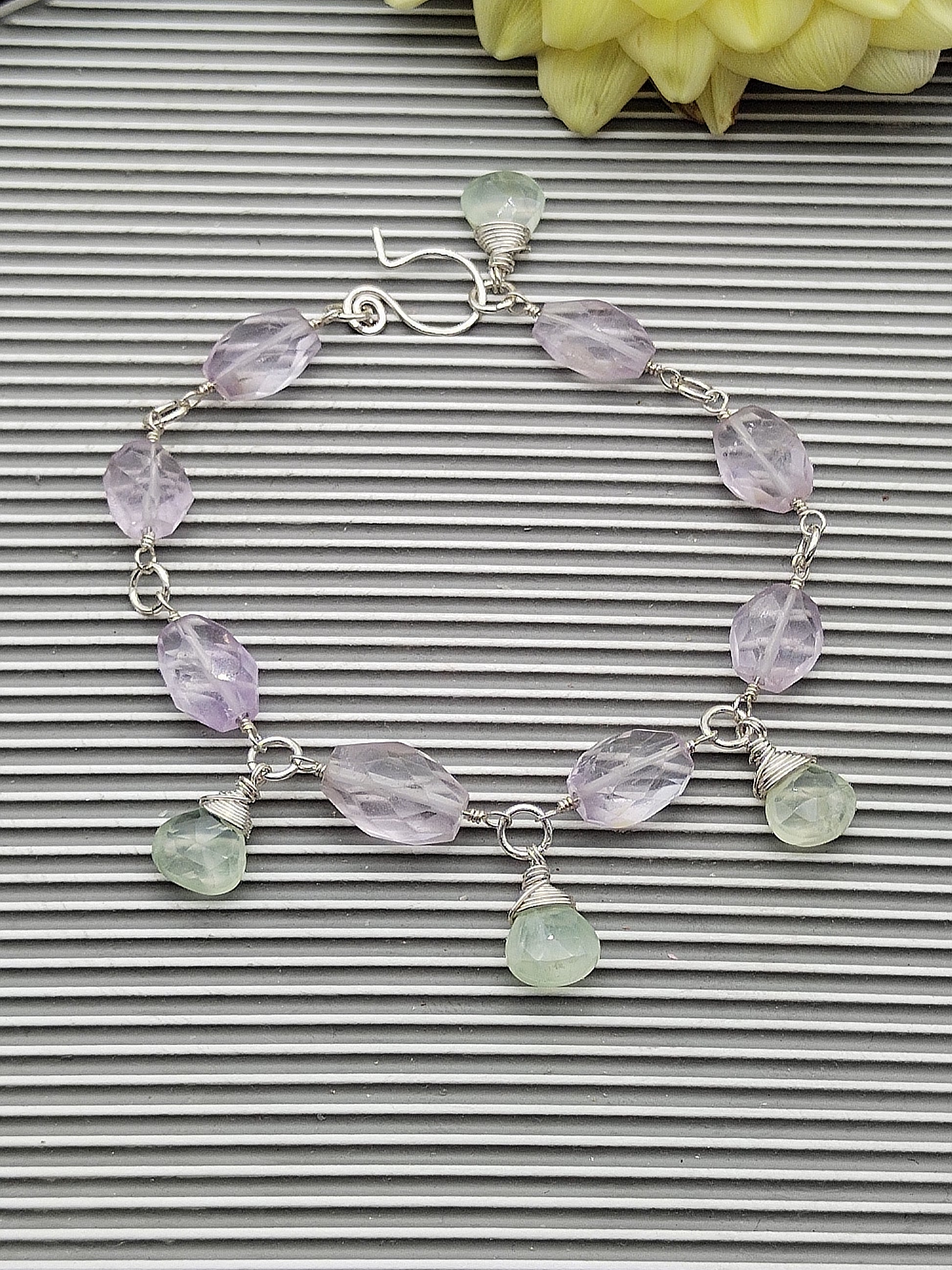 Hermosa y delicada pulsera de amatista lavanda y prehnita envuelta a mano en plata esterlina 925. Hermosas cuentas de diamantes lavanda (12 x 8 mm) con tres hermosas briolettes de prehnita de 8,8 mm) colgando como dijes. Hermosa combinación de colores de piedras preciosas y muy femenina. El cierre es un hermoso gancho forjado a mano con una briolette de prehnita colgando de él.