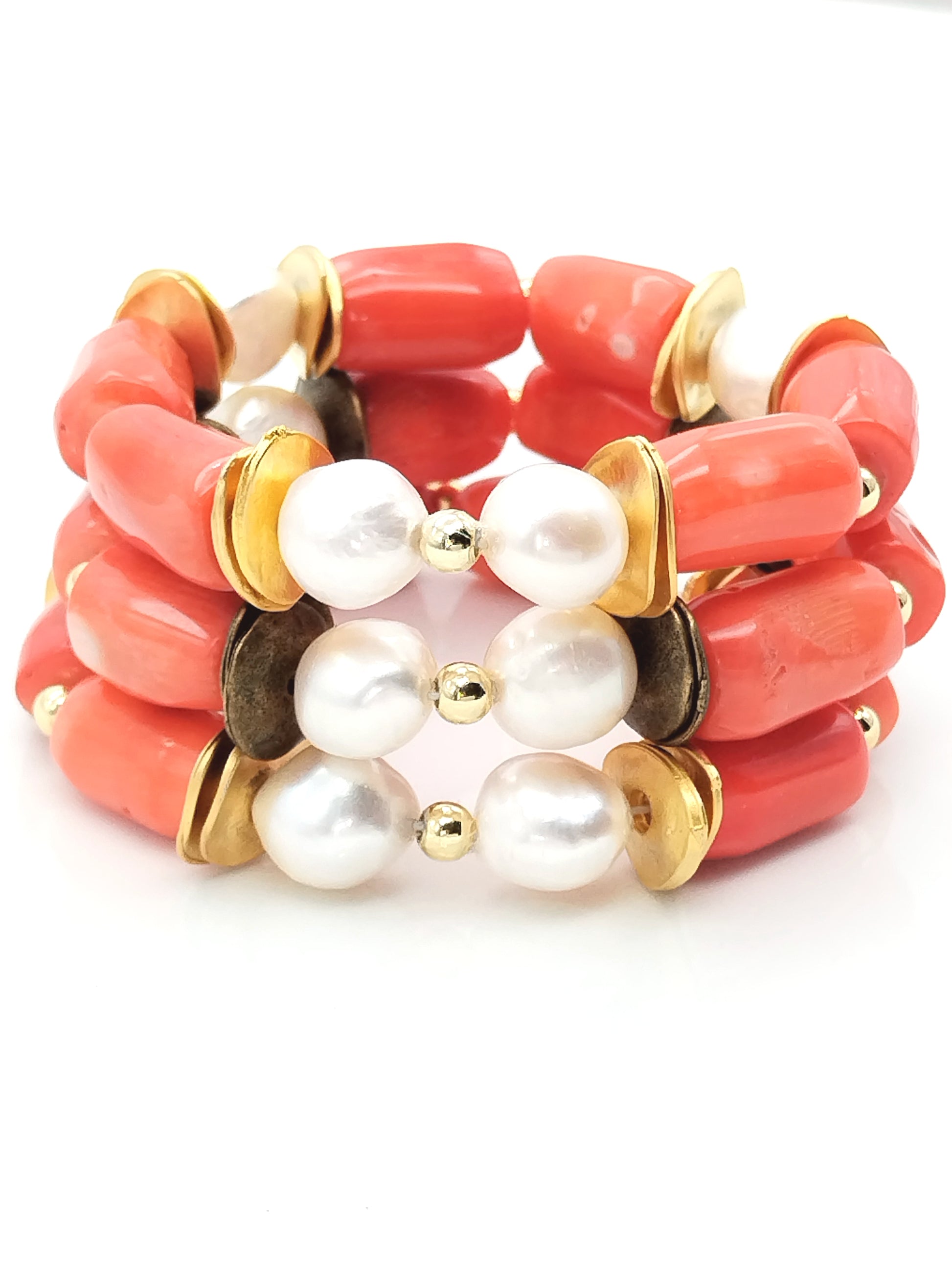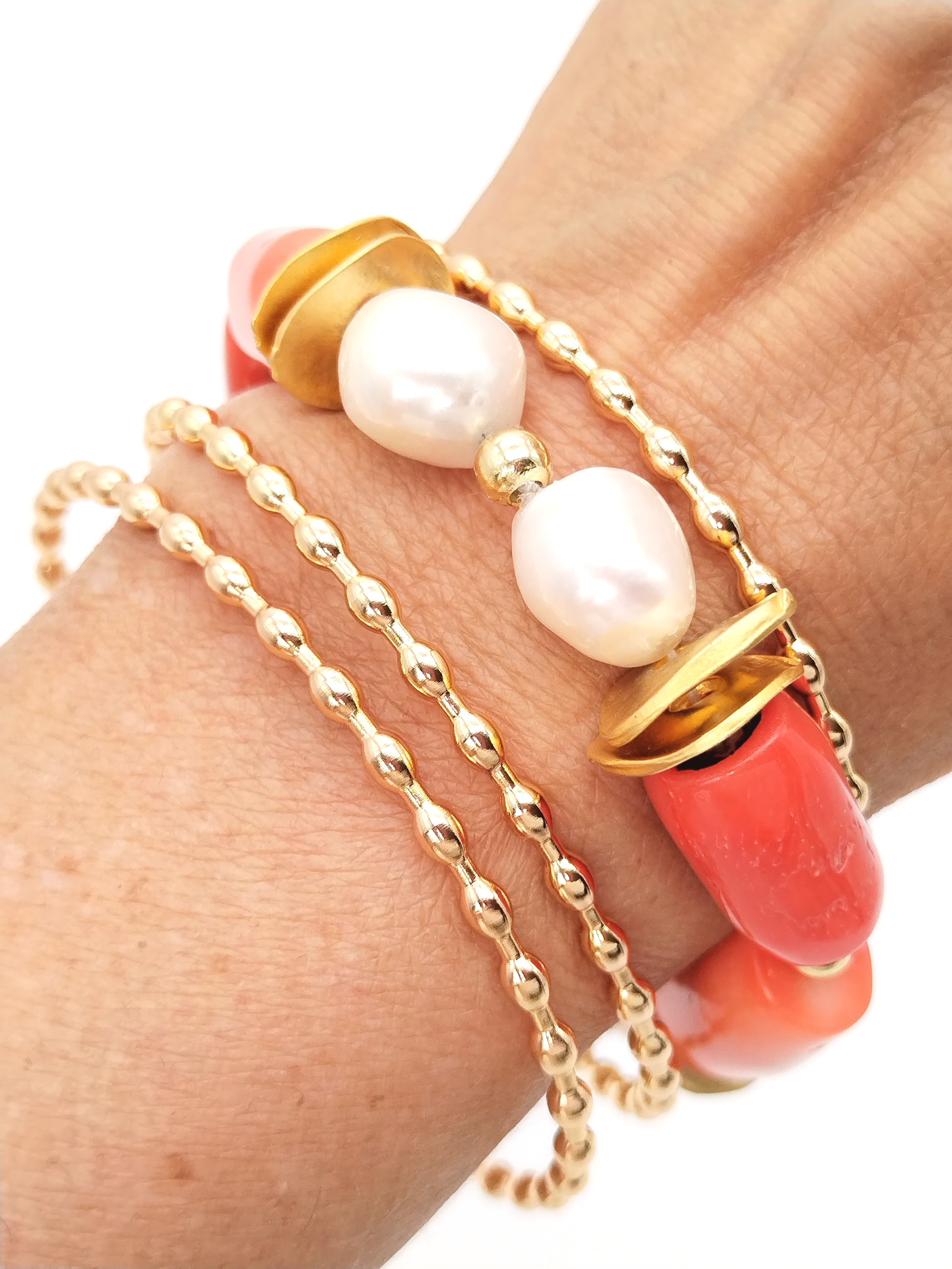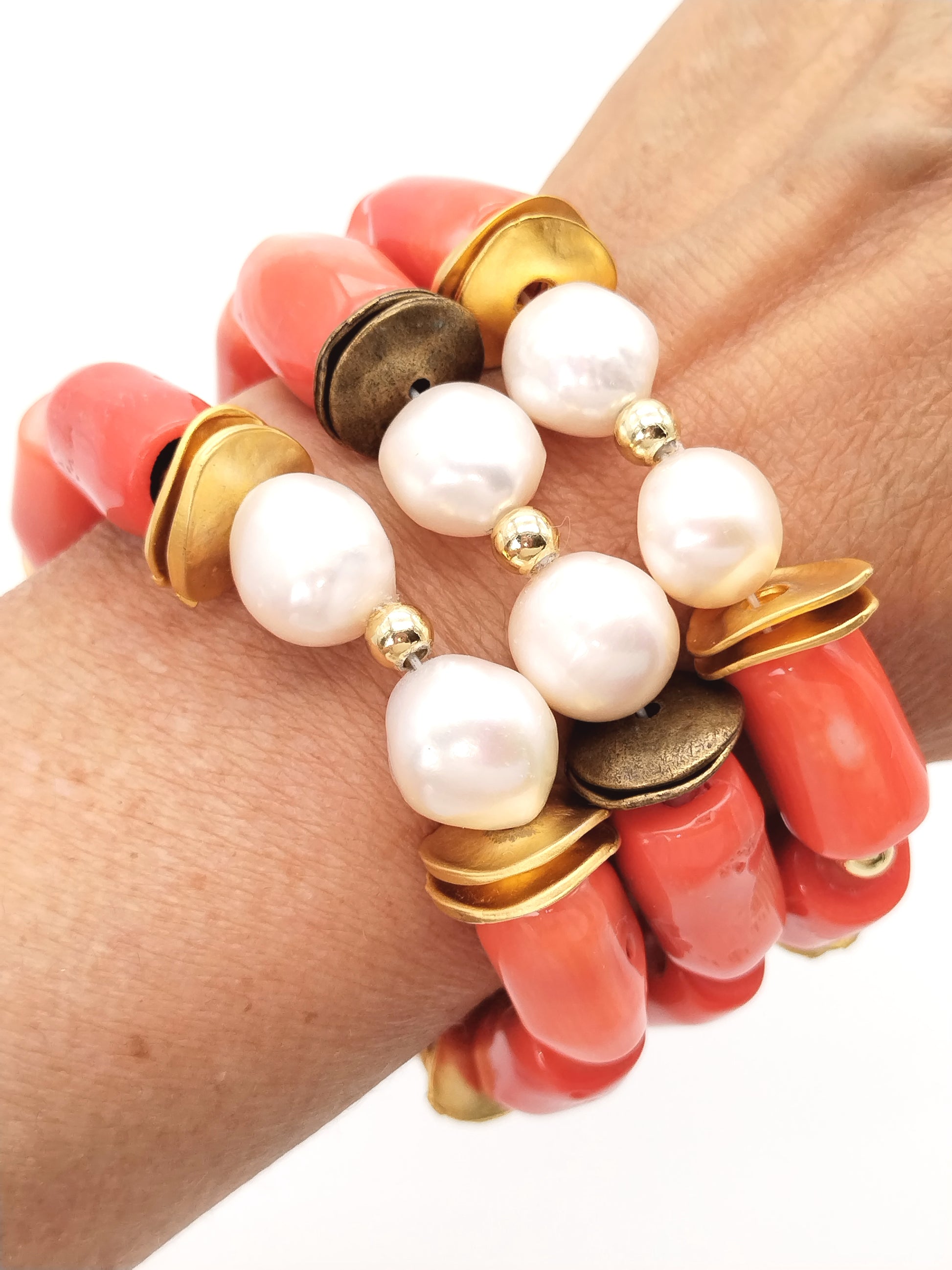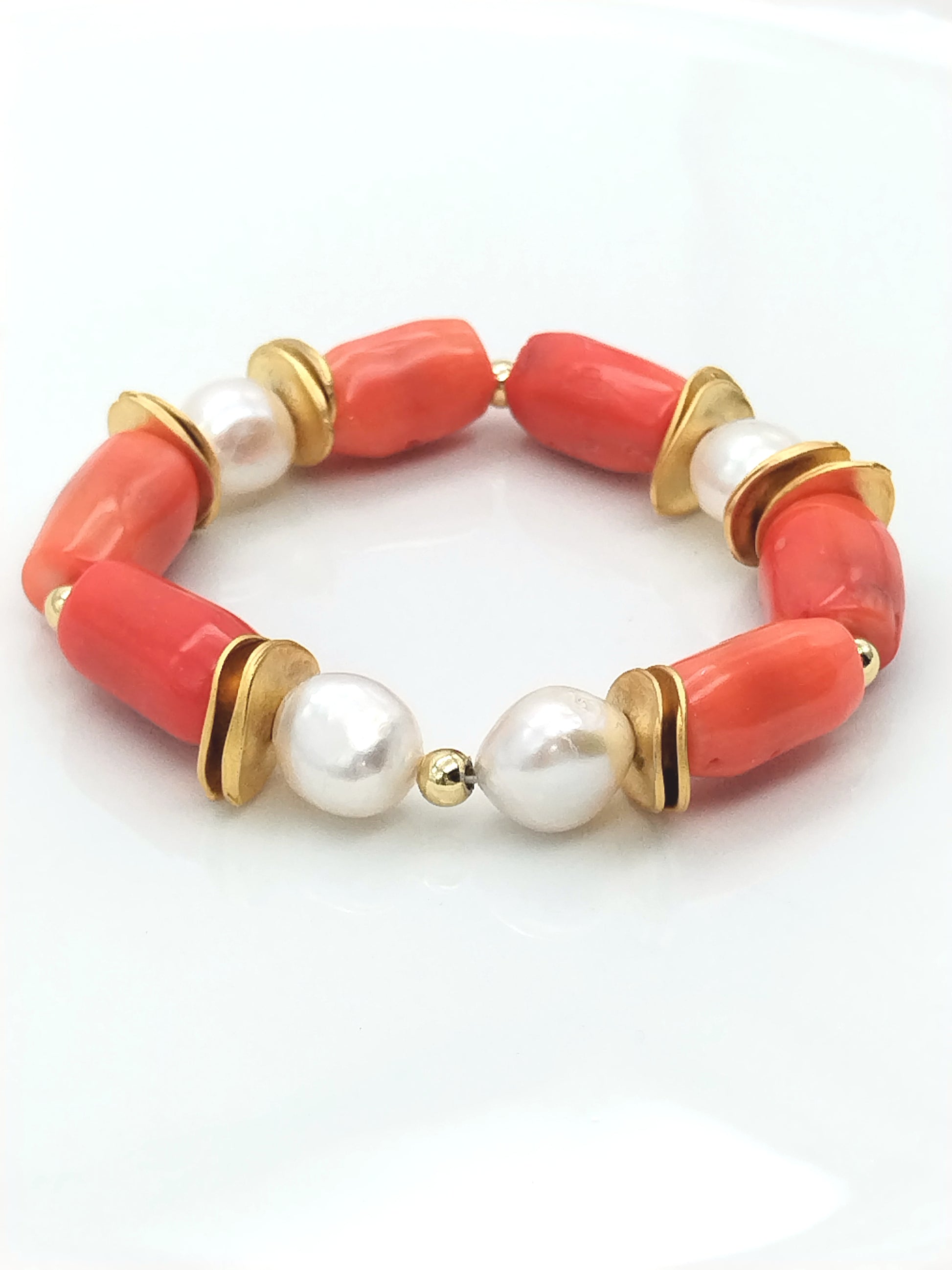 Esta elegante y única pulsera es imprescindible en el joyero de cualquier fashionista. Hecha con perlas barrocas blancas AAA y barriles de coral bambú, también incluye discos dorados o bronceados y pequeñas cuentas doradas. Su diseño elástico permite combinarlas fácilmente y ofrece un ajuste perfecto. Prepárate para destacar este verano con este precioso y elegante accesorio.