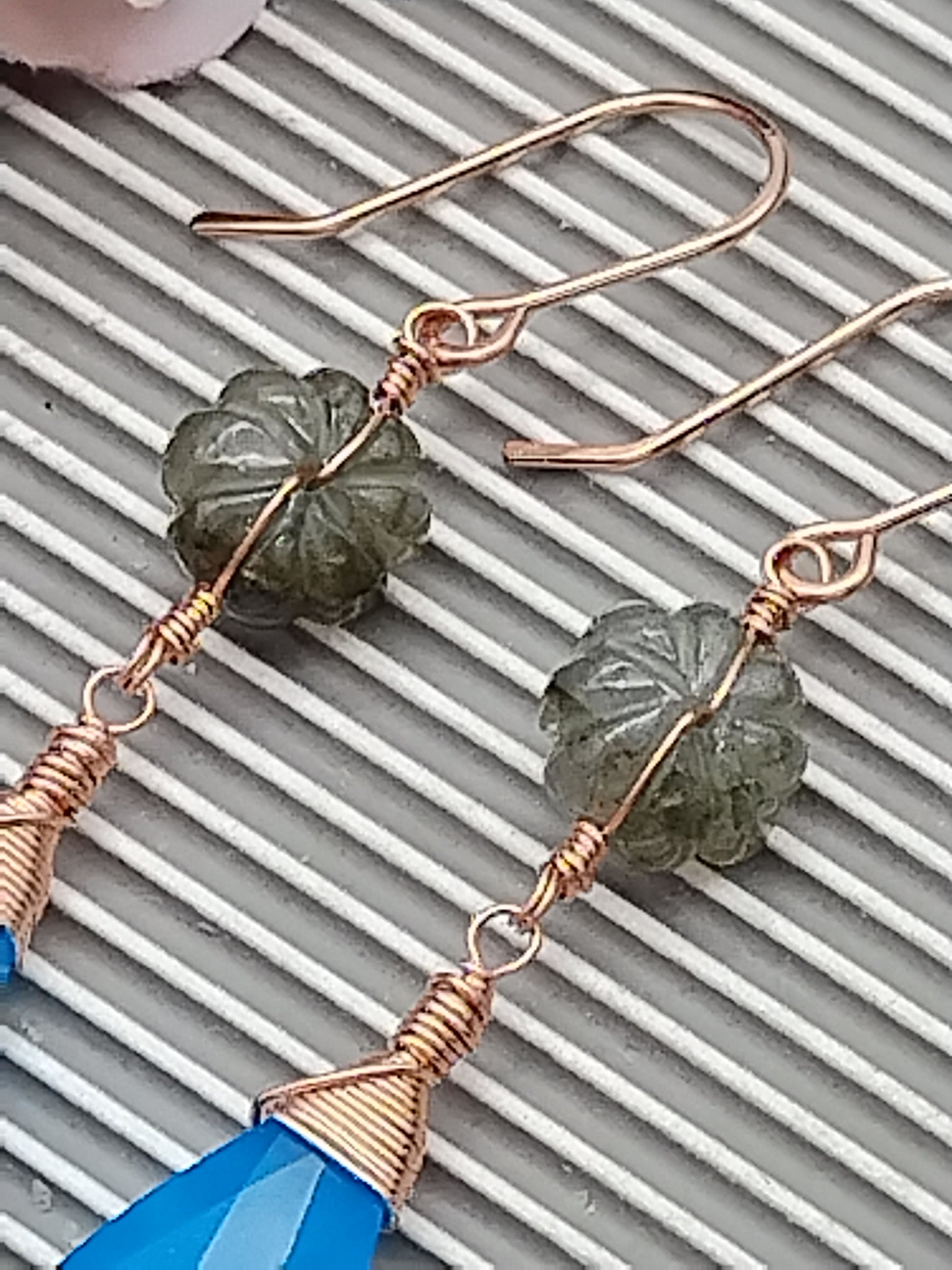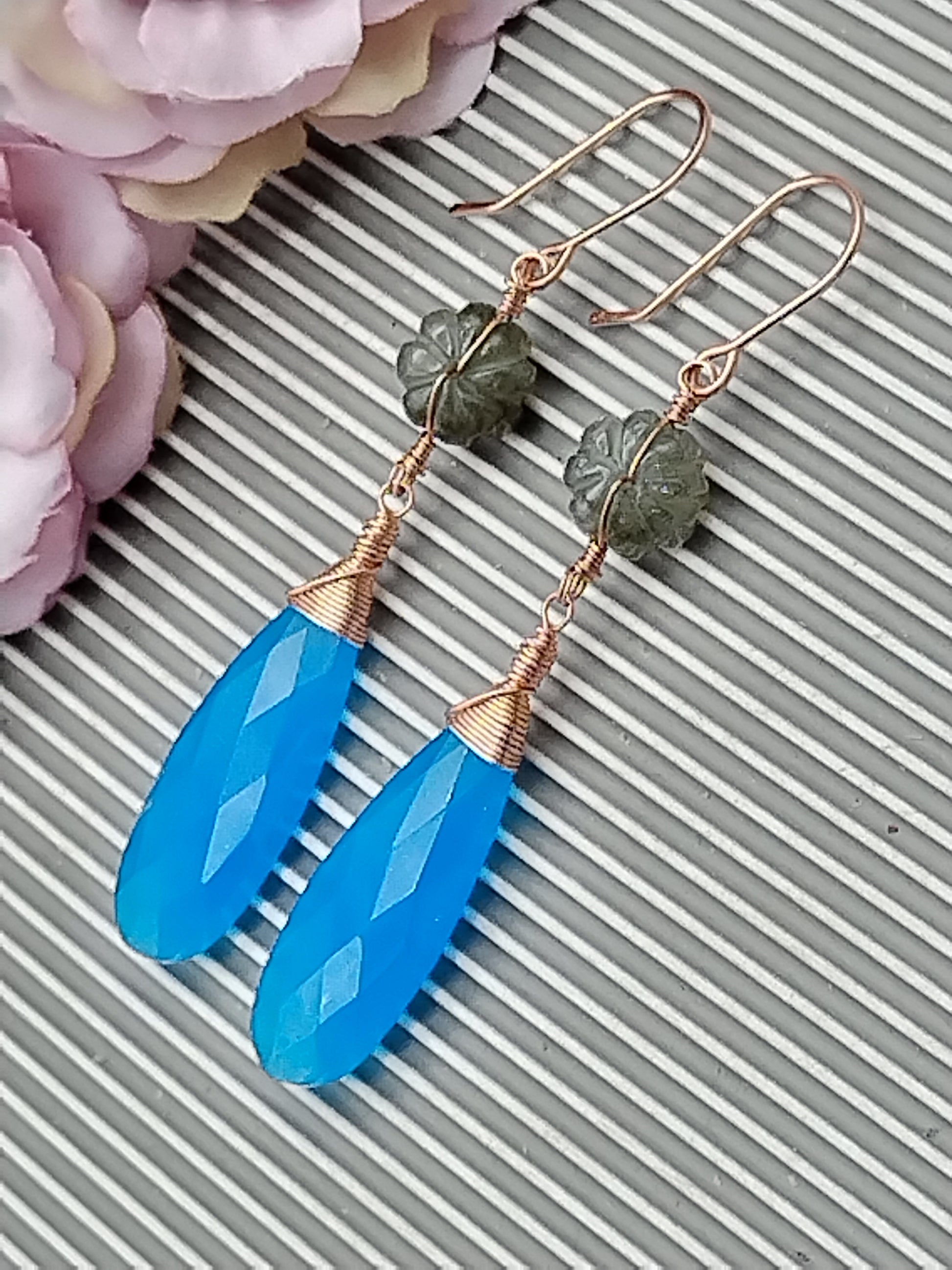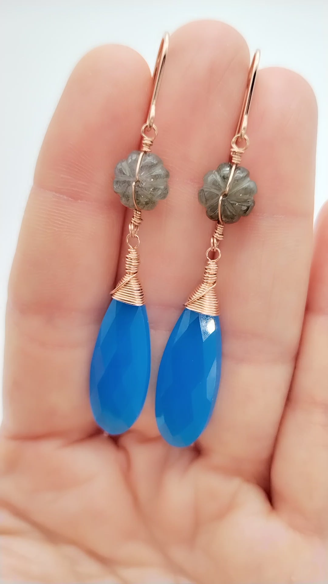 Estos lujosos aretes colgantes presentan calcedonia azul y labradorita tallada en forma de calabaza engastada en oro rosa de 14 k. Son elegantes y delicados con una gran caída. Disfrute de la calidad atemporal de las piedras preciosas con estos aretes colgantes largos.