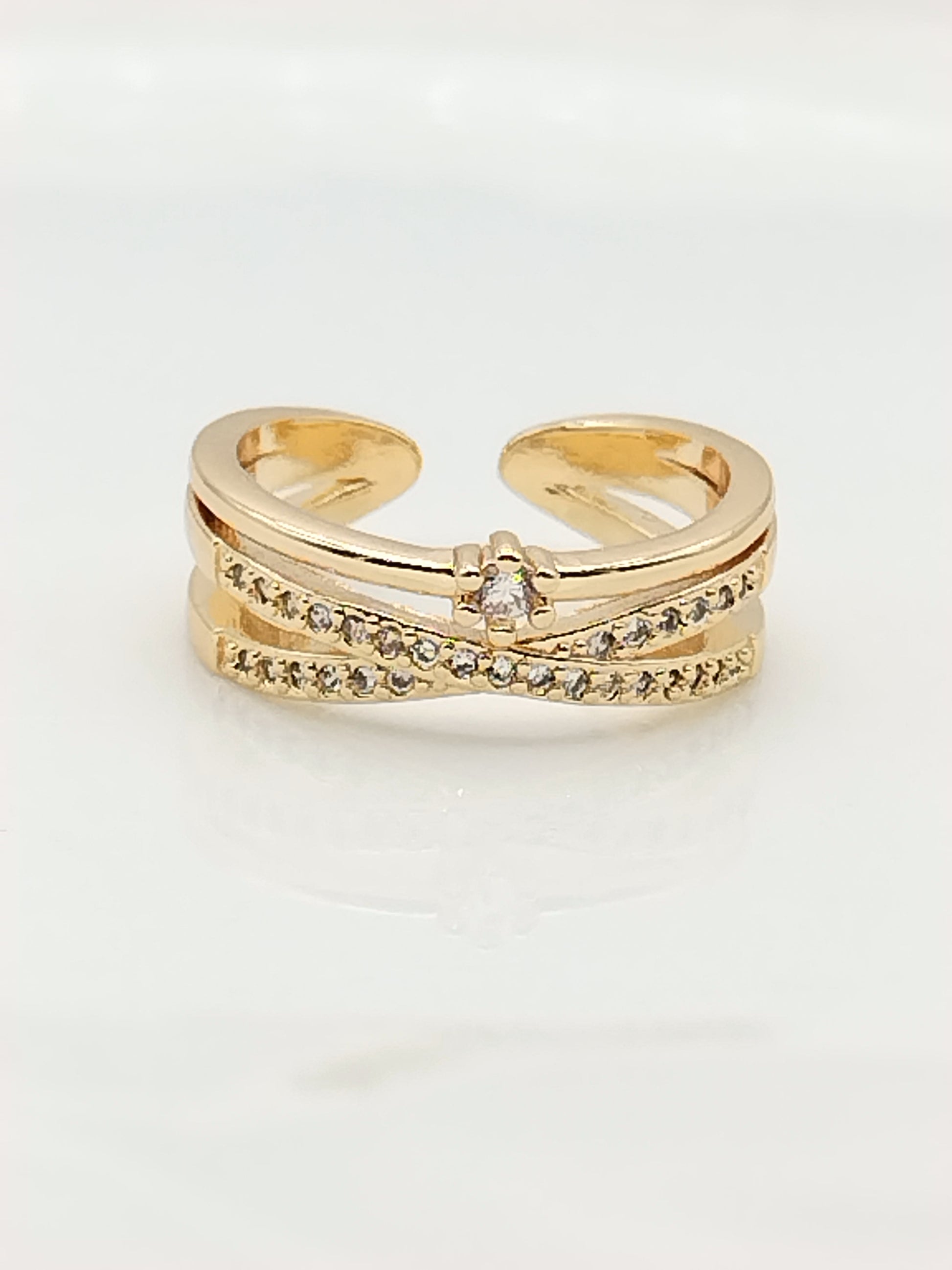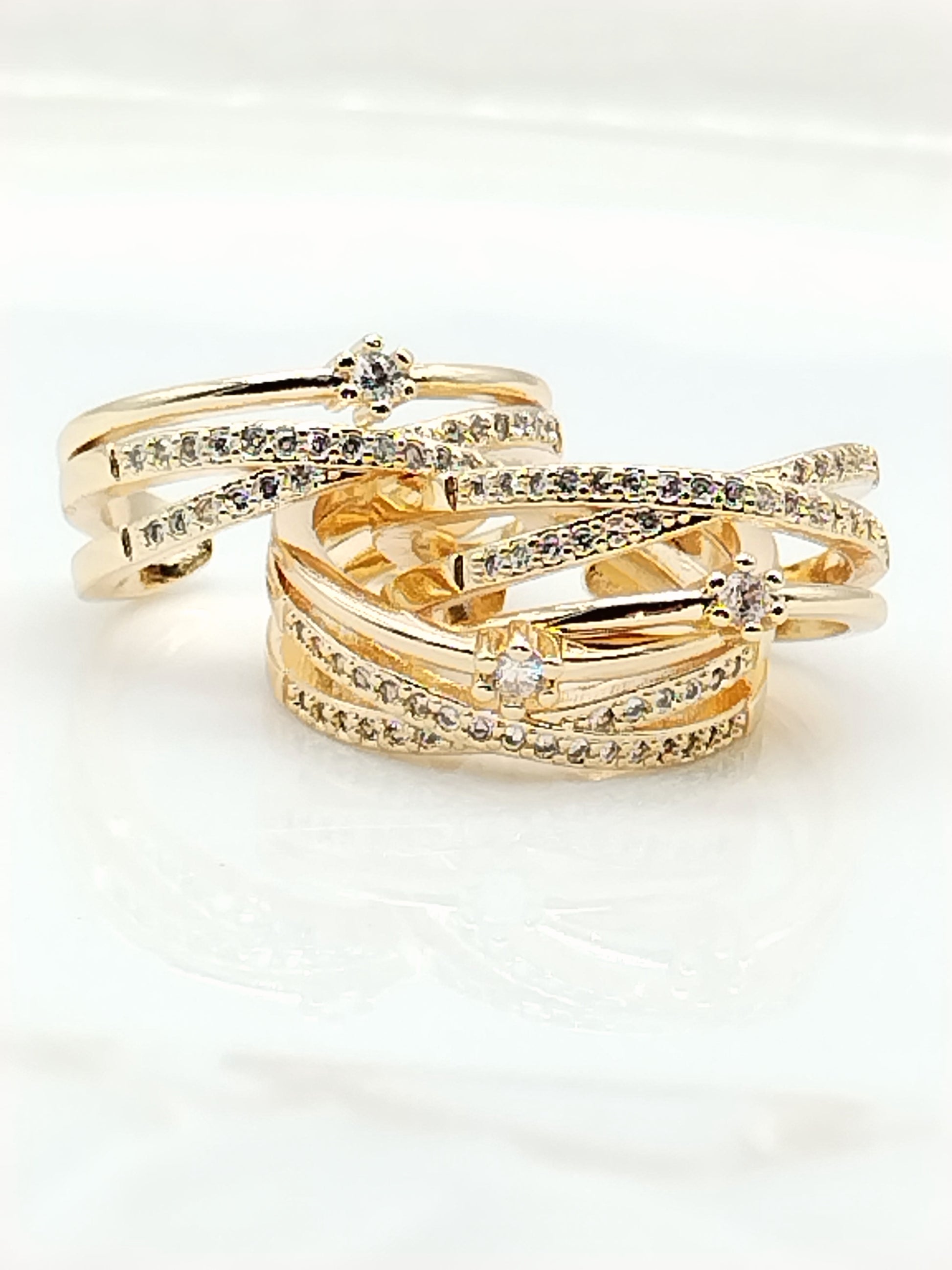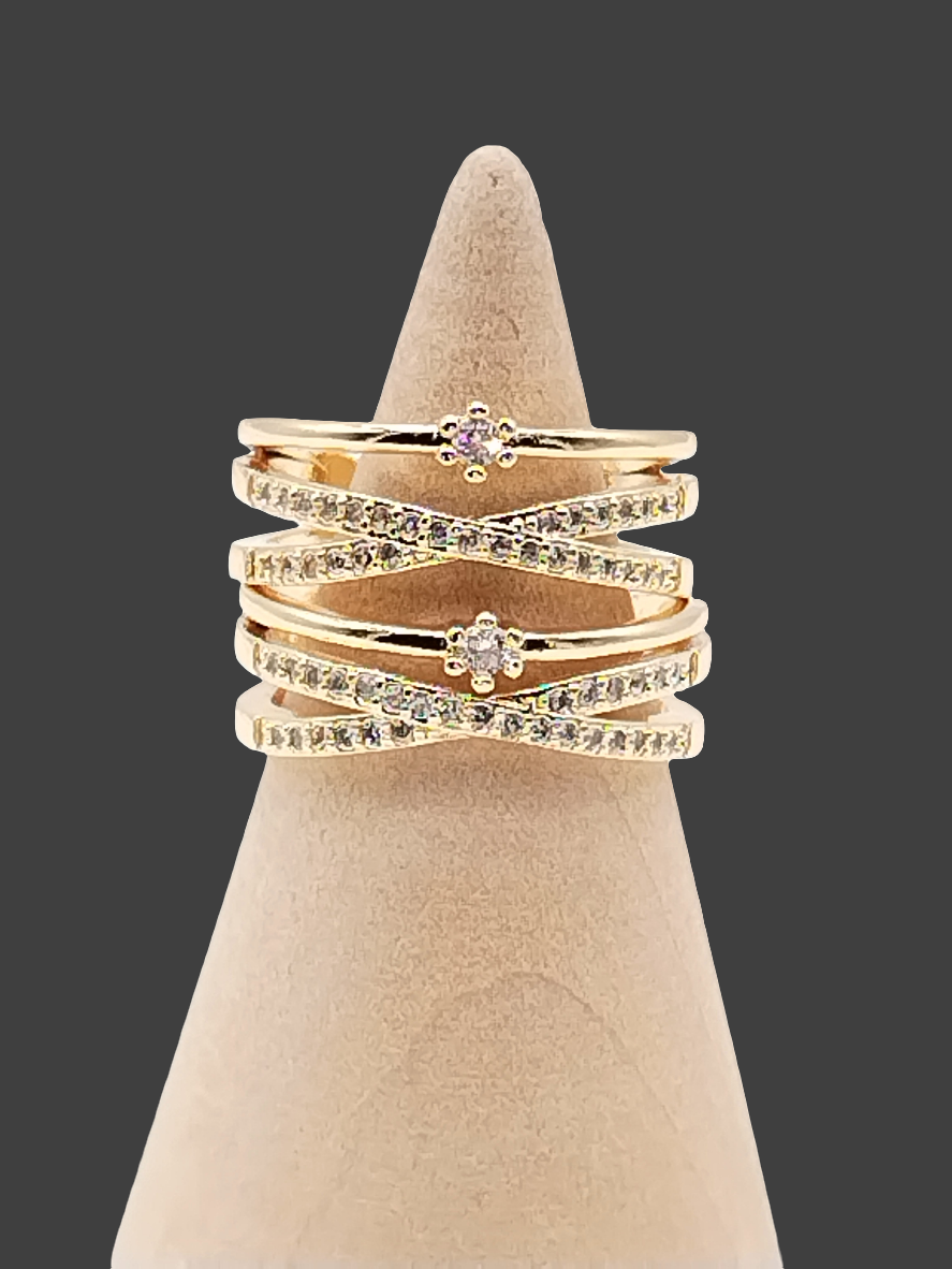 Mejora tu estilo con nuestro elegante anillo de circonitas cúbicas bañado en oro. Perfecto para cualquier ocasión, esta moderna pieza presenta un impresionante diseño en forma de cruz con tres filas superpuestas. El diseño minimalista y moderno sin duda dejará huella y te hará destacar entre la multitud. Un artículo imprescindible para cualquier mujer a la moda o un gran regalo para las chicas que aman el estilo urbano.