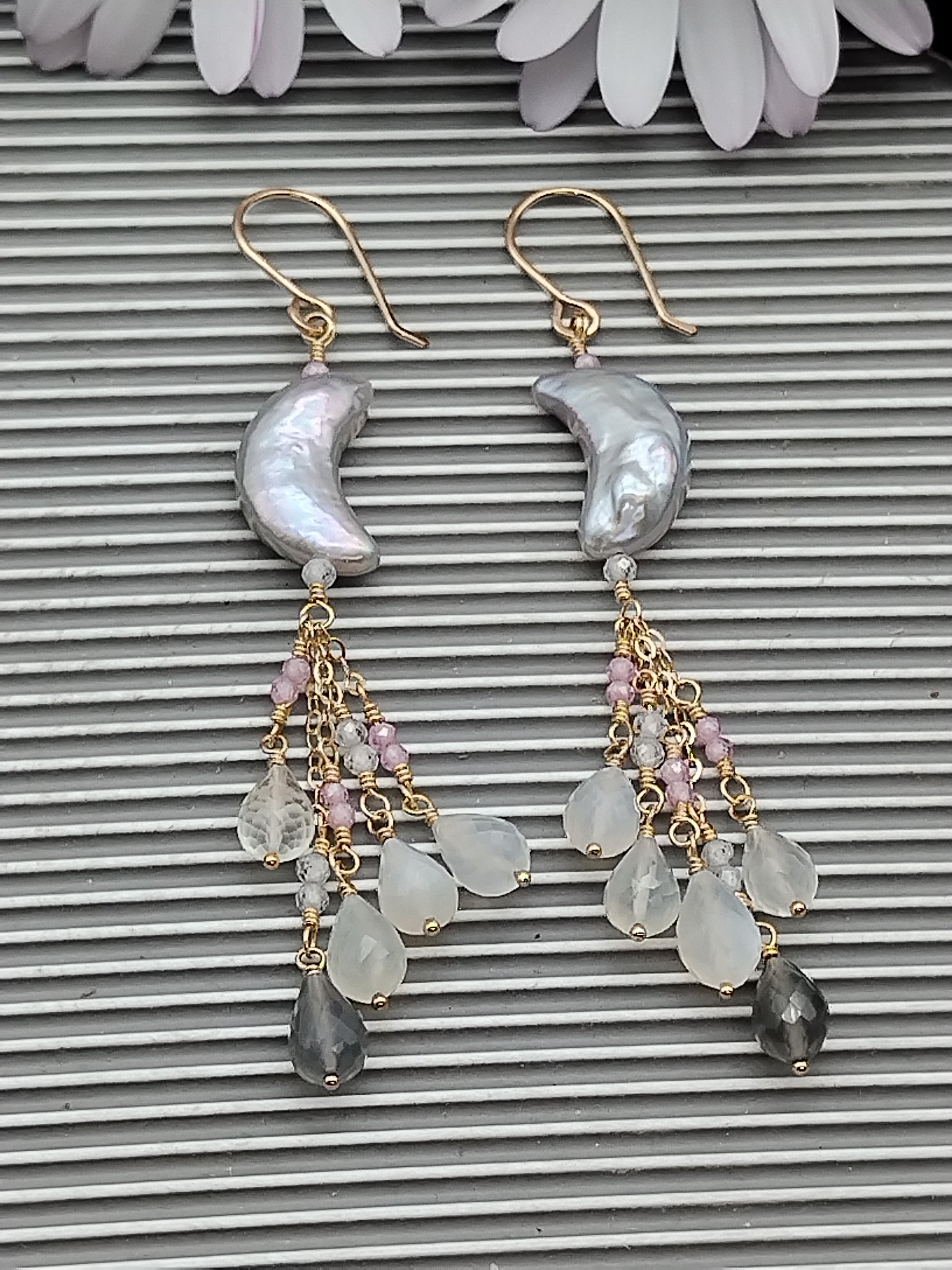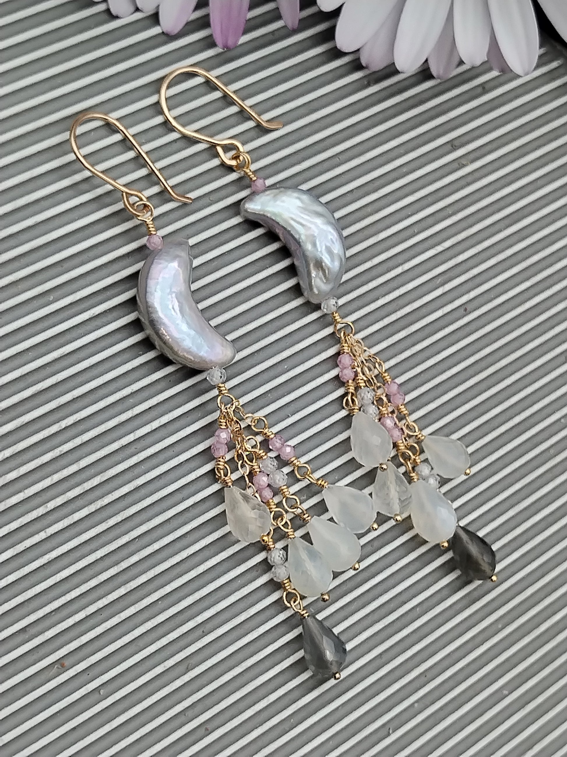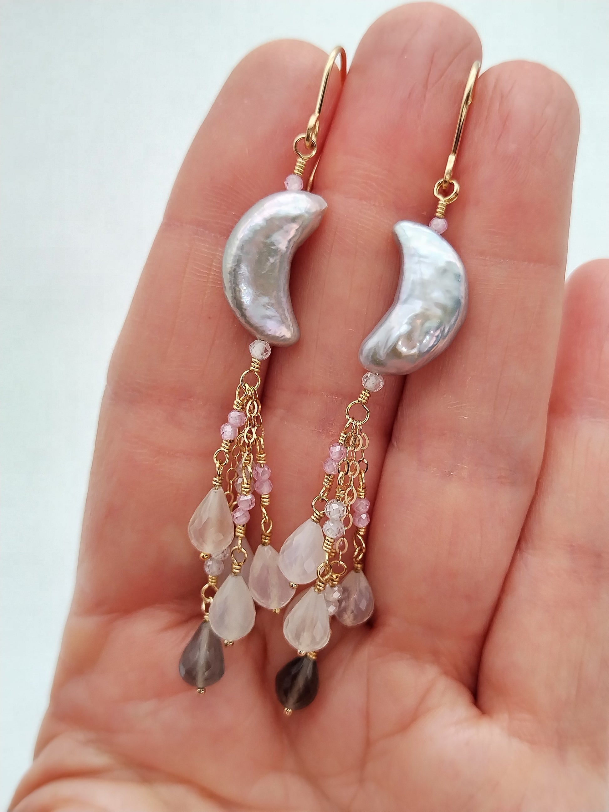 Preciosa perla de agua dulce AAA+ gris única en su tipo (16 x 8 mm) y colgando como una cascada de ellas, brillantes y pequeñas cuentas de circonita rosa AAA+ facetadas (2 mm) rematadas con fabulosas piedras lunares AAA+ facetadas de arcoíris y chocolate Briolette (8 mm). Todo meticulosamente envuelto a mano en oro de 14k relleno y alambres para aretes forjados a mano en oro de 14k relleno también.