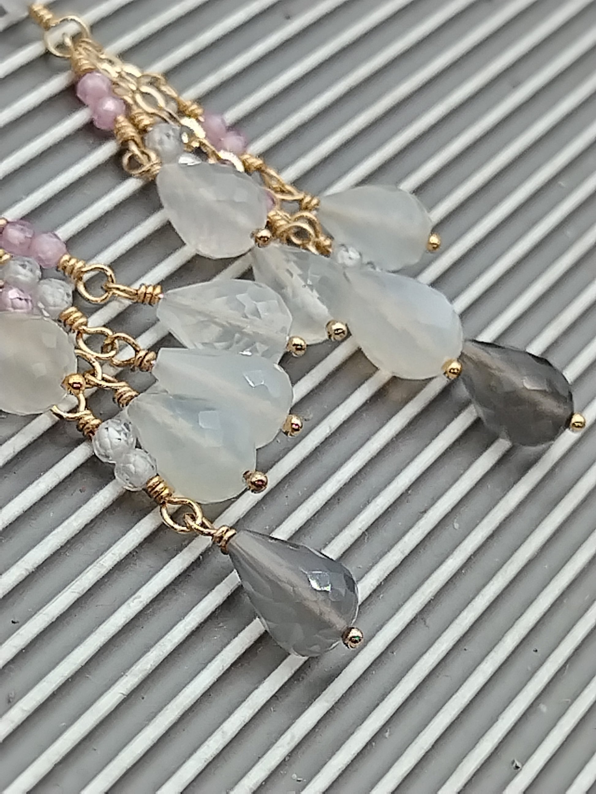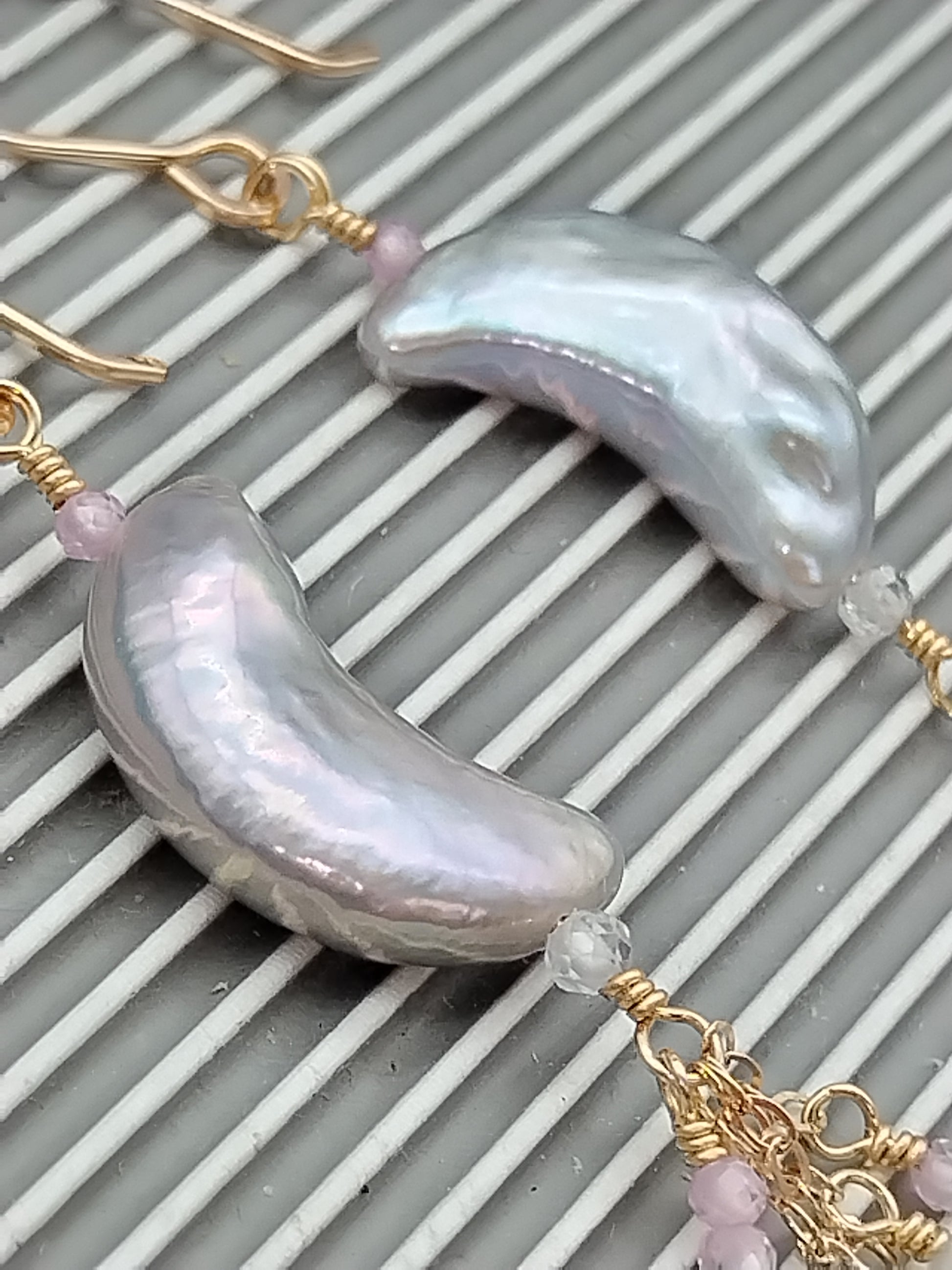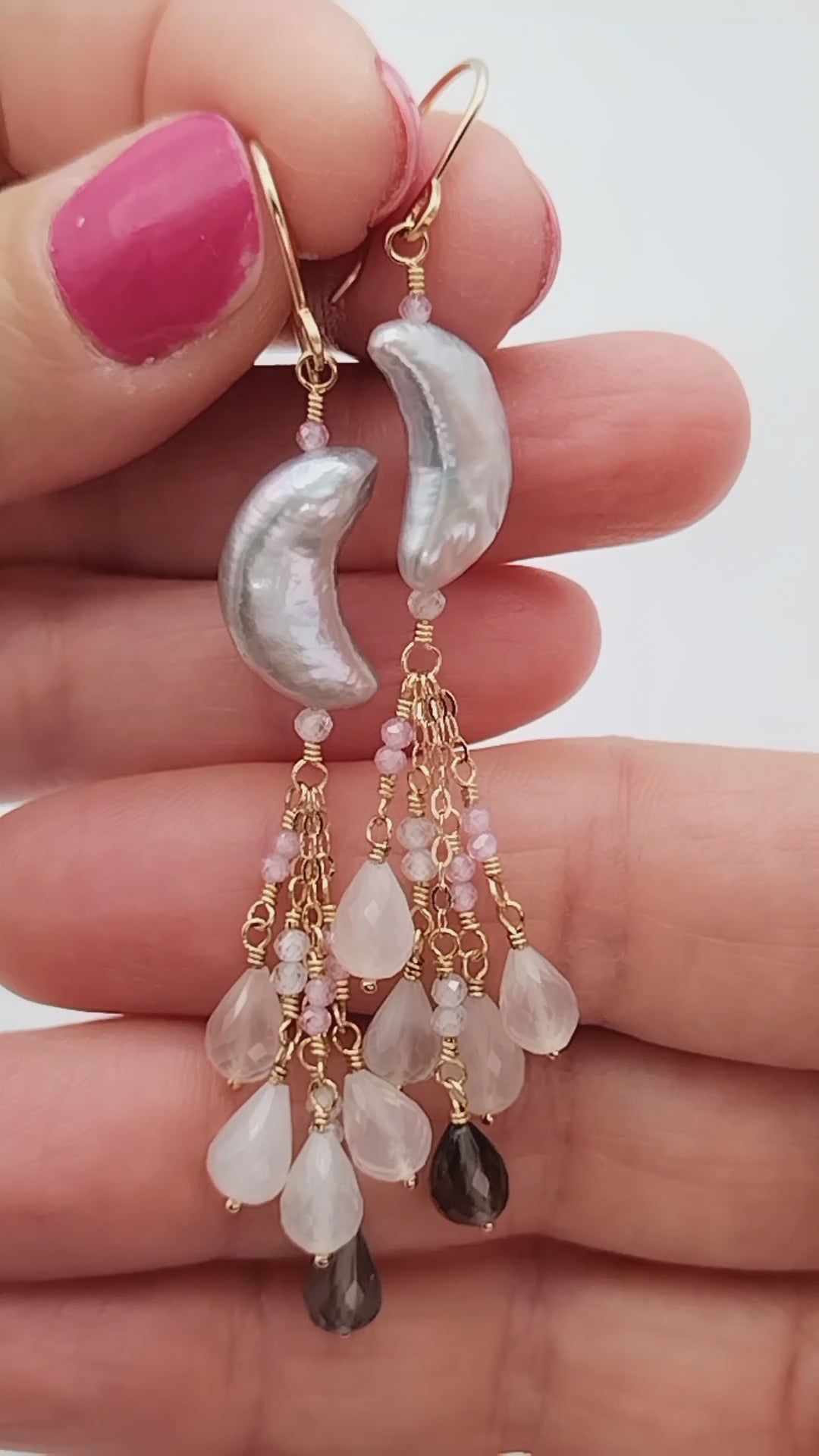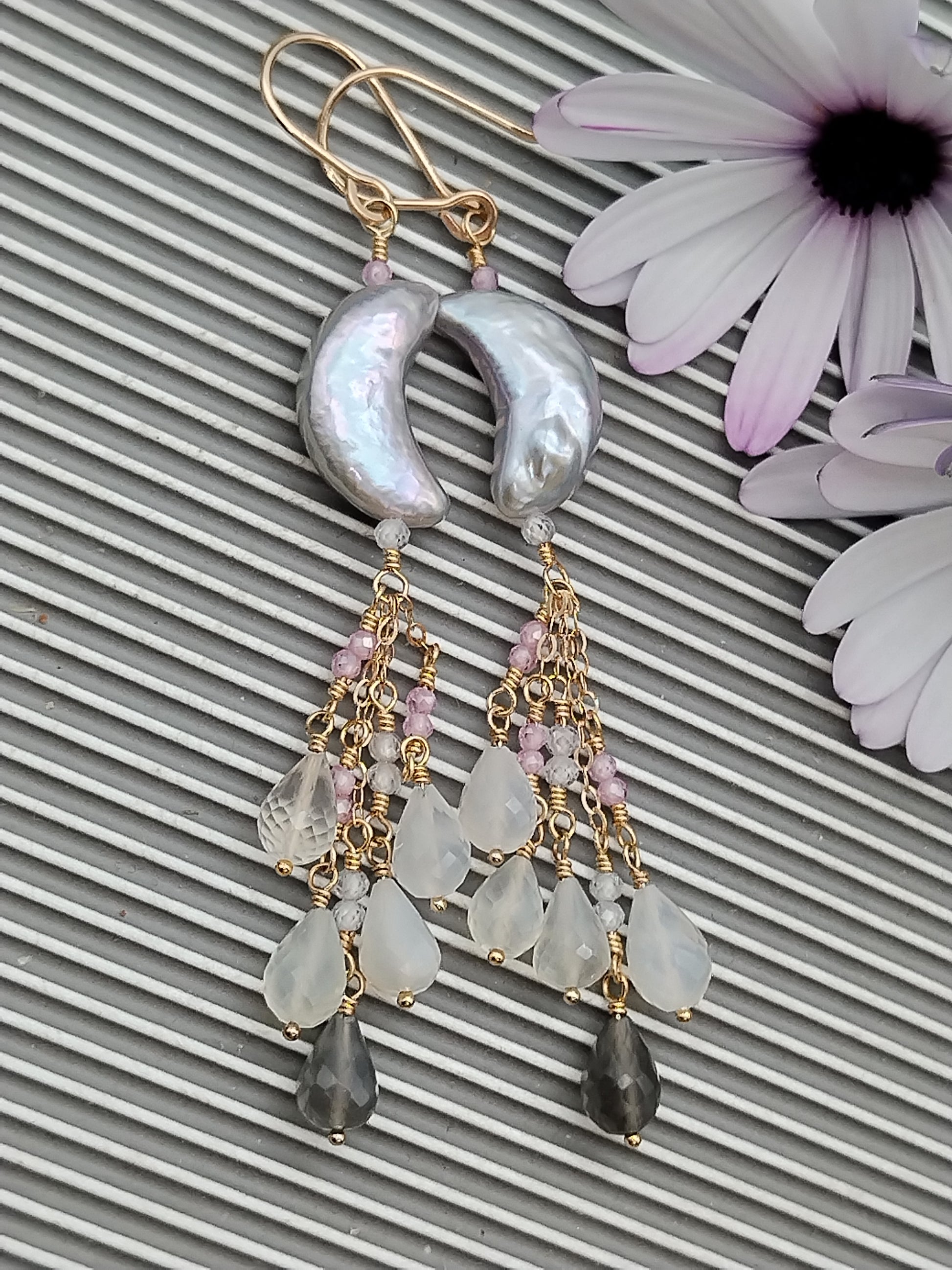 Preciosa perla de agua dulce AAA+ gris única en su tipo (16 x 8 mm) y colgando como una cascada de ellas, brillantes y pequeñas cuentas de circonita rosa AAA+ facetadas (2 mm) rematadas con fabulosas piedras lunares AAA+ facetadas de arcoíris y chocolate Briolette (8 mm). Todo meticulosamente envuelto a mano en oro de 14k relleno y alambres para aretes forjados a mano en oro de 14k relleno también.