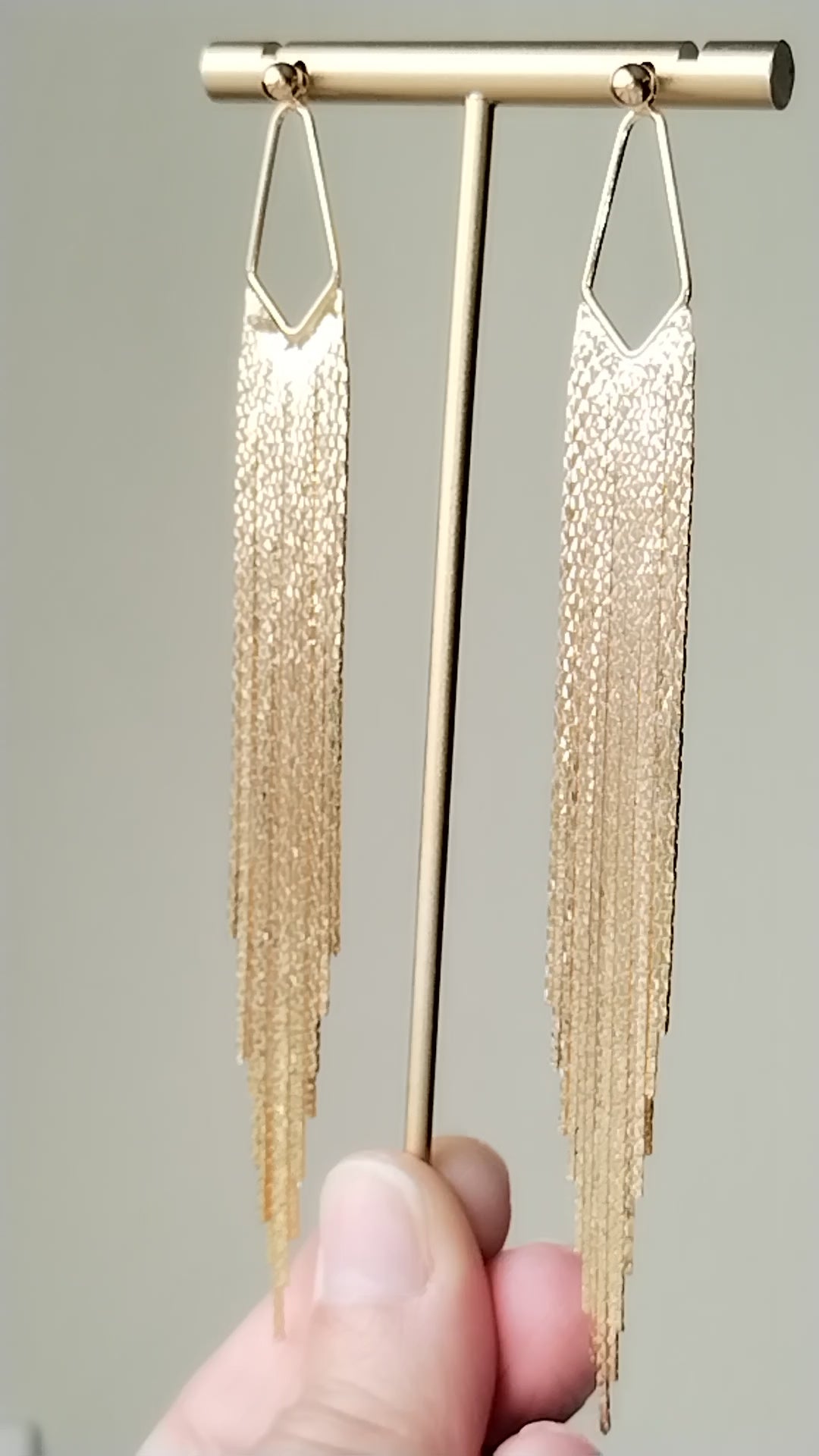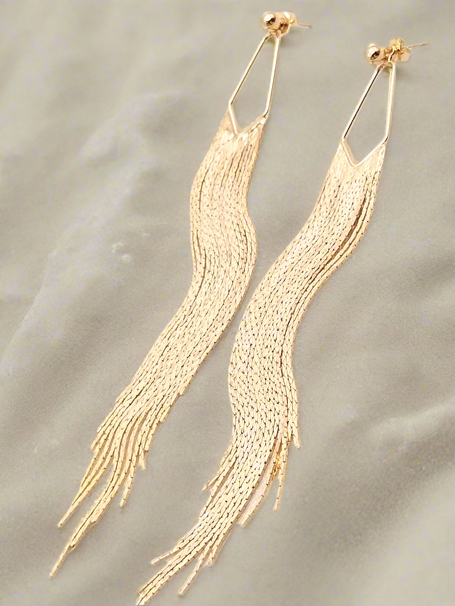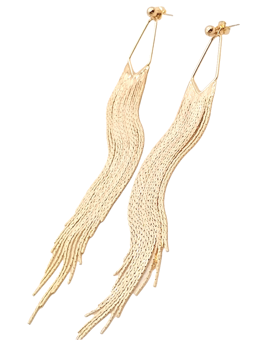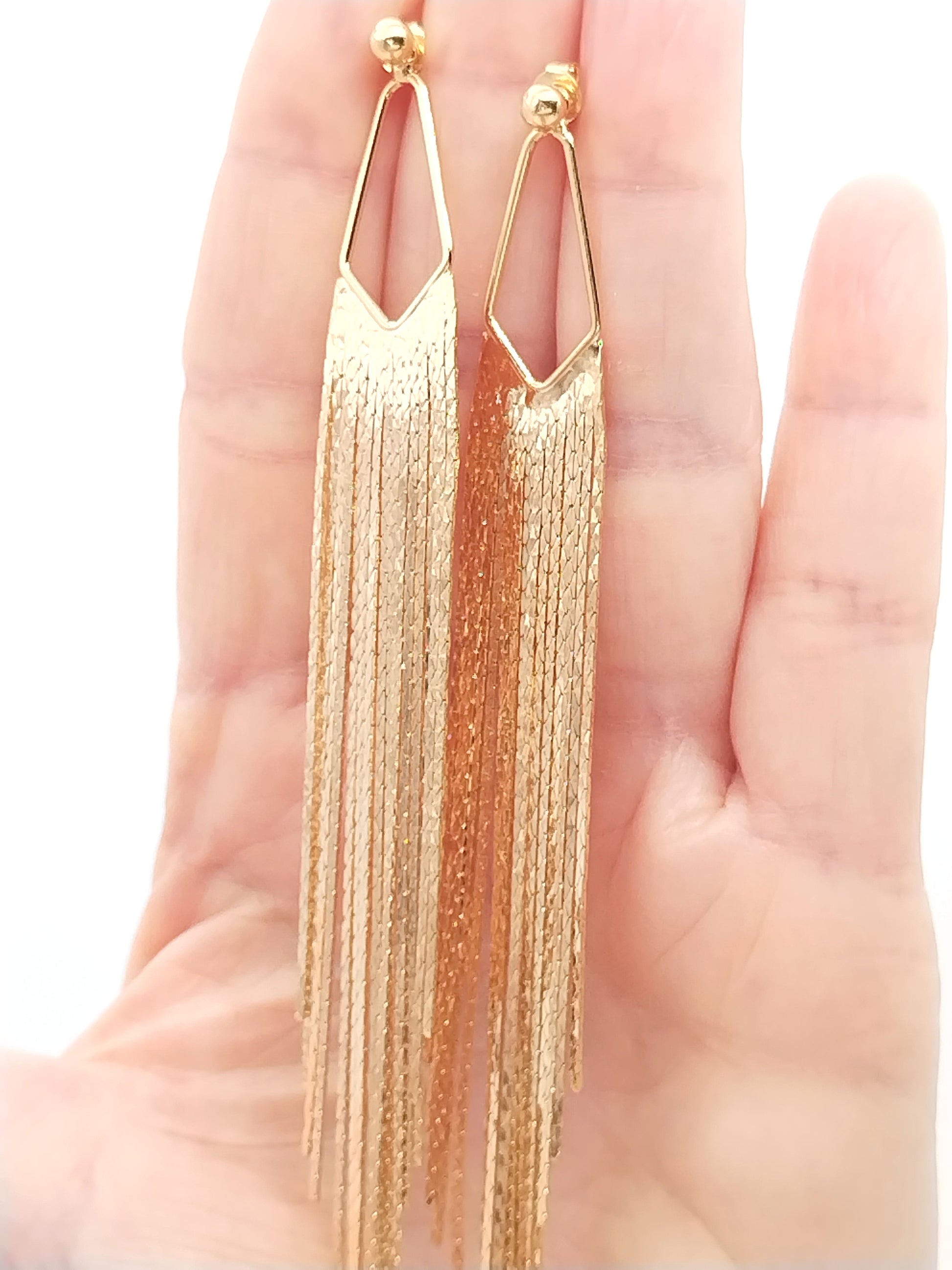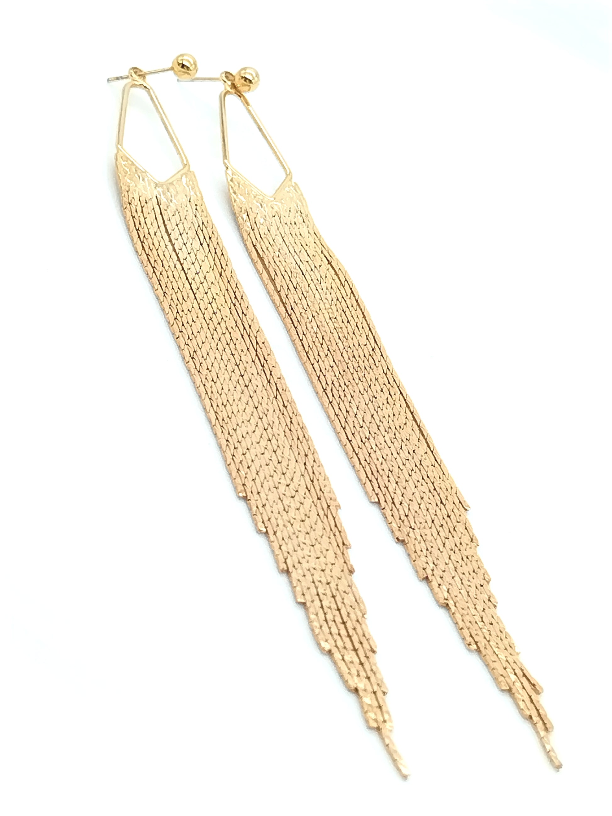 ¡Libera la fashionista que llevas dentro con nuestros pendientes de cadena larga con flecos! Estos pendientes ligeros, fabricados con oro brillante de 18 quilates, son perfectos para cualquier ocasión festiva. Realza tu atuendo informal o de oficina con su diseño elegante y moderno. ¡No te pierdas este accesorio de moda!
