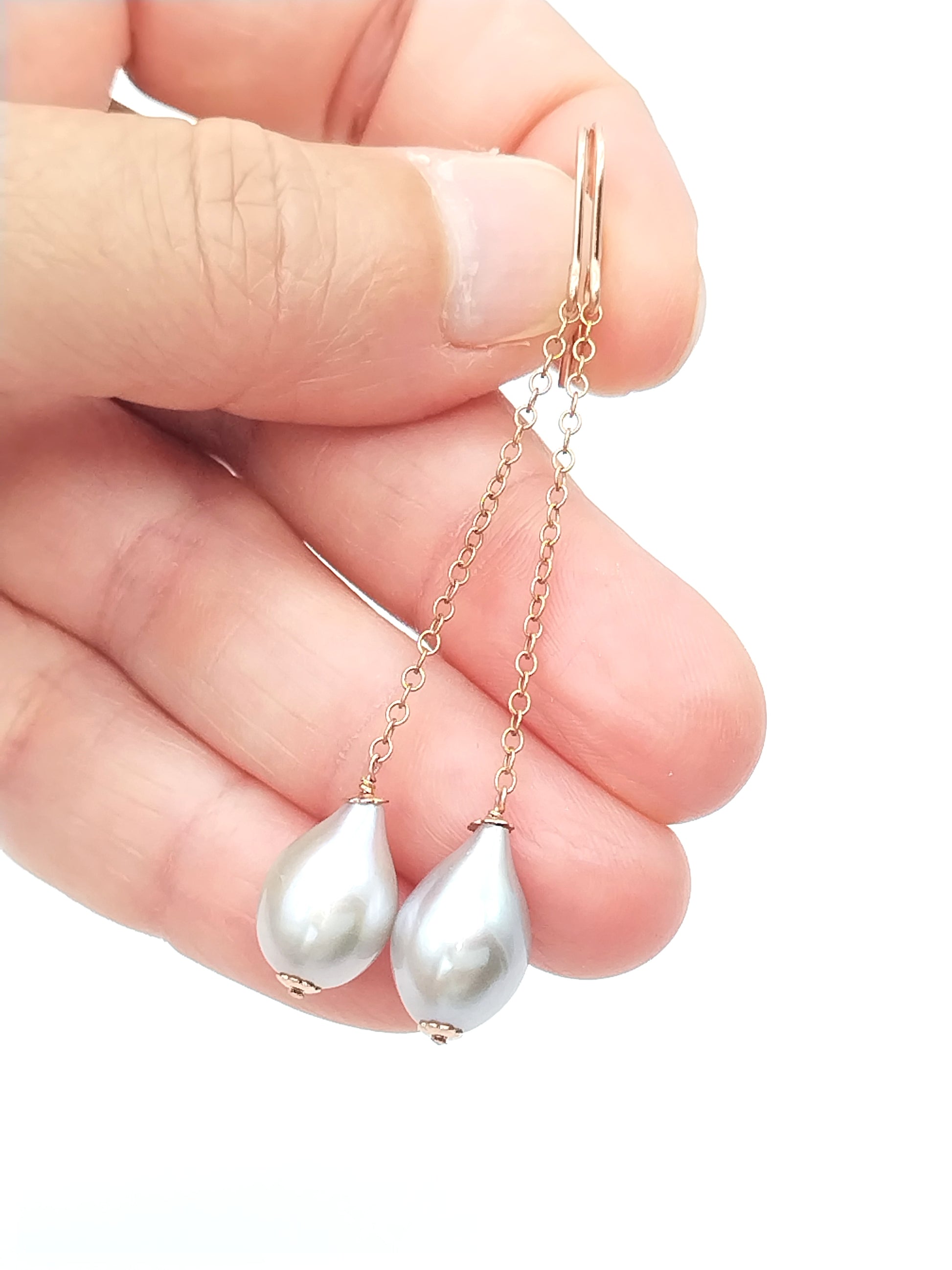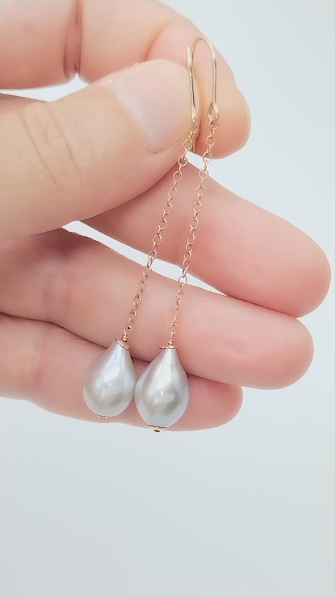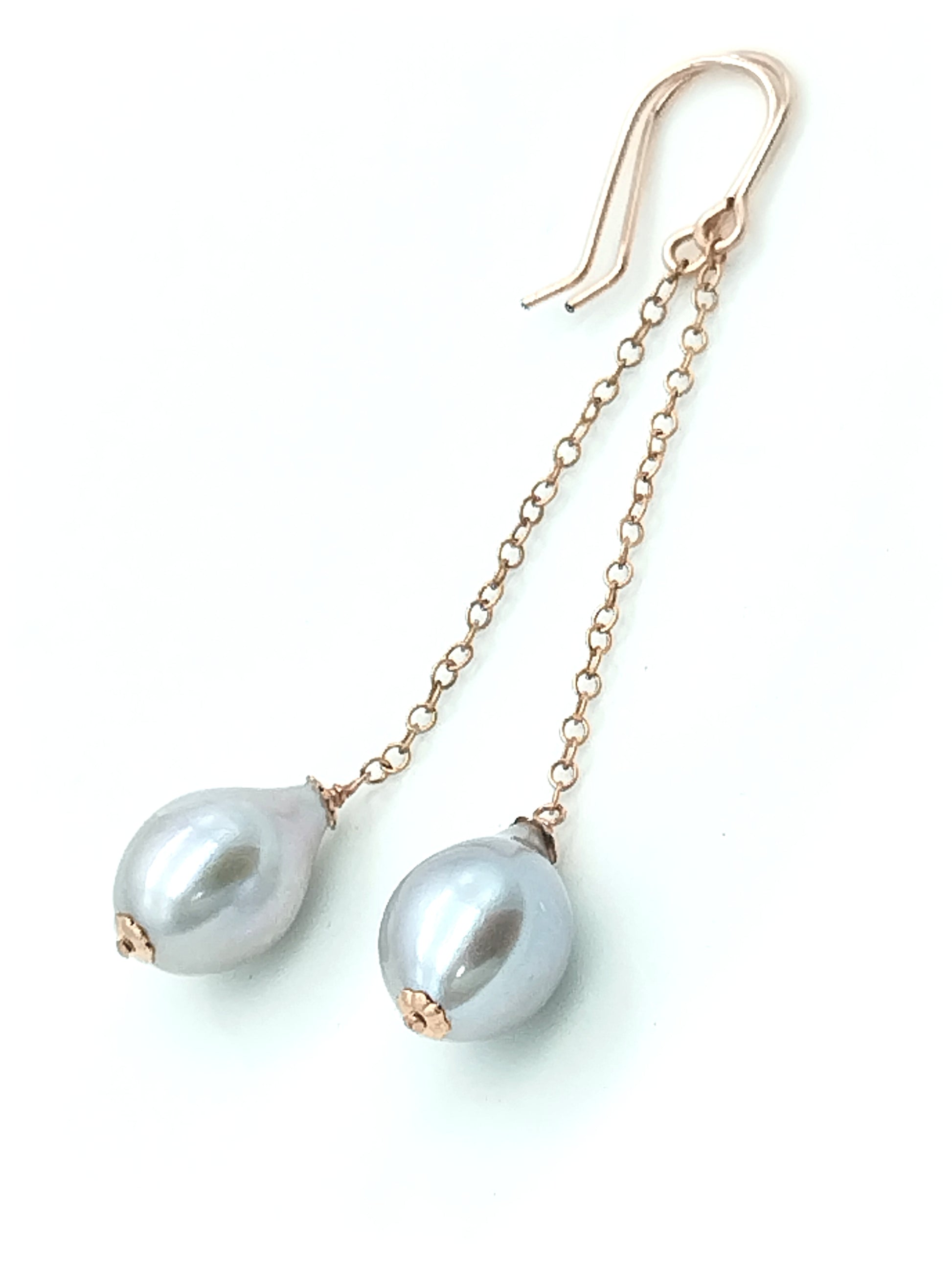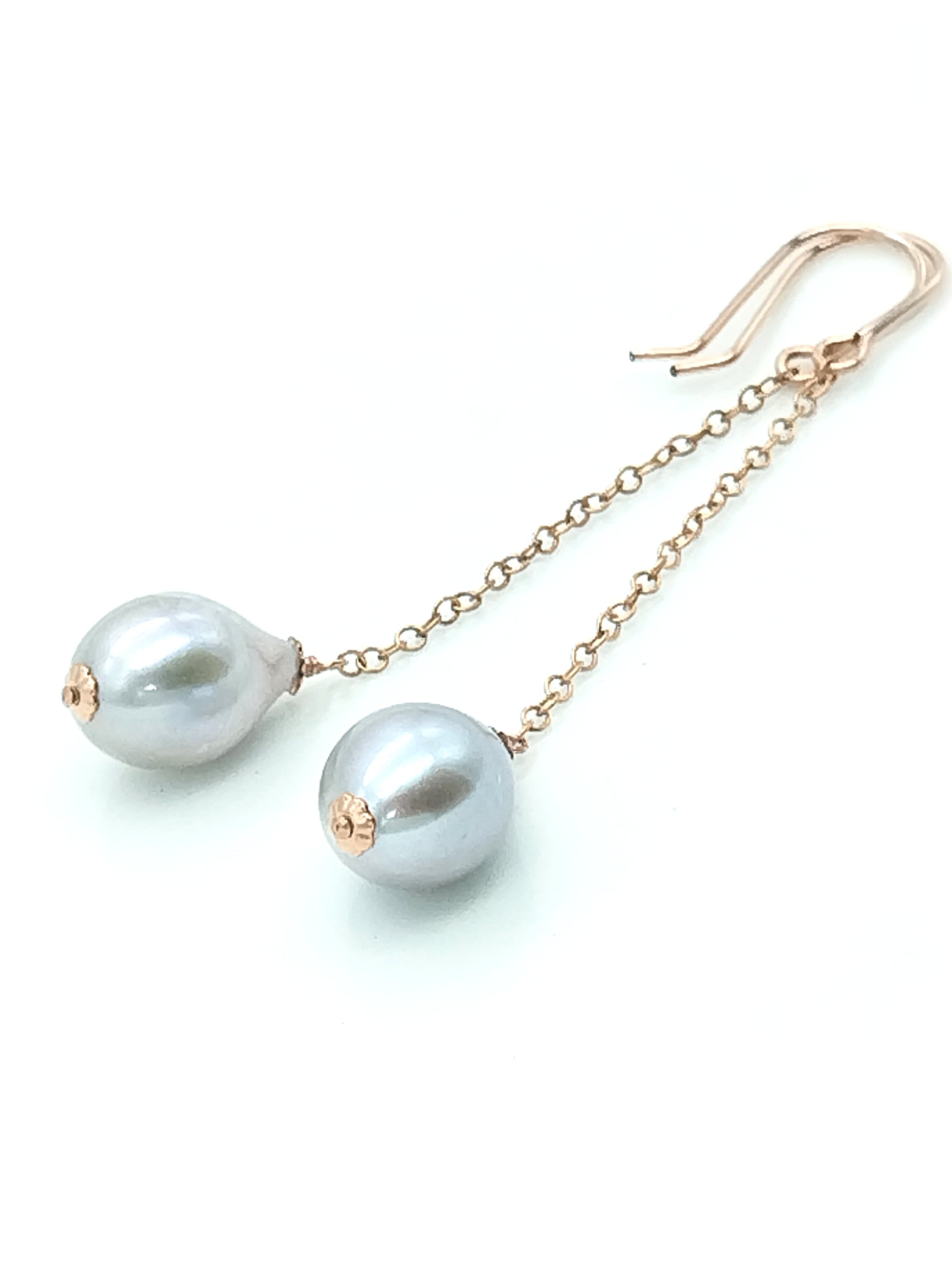 Delicada y hermosa perla gris AAA+ (15 x 10 mm) con mucho brillo y un color muy singular entre gris y plata, envuelta meticulosamente a mano sobre oro rosa de 14 quilates. Las perlas cuelgan de una hermosa cadena rellena de oro rosa de 14 quilates y alambres para aretes rellenos de oro rosa de 14 quilates.