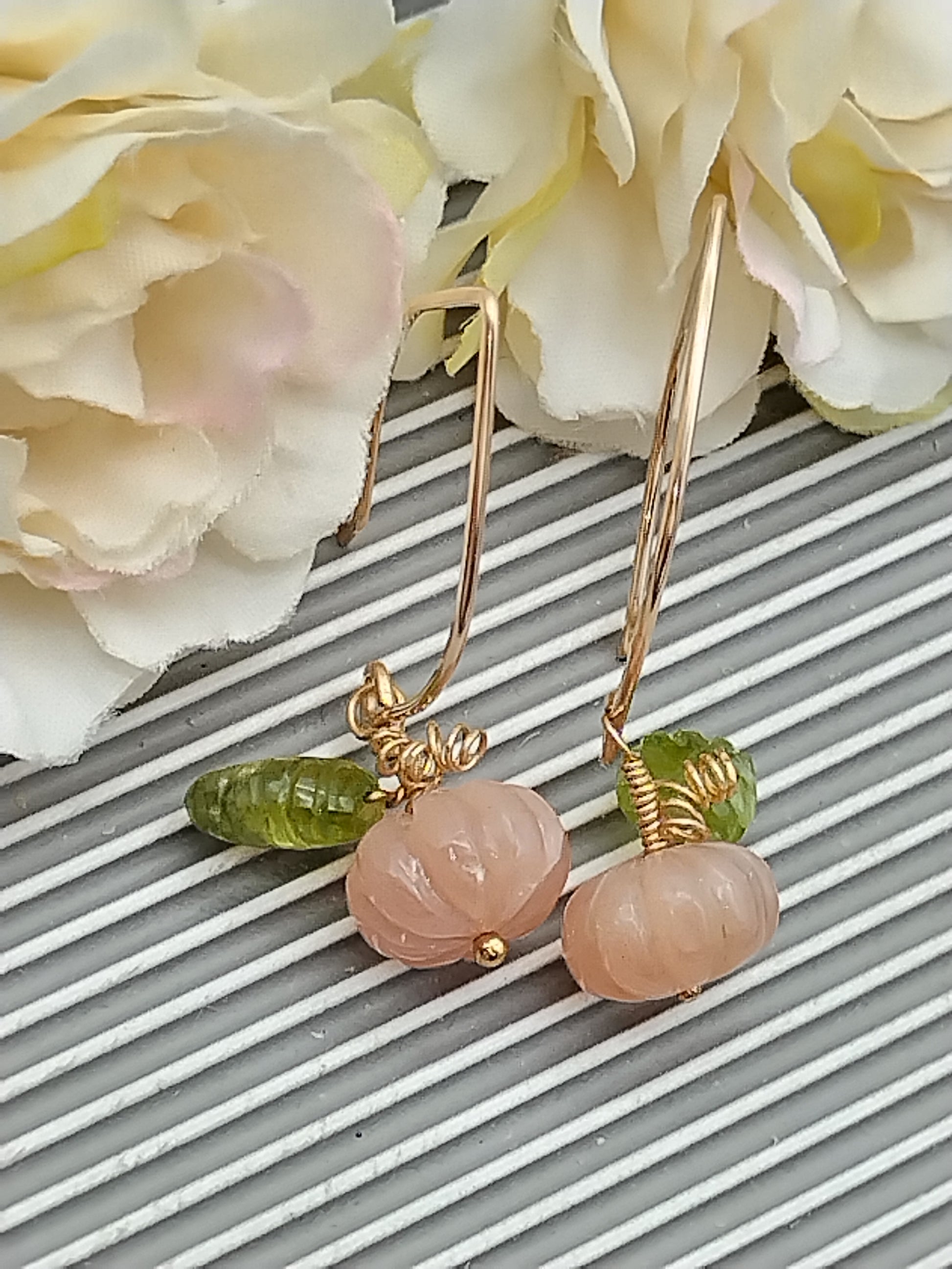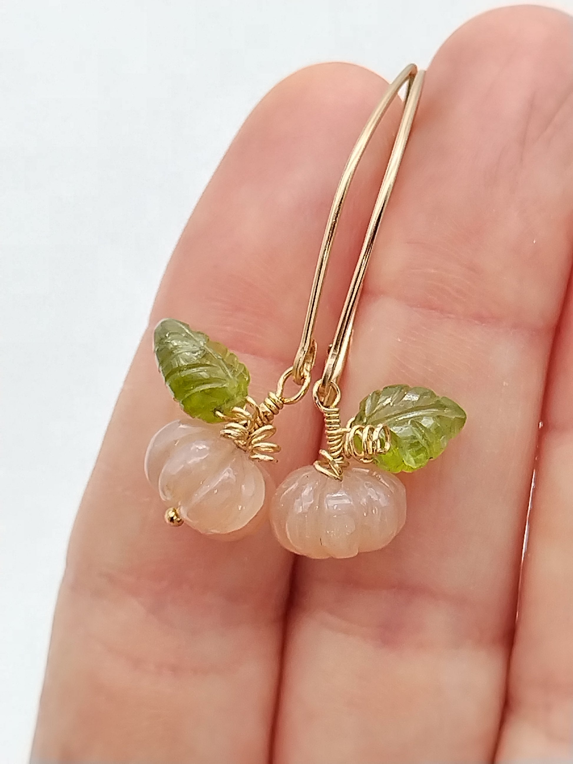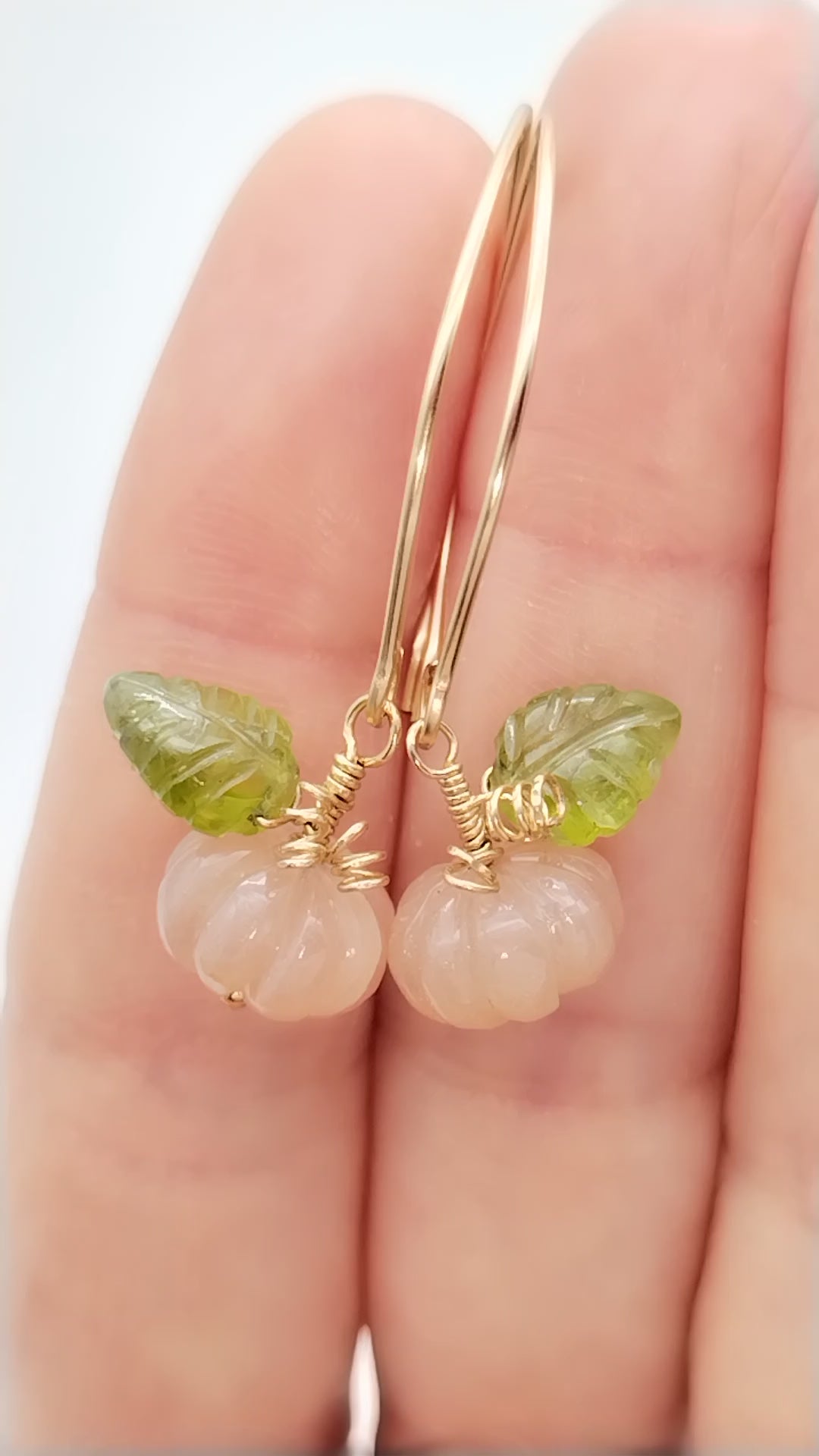 Estos elegantes y únicos aretes combinan la belleza de las calabazas de piedra lunar y las hojas de peridoto, envueltos a mano con elementos chapados en oro de 14k. Estos aretes livianos, delicadamente elaborados para el uso diario, son perfectos para cualquier ocasión. Su diseño único seguramente te hará destacar del resto.