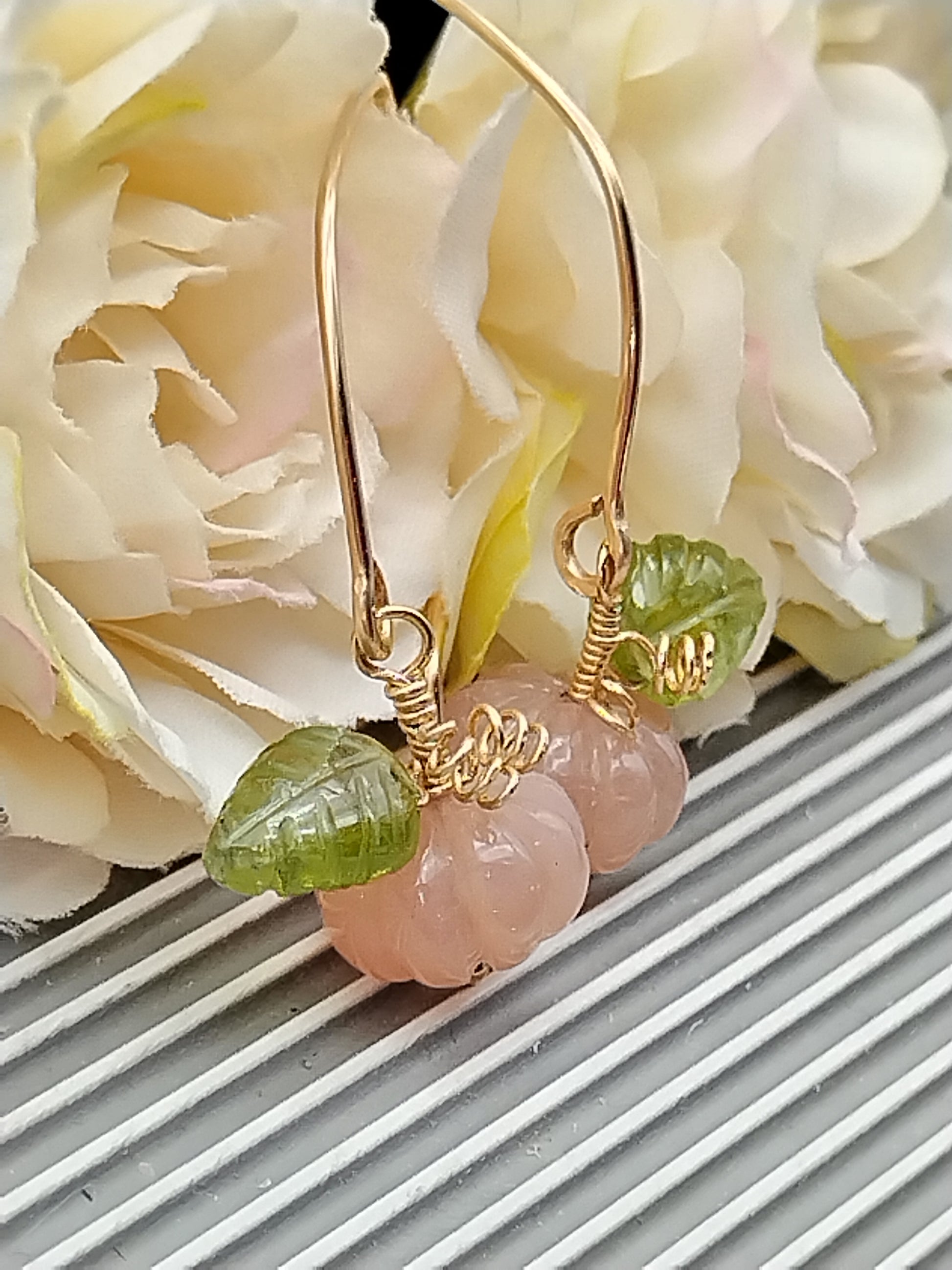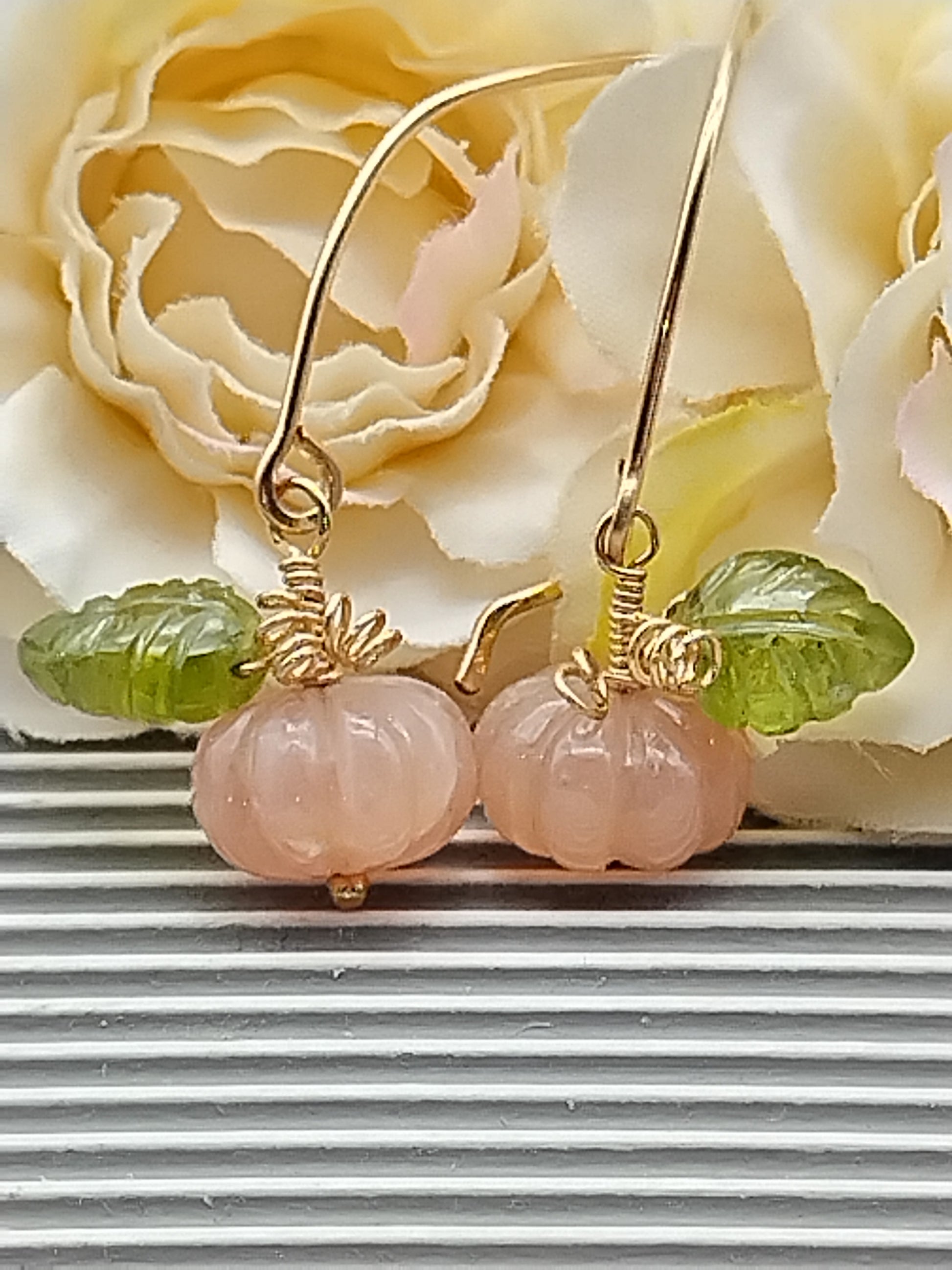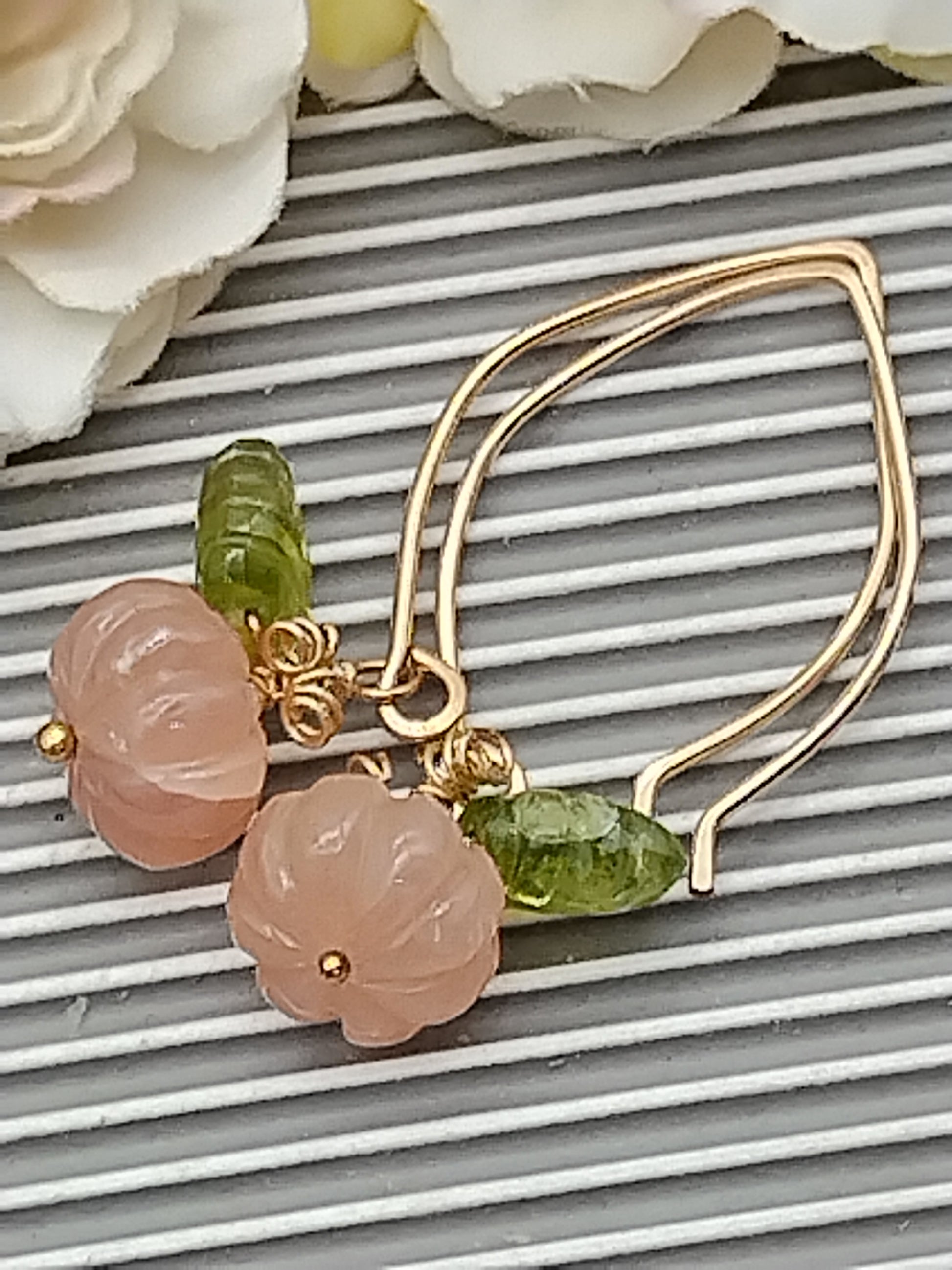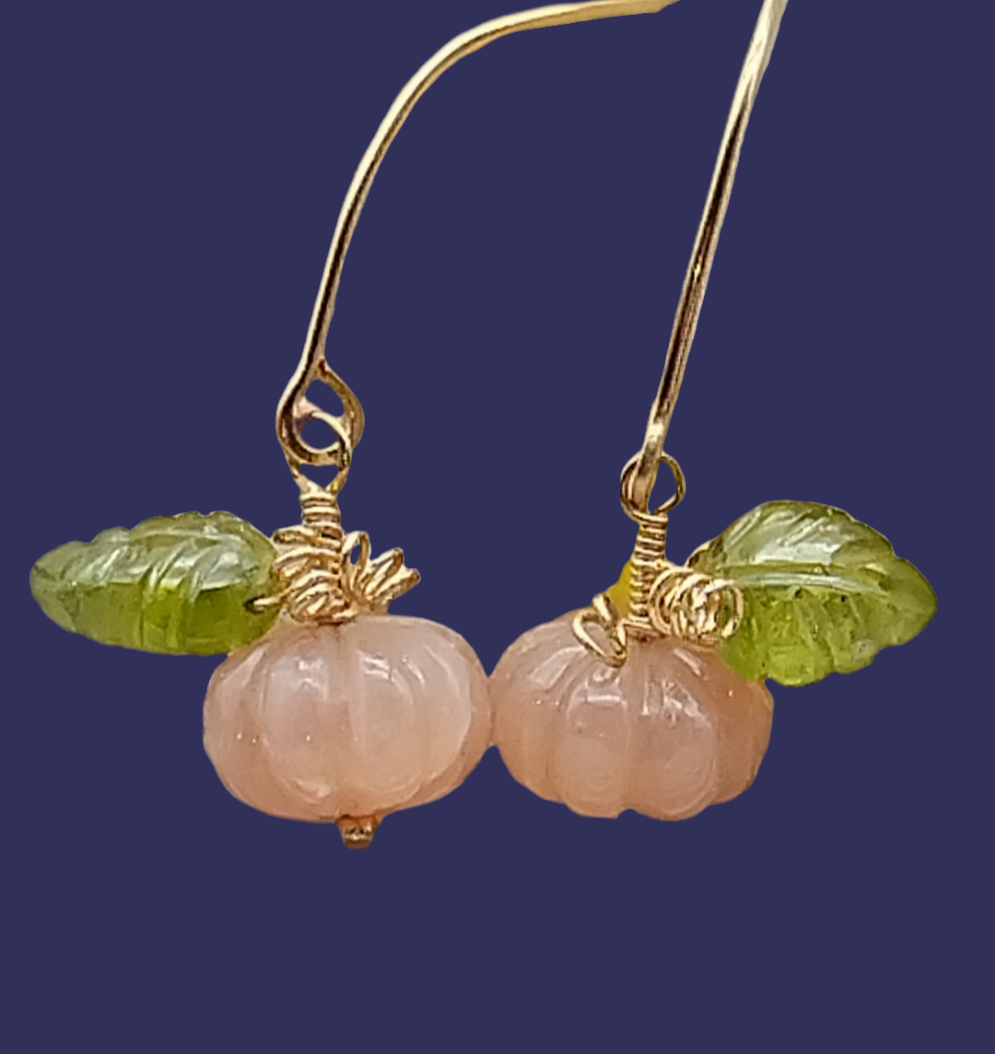 Estos elegantes y únicos aretes combinan la belleza de las calabazas de piedra lunar y las hojas de peridoto, envueltos a mano con elementos chapados en oro de 14k. Estos aretes livianos, delicadamente elaborados para el uso diario, son perfectos para cualquier ocasión. Su diseño único seguramente te hará destacar del resto.