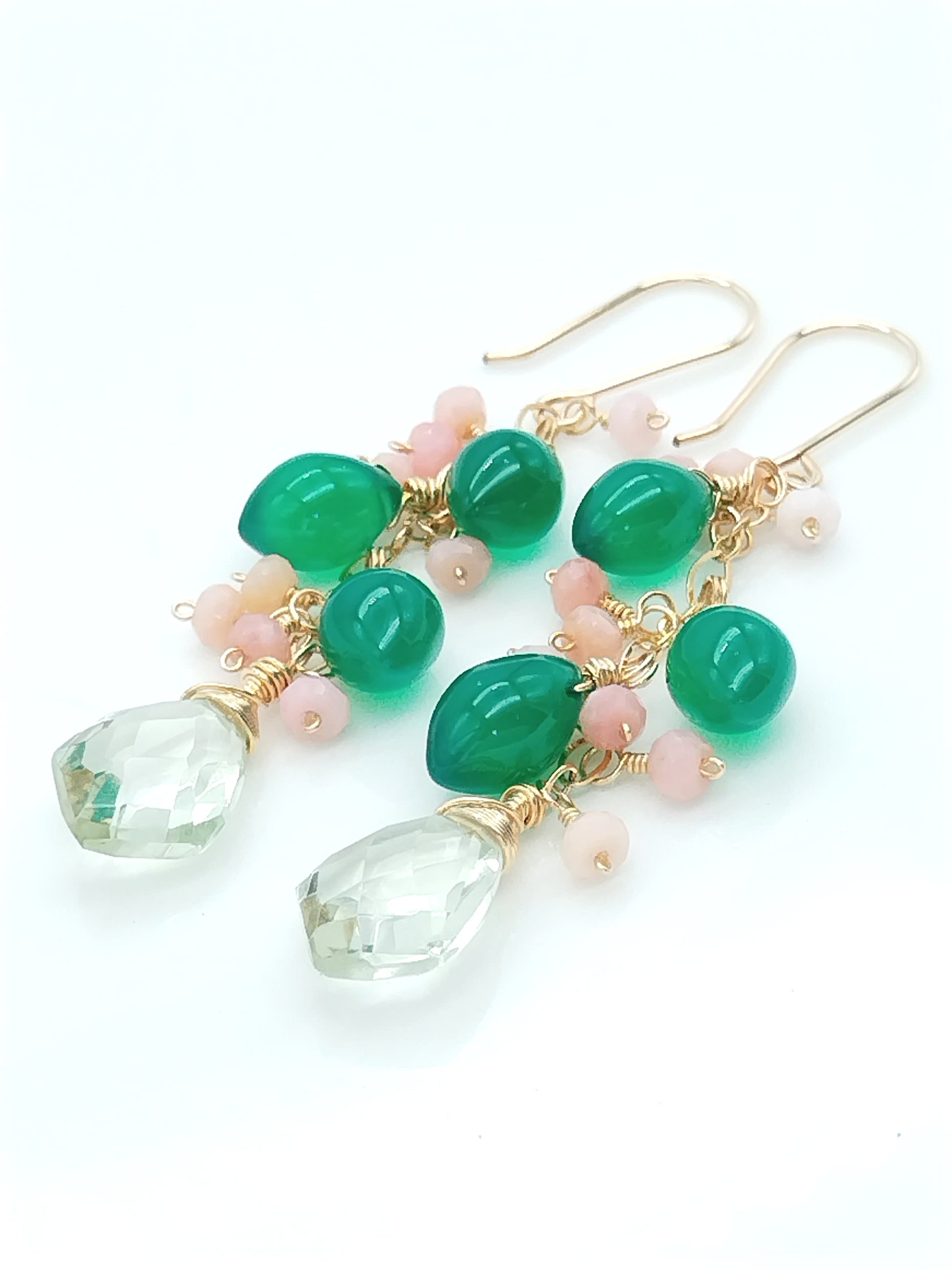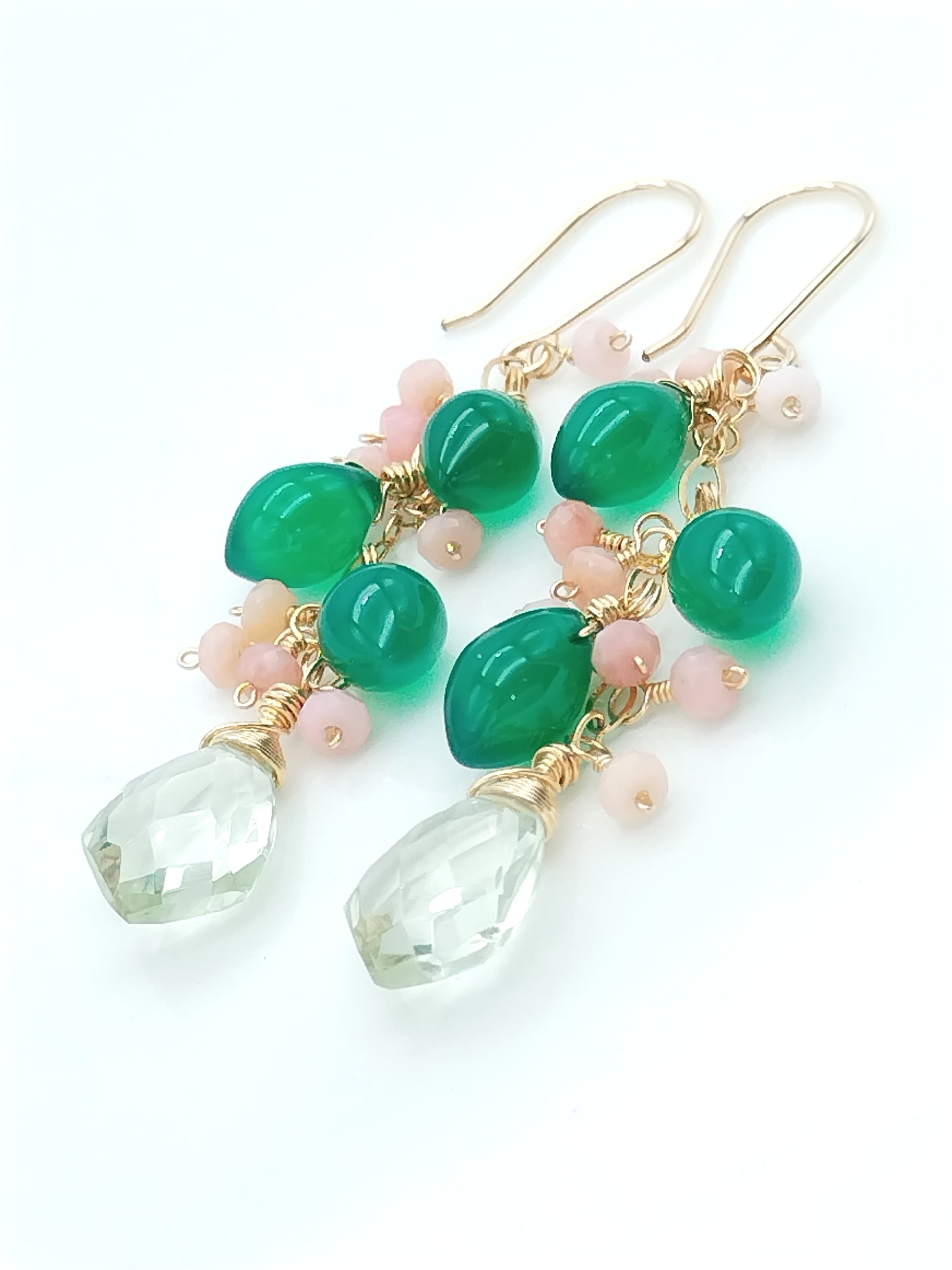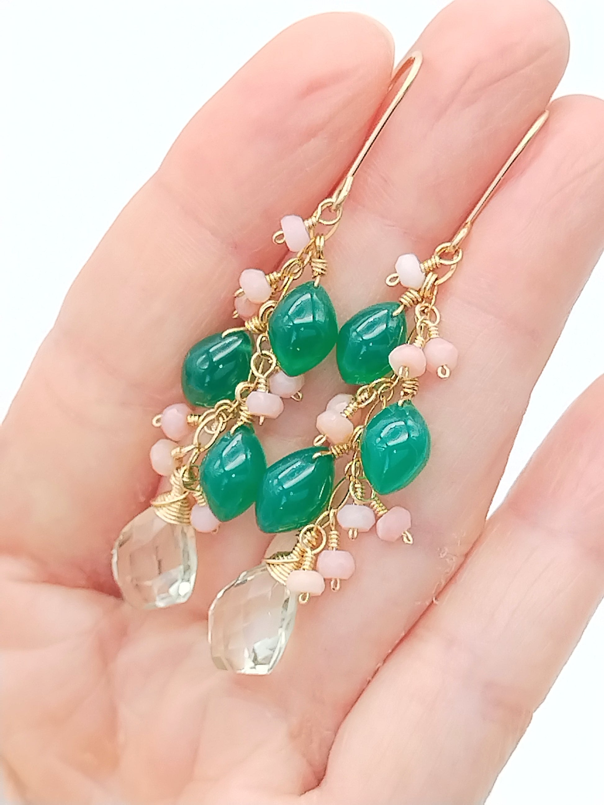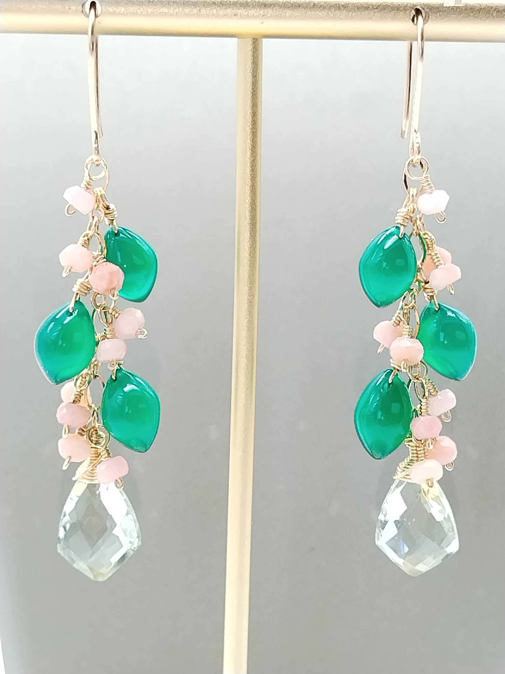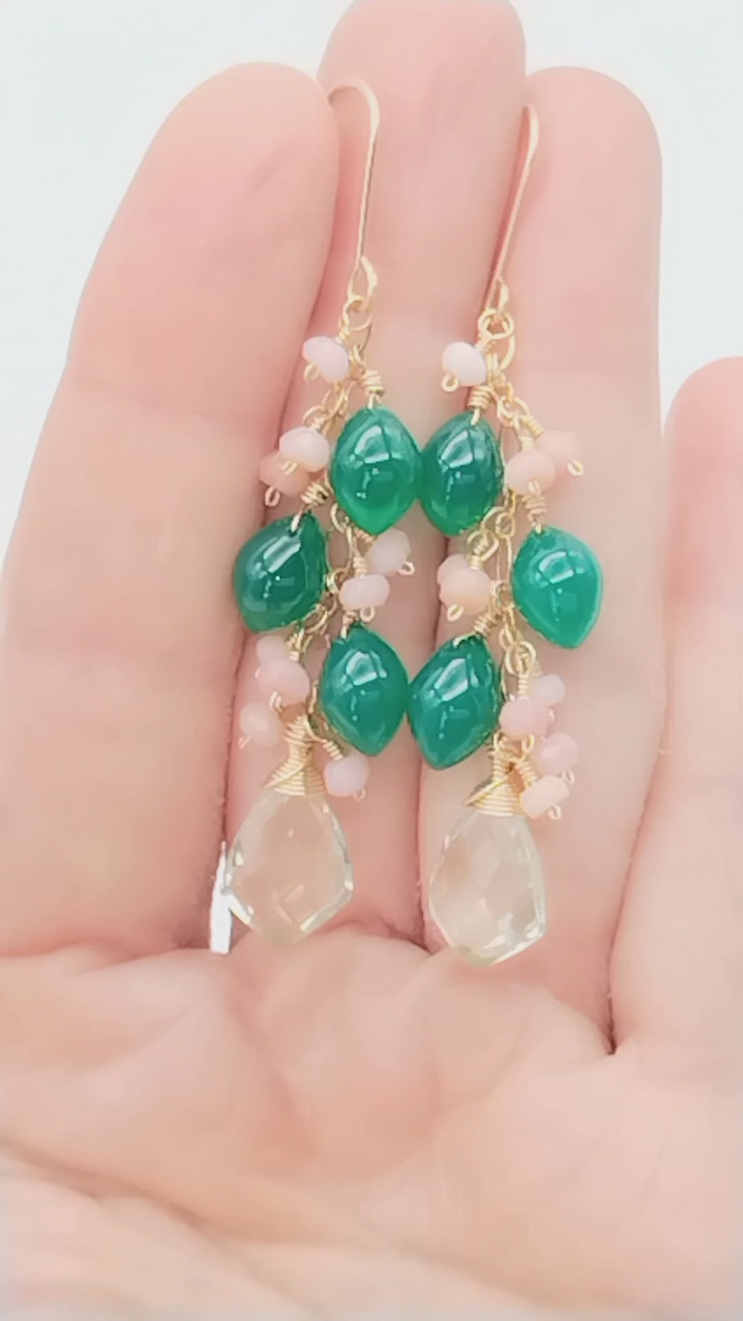 Estos exquisitos aretes largos presentan una cascada de piedras de primera calidad: prasiolita tallada en kyte, ónix verde liso en forma de gota y ópalo rosa peruano. Elaborados con oro de 14k laminado, estos llamativos aretes brindarán un hermoso brillo y glamour.
