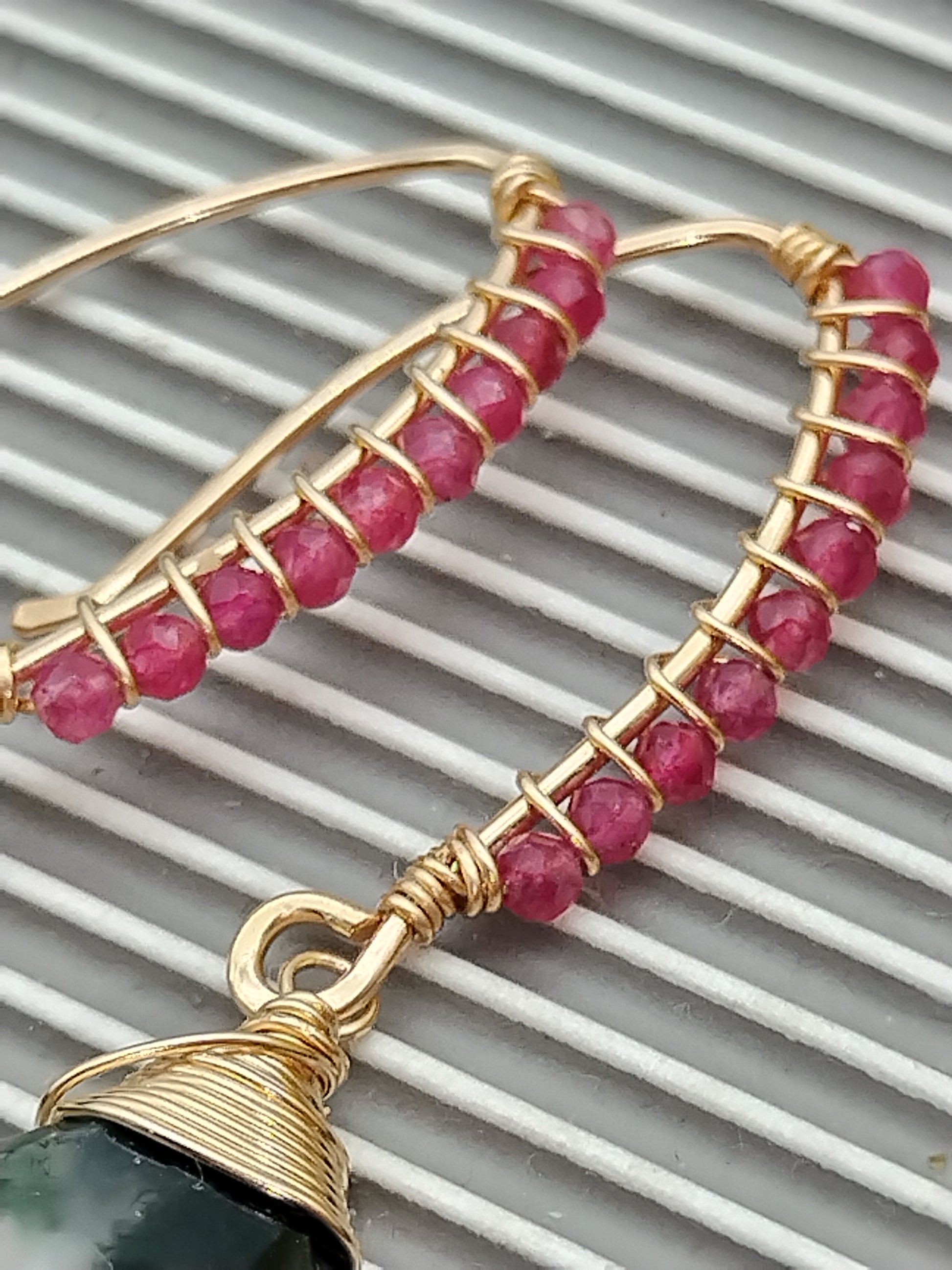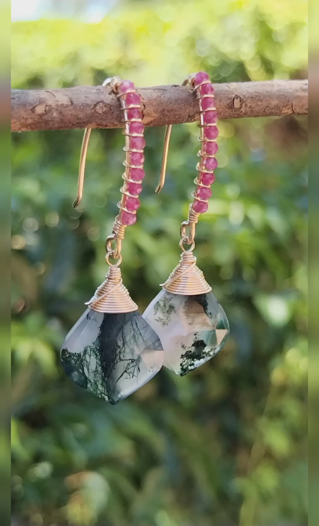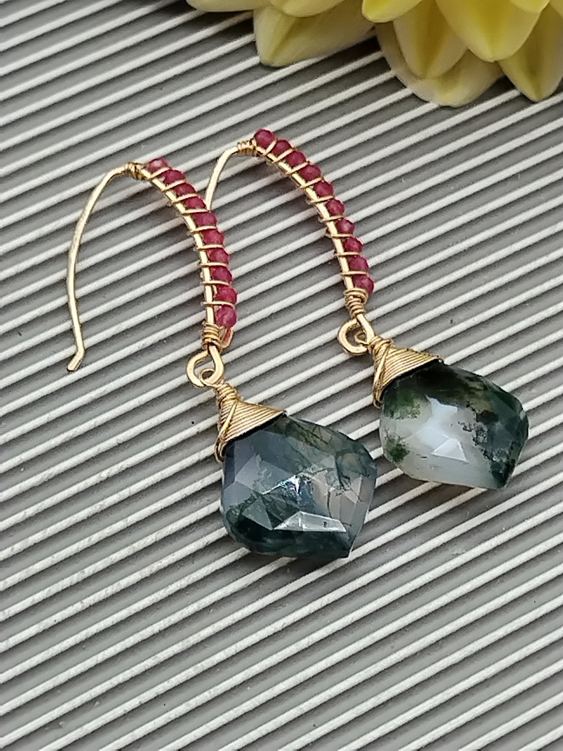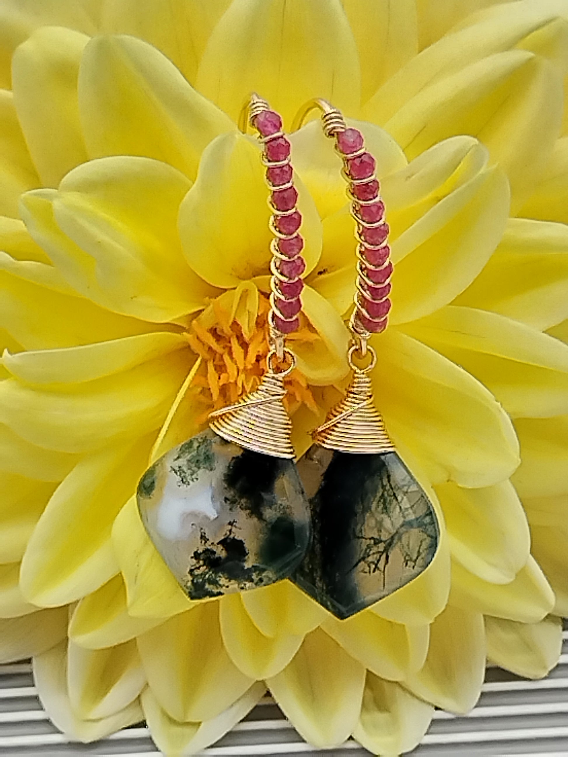 Preciosas gotas grandes de ágata musgosa AAA (20 x 16 mm) meticulosamente envueltas a mano sobre oro de 14 k y hermosas cuentas de rubí AAA+ diminutas envueltas a mano sobre oro de 14 k también en la parte delantera de los alambres para las orejas. Todo aquí está chapado en oro de 14 k. Pendientes ligeros, como siempre.