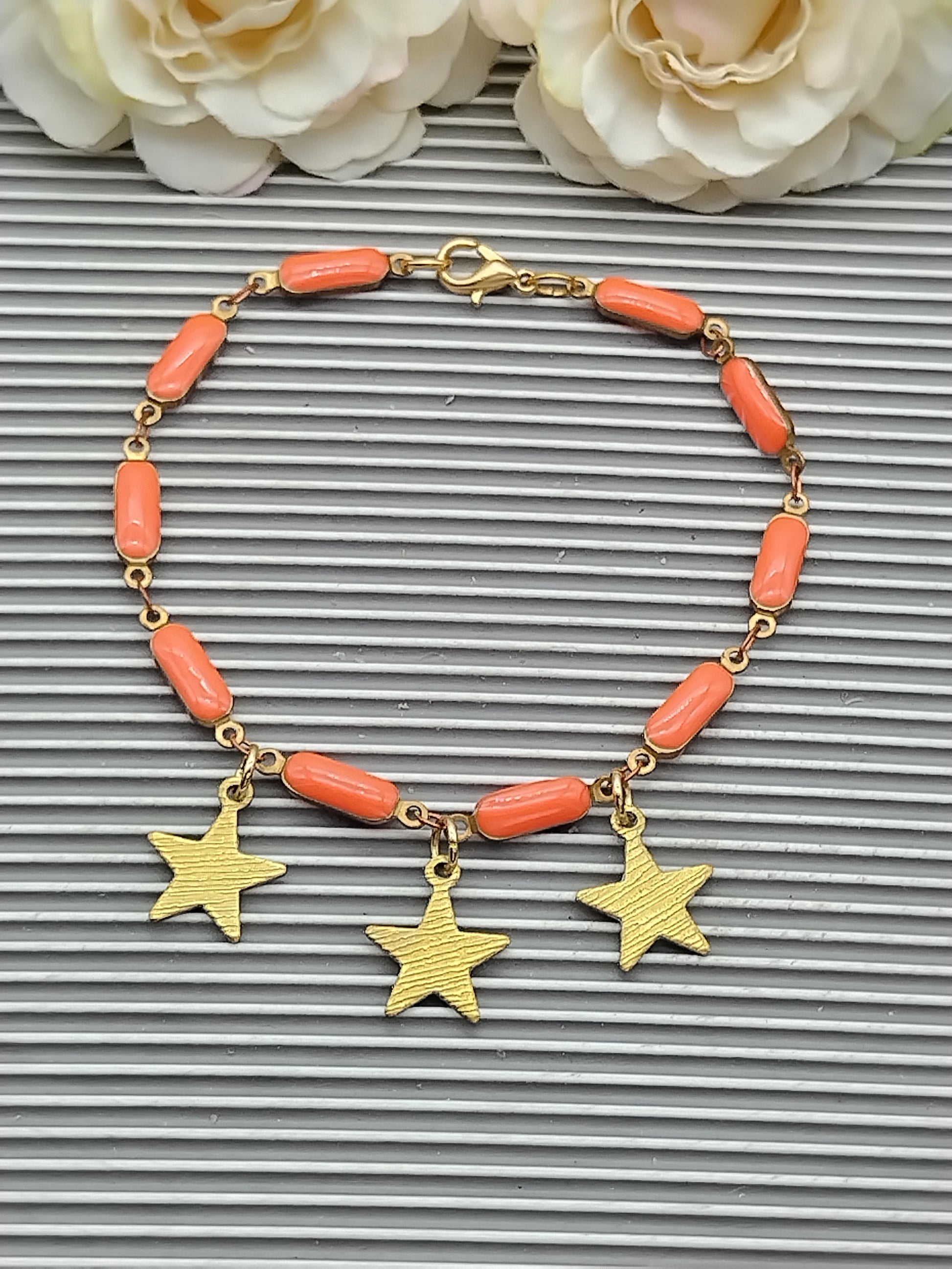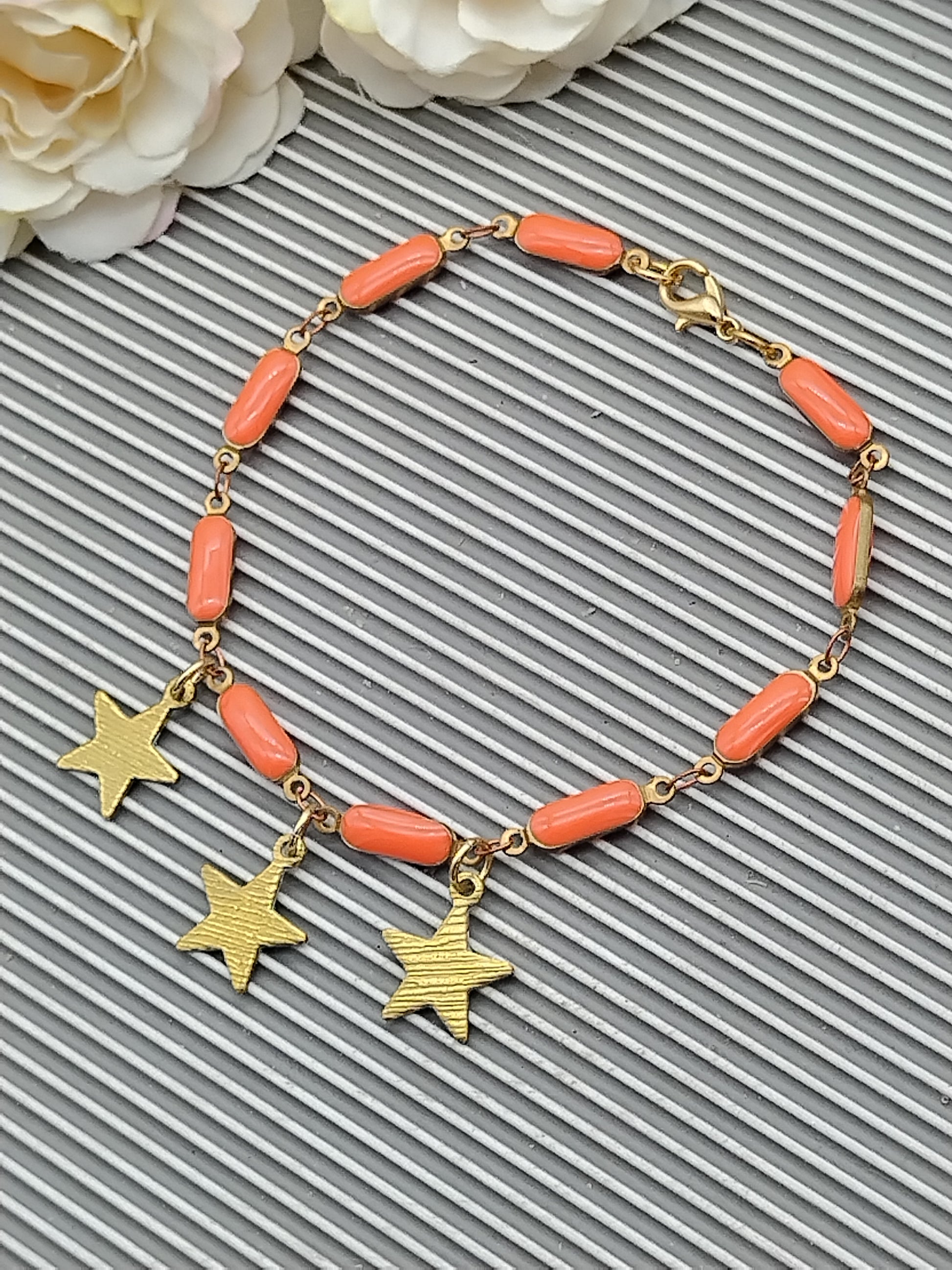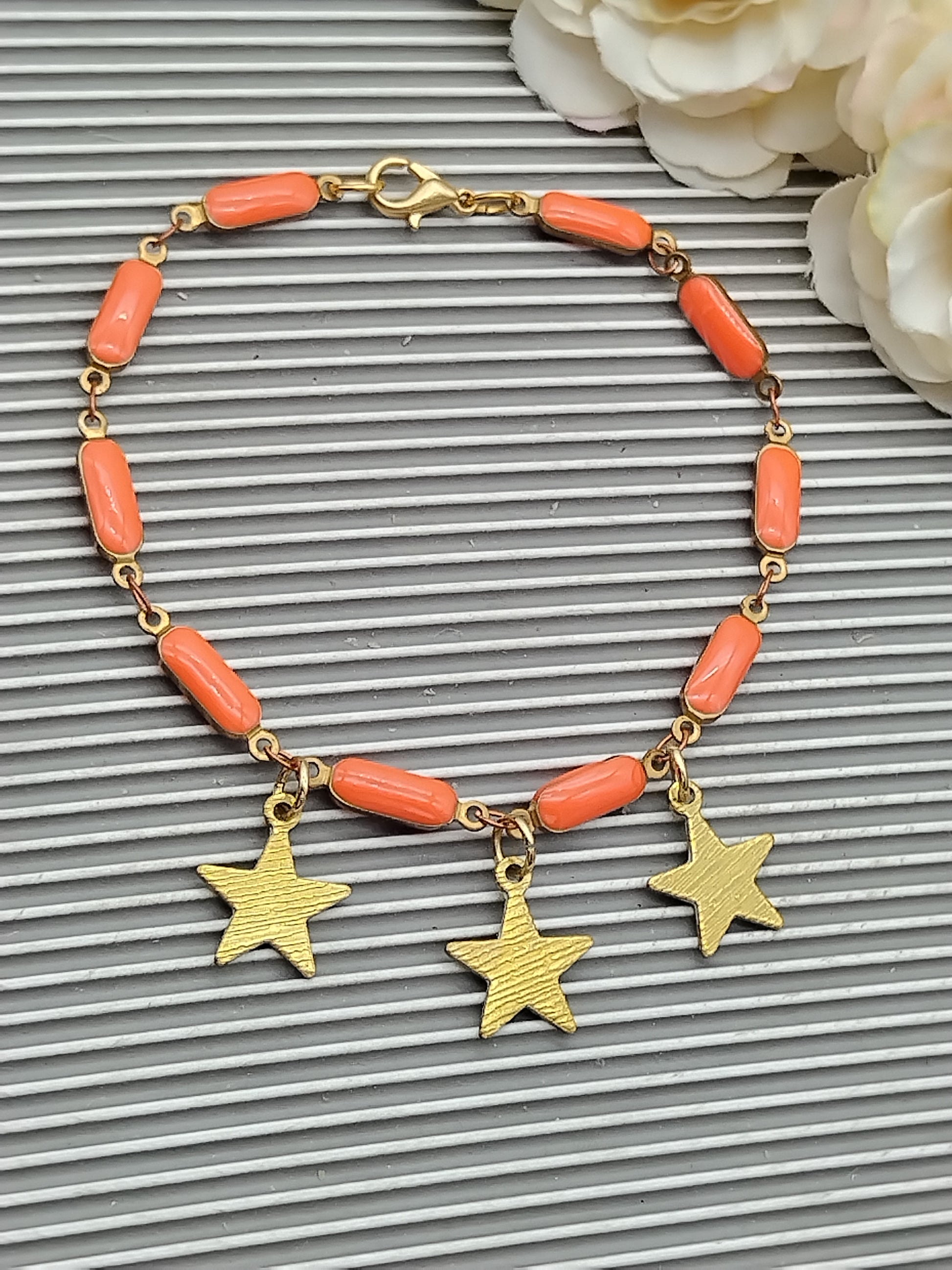 Estas elegantes pulseras cuentan con tres encantadores dijes de estrellas o dijes de ginkgo en una cadena de barra abullonada adornada con esmalte naranja o blanco. Cierre de langosta bañado en oro. Un accesorio moderno para realzar cualquier look.