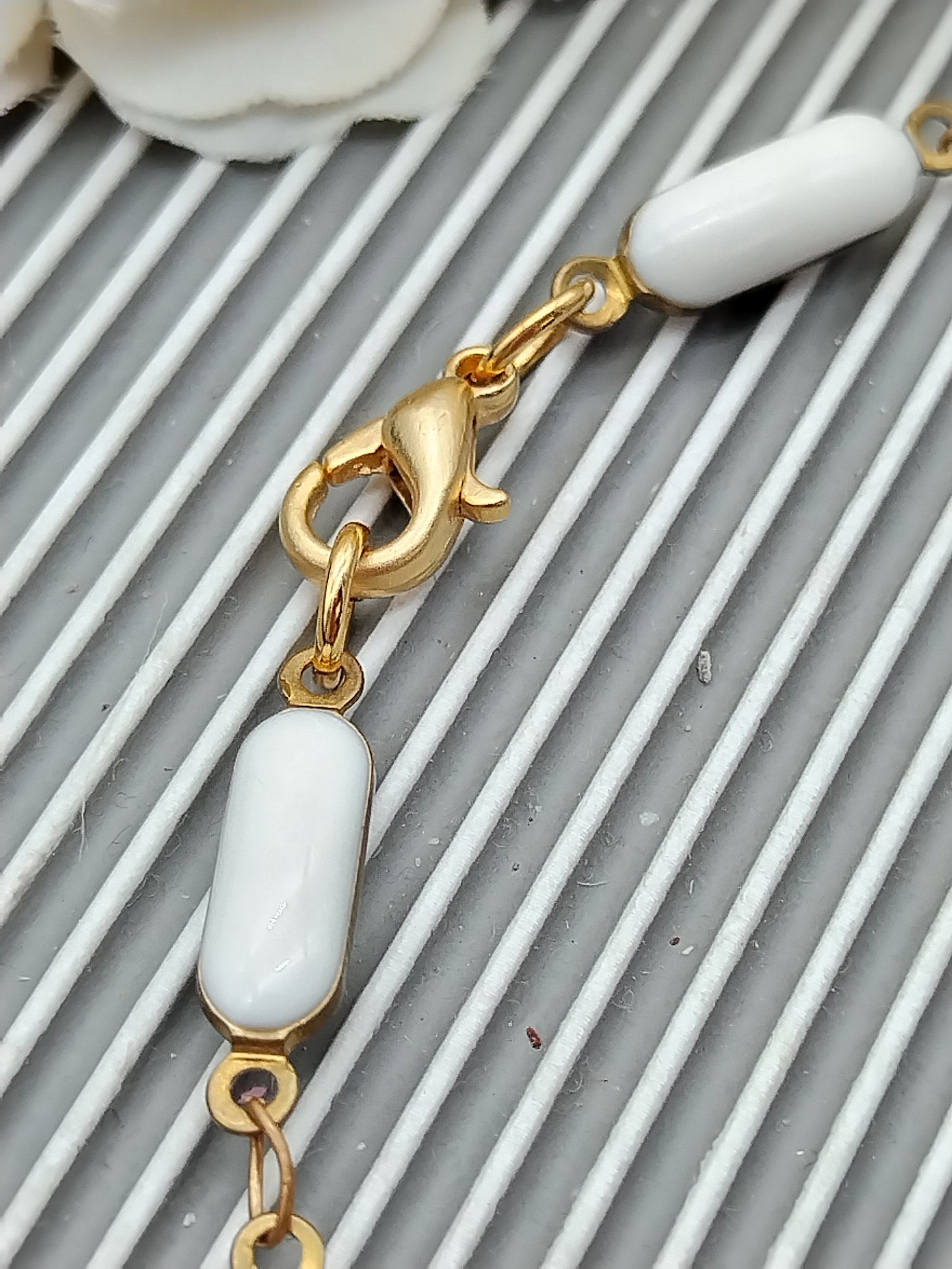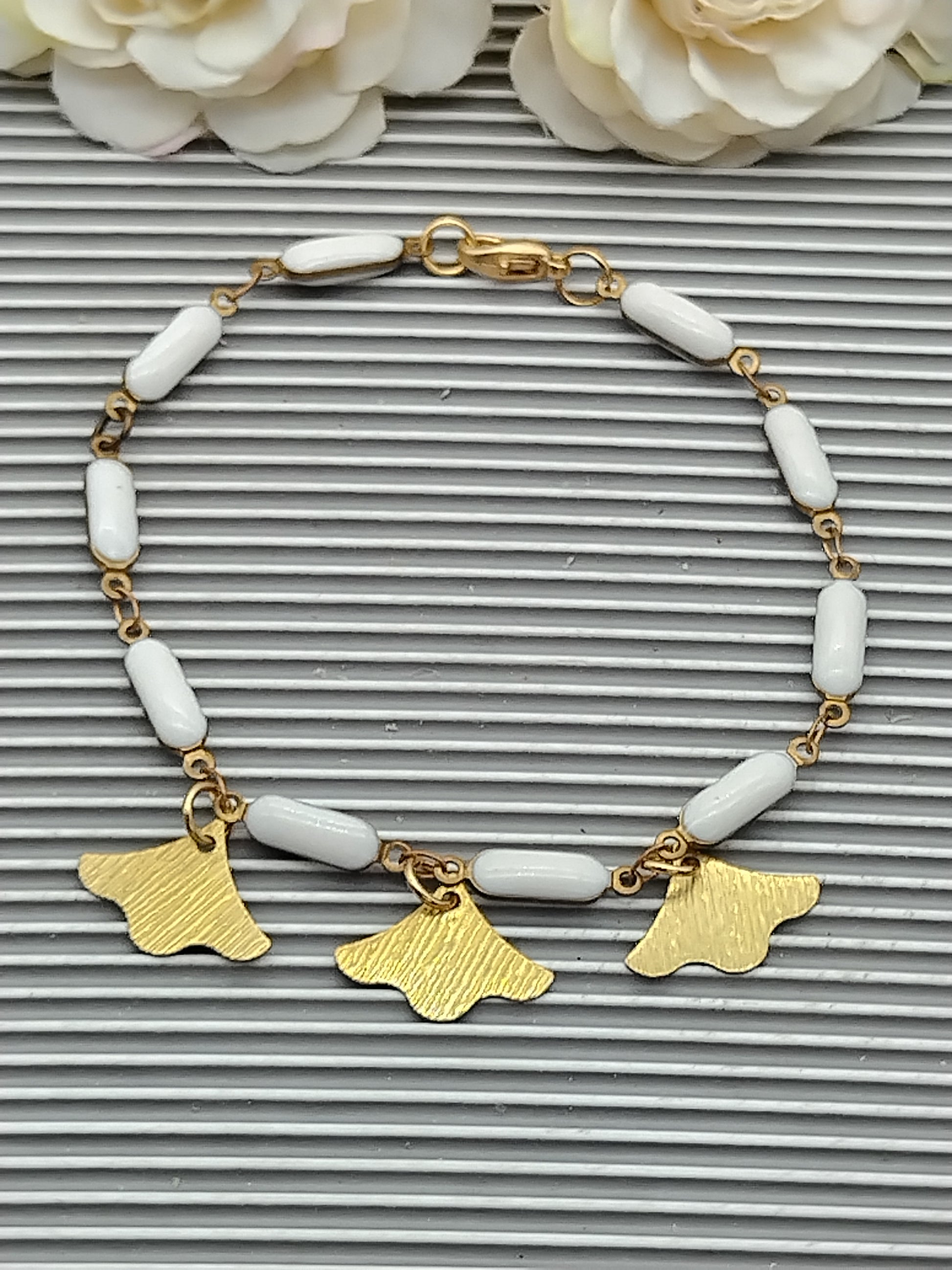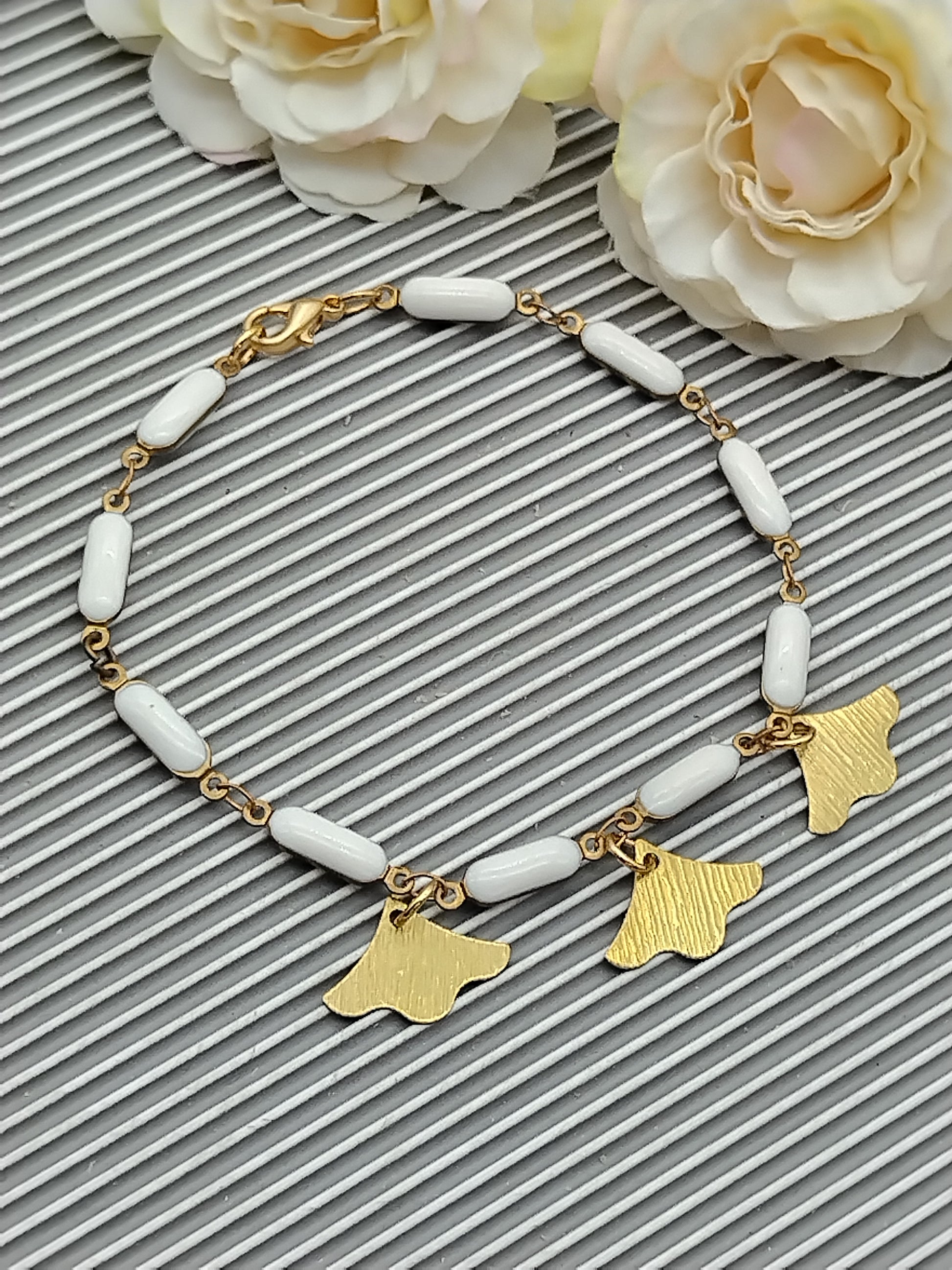 Estas elegantes pulseras cuentan con tres encantadores dijes de estrellas o dijes de ginkgo en una cadena de barra abullonada adornada con esmalte naranja o blanco. Cierre de langosta bañado en oro. Un accesorio moderno para realzar cualquier look.