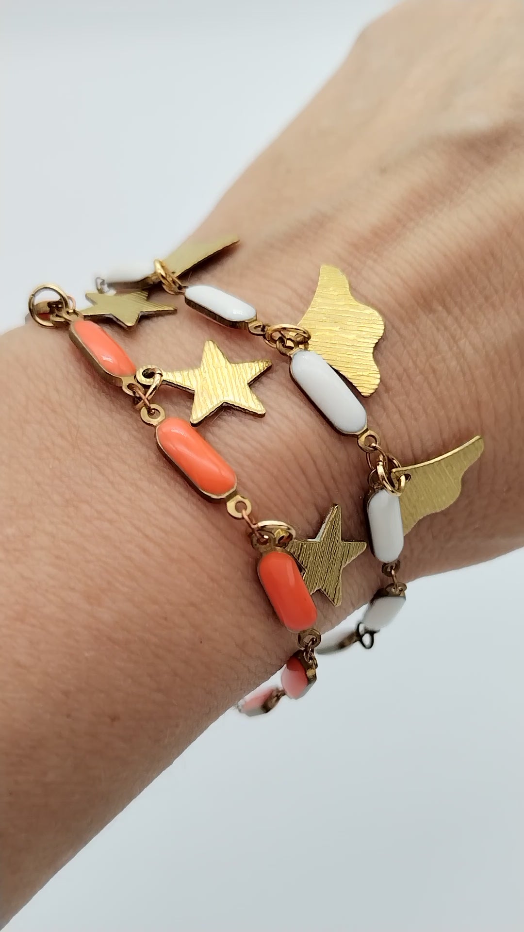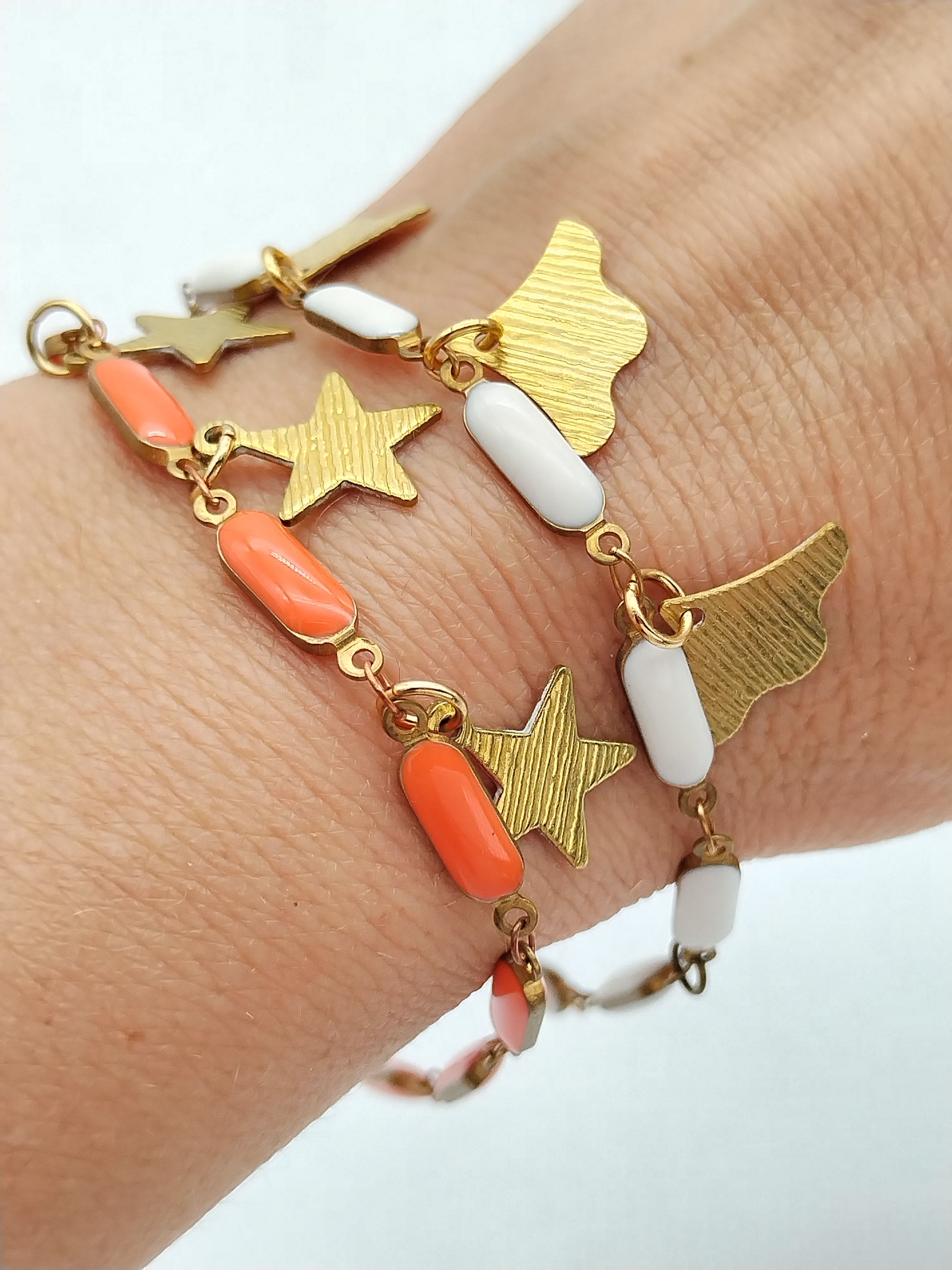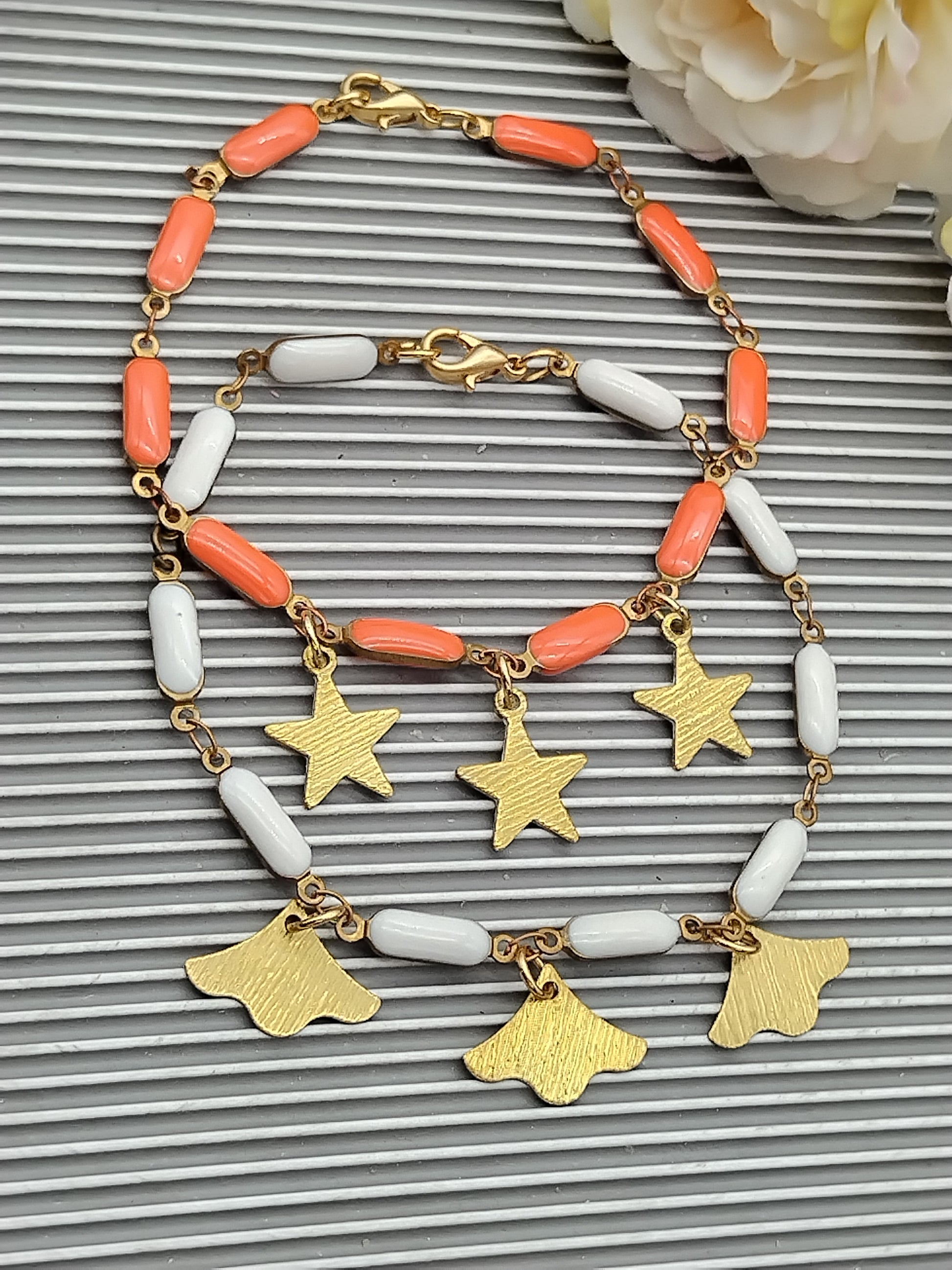Pulsera con dijes de estrella y ginkgo, pulsera con barra abullonada de esmalte, pulsera naranja y blanca