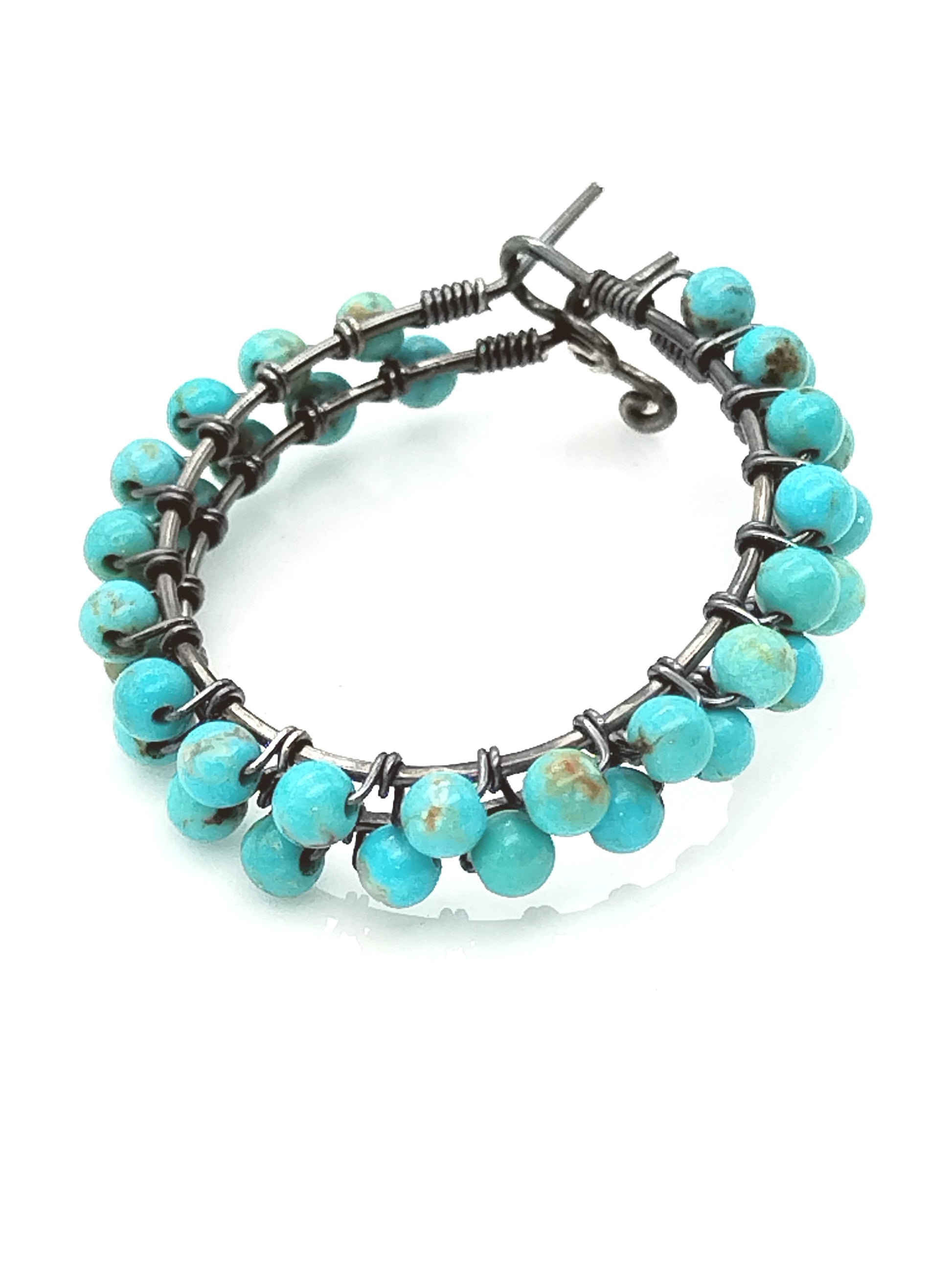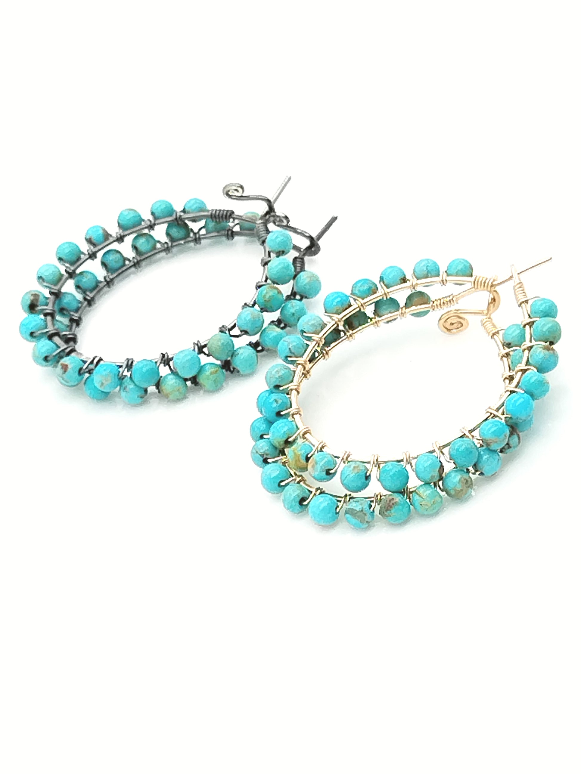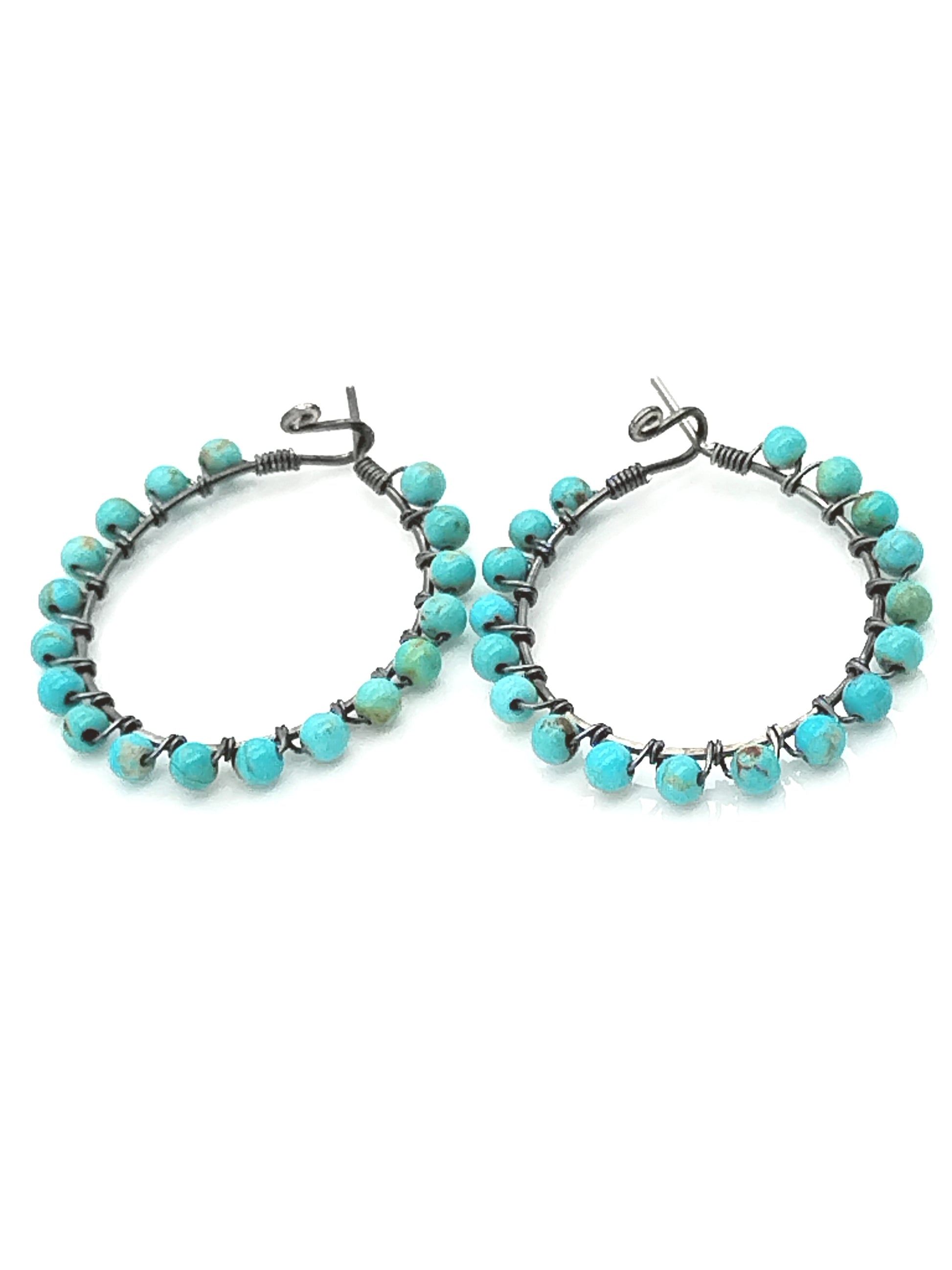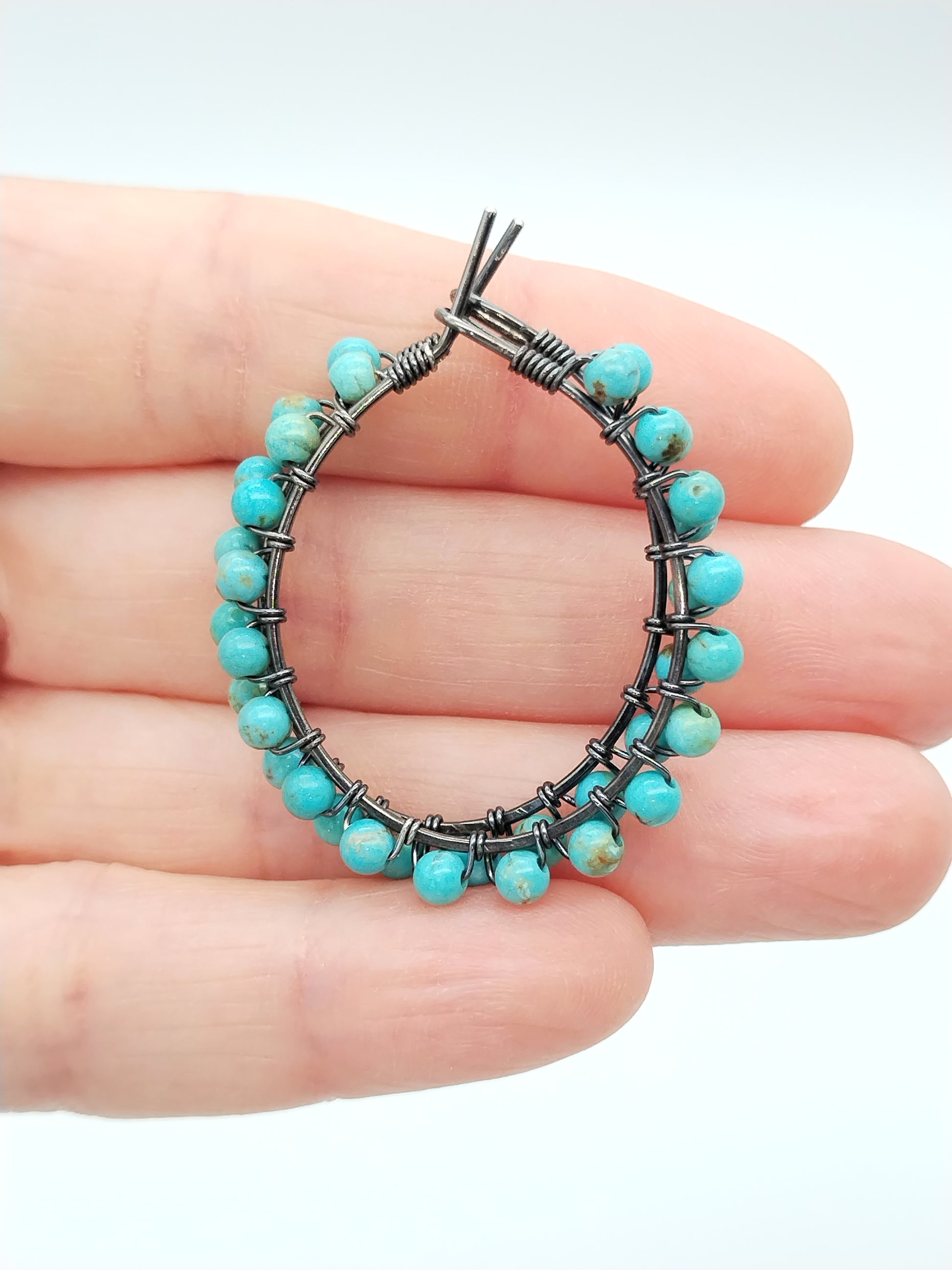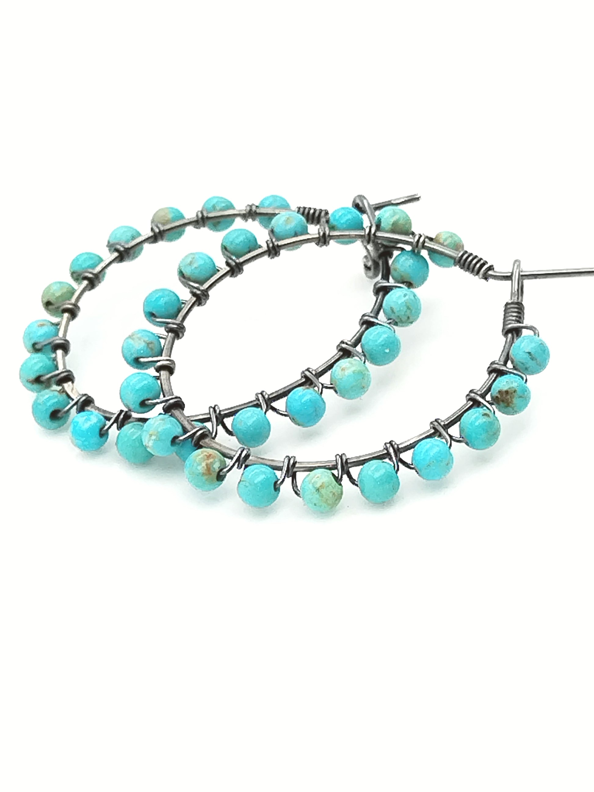 Adórnese con estos aretes de turquesa de Baja Sterling, que cuentan con grandes aros de turquesa genuina envueltos meticulosamente a mano en plata de ley oxidada. El diseño único de cuentas rezuma elegancia vaquera y es un regalo único para aniversarios, hermanas, esposas o mamás. Experimente la belleza y la rareza de la turquesa genuina de Baja con estos exquisitos aretes.