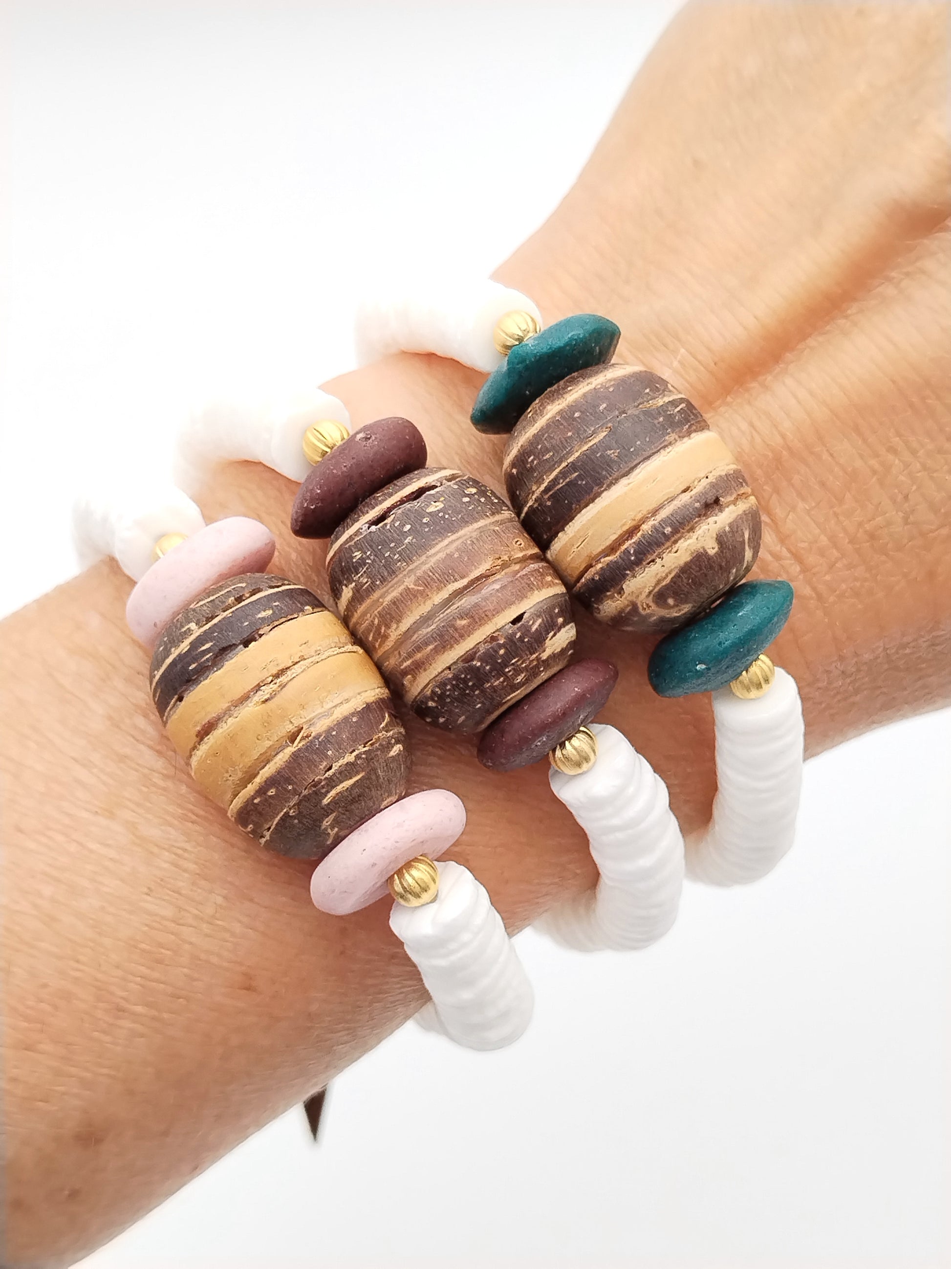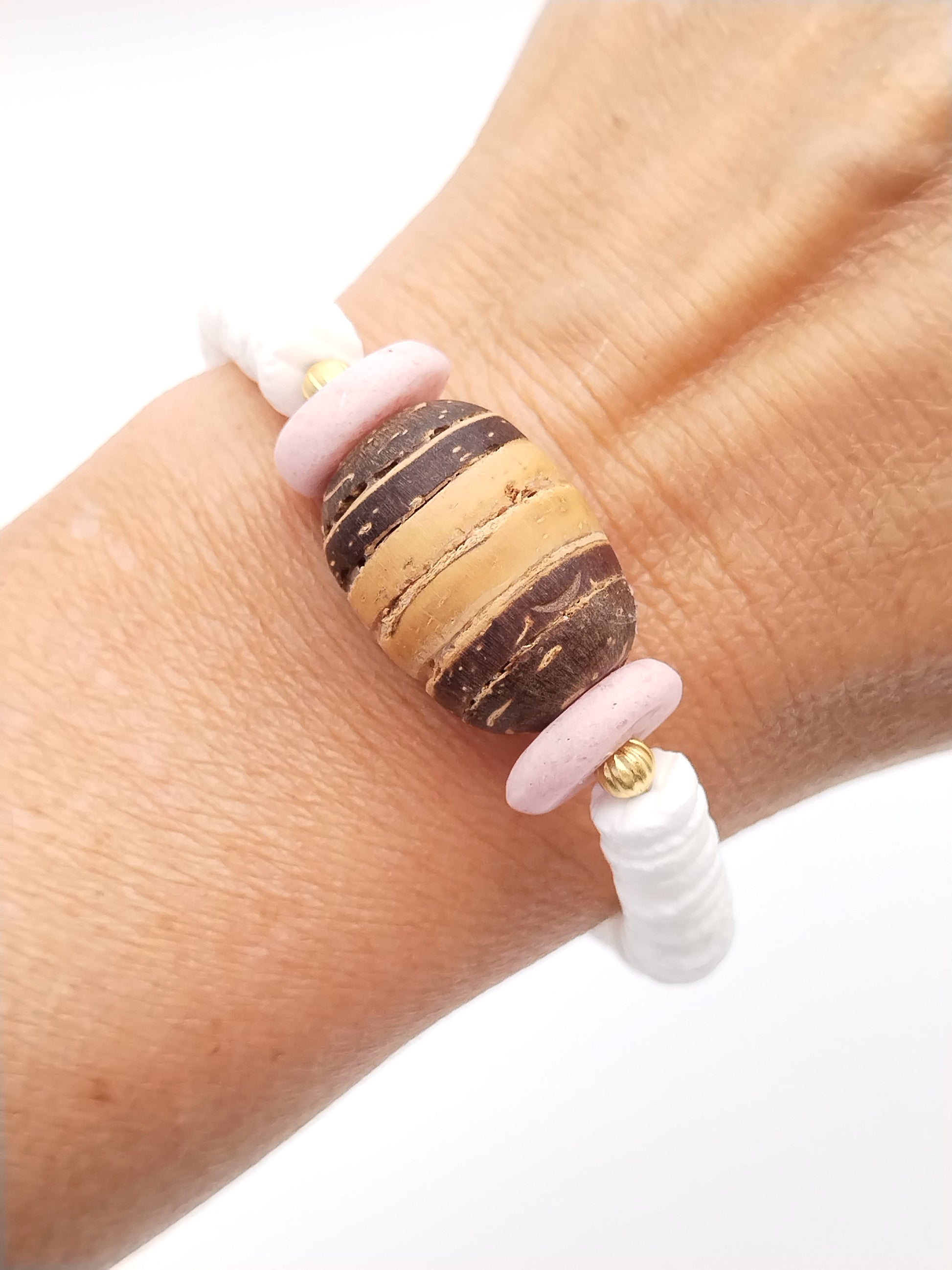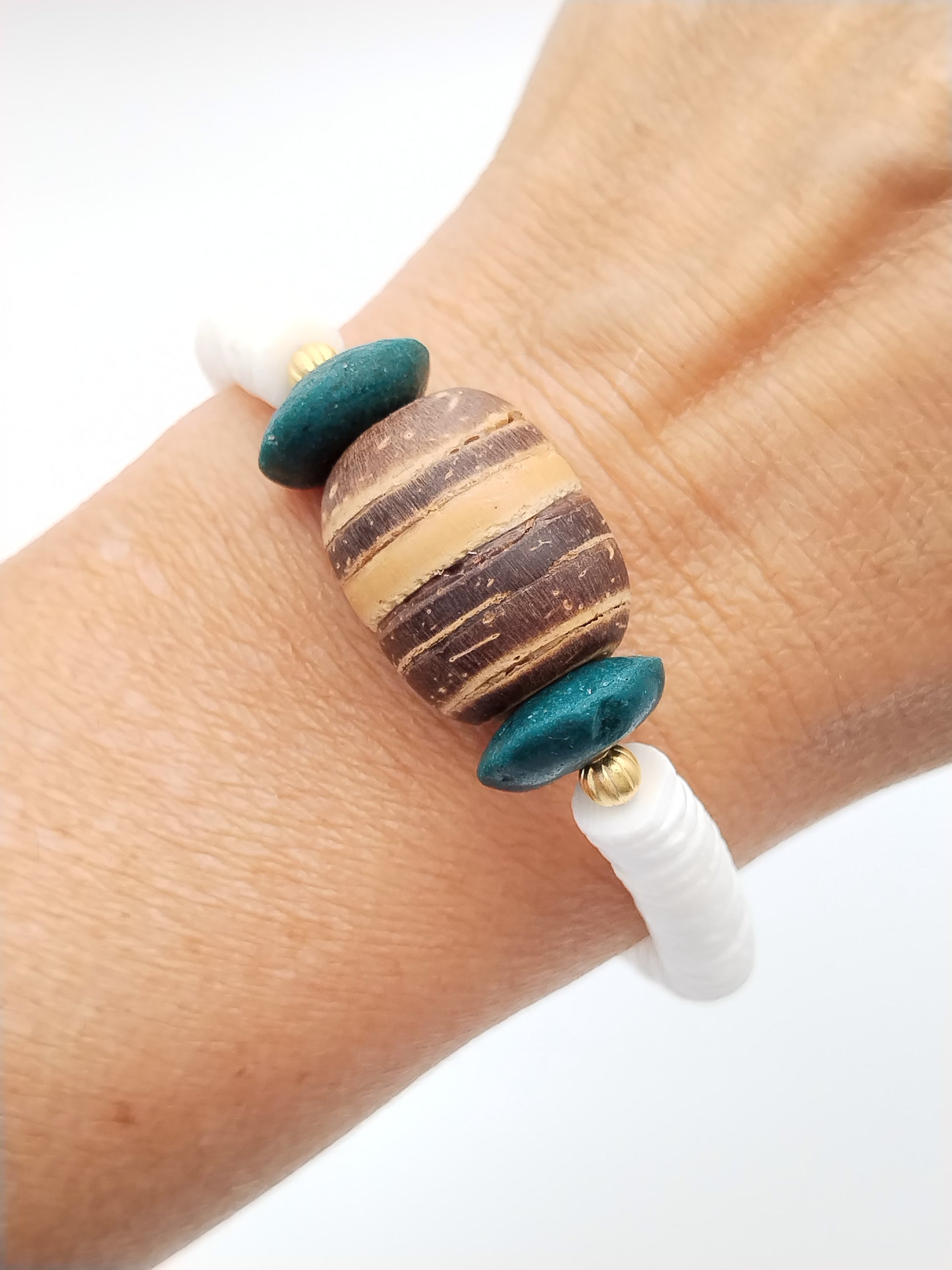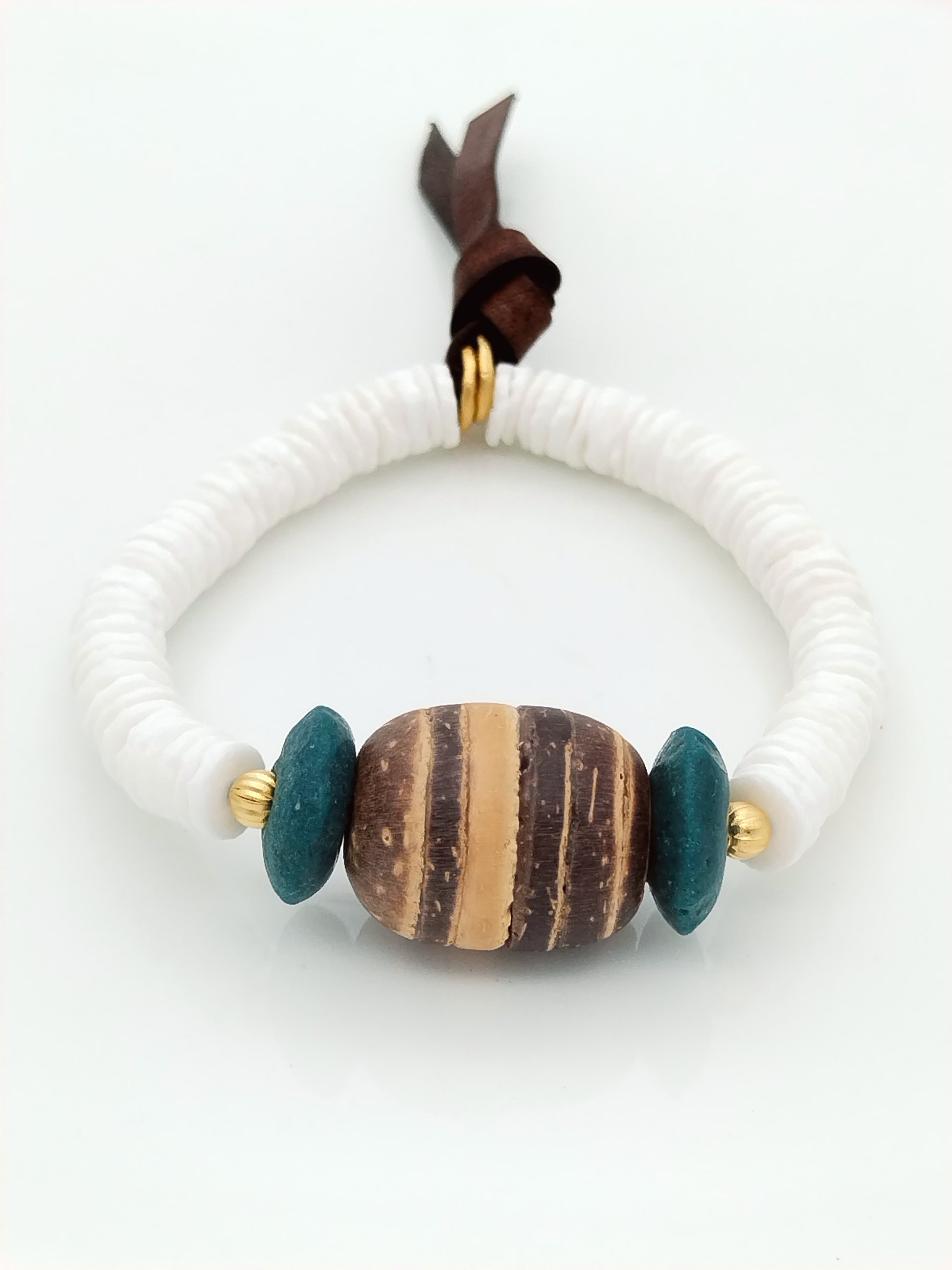 Realza tu look veraniego con nuestra exclusiva y hermosa pulsera de concha blanca. Adornada con rondelle de vidrio africano Ashanti y una cuenta de barril de madera vintage, esta pulsera elástica se adapta a la perfección a cualquier muñeca. Elaborada con cuero marrón genuino y con detalles dorados, es un accesorio imprescindible para las amantes de la moda. Perfecta para regalar y combina a la perfección con otras pulseras o para lucir sola. Consigue un estilo chic y bohemio con este accesorio imprescindible.