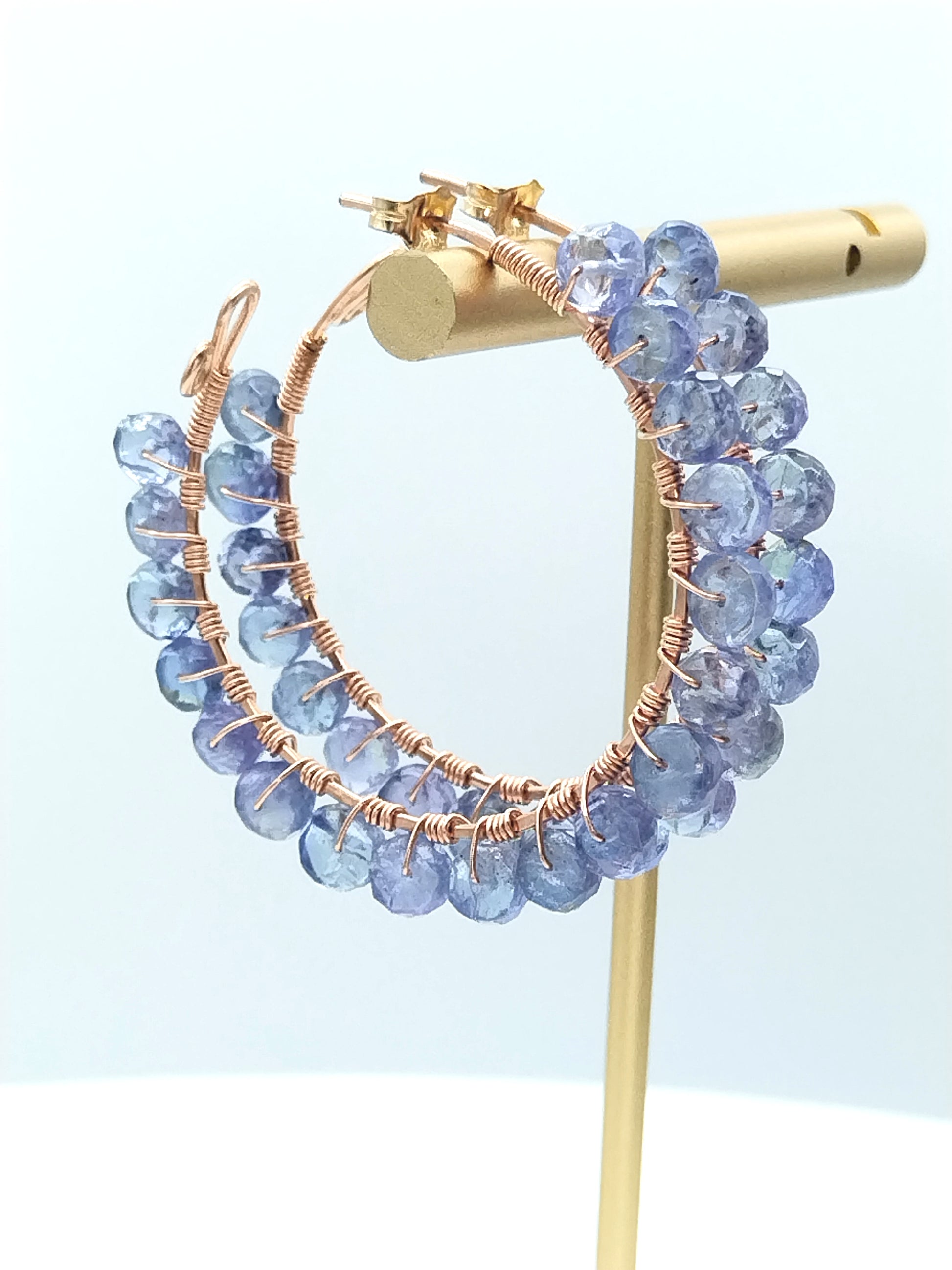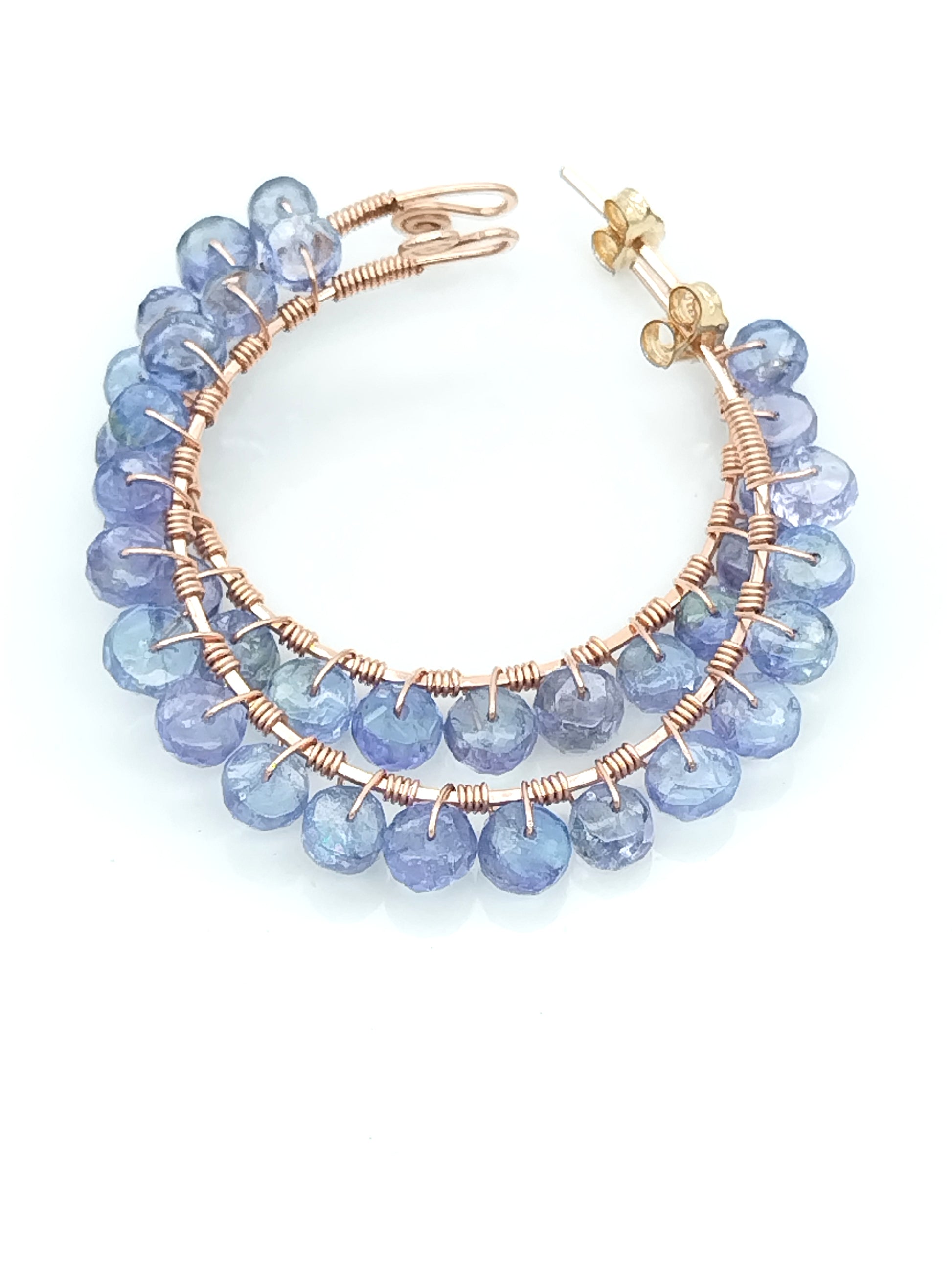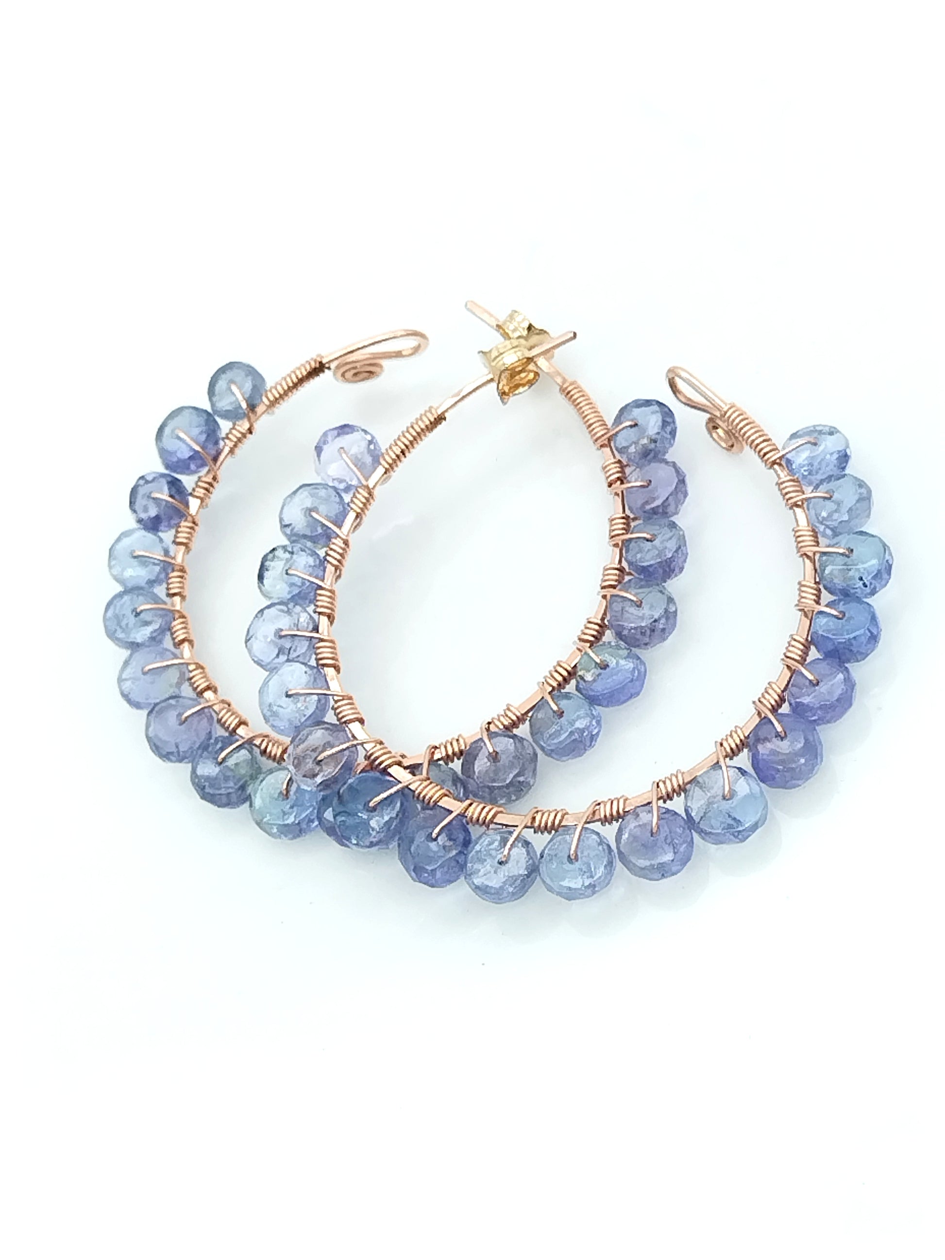 Hermosos aros de tanzanita AAAA+ en forma de rondelle, meticulosamente envueltos a mano en oro rosa de 14 k. Las tanzanitas son absolutamente hermosas, tienen ese precioso tono de color entre violeta y azul, absolutamente perfecto. Estos aros son muy livianos y tienen el tamaño perfecto, 40 mm de diámetro, para aros, ni demasiado pequeños ni demasiado grandes.