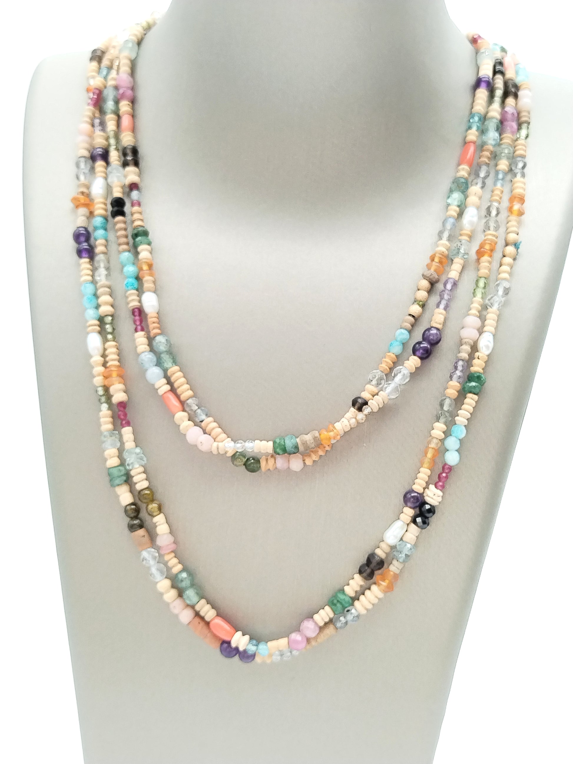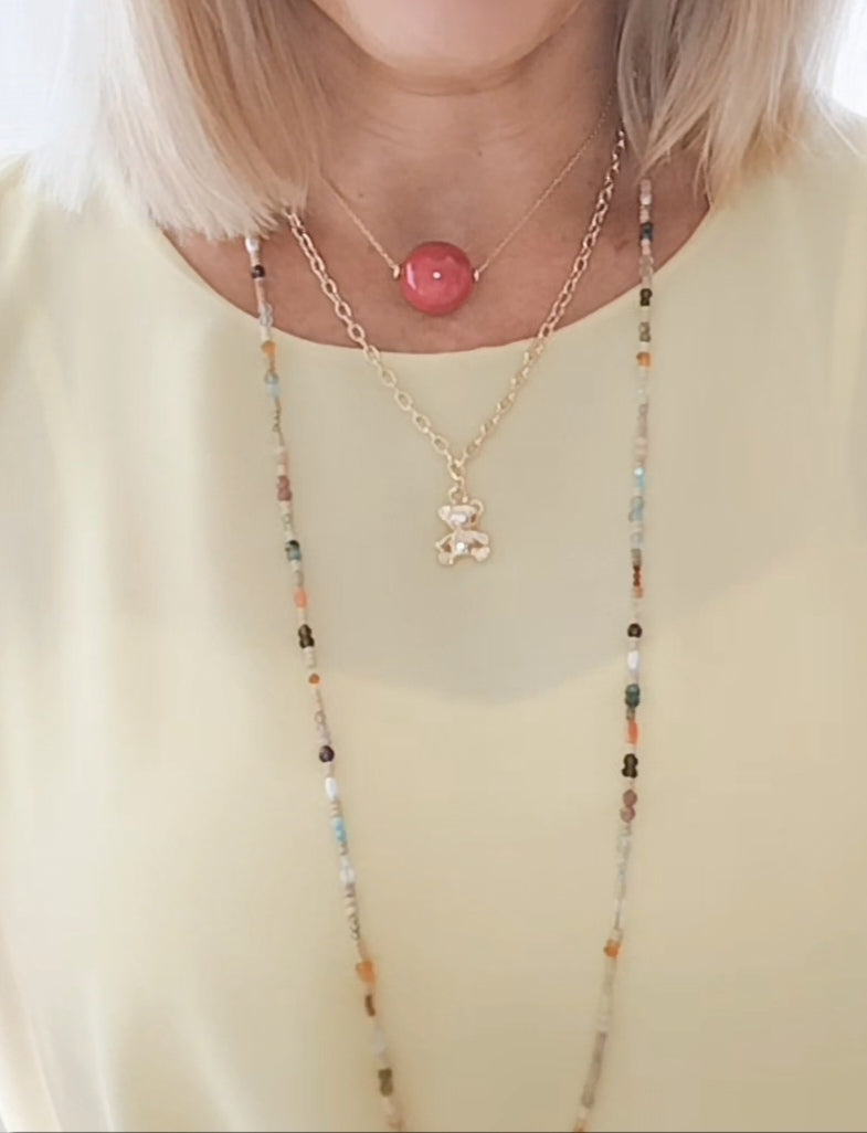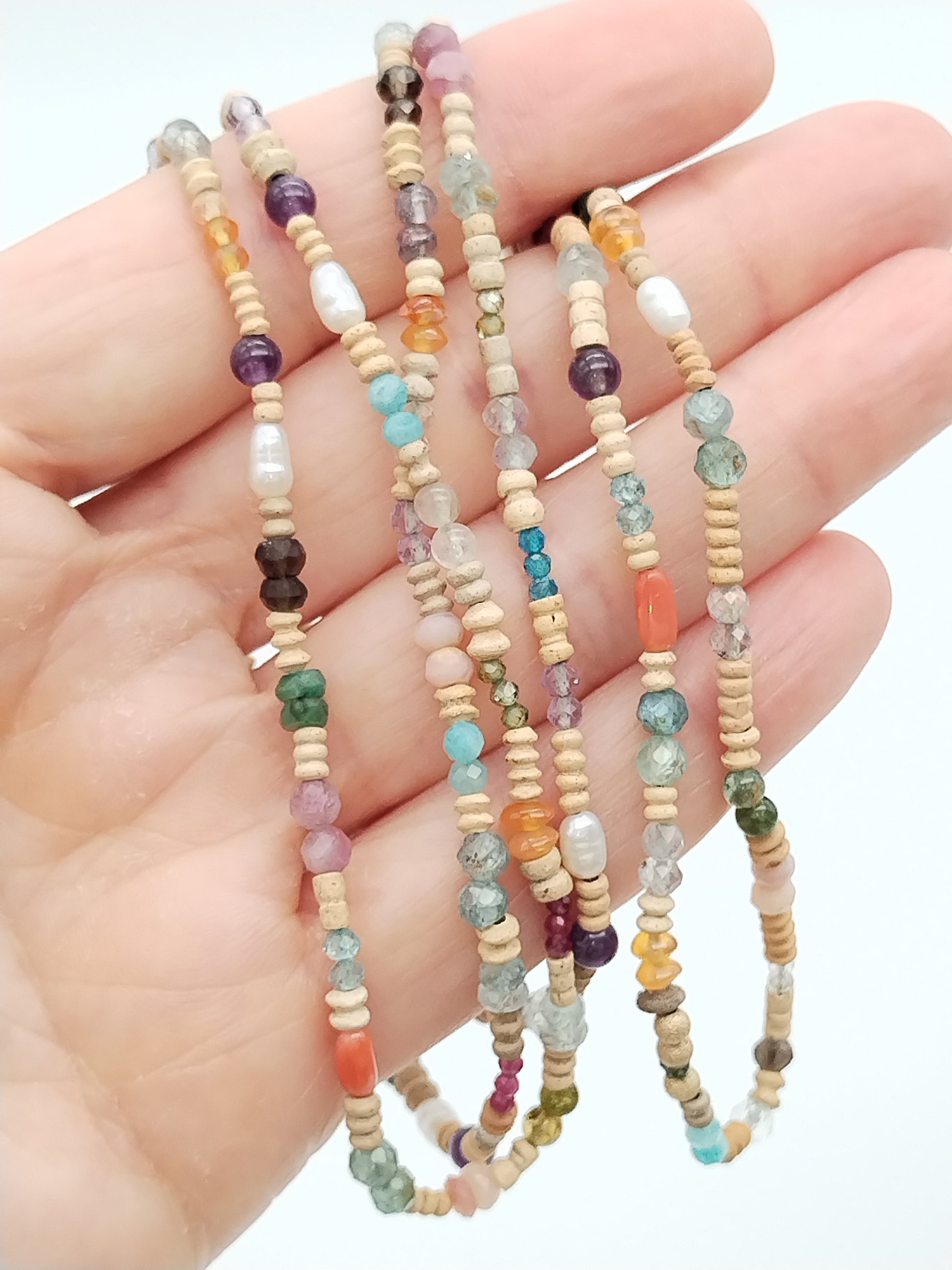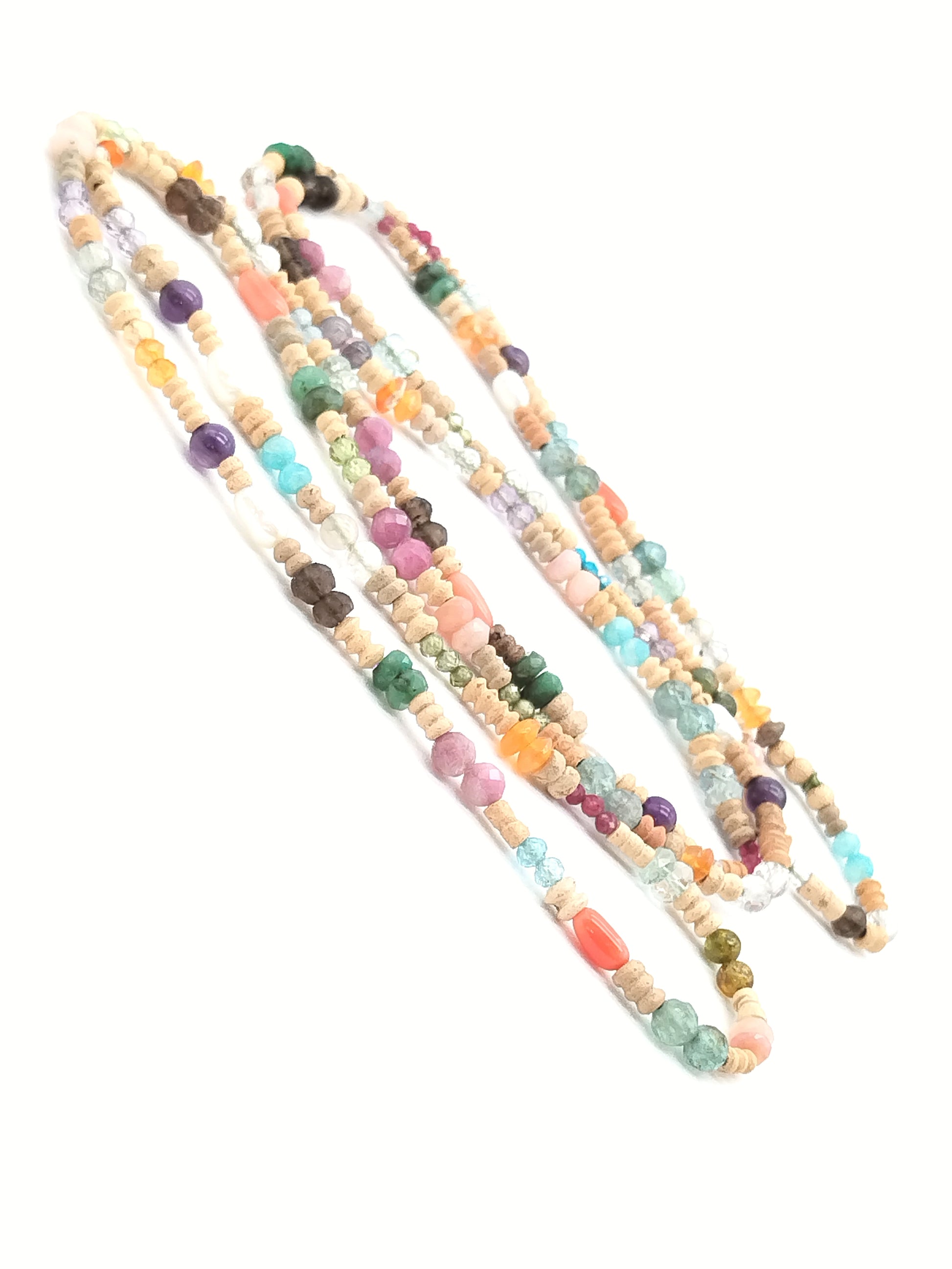 Este exquisito collar largo está meticulosamente elaborado a mano en delicado hilo de seda, con una vibrante gama de gemas naturales como rubíes, esmeraldas, cuarzo rosa, ópalo rosa, coral, perlas, amazonita, turmalinas, aguamarina y más. Adornado con cuentas de terracota marroquí hechas a mano, ofrece un diseño sin cierres que se desliza con naturalidad. El arcoíris de colores y el sutil brillo crean una refinada estética boho-chic, convirtiéndolo en un accesorio versátil, perfecto para usar todo el año. UNISEX