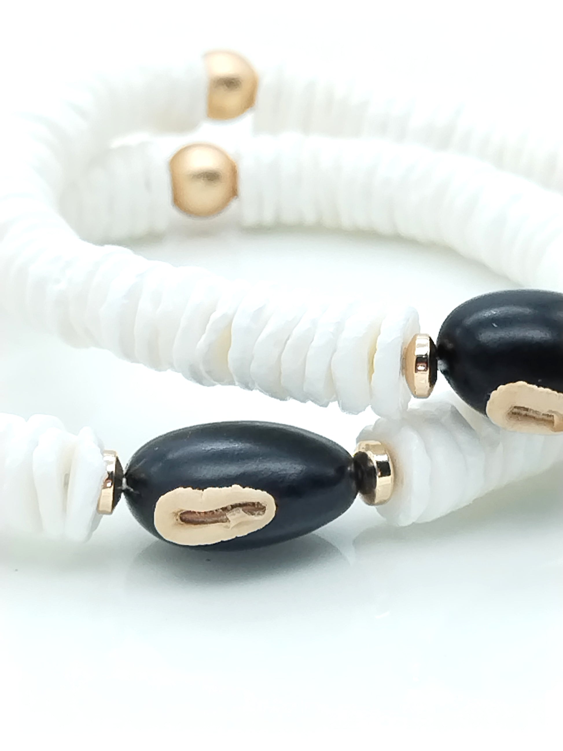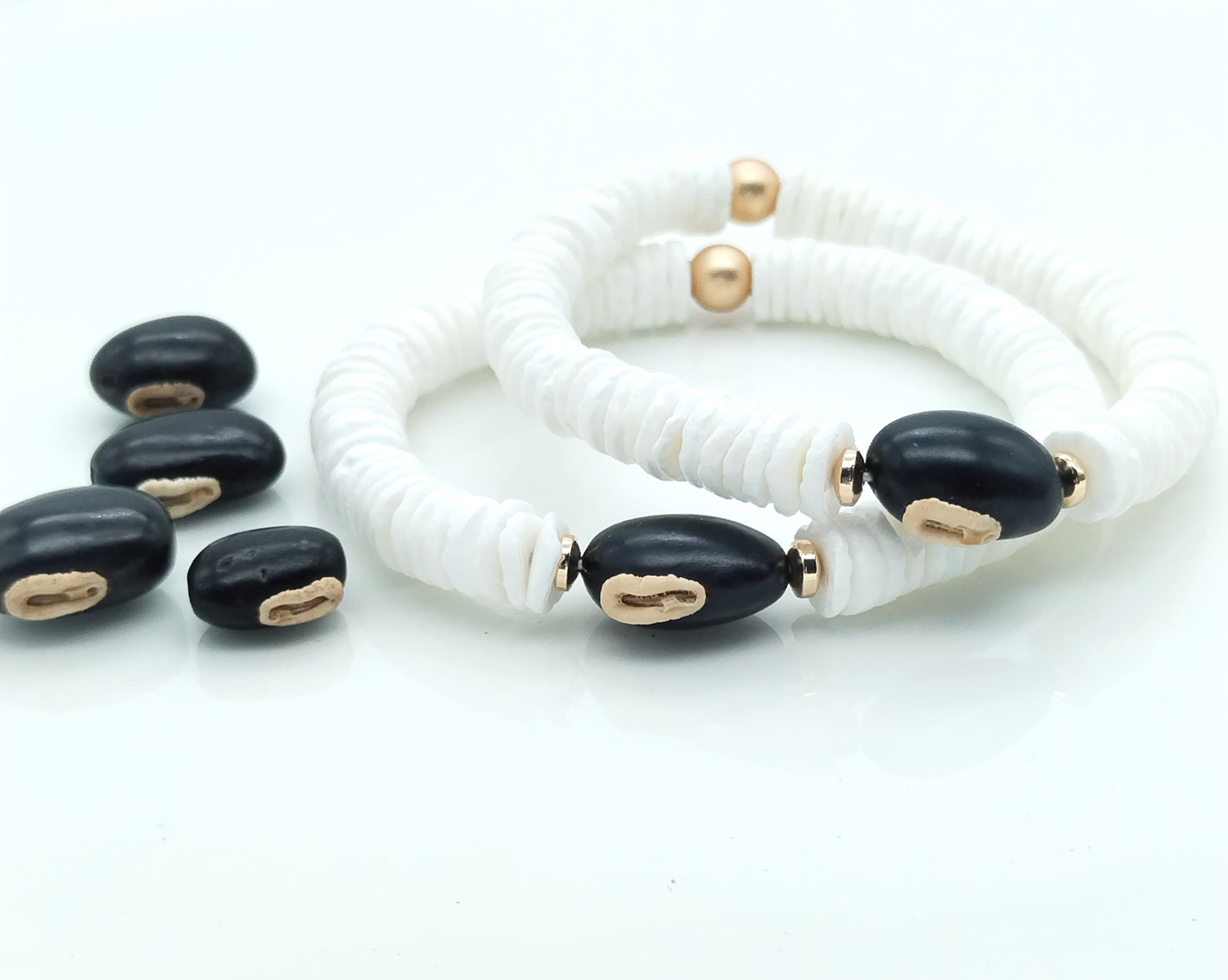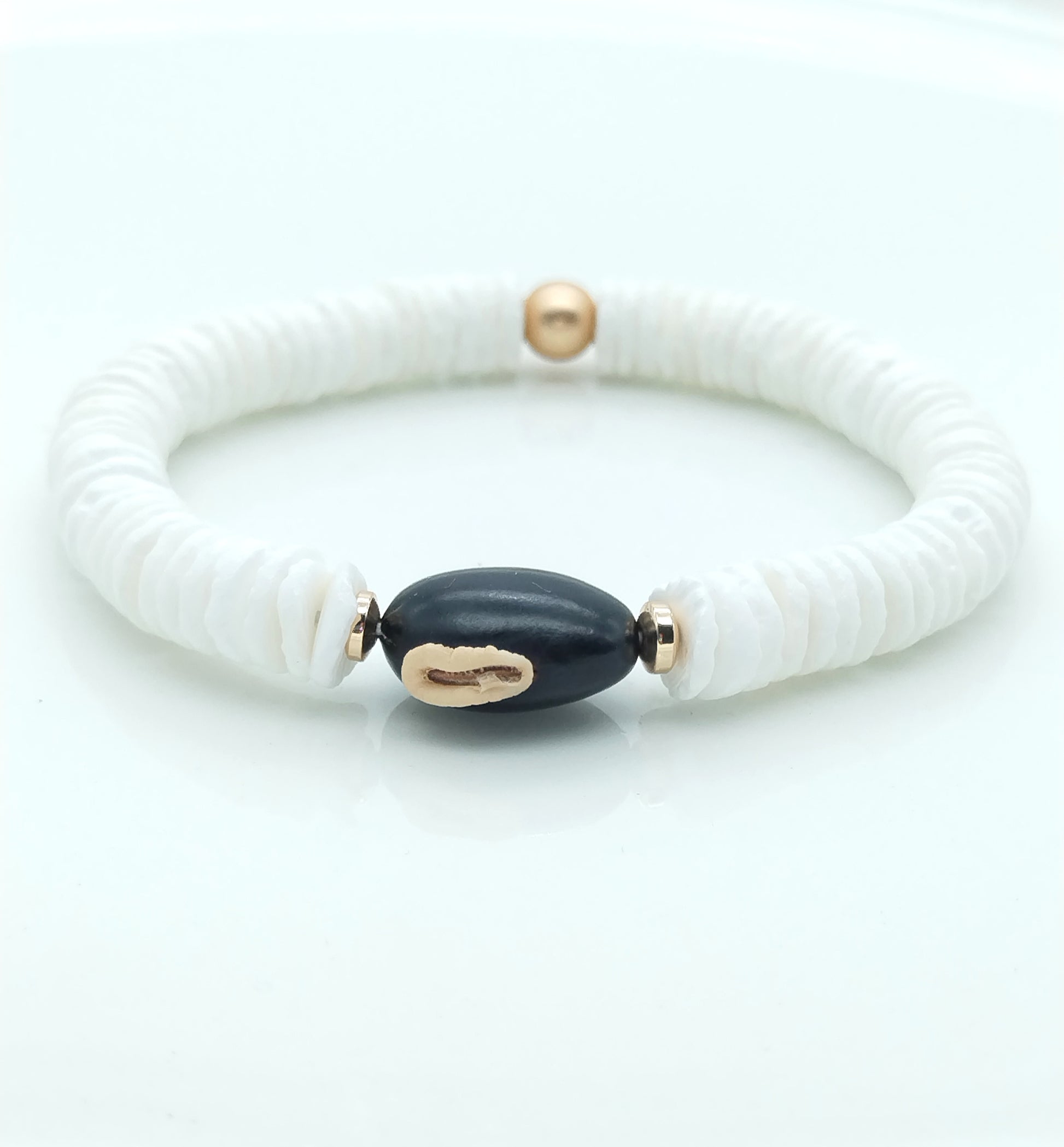 Esta elegante pulsera elástica presenta una llamativa cuenta focal de semilla "Boca de pez" negra, complementada con cuentas de concha blanca y sutiles detalles de hematita dorada. Diseñada para ajustarse cómodamente a cualquier muñeca, ofrece un look refinado ideal para usar durante todo el año. Perfecta para combinar con otras piezas o como pieza única, esta pulsera añade un toque sofisticado a cualquier atuendo.