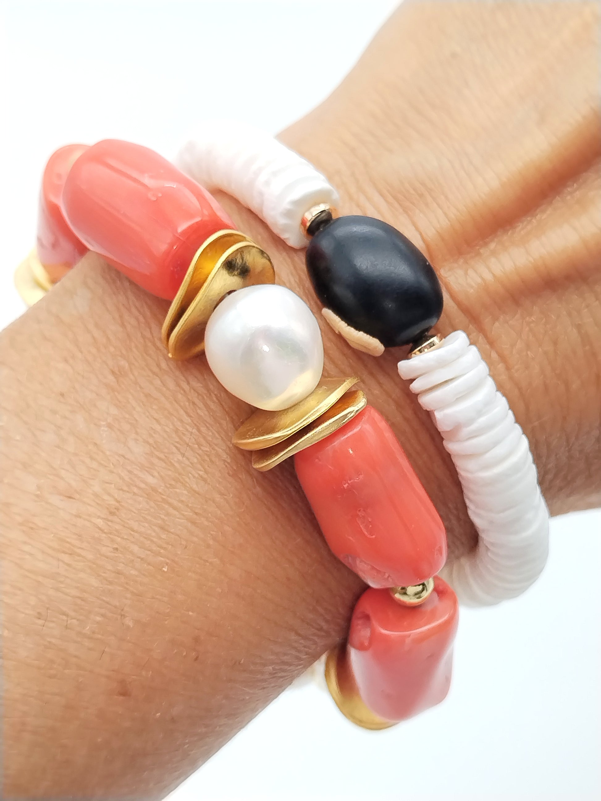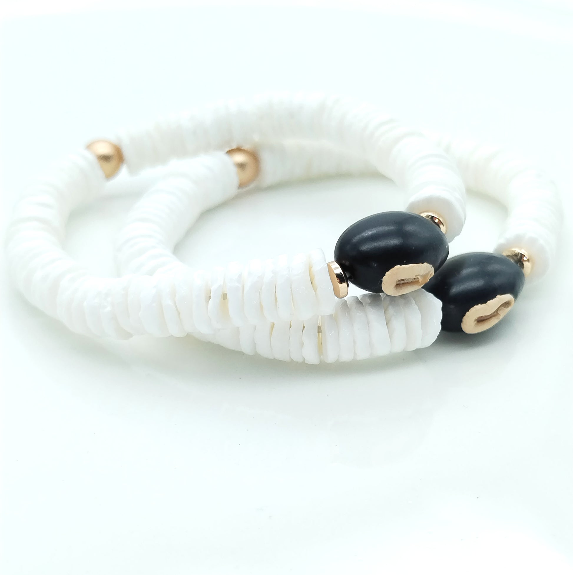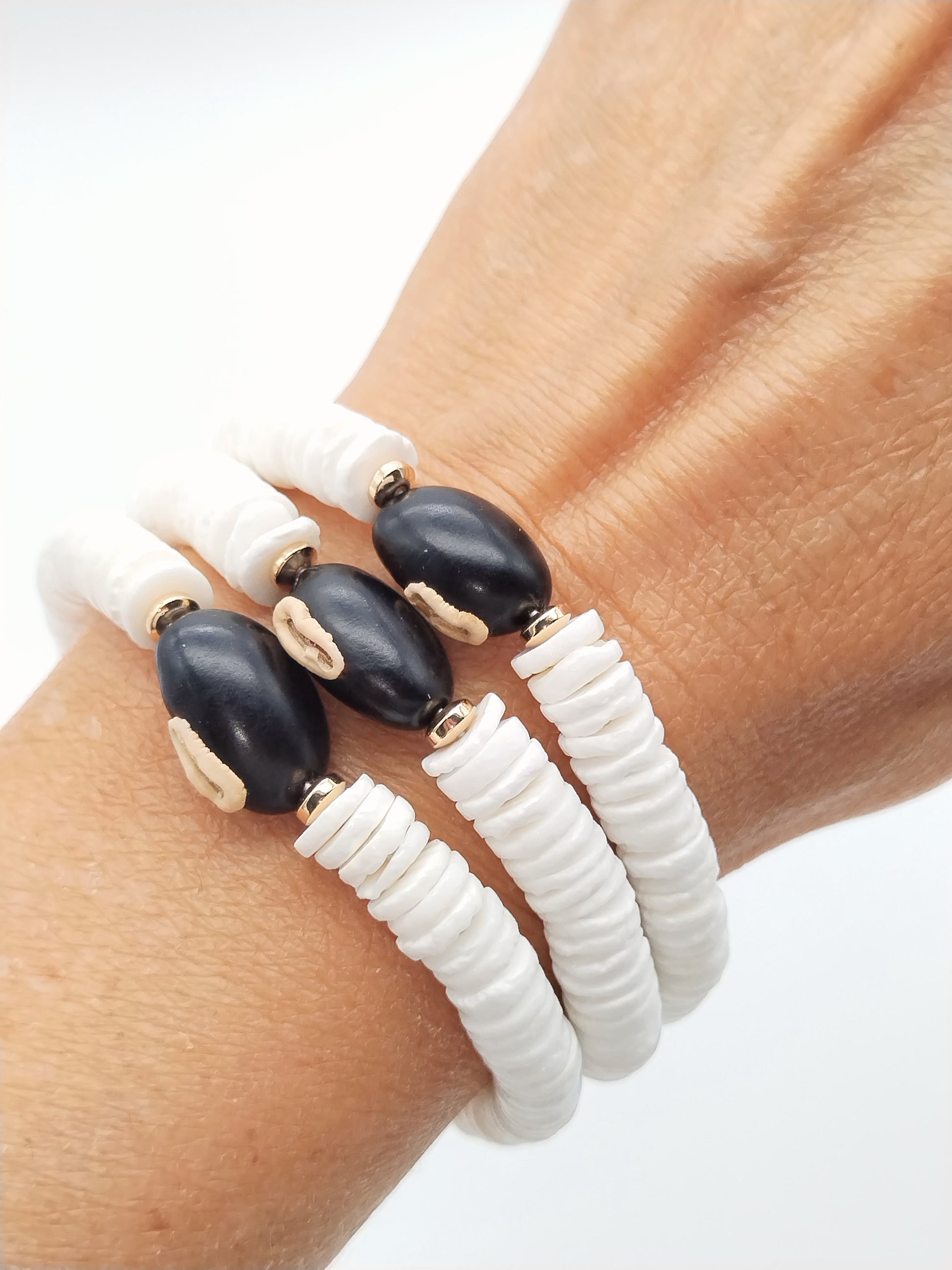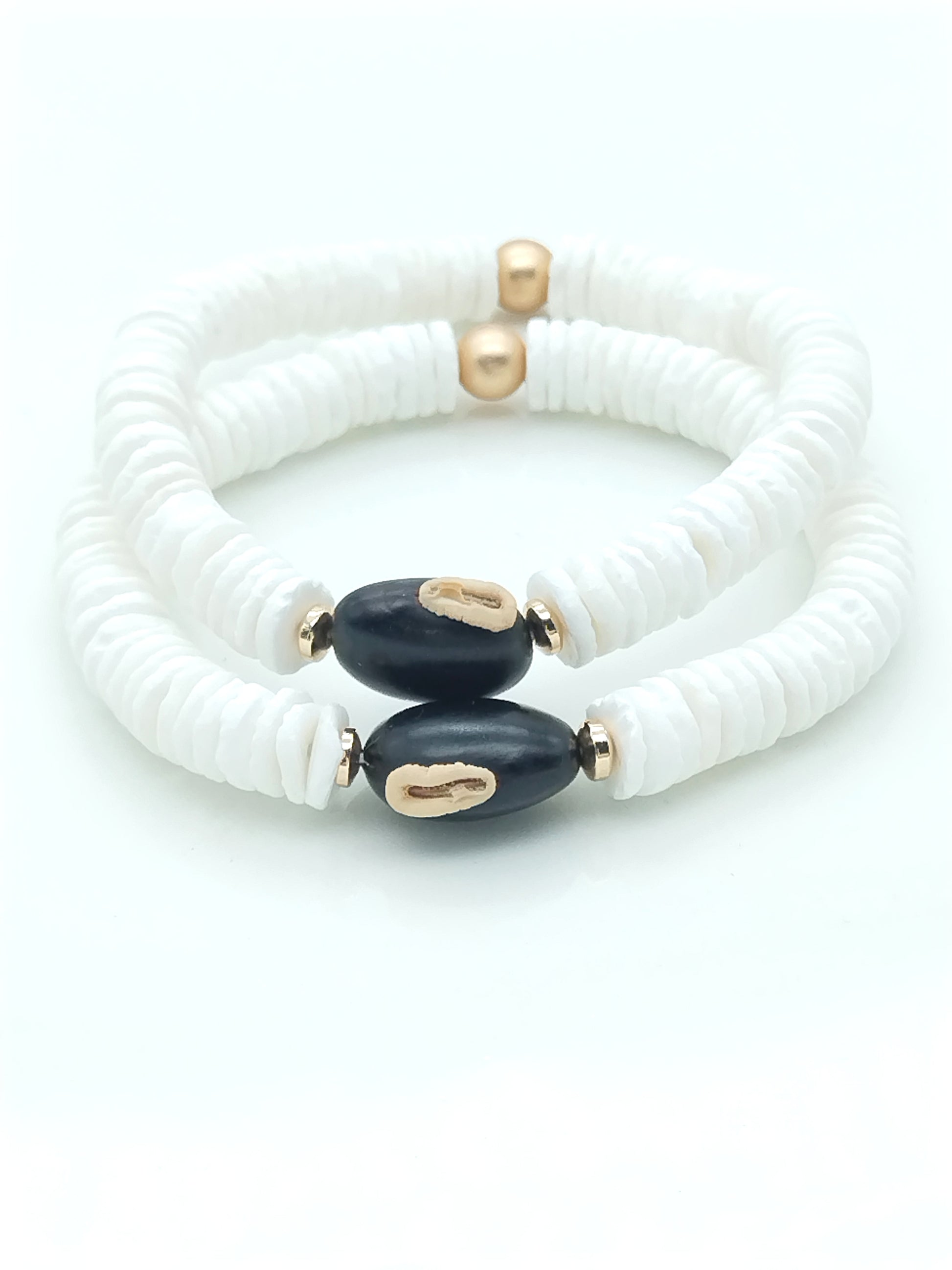Esta elegante pulsera elástica presenta una llamativa cuenta focal de semilla "Boca de pez" negra, complementada con cuentas de concha blanca y sutiles detalles de hematita dorada. Diseñada para ajustarse cómodamente a cualquier muñeca, ofrece un look refinado ideal para usar durante todo el año. Perfecta para combinar con otras piezas o como pieza única, esta pulsera añade un toque sofisticado a cualquier atuendo.