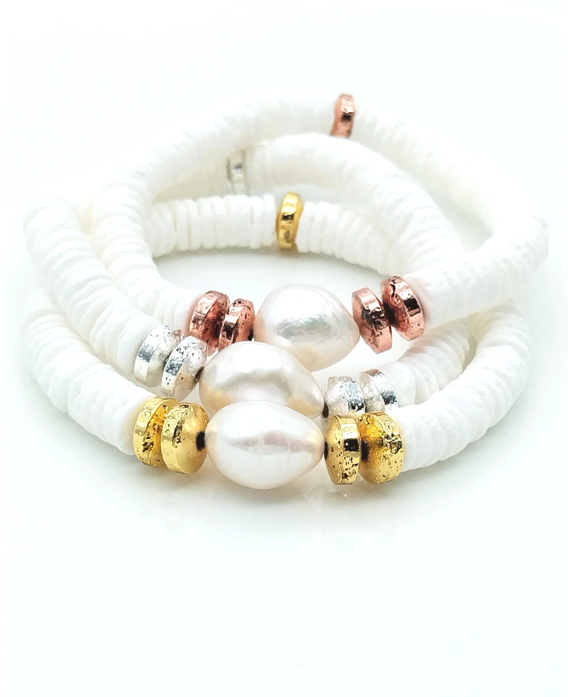 Pulseras de oro, plata y cobre con conchas blancas y perlas barrocas
