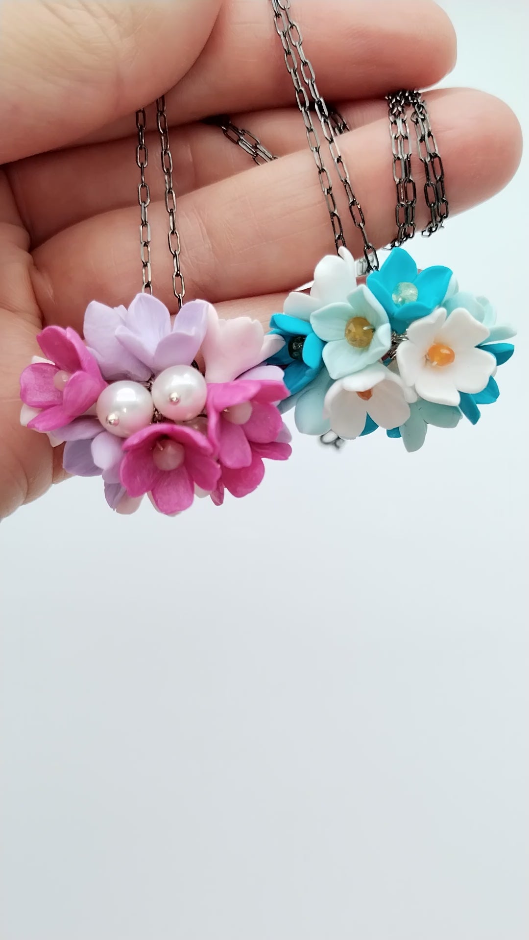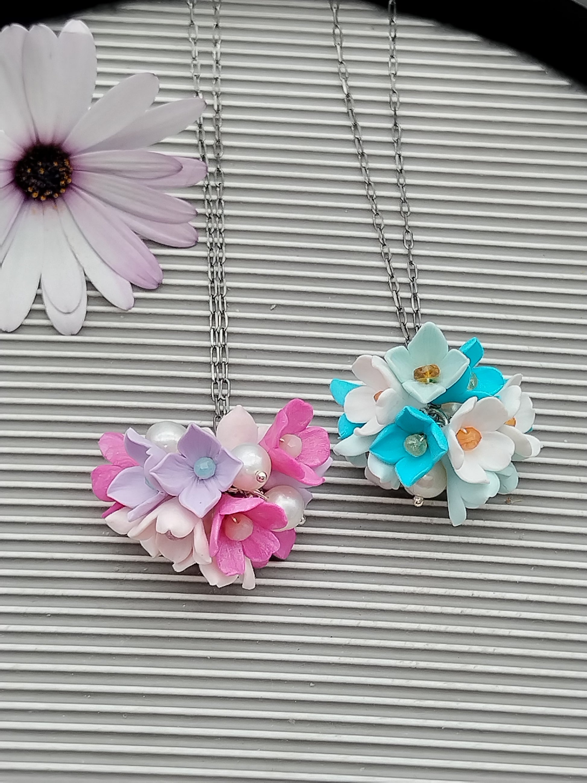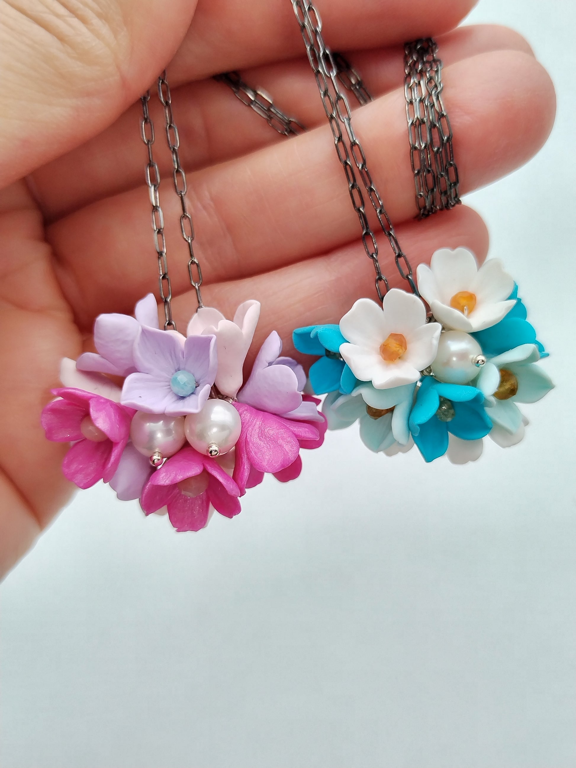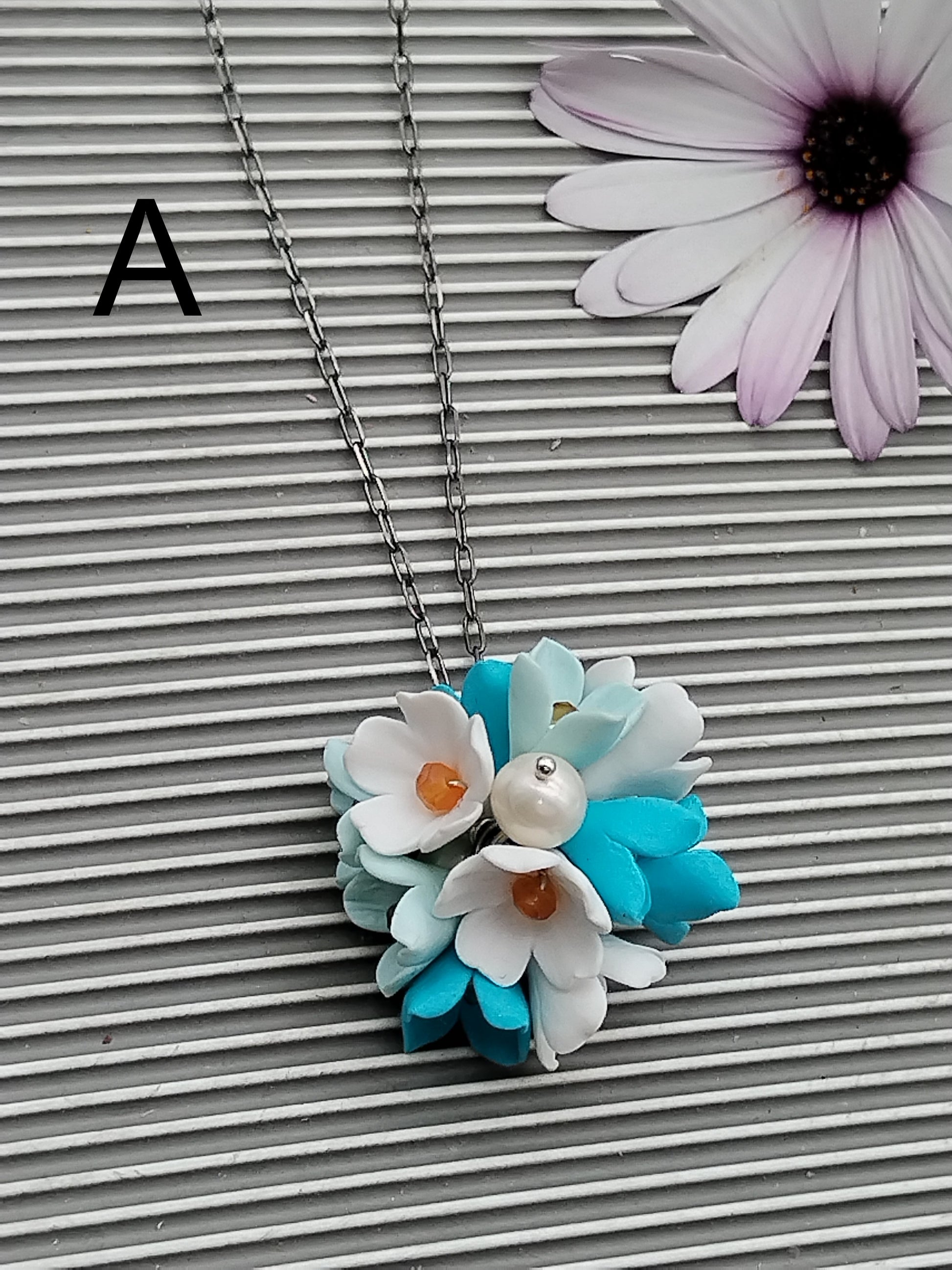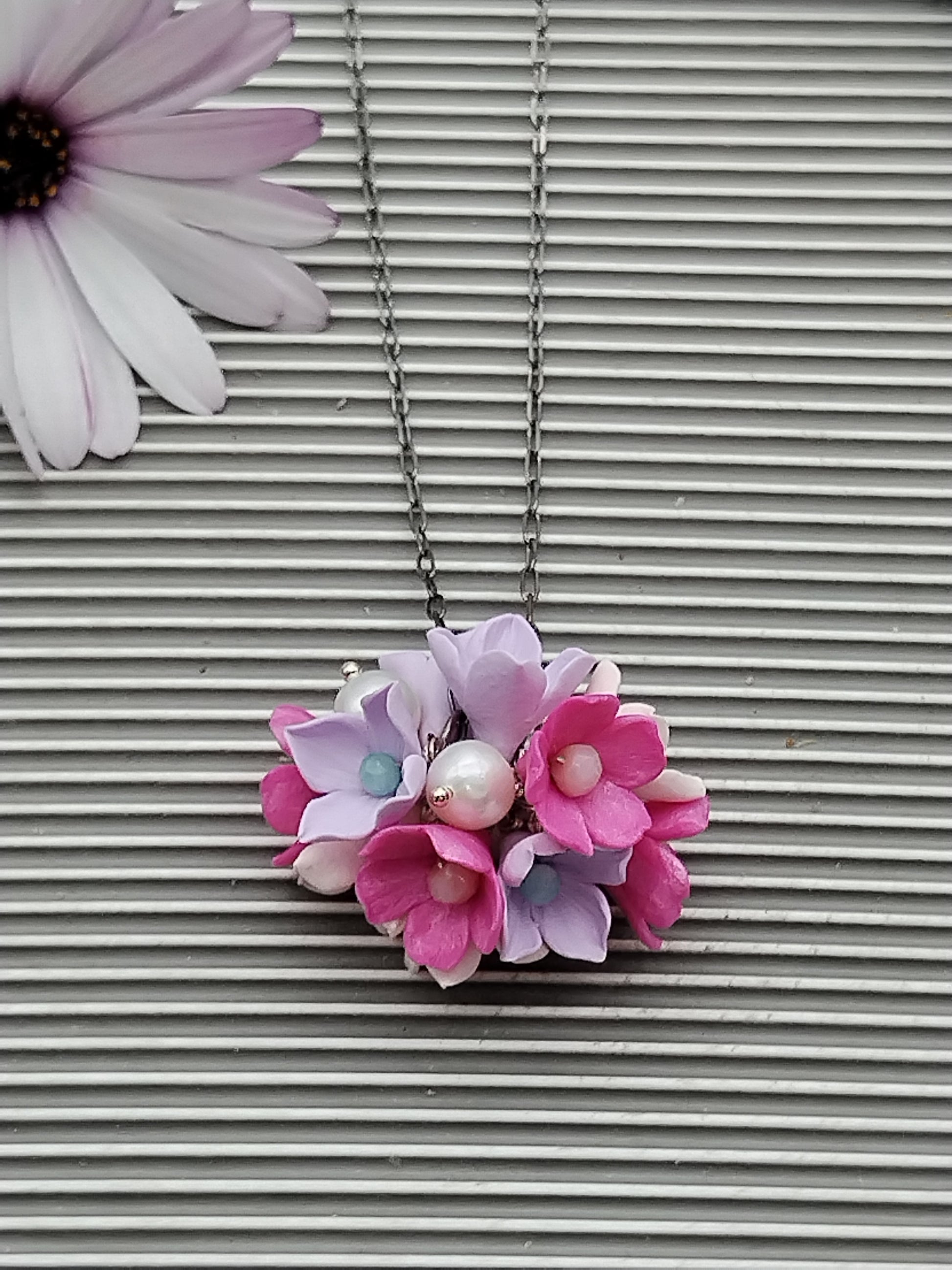 Lovely bouquet blossom flower pendant necklace meticulously hand wrapped onto Sterling Silver. Each flower has been handmade and each pistil is a facted gemstone bead which has been hand wrapped onto Sterling Silver 925. Then all flowers has been put together along with gorgeous AAA+ Fresh Water Pearl beads ( 6mm ) making a beautiful fresh bouquet. Chain is a Sterling Silver Cable chain and clasp is a Sterling Silver Spring Ring.