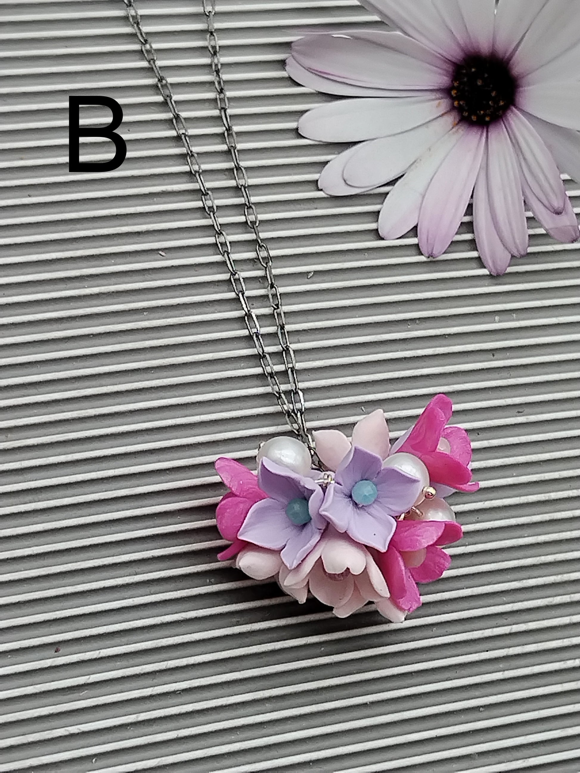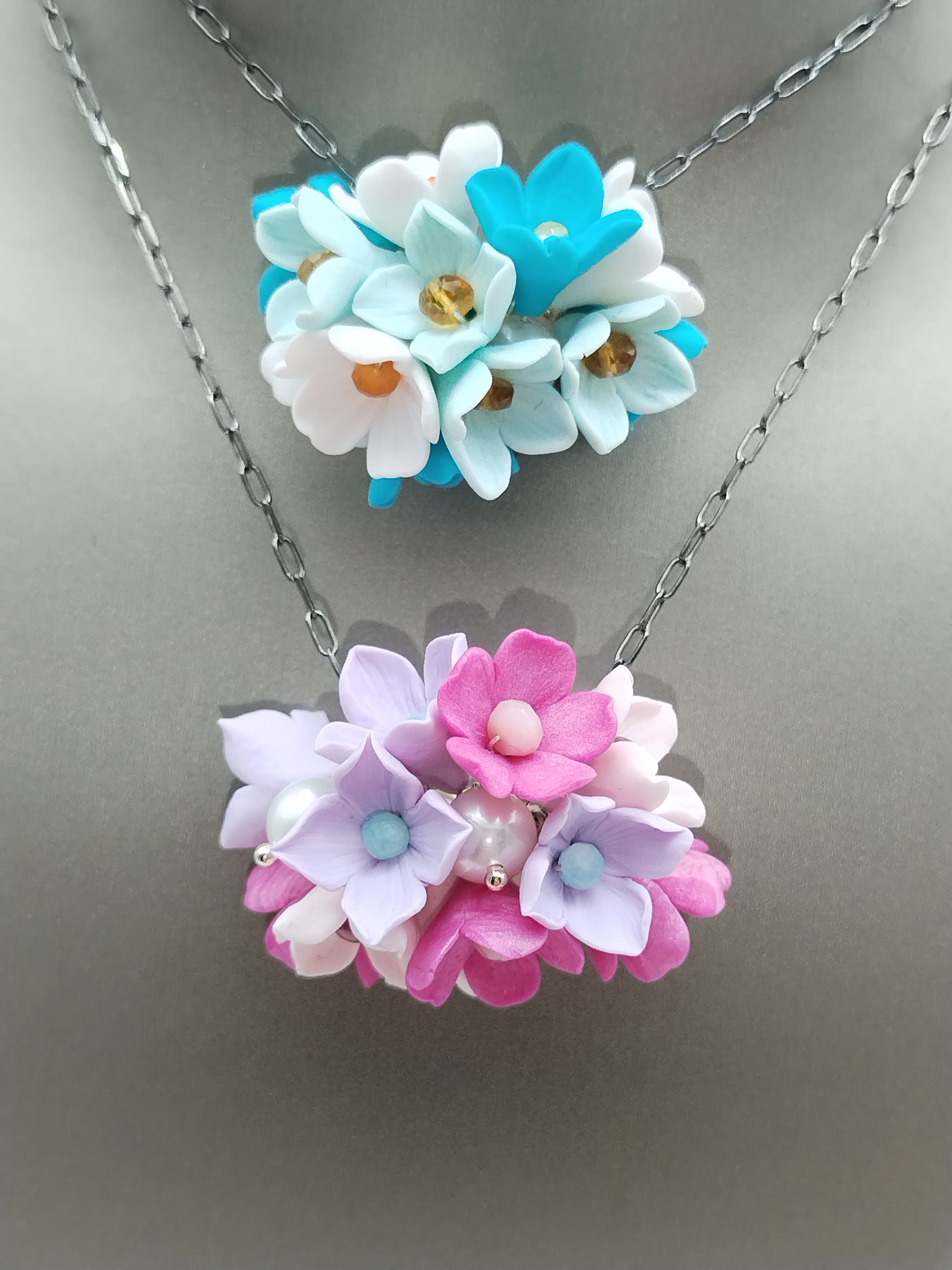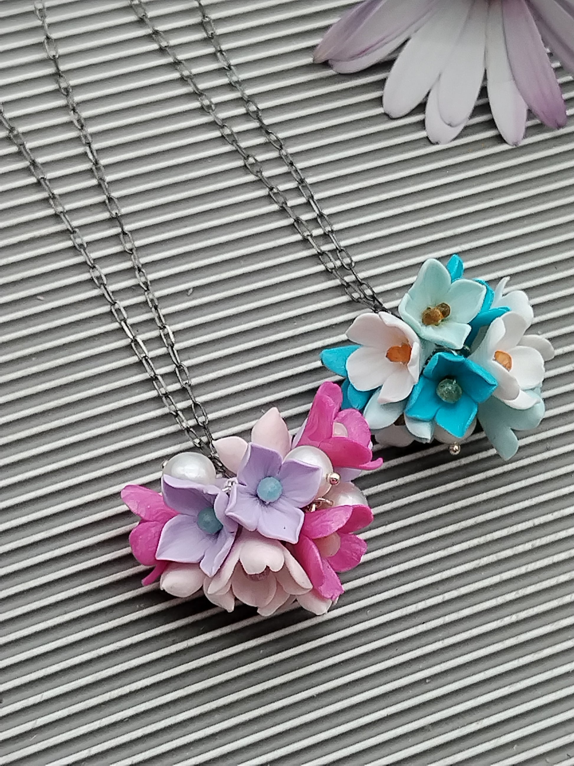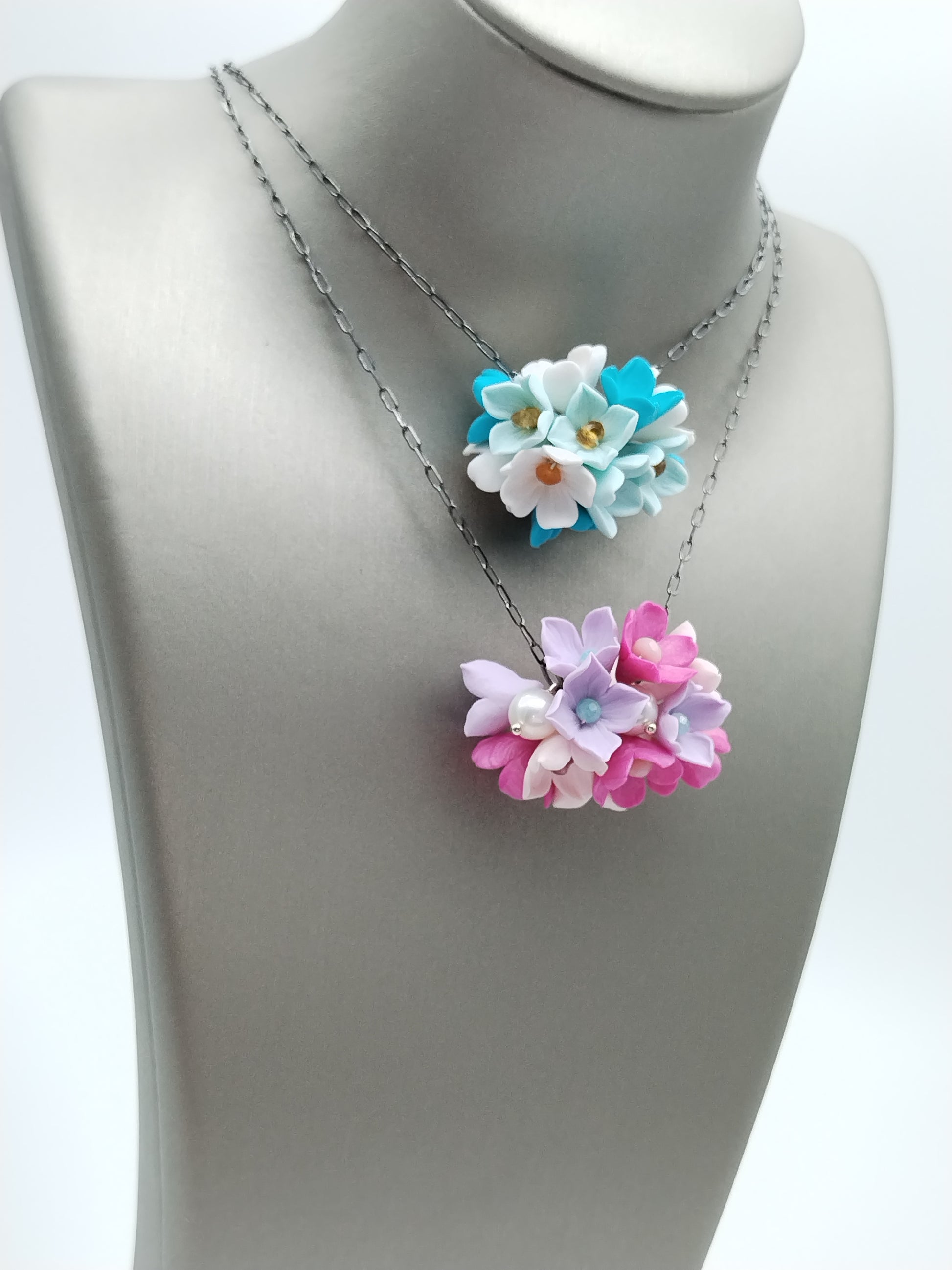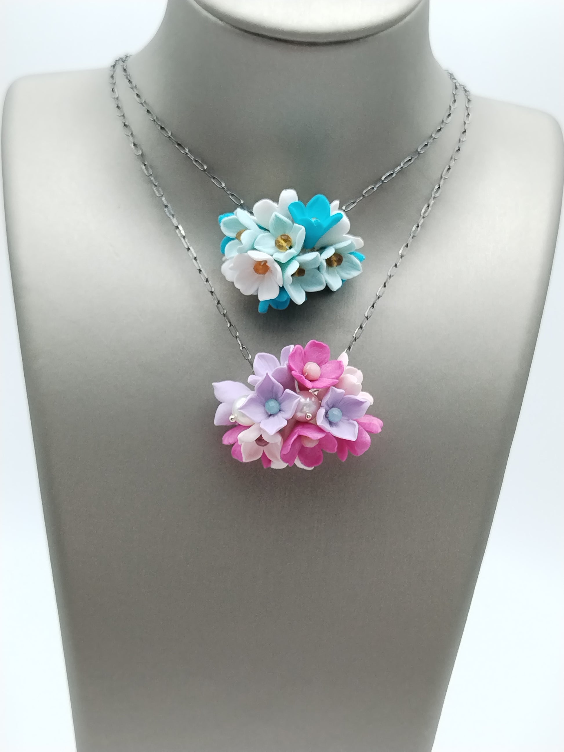 Lovely bouquet blossom flower pendant necklace meticulously hand wrapped onto Sterling Silver. Each flower has been handmade and each pistil is a facted gemstone bead which has been hand wrapped onto Sterling Silver 925. Then all flowers has been put together along with gorgeous AAA+ Fresh Water Pearl beads ( 6mm ) making a beautiful fresh bouquet. Chain is a Sterling Silver Cable chain and clasp is a Sterling Silver Spring Ring.