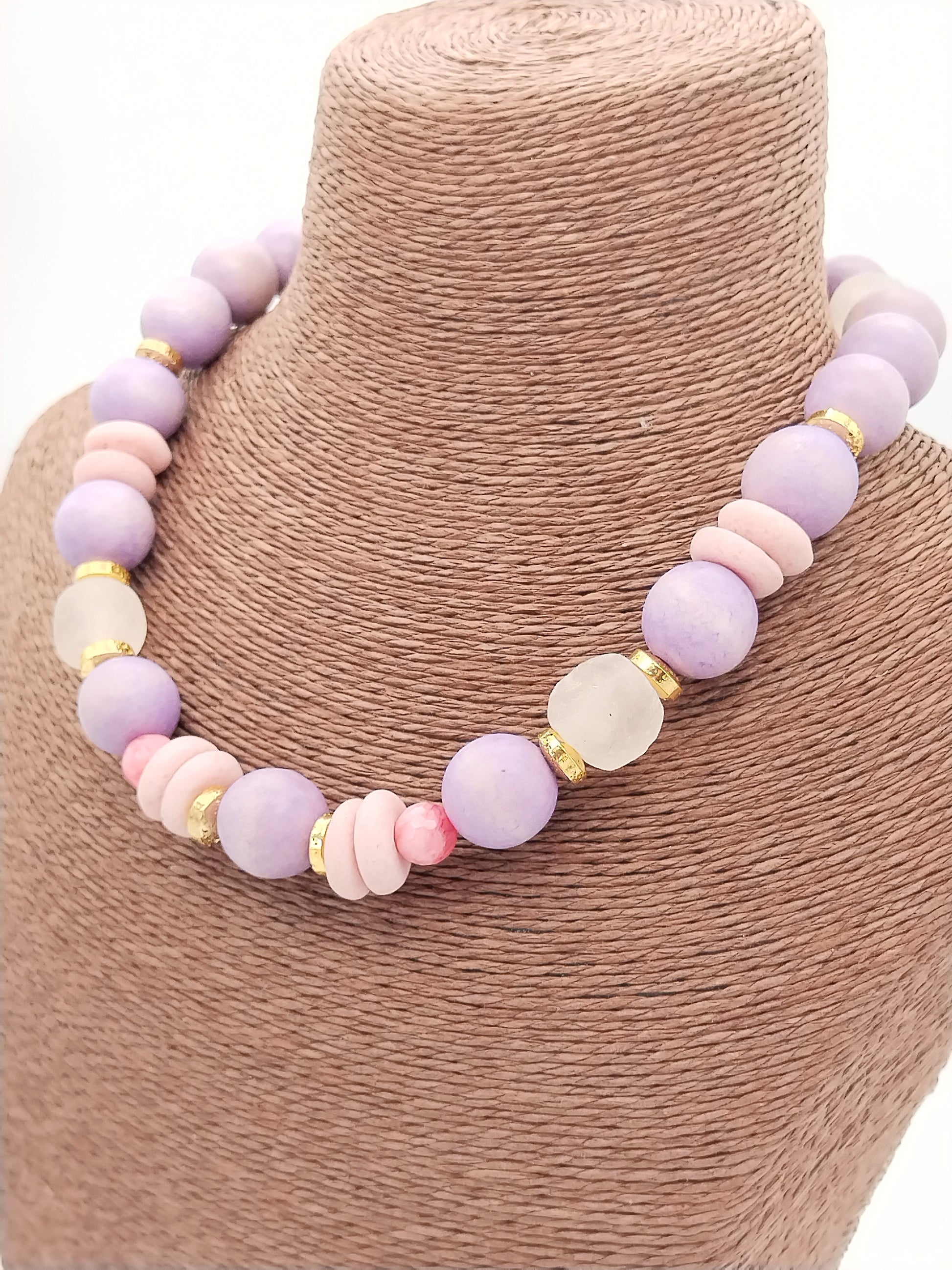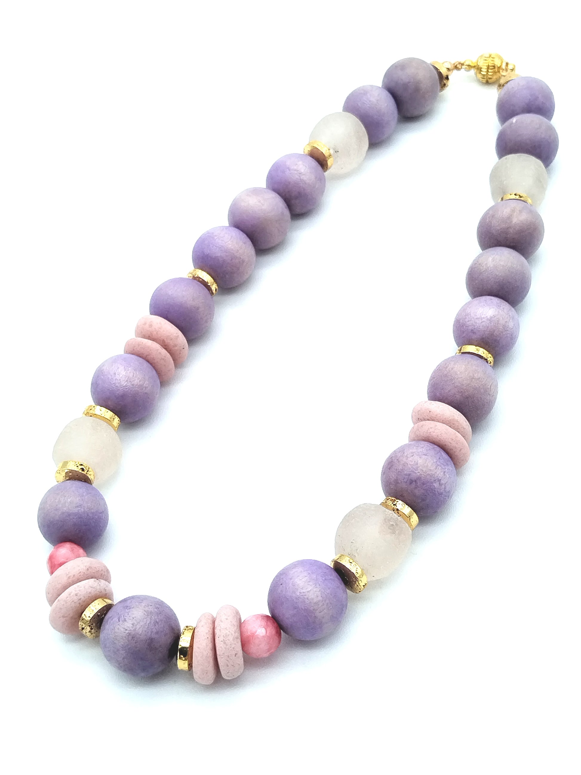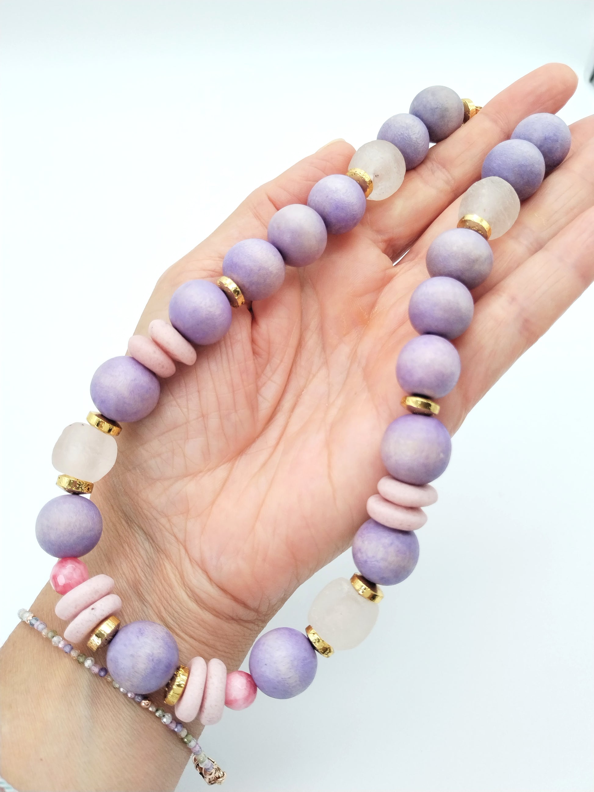 This choker necklace features a harmonious blend of large wood beads and authentic Ashanti African glass beads, accented with gold hematite rondelles and soft pink agate beads. Its lightweight design in pastel pink and lavender tones offers an elegant, dainty look perfect for summer styling. The magnetic clasp ensures easy wear, making it ideal to wear alone or layered for a refined, fashion-forward statement.