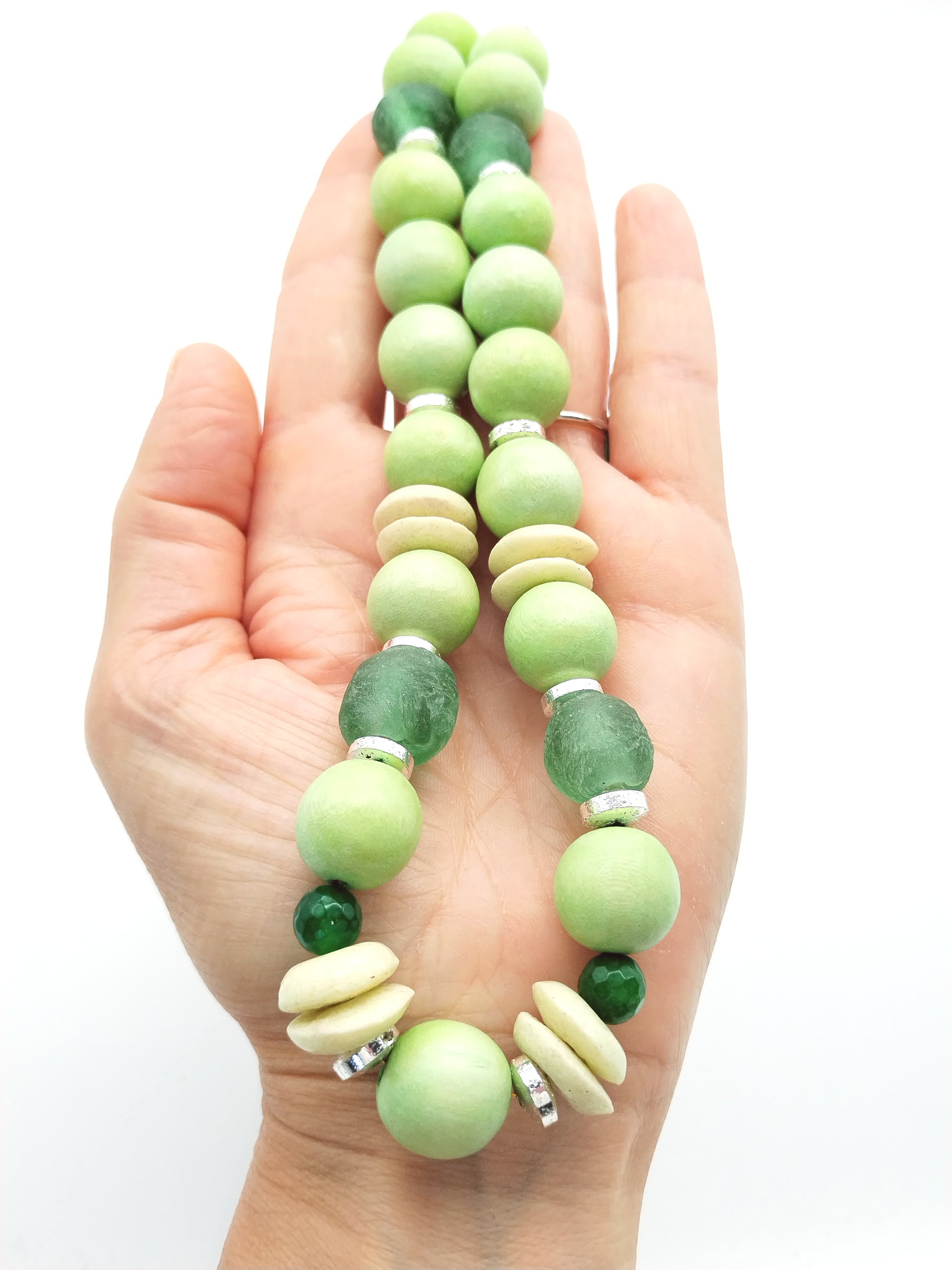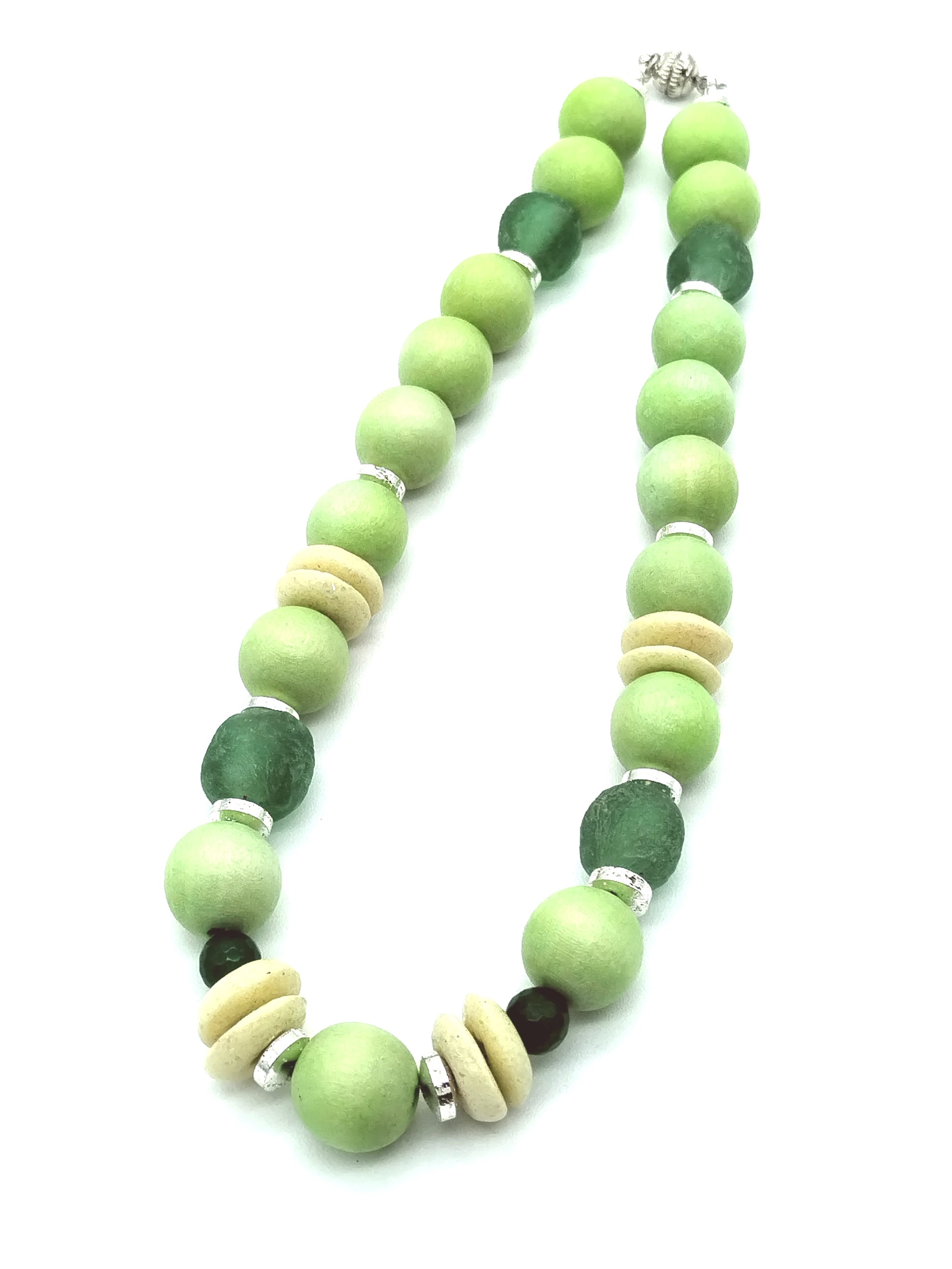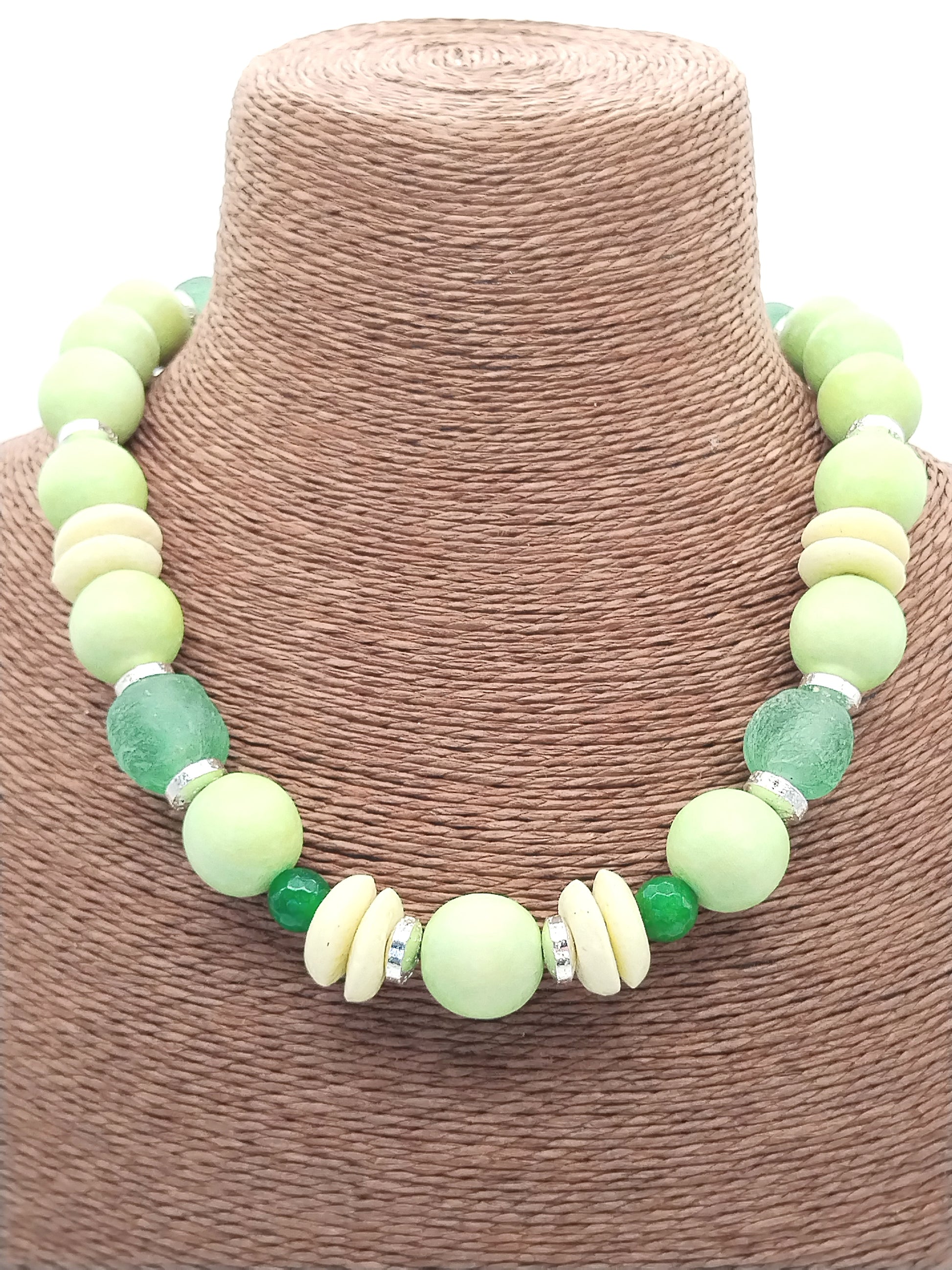 This choker necklace features a harmonious blend of large wood beads and authentic Ashanti African glass beads, accented with silver hematite rondelles and green agate beads. Its lightweight design in pastel apple green and lime tones offers an elegant, dainty look perfect for summer styling. The magnetic clasp ensures easy wear, making it ideal to wear alone or layered for a refined, fashion-forward statement.