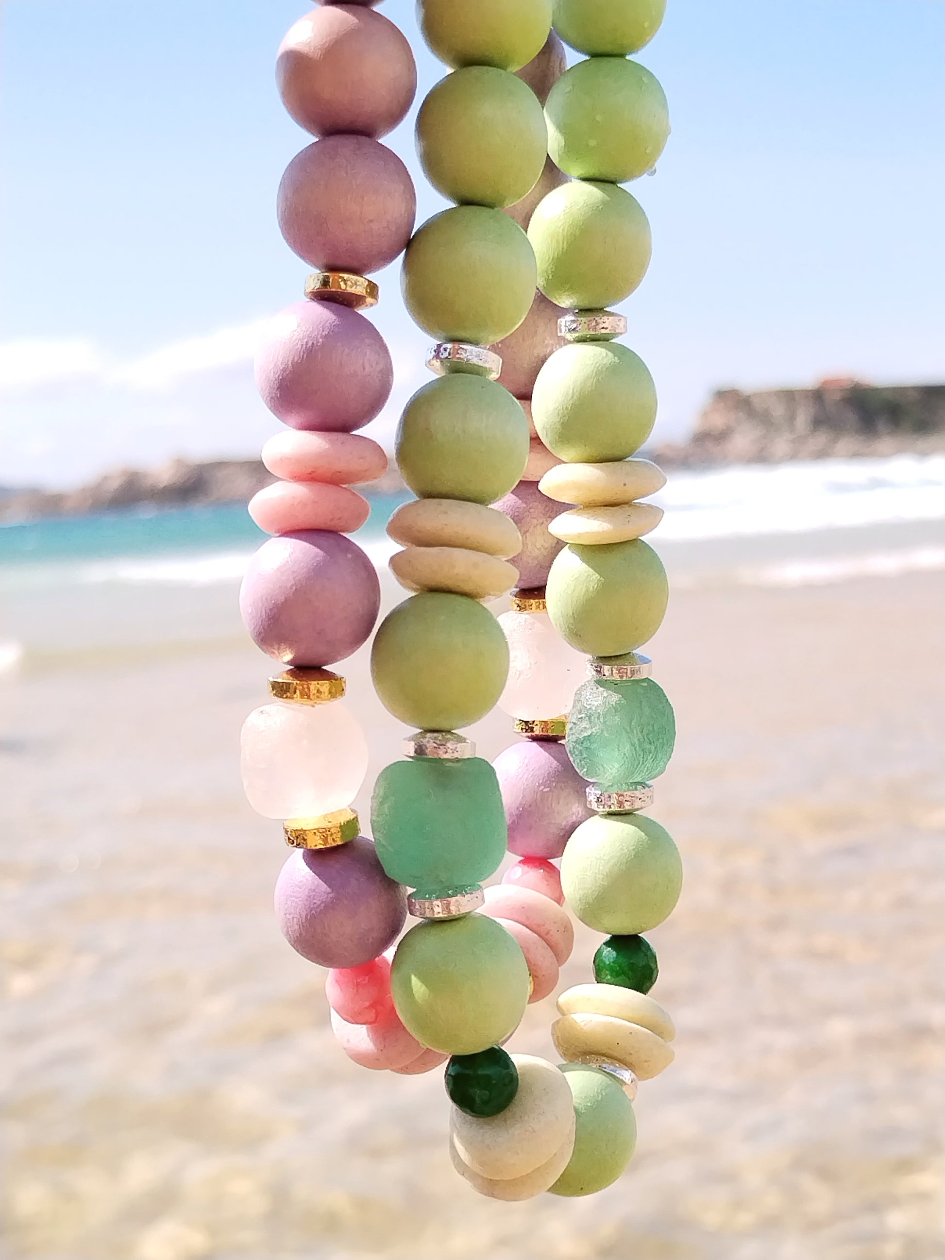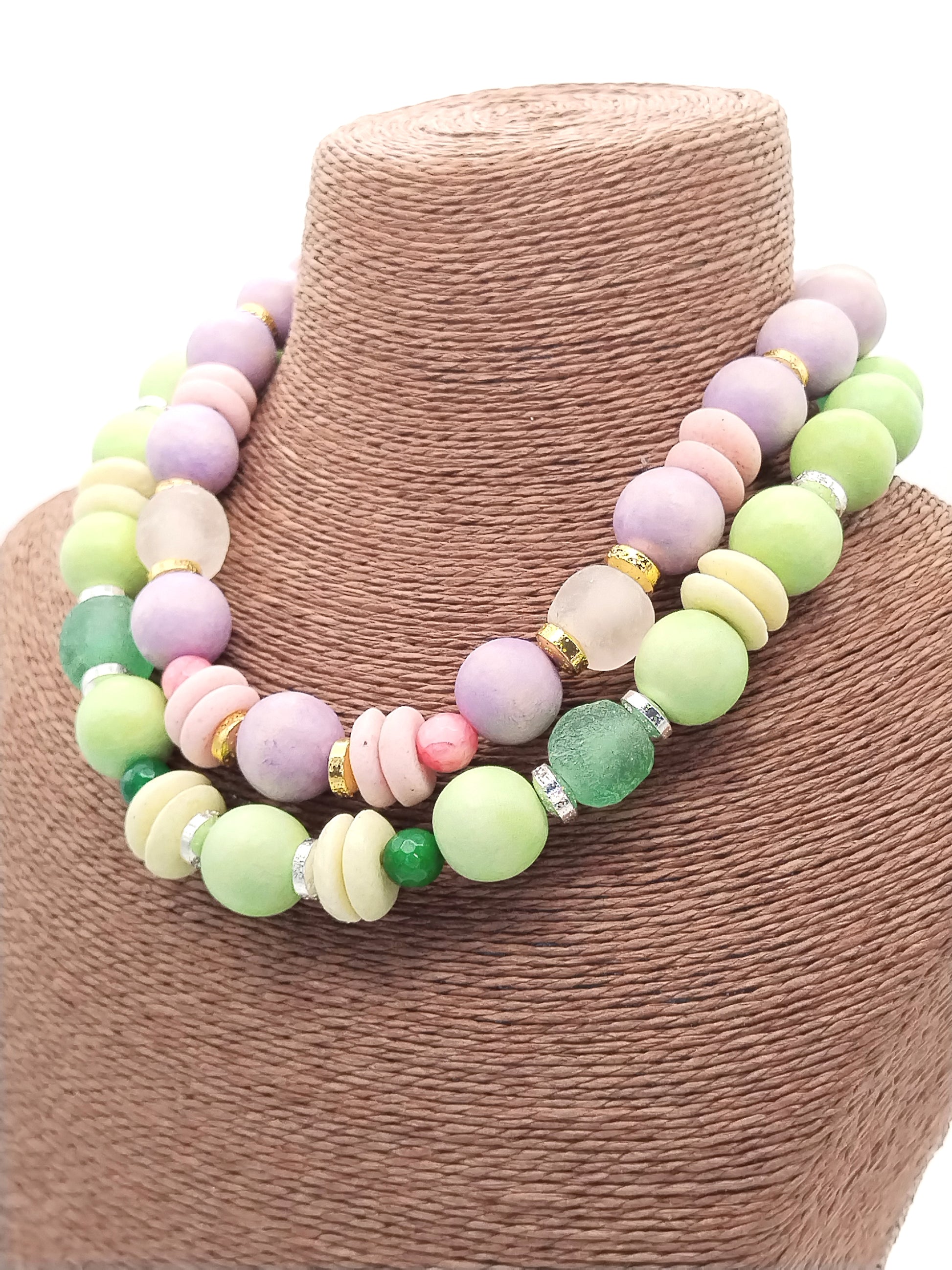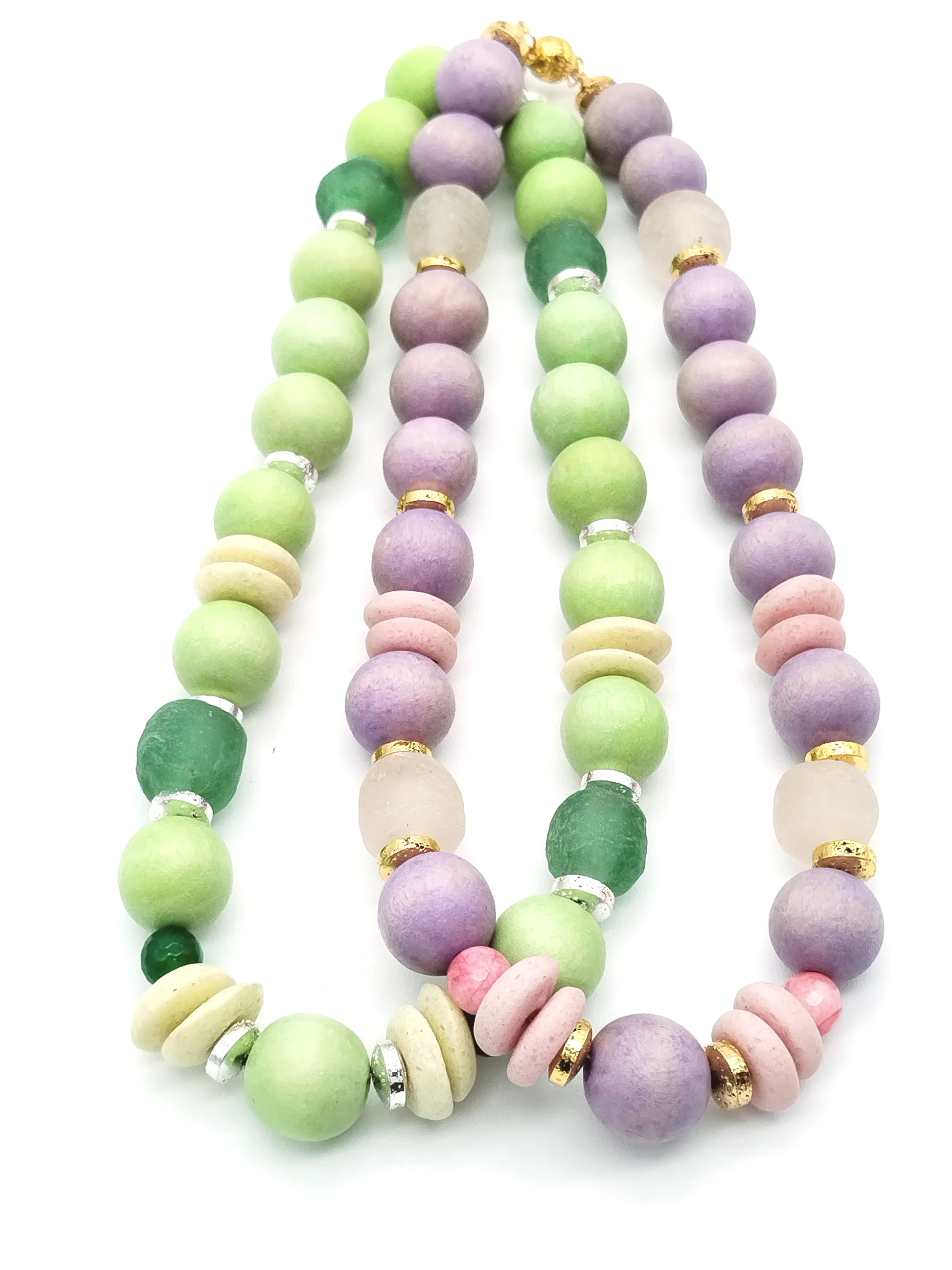 This choker necklace features a harmonious blend of large wood beads and authentic Ashanti African glass beads, accented with silver hematite rondelles and green agate beads. Its lightweight design in pastel apple green and lime tones offers an elegant, dainty look perfect for summer styling. The magnetic clasp ensures easy wear, making it ideal to wear alone or layered for a refined, fashion-forward statement.