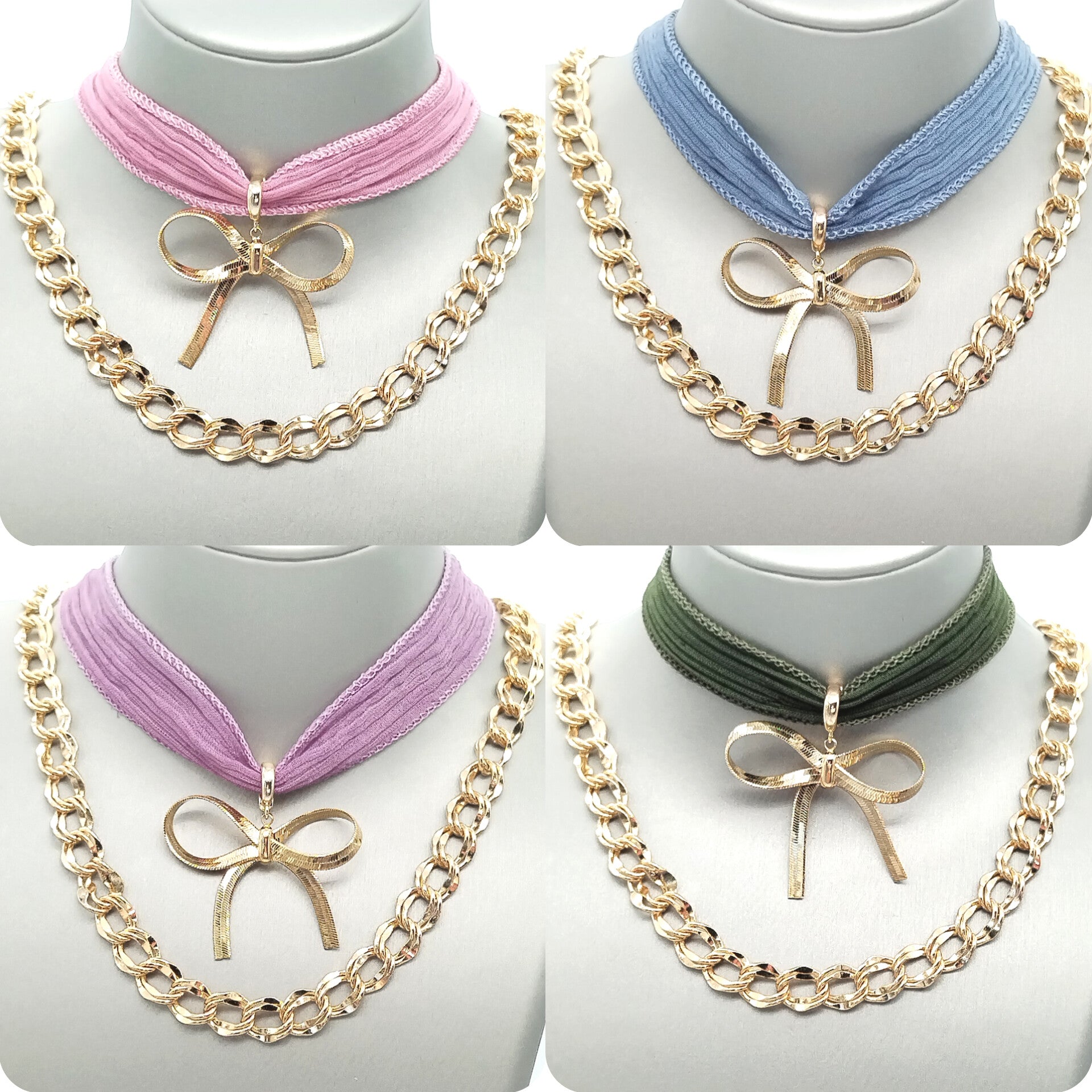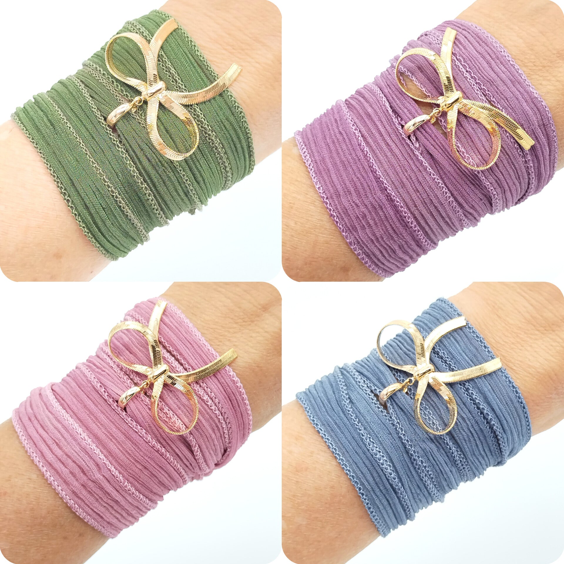Versatile Pastel Silk Ribbon Tie and Bracelet with Removable Gold Bowknot Charm