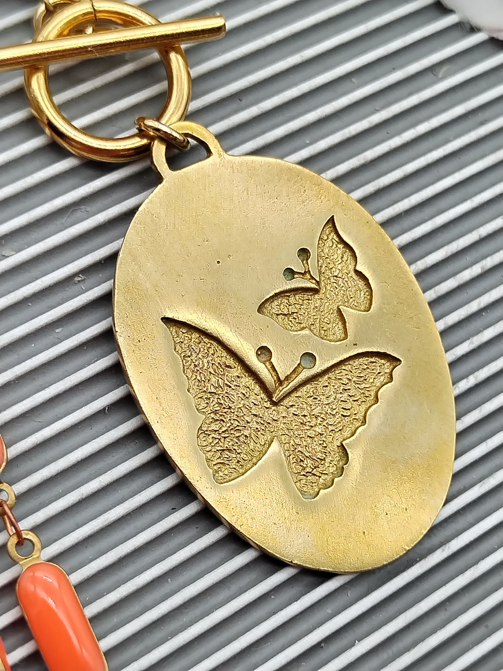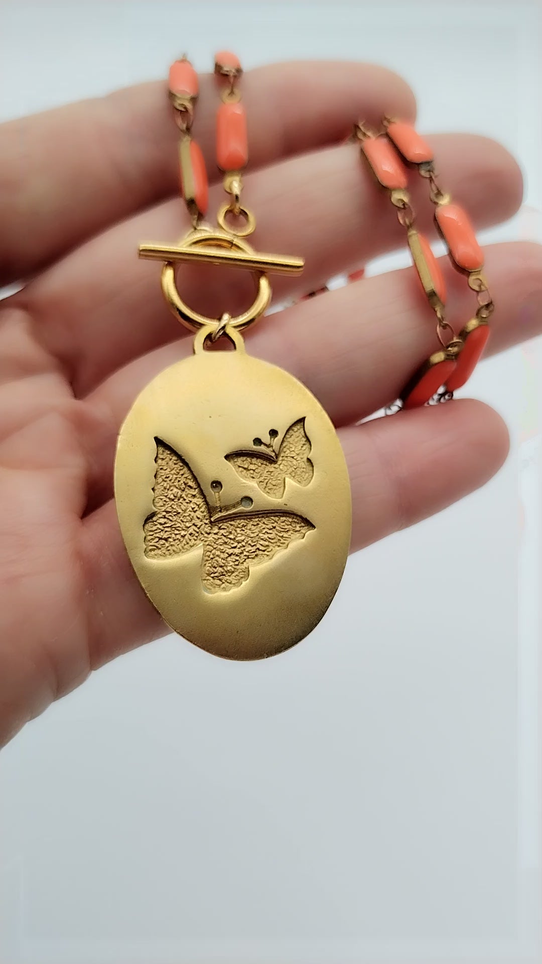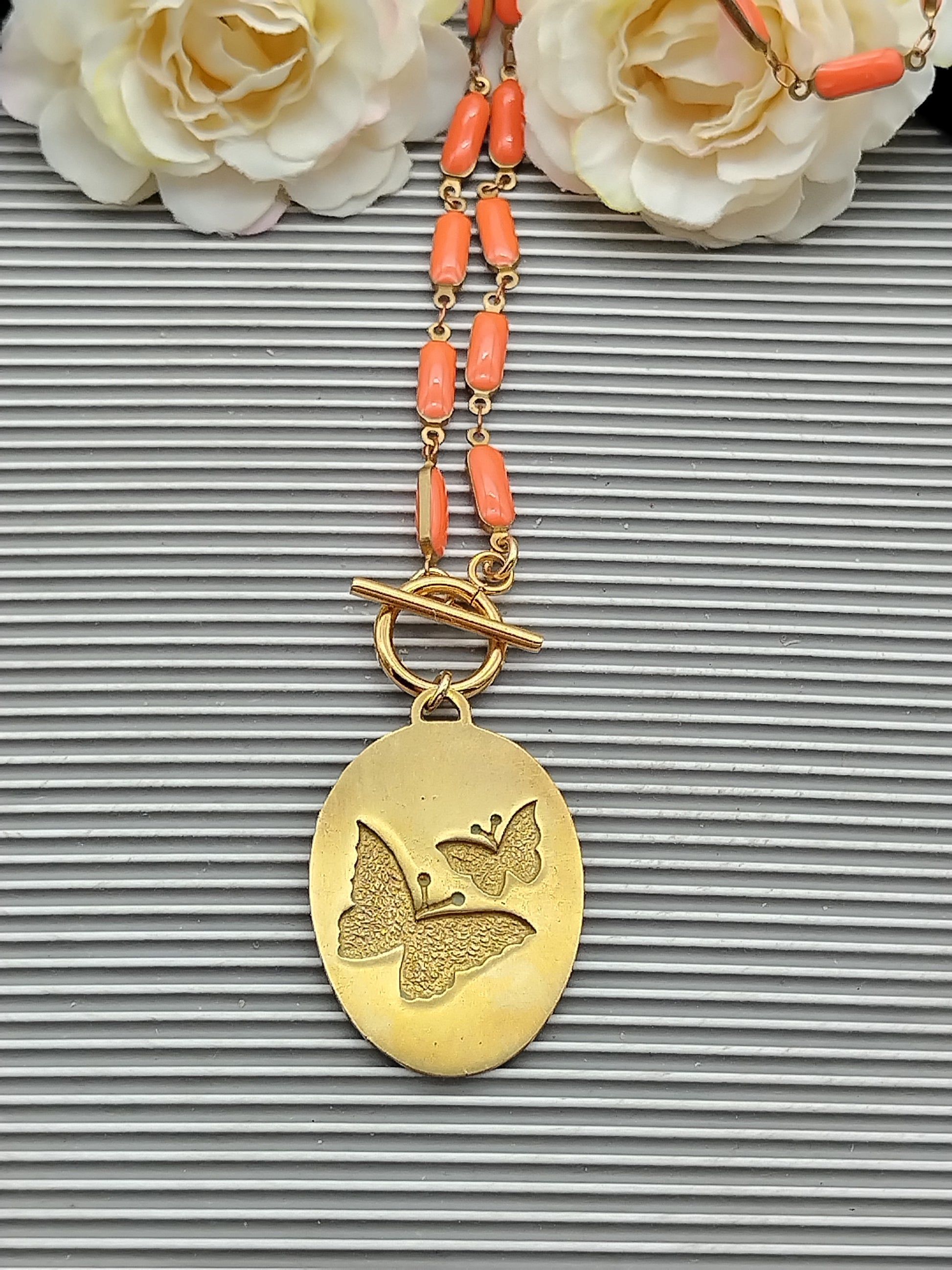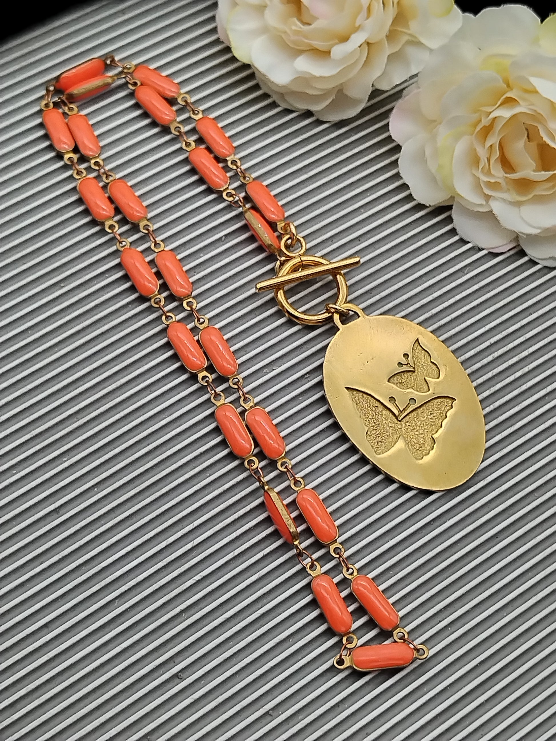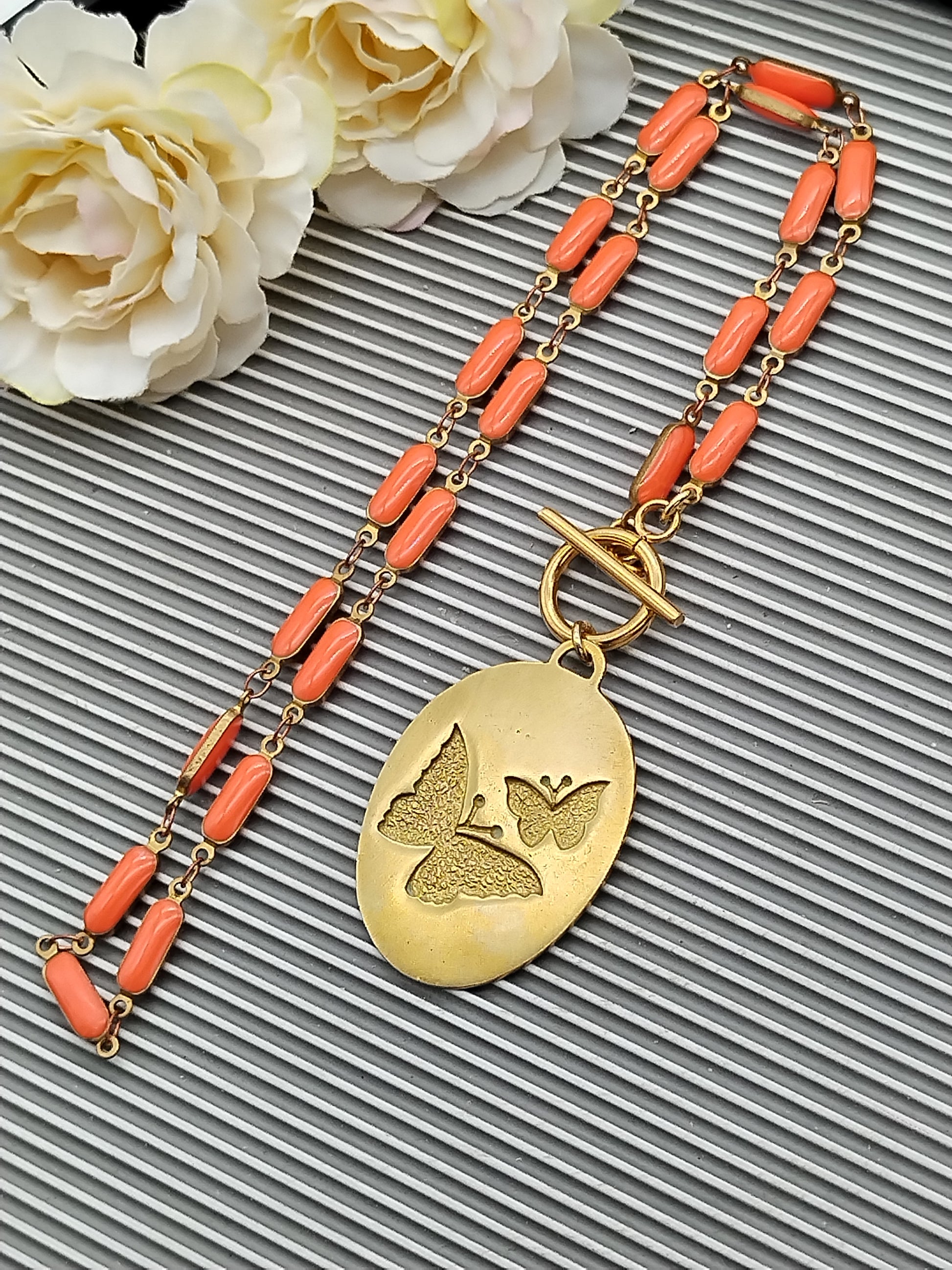 Butterfly Medallion Choker, Orange Enamel Puffed Bar Chain, Toggle front Clasp Necklace