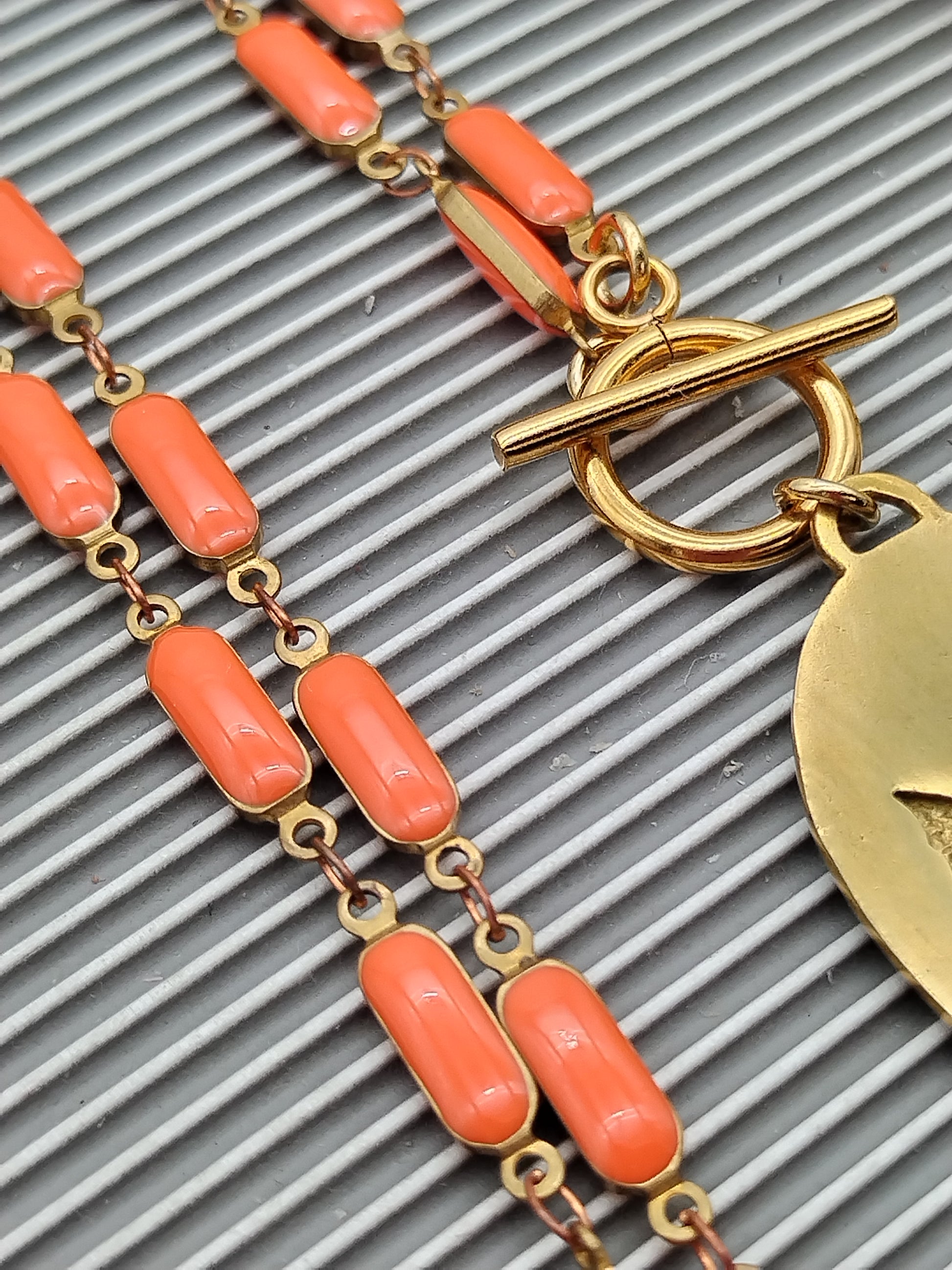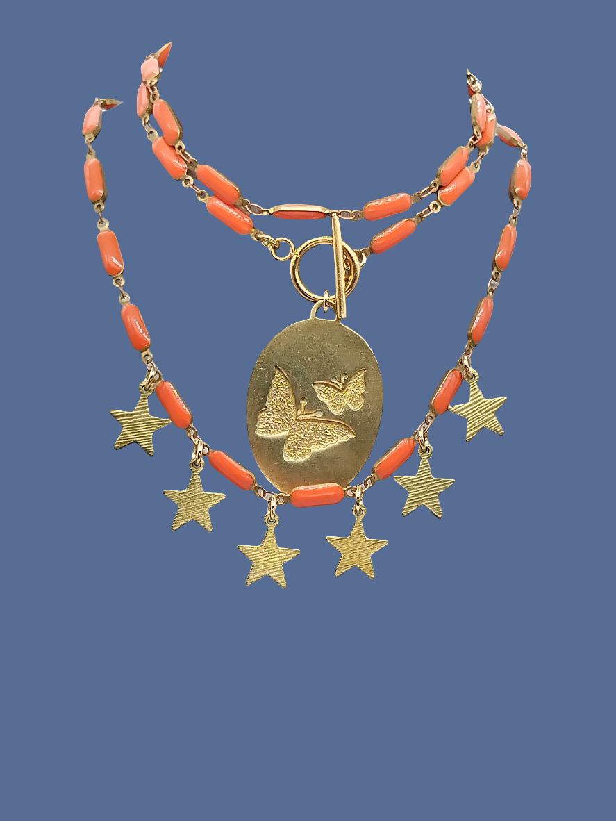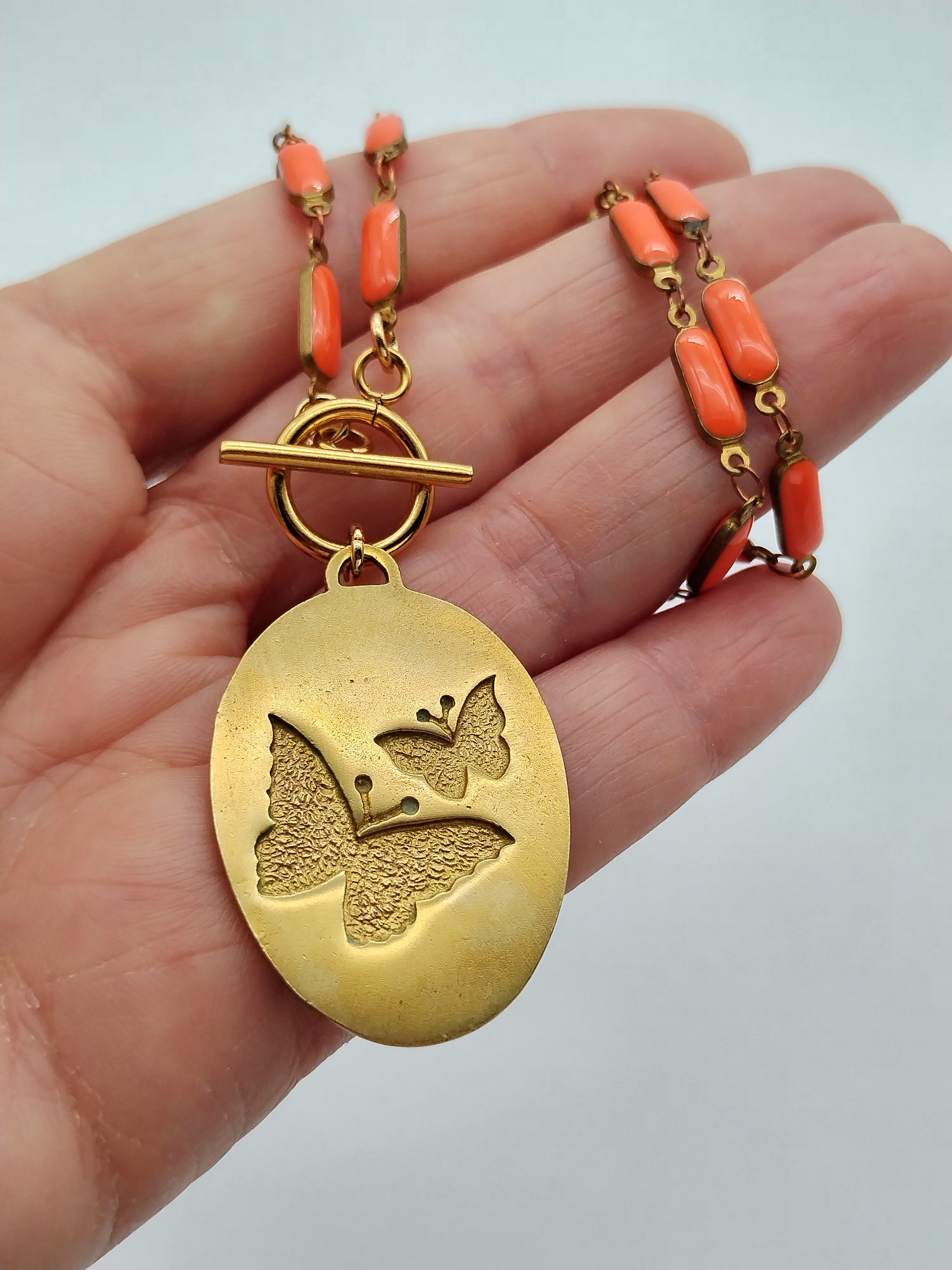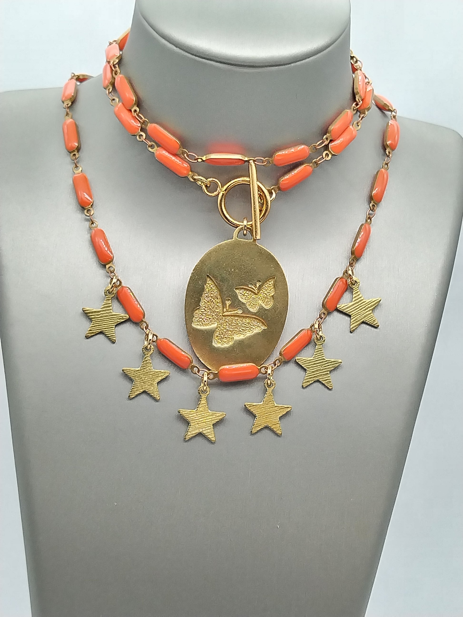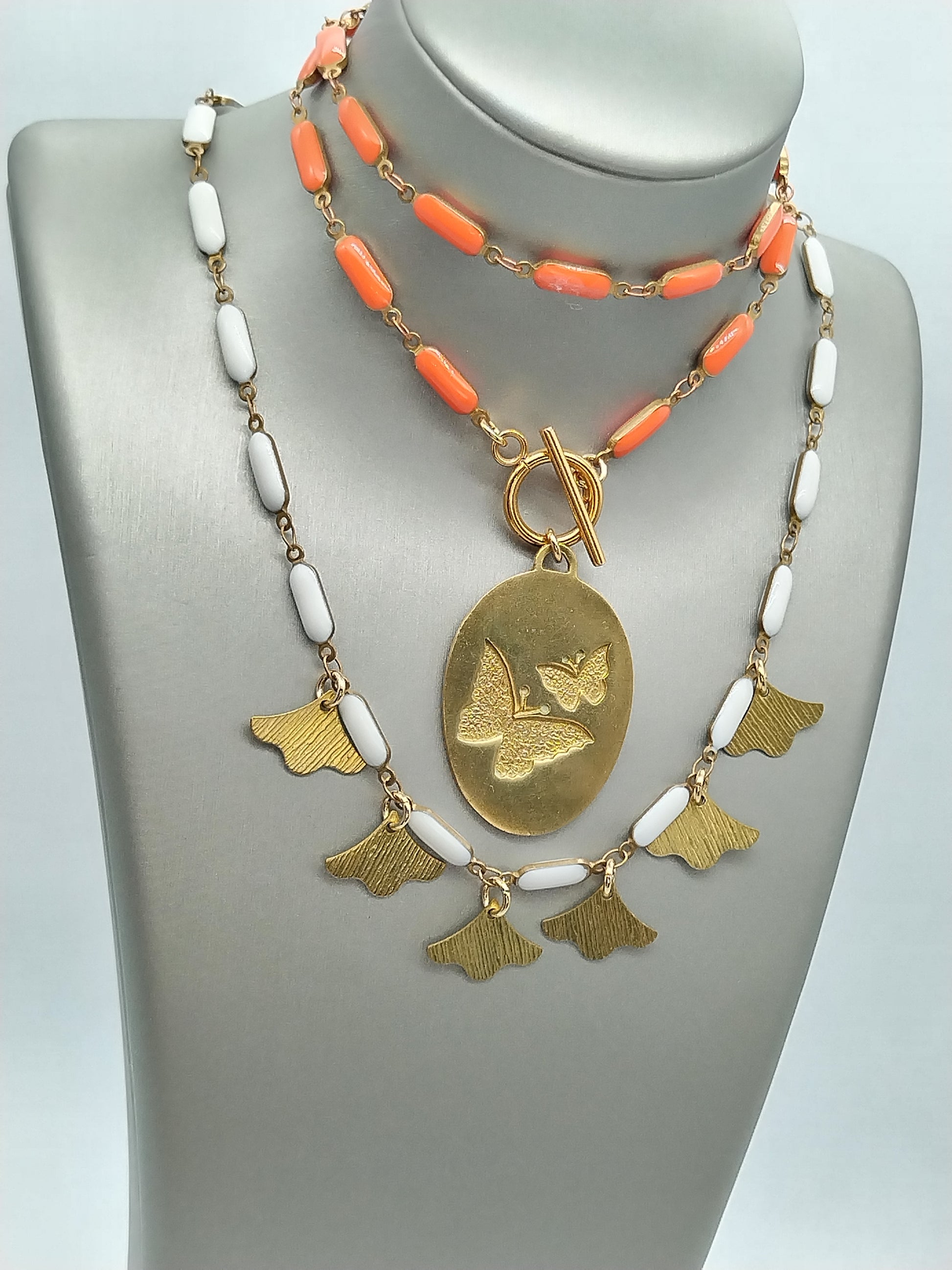 Butterfly Medallion Choker, Orange Enamel Puffed Bar Chain, Toggle front Clasp Necklace