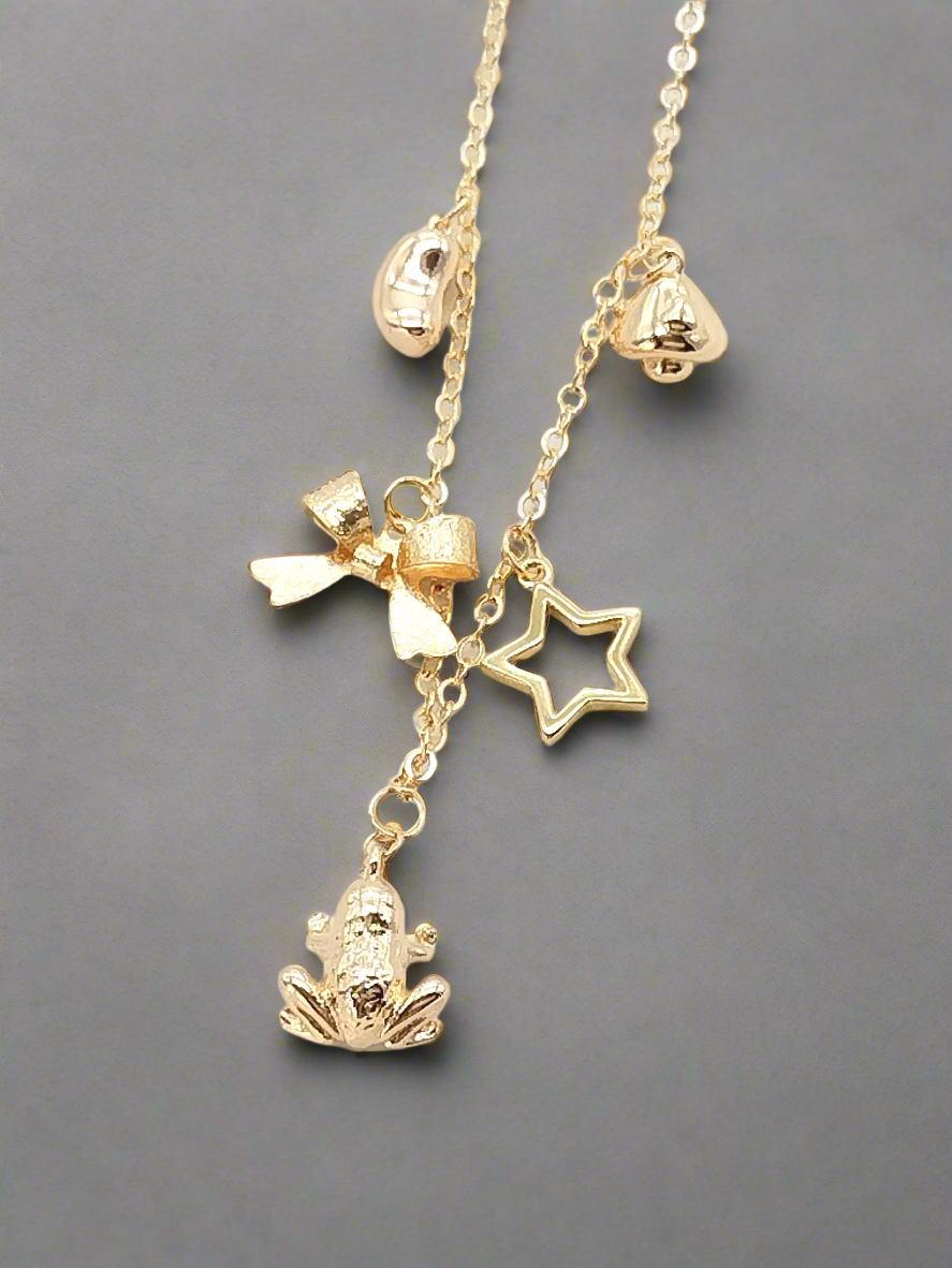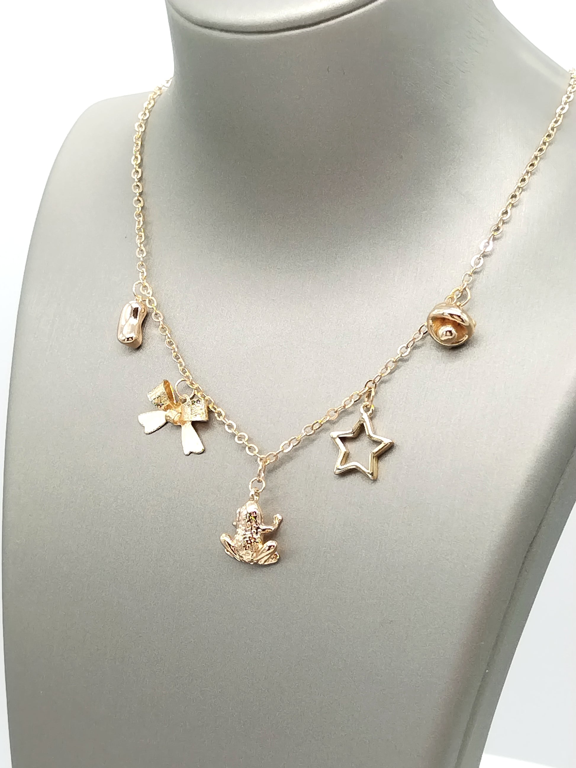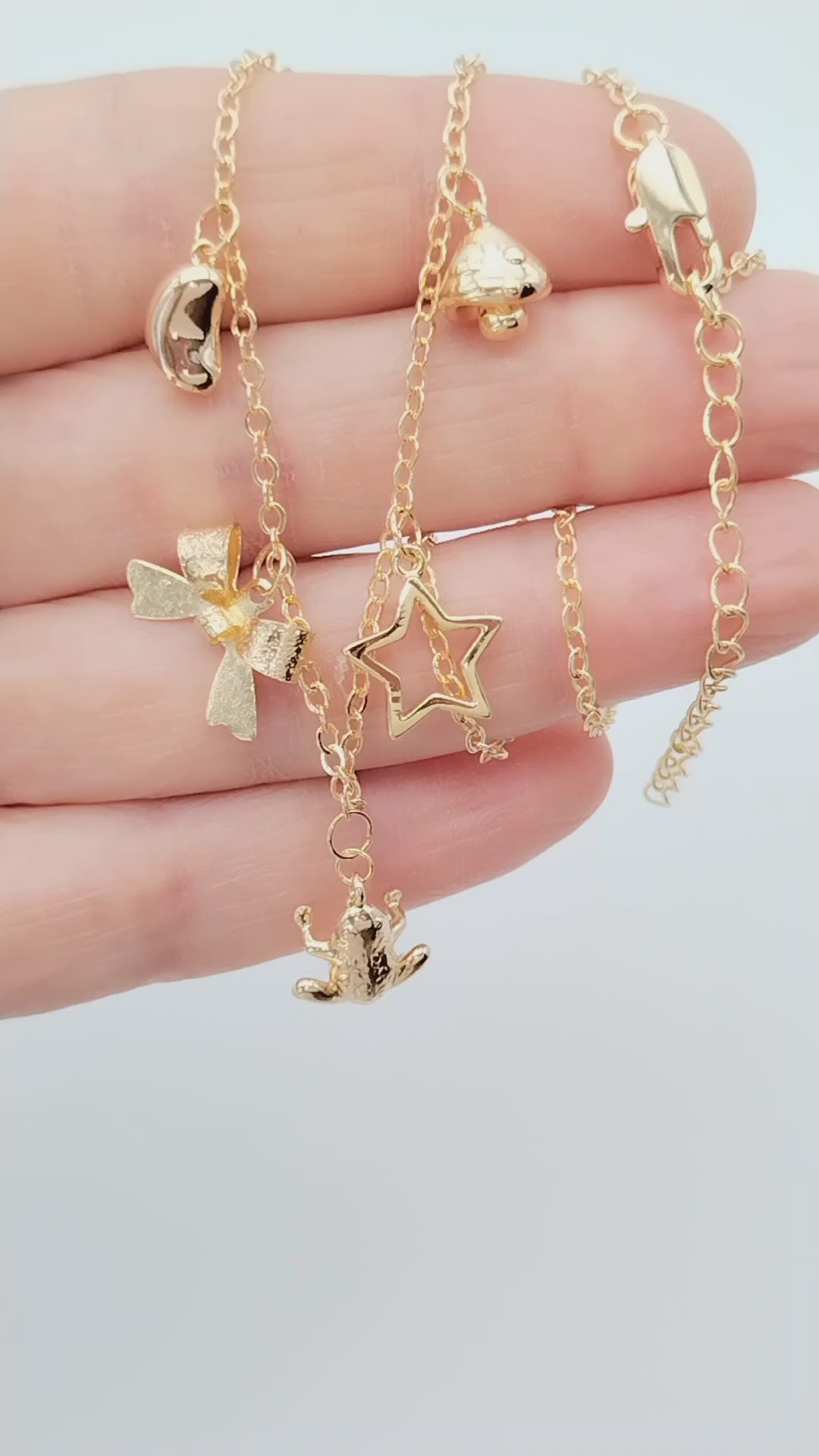 Add a touch of charm with this 18k Gold Plated necklace. Featuring 5 delicate charms including a frog, bow, bean, star, and mushroom, this trendy link chain is the perfect addition to any outfit. Stackable and unique, it makes for a must-have gift for the fashionista in your life.