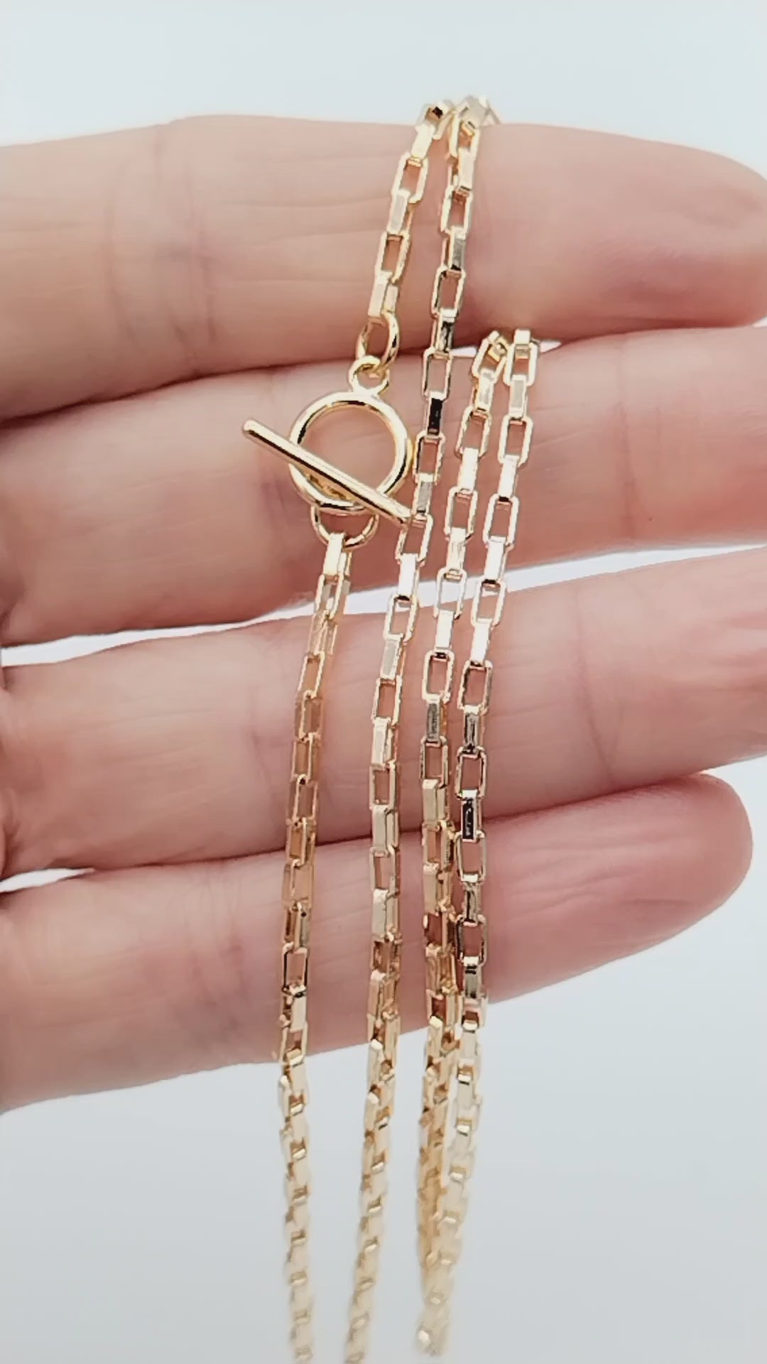 This delicate 18k gold box chain necklace is both stylish and sustainable. The toggle clasp adds a touch of femininity and makes it perfect for stacking. A must-have in any jewelry collection, this one-of-a-kind piece is versatile enough to elevate both casual and office outfits. The perfect Valentine's gift for the fashion-forward woman or bride in your life.