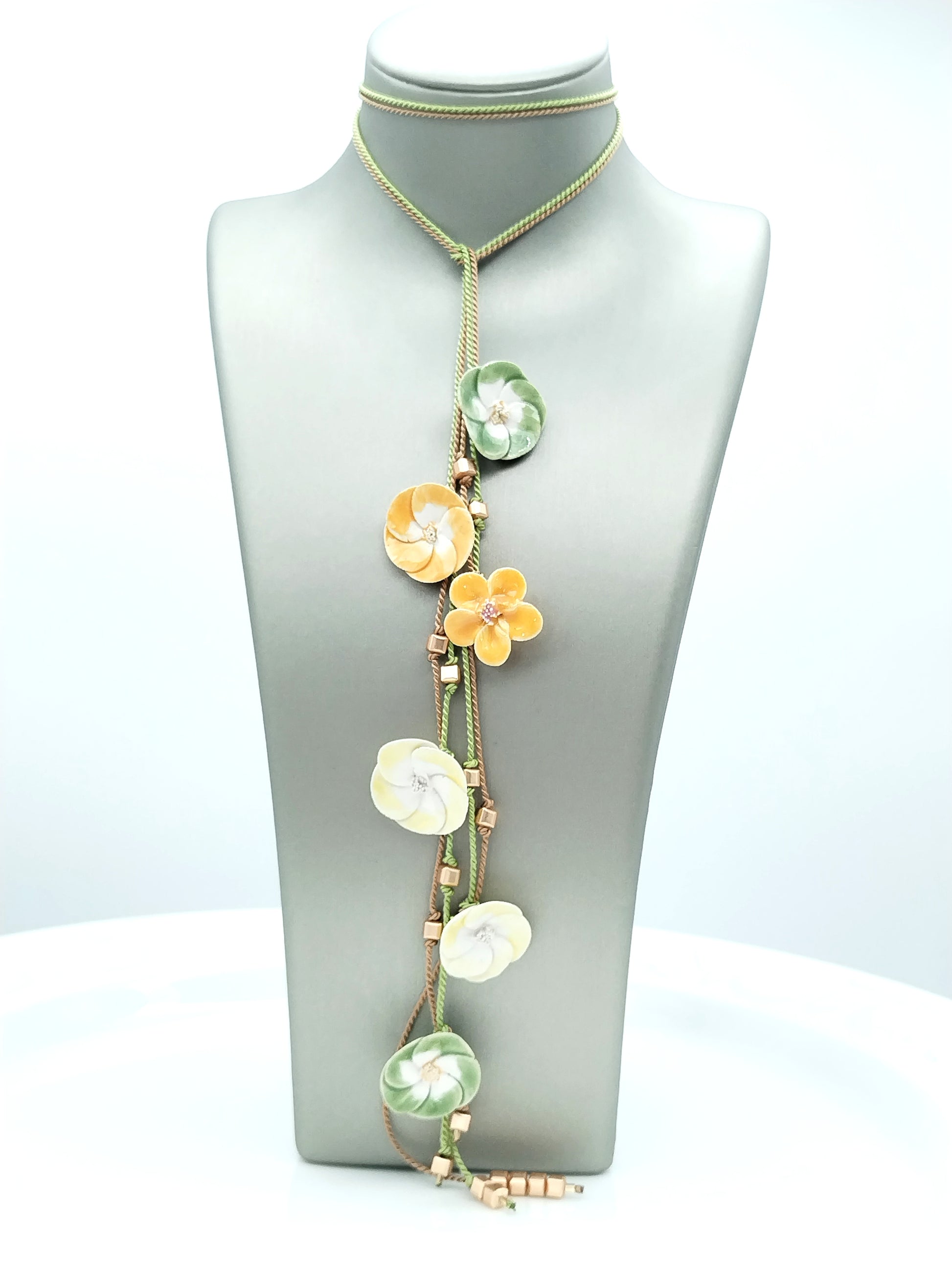 French Ceramic Flower Open Necklace - Pastel Green, Yellow & Earthy Brown Silk Lariat