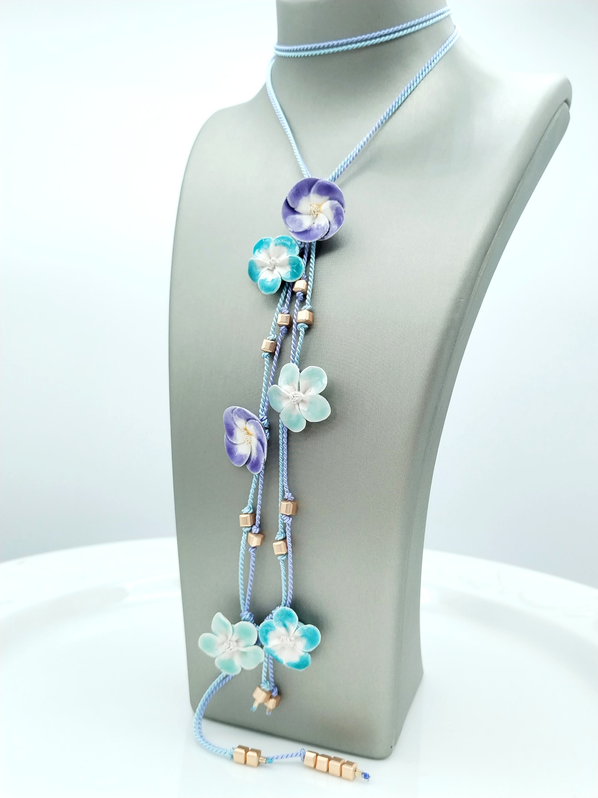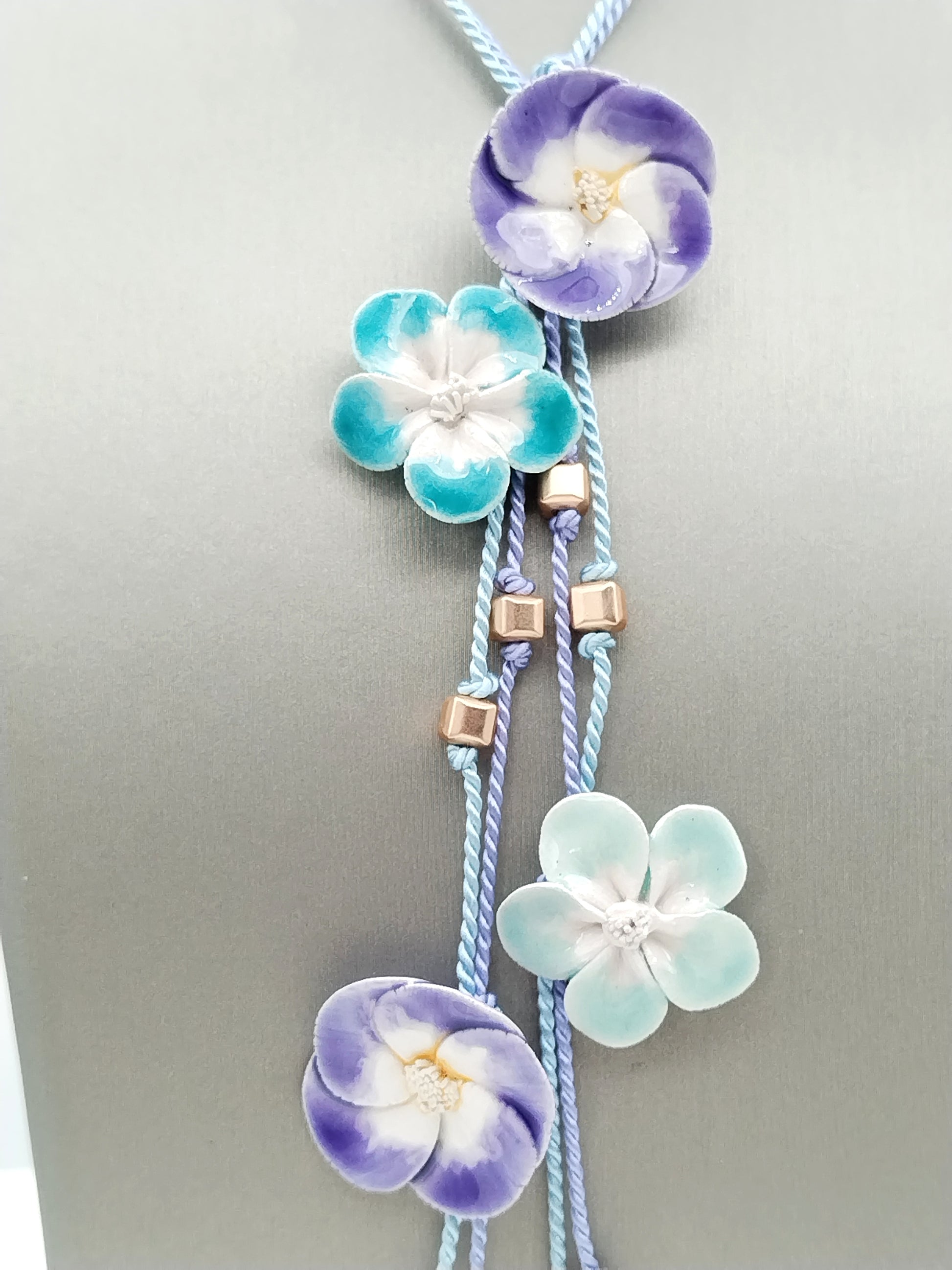 French Ceramic Flower Open Necklace - Pastel Purple & Turquoise Silk Lariat