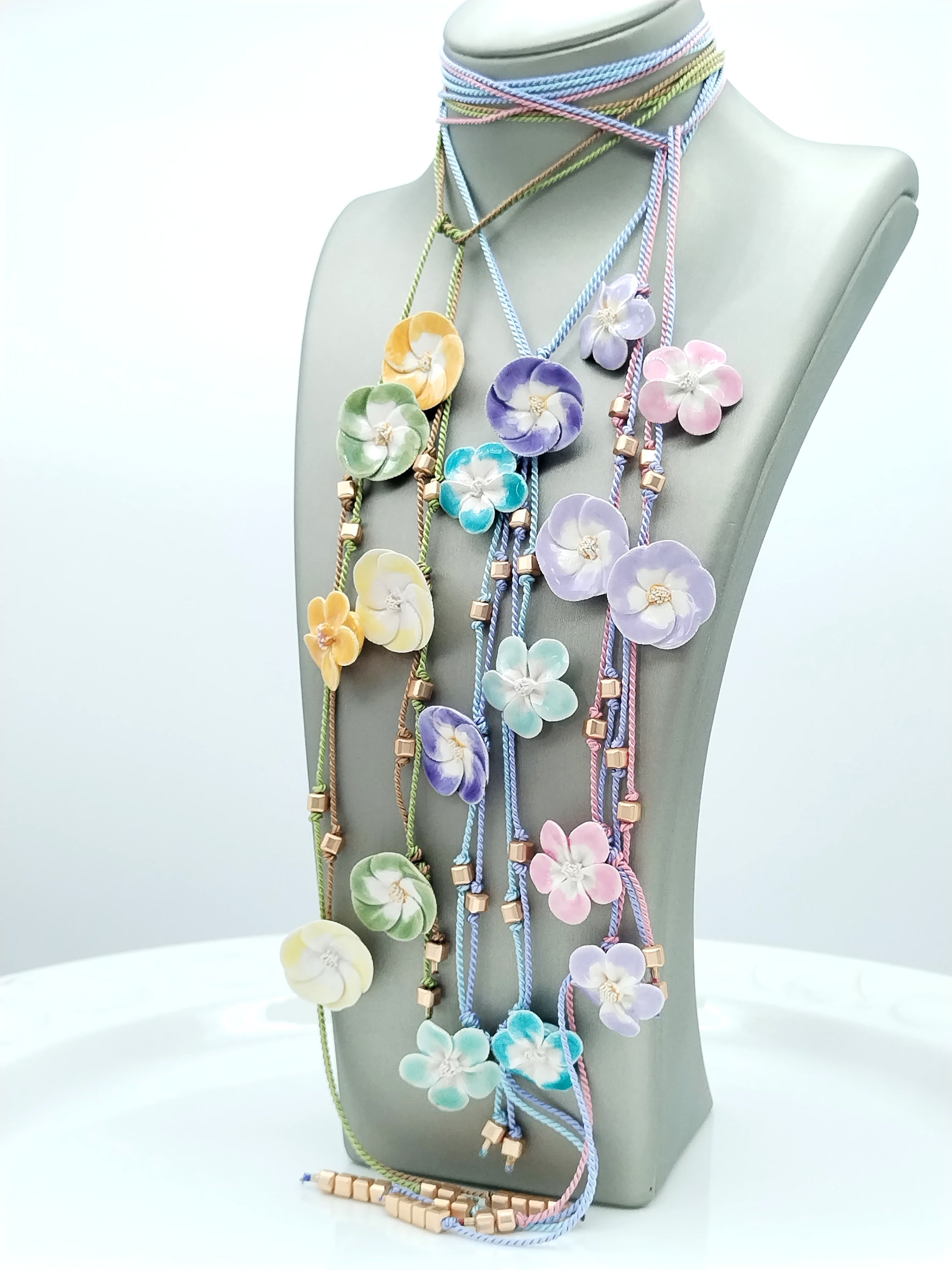 Embrace romantic elegance with this exquisite handmade open necklace, featuring six delicate French ceramic flowers in dreamy pastel purple and turquoise hues. Each 20mm bloom is meticulously hand-knotted onto luxurious silk threads, creating a flowing, organic silhouette that moves beautifully with you.