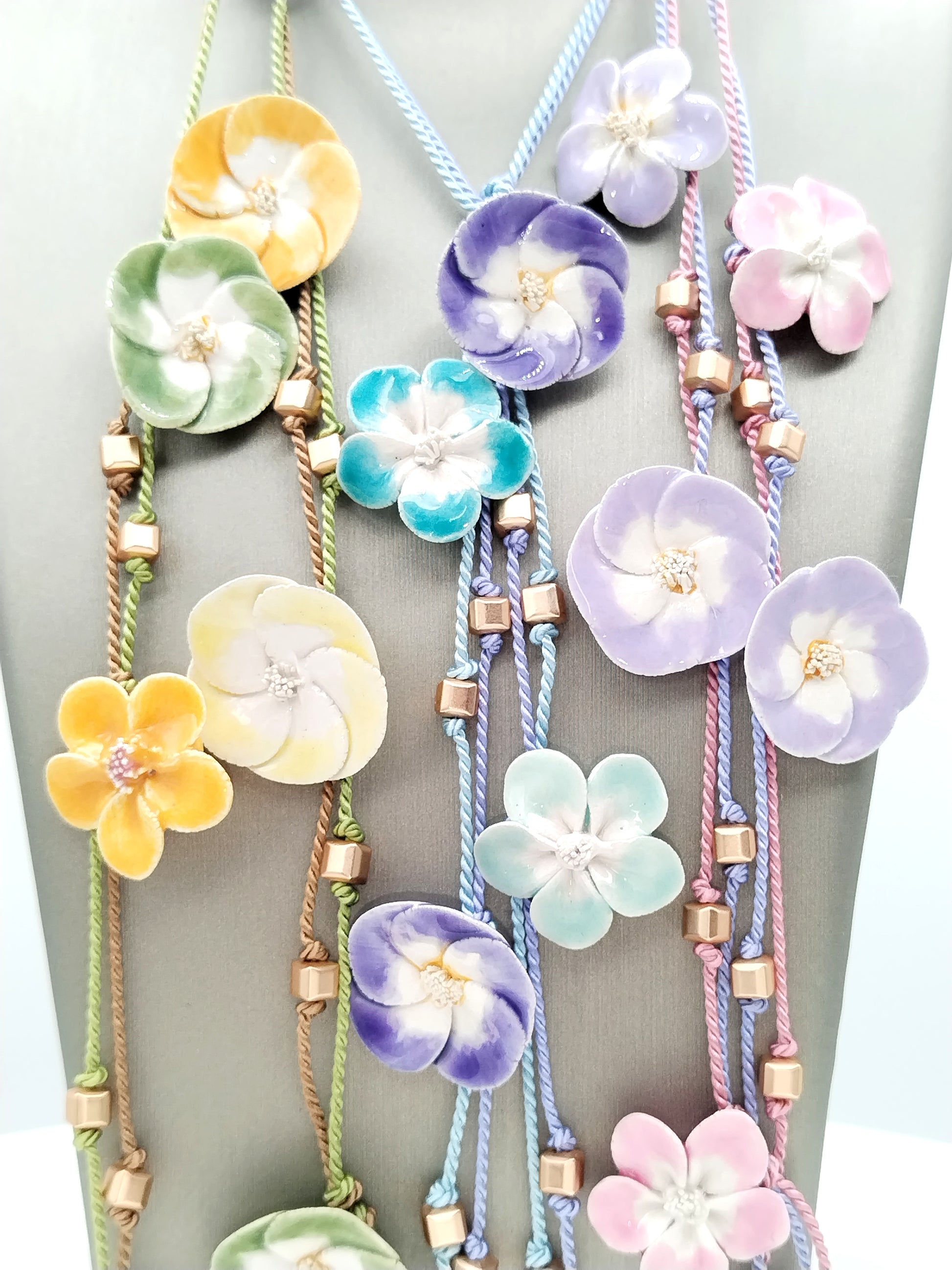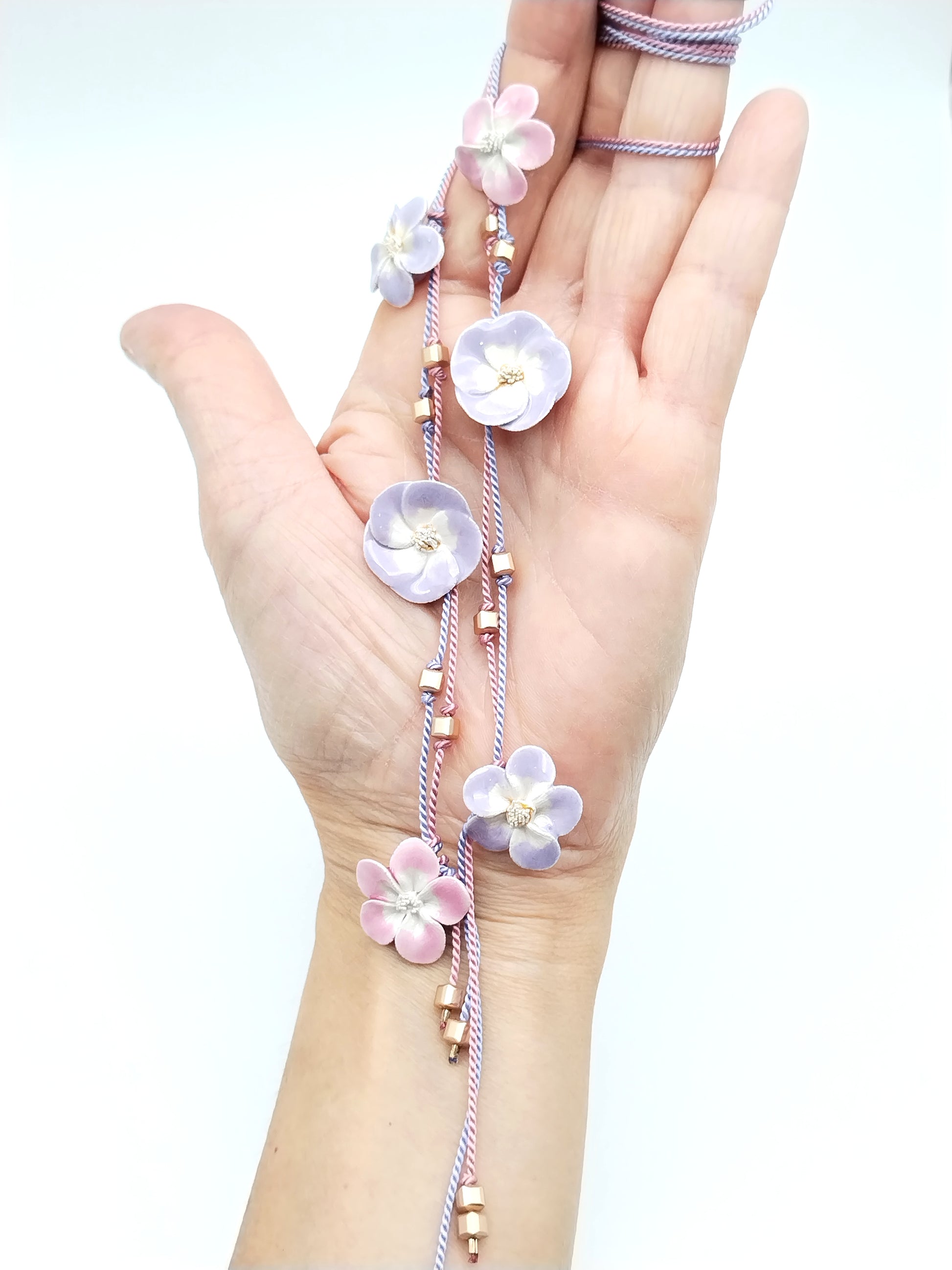 Discover the essence of feminine grace with this enchanting handmade lariat necklace, where soft pink and lavender purple blooms create a dreamy, romantic palette. Six exquisite French ceramic flowers (20mm) are lovingly hand-knotted onto flowing silk threads, each knot a testament to artisan craftsmanship and attention to detail.