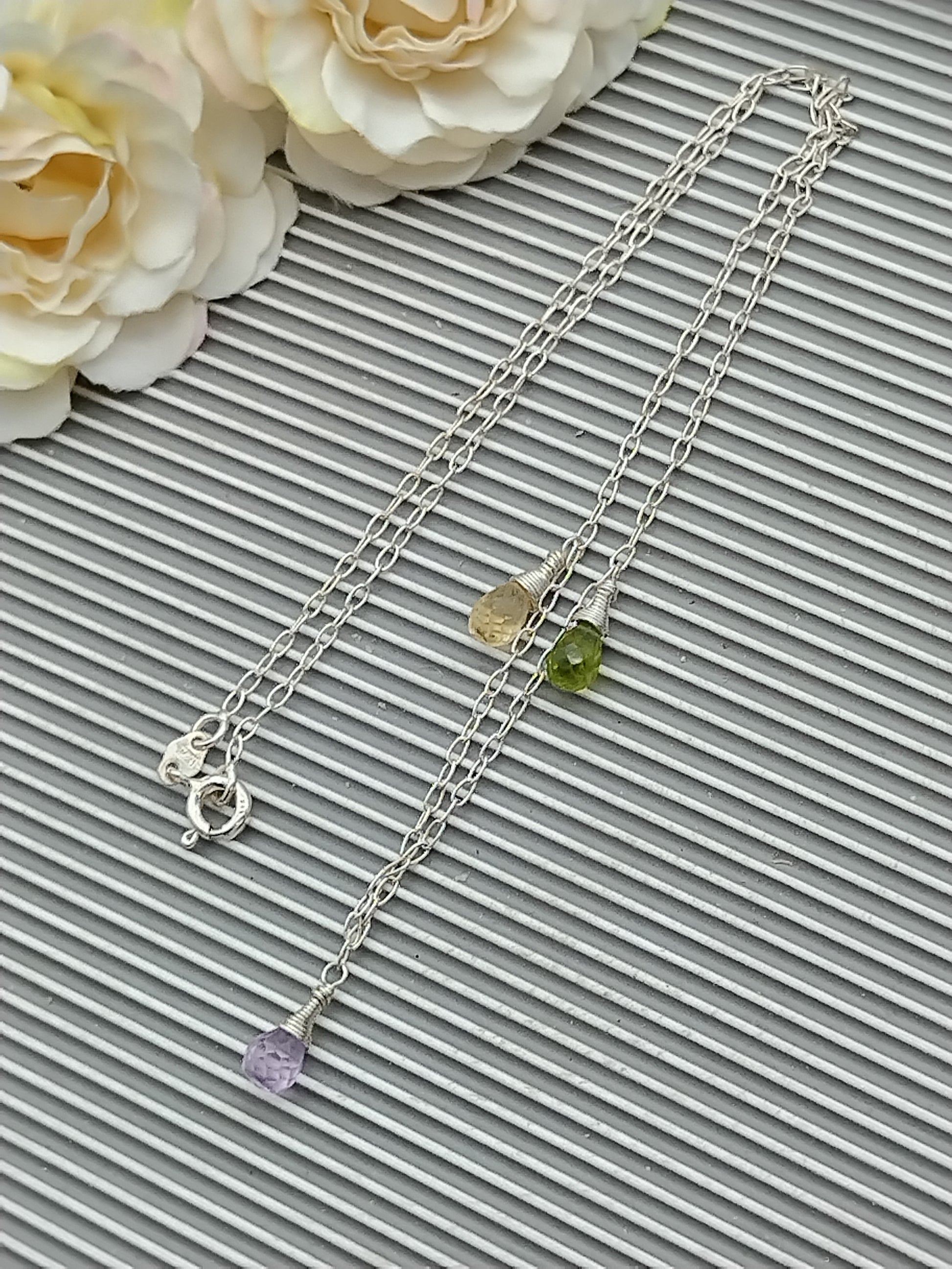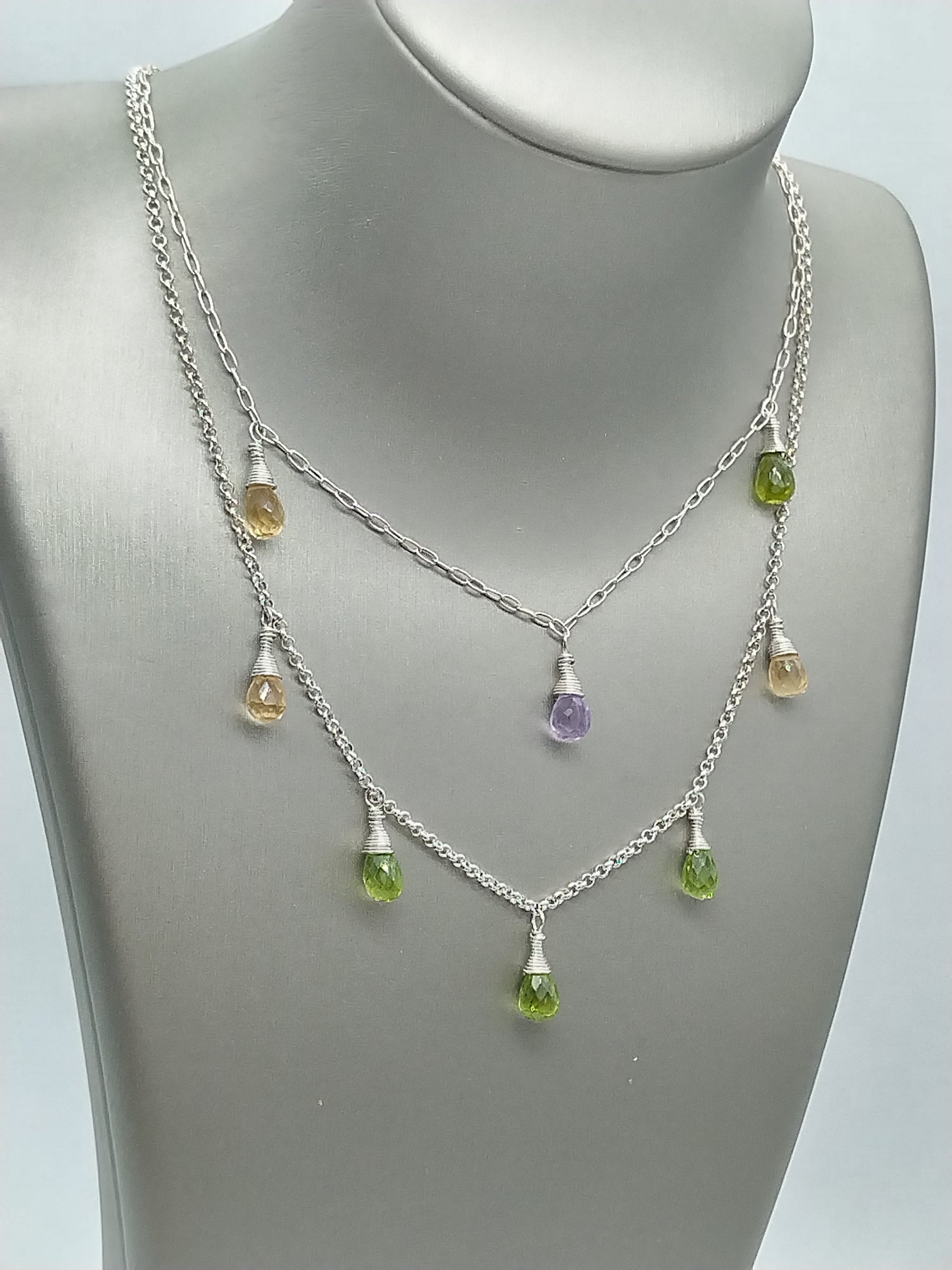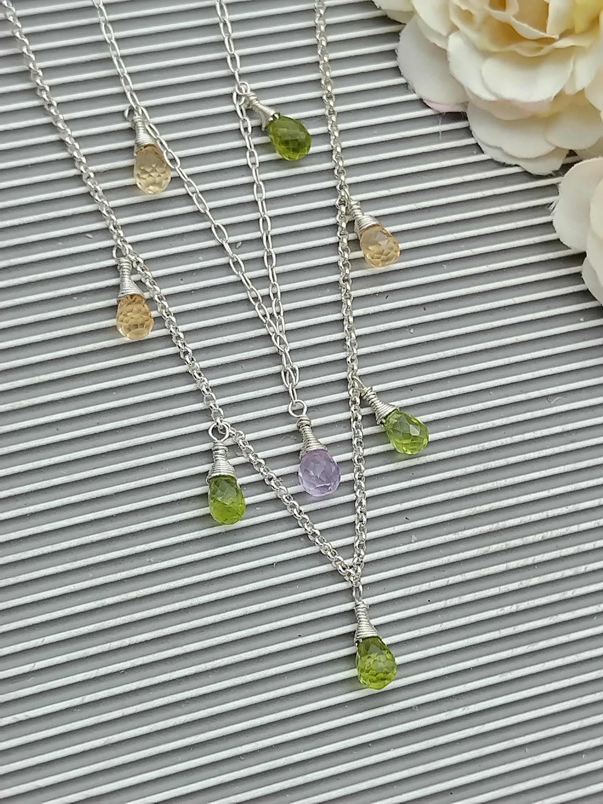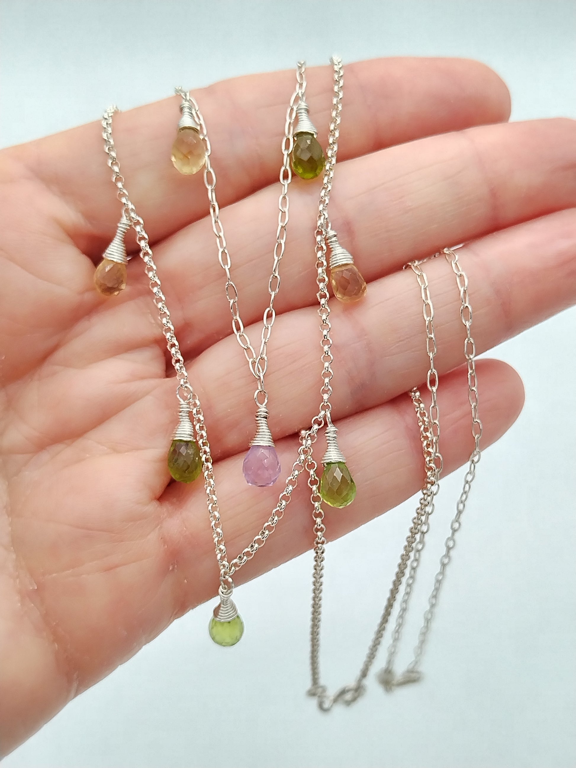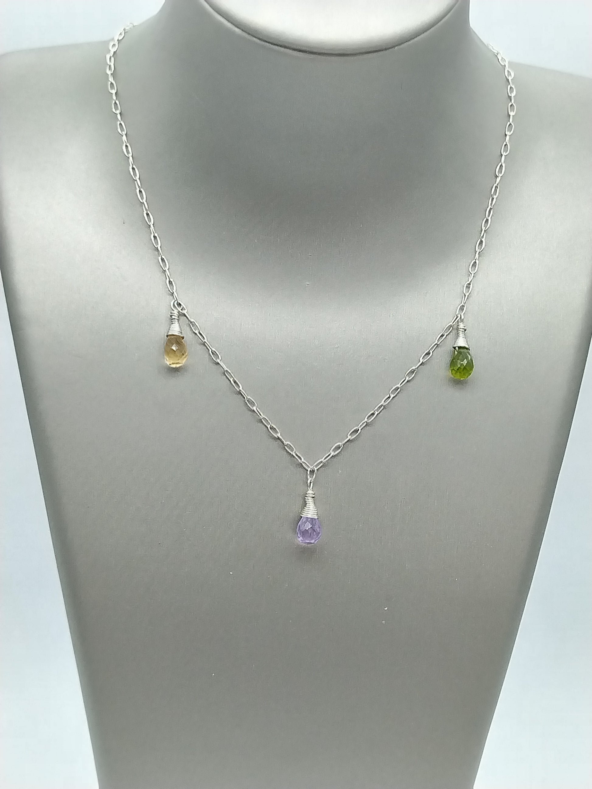 Gemstone Briolette Dangle Necklace, Sterling Silver Necklace, Perdiot, Citrine, Amethyst