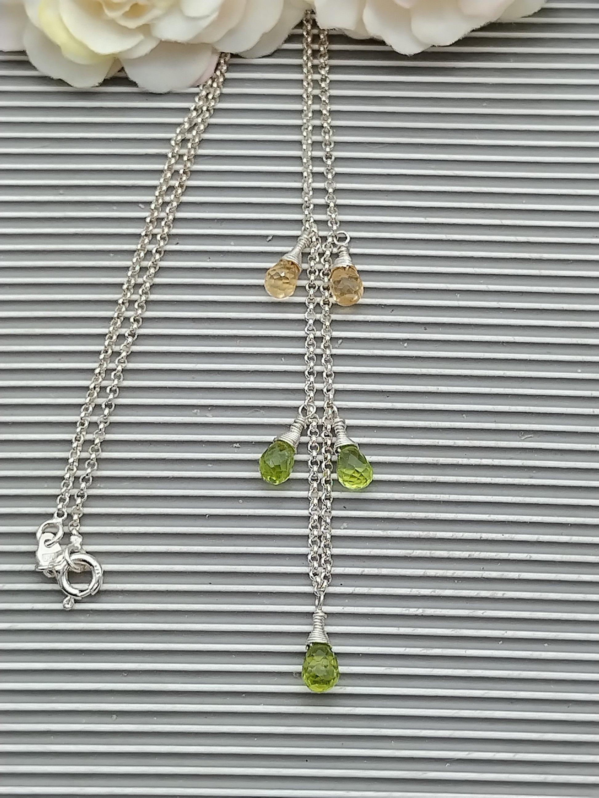 Crafted from Sterling Silver 925, these beautiful necklace features alternating rollo and cable chains with five or three faceted gemstone briolettes ( Peridot, Citrine, Amethyst )dangling from link. They´ve been meticulously hand wrapped onto Sterling Silver. Sterling Silver Lobster Clasp.The perfect accessory for a special evening, this chic dangle necklace adds a pop of color to any outfit.