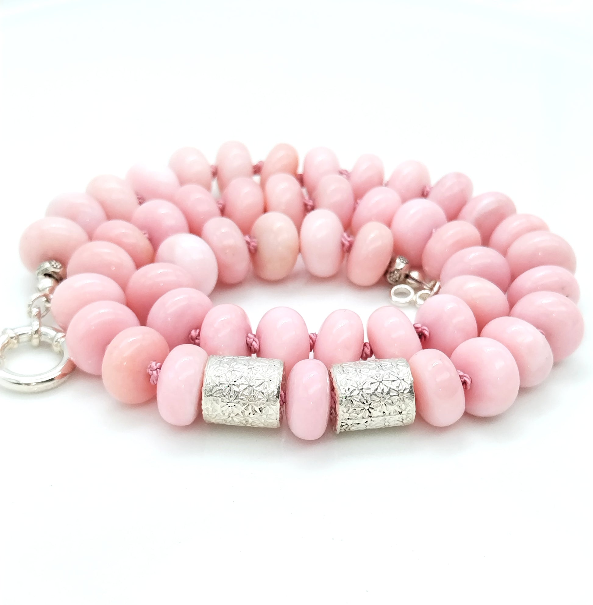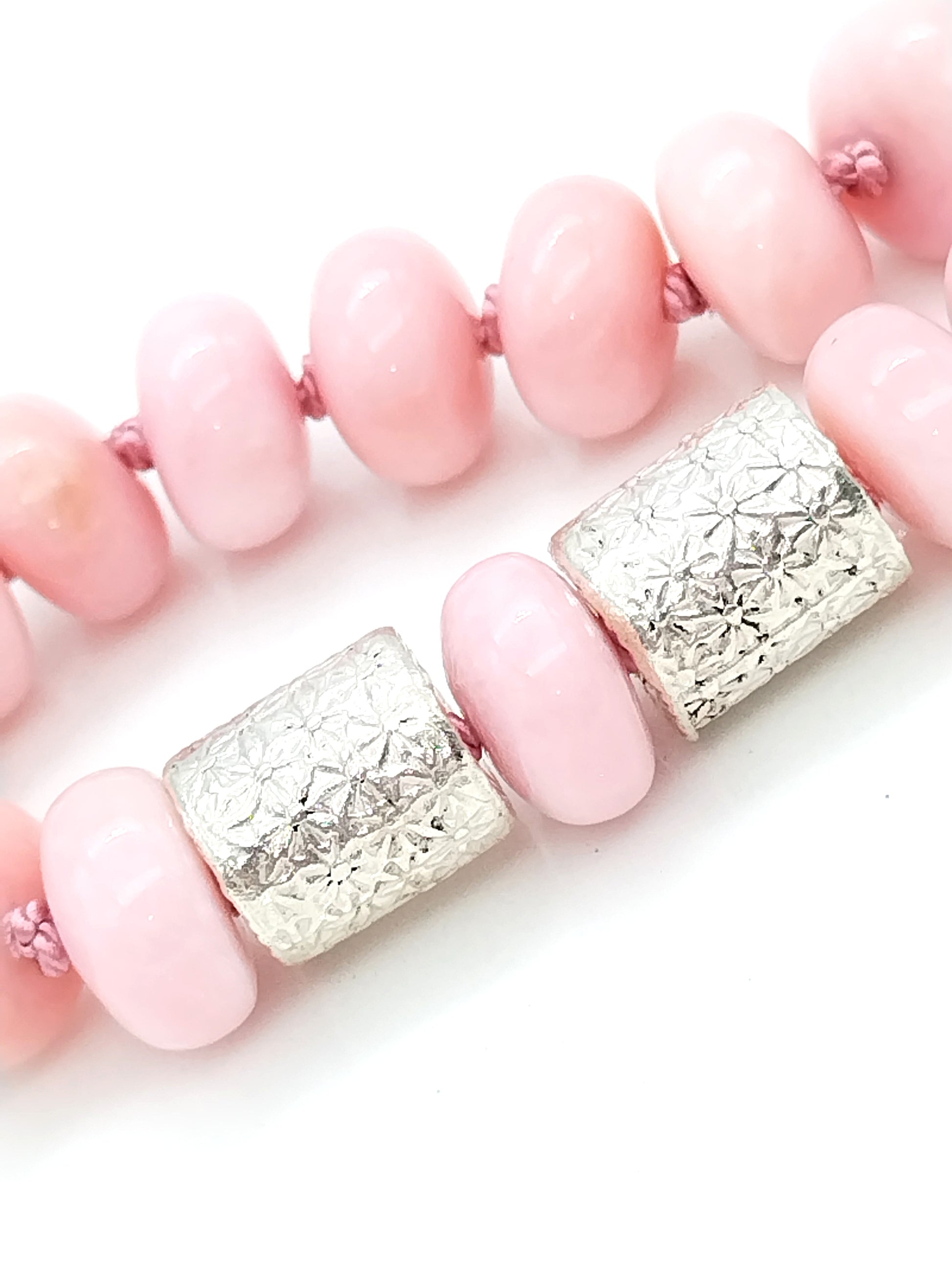 Chunky Peruvian Pink Opal Necklace | Elegant Rondelle Silk Knotted Jewelry with Sterling Silver Flower Barrel Accents