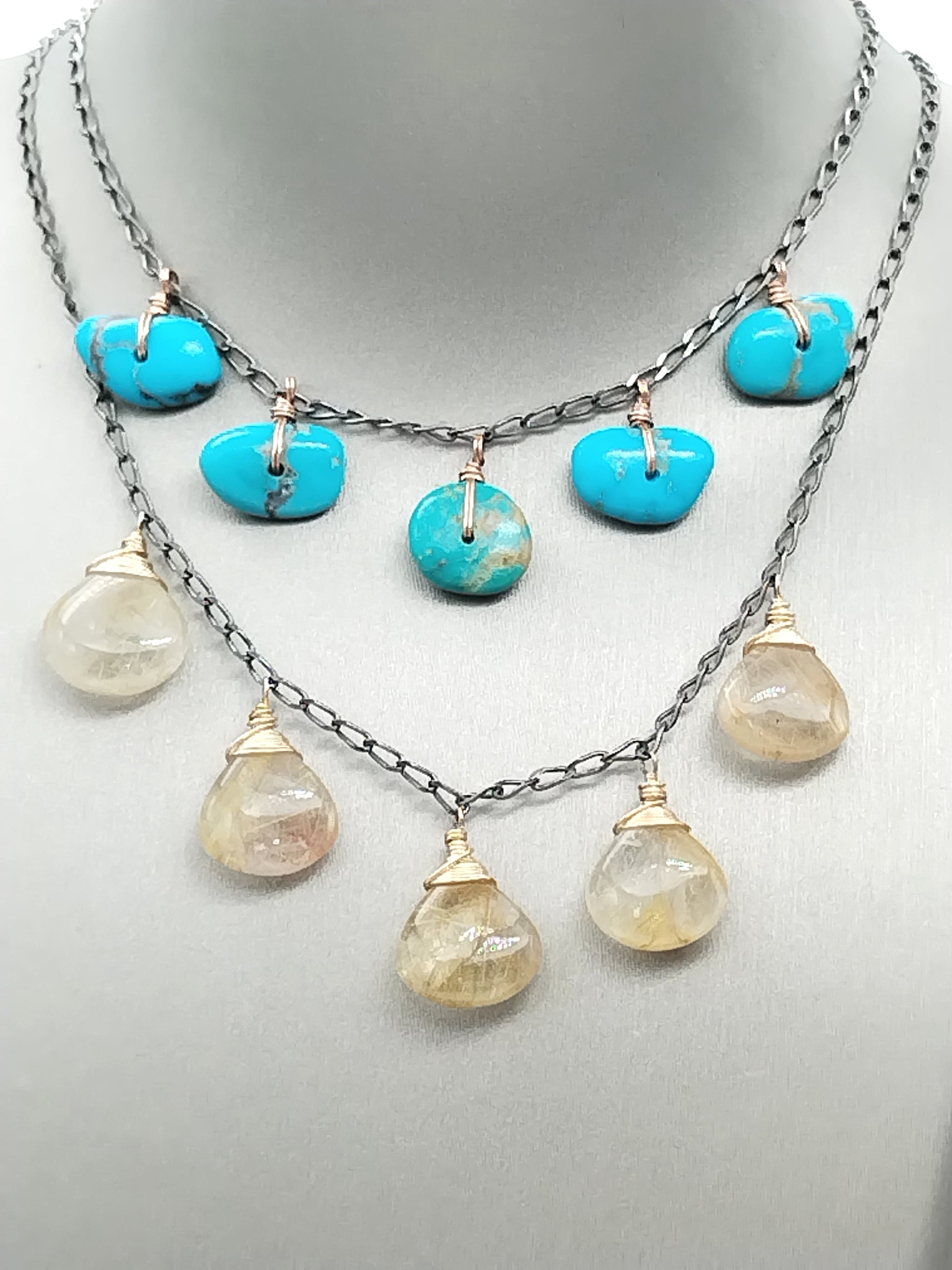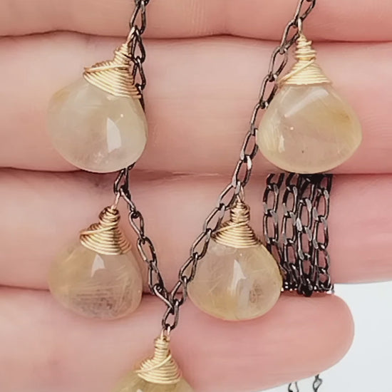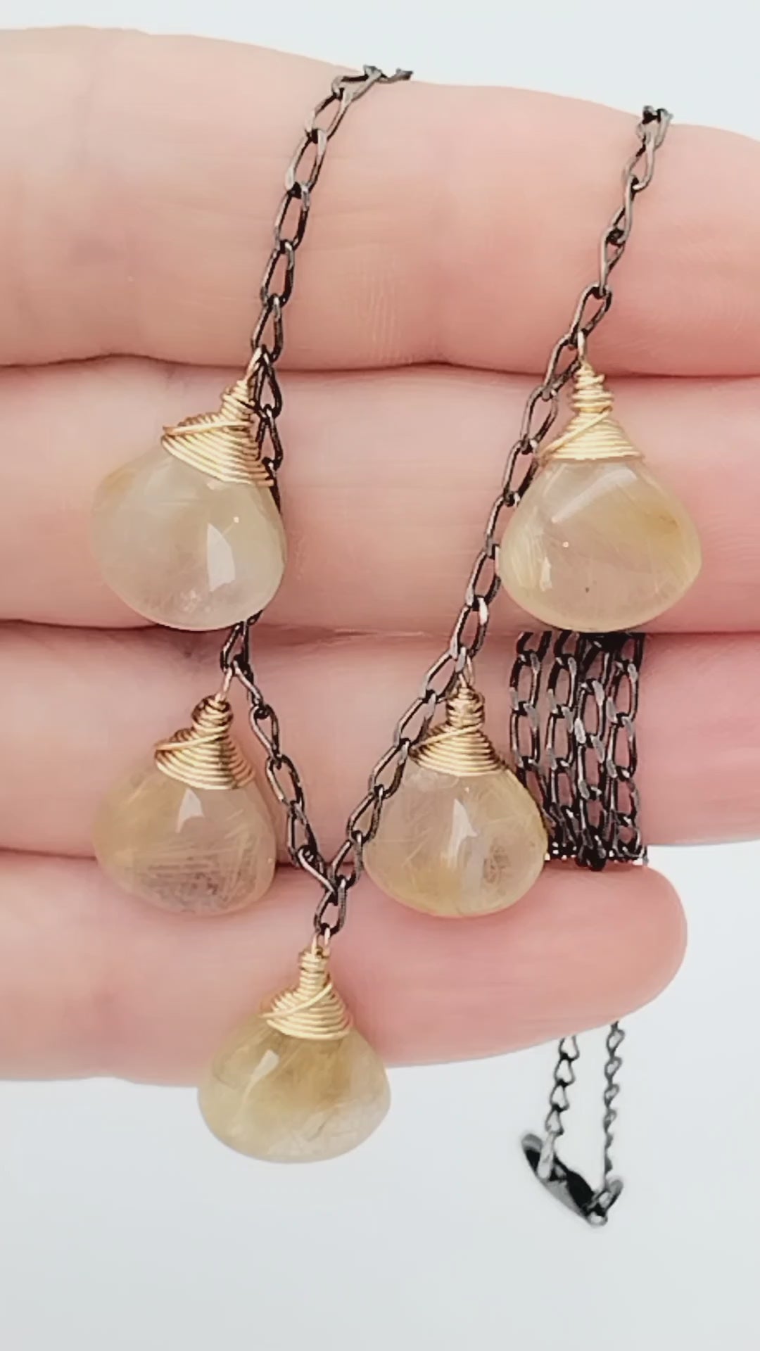 This stunning Golden Rutilated Quartz Smooth Drops ( 11mm ) necklace is handmade with mixed metals; Oxidized Sterling Silver 925 and meticulously hand wrapped onto 14k Gold Filled. Its One-of-a-Kind design is delicate and dazzling, making it the perfect Christmas gift for the special women in your life. Give her this unique and beautiful necklace to show your appreciation.