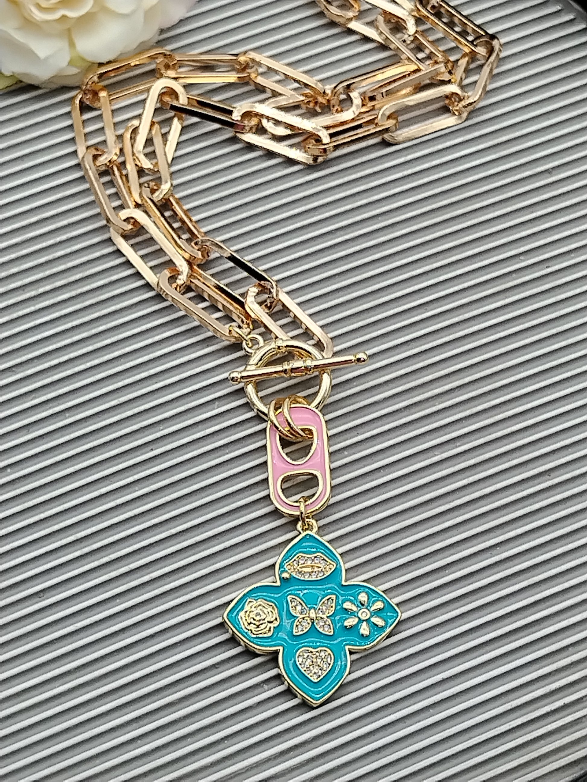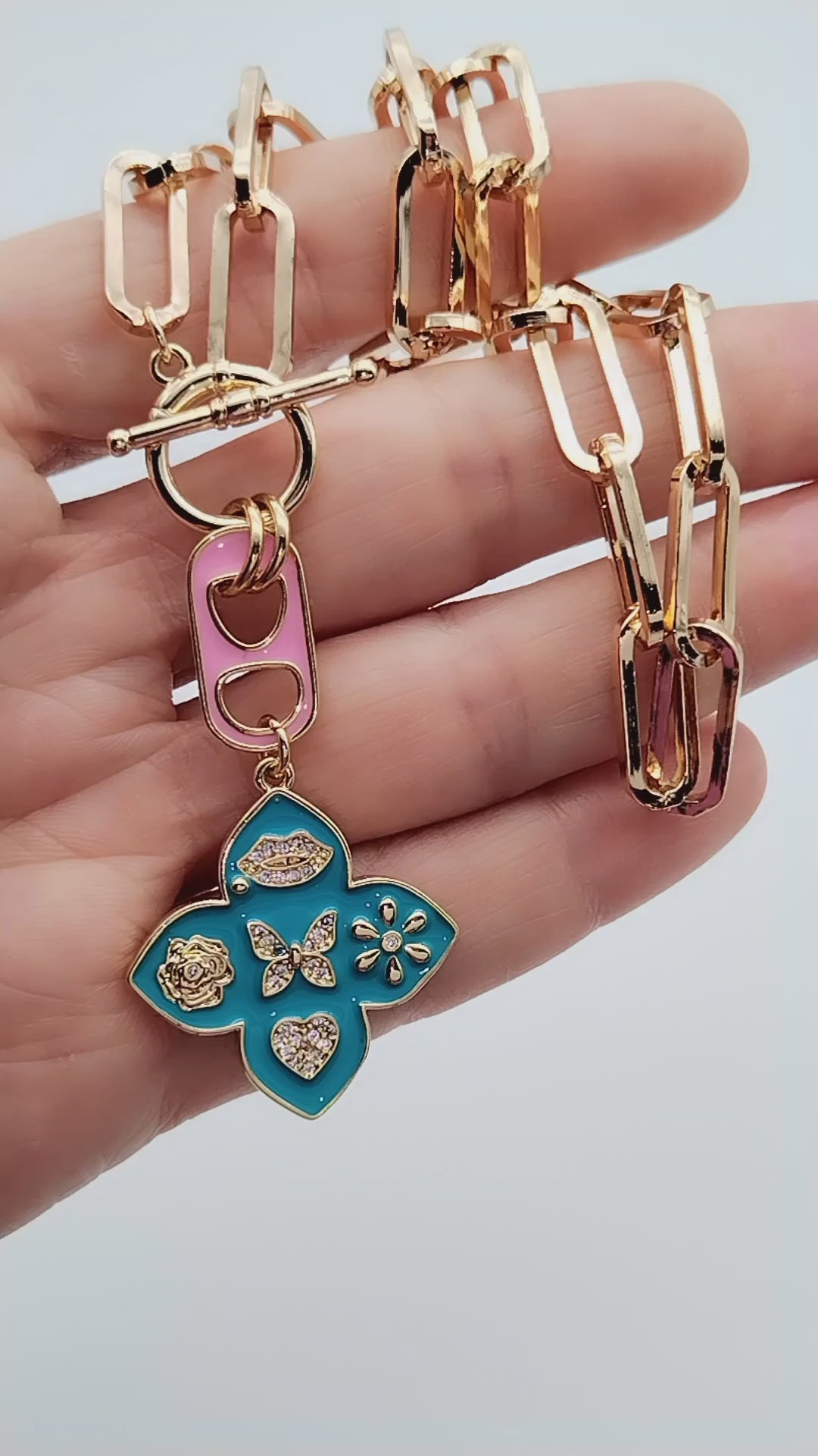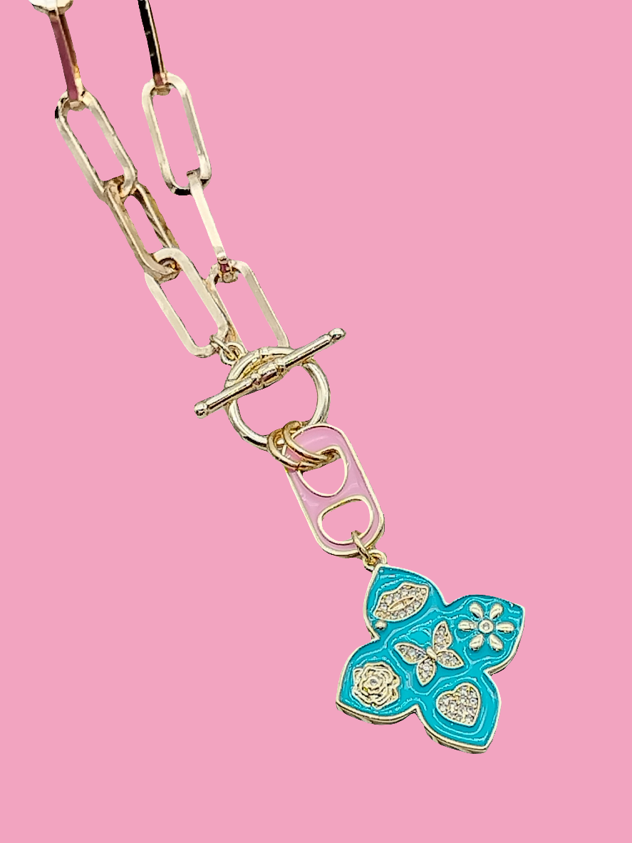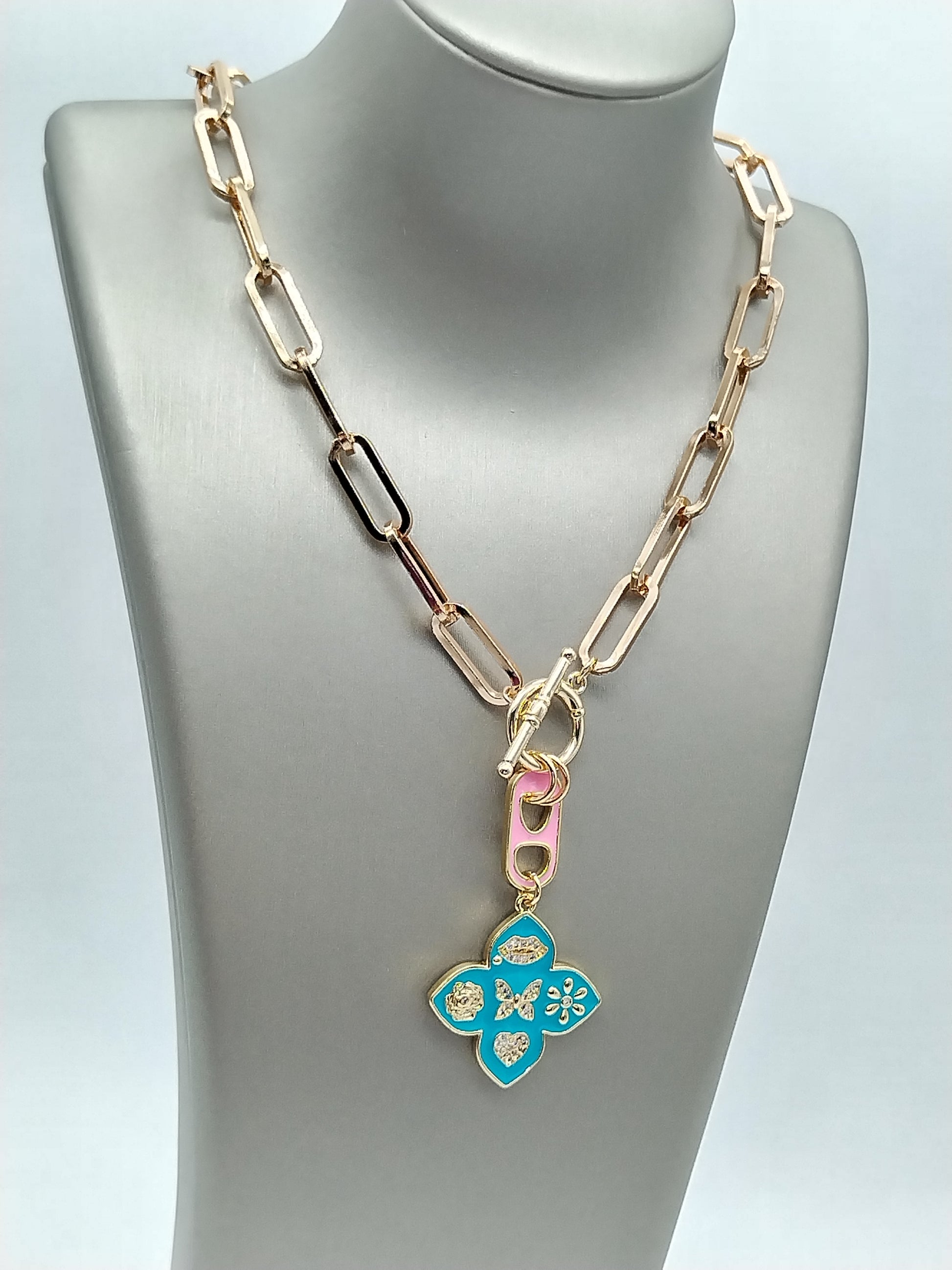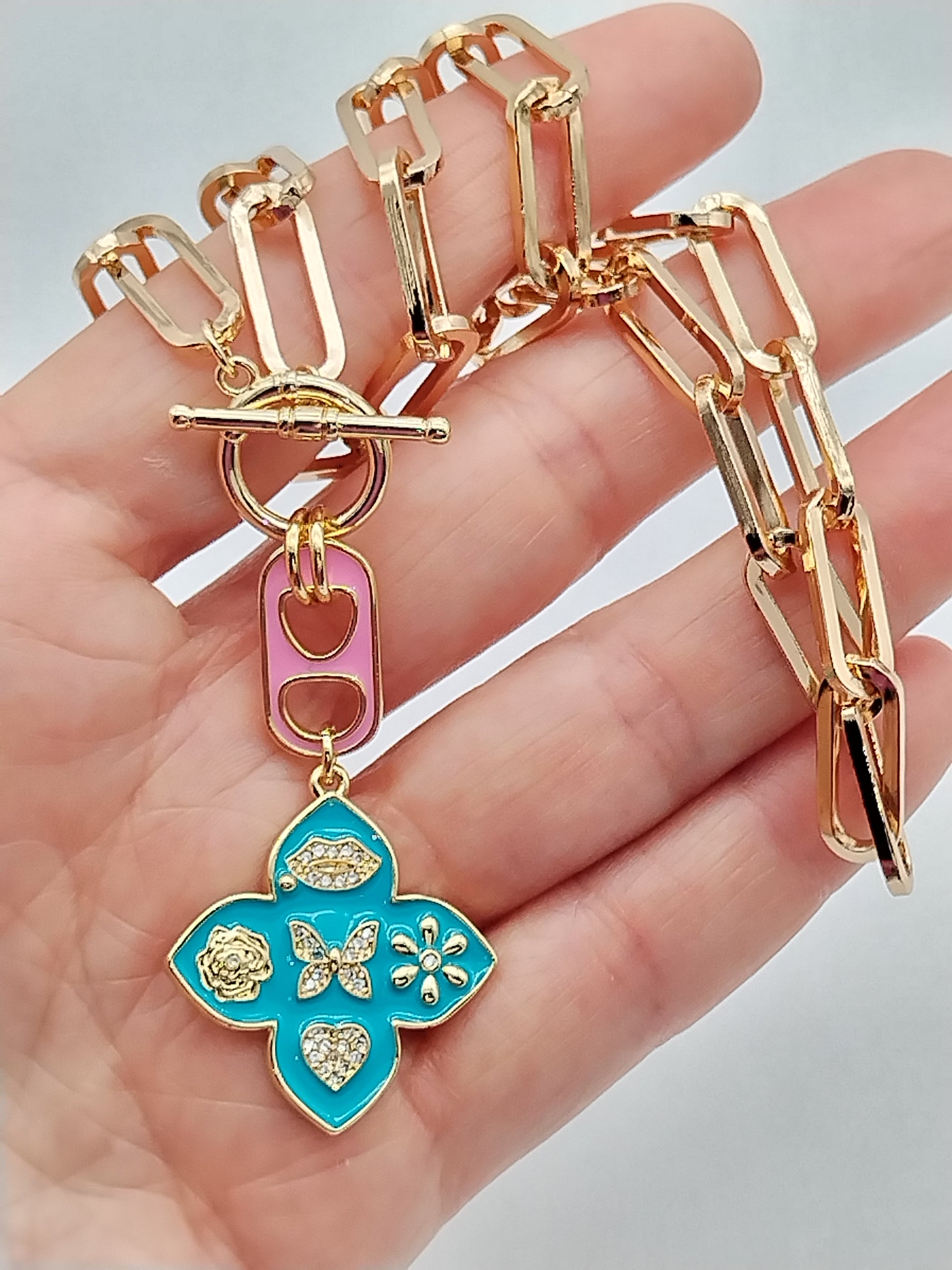 This lucky necklace features a unique turquoise clove charm (27mm ) with CZ pavé, made of 14k gold filled, on a large paper clip chain. The chunky, choker-style statement piece is finished with a toggle clasp for added security. Whether you're looking for the perfect lucky charm or a trend-setting piece of jewelry, this necklace is sure to make a statement. All 14k Gold filled
